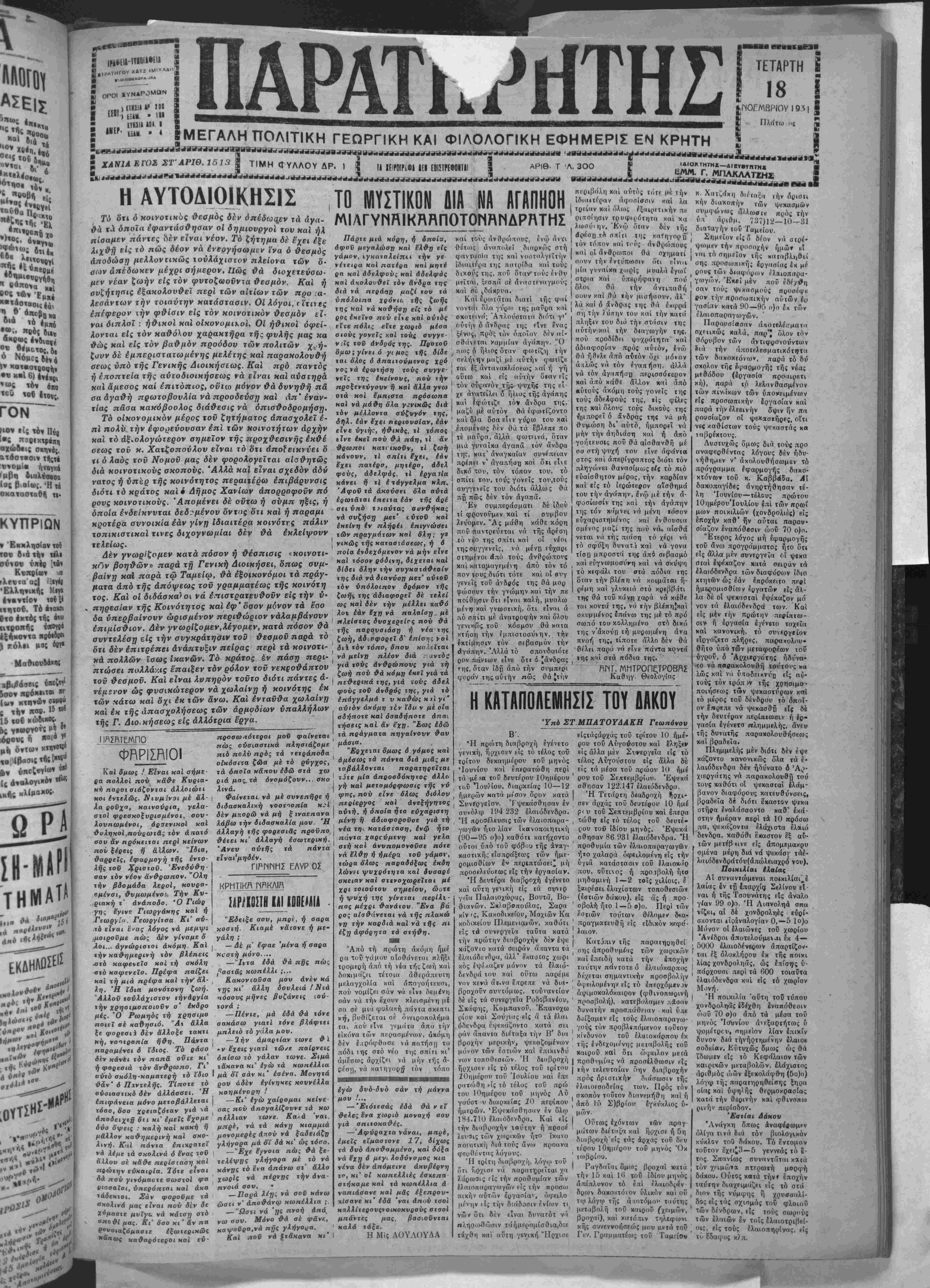 < κροιΒβοι ϋόλει μβς ό ΙΙαθιουΜκιις ικής Ε ΚΔΗΑΟΣ£|Σ Λ εί**·8 ΠΑΡΑΤ. ■. ^ΗΤΗΣ [ΜΕΓΑΛΗΠΟΛΙΤΙΚΗ ΓΕΩΡΠΚΗ ΚΑΙ ΦΙΛΟΛΟΠΚΗ ΕΦΗΜΕΡΙΣ ΕΝ ΚΡΗΤΗ ΤΕΤΑΡΤΗ 18 ΚΠΟΓΜΒΡιΟΥ Ι 9 «1 Πλάτω ος - ΧΑΝΙΑ ΕΙ'ΟΣ ΣΤ ΑΡΙΘ. 1513 | ΤΙΜΗ (ΓΥΛΛΟΥ ΔΡ. ΤΑ ΙΕΐΡΟΙΡιΦΙ ΛΕΙ ΕΒΙΠγΕΦΟΙΤΙΙ ΑΡΙΘ. Τ 'Λ. 3ΟΟ £ Γ. Η ΑΥΤΟΔΙΟΙΚΗΣΙΣ ,ΤΟ ΜΥΣΤΙΚΟΝ ΔΙΑ ΝΑ ΑΓΑΠΗΟΗ Τώ ότι δ κοινοτικος θεσμός δεν σΉεδωςεν τα άγα- θα τα δποΐα έφαντάαθησαν οί δημιονργοί τον καί ηλ πίααμεν πάντες Μν είναι νέον. Τό ζήτημα δέ εχει έξε λιχθή είς τό πώς δέον νά ενεργήσωμεν ίνα δ θεσμός Αφοΰ ν*Υαλώσν Ηαϊ Αποδώση μελλοντιχώς τουλάχιστον πλείονα των δ- νάμ°ν' ν»αταλβί*" σων απέδωκεν μέχρι σήμερον. Ιΐώς θά διοχετεναω- μέν νέαν ζωήν είς τόν φντοζαοοΰντα θεσμόν. Καί ή συζήτησις έξαχολονθεϊ περί των αίτίων των προ :α· λεσάντων τήν τοιαύτην κατάστασιν. ΟΙ λόγοι, ι ί'τιι ες επέφερον τήν φθίσιν είς τόν κοινοτικόν θεσμόν εί¬ ναι διπλοϊ : ηθικαι και οικονομικαί. Οί ήθικοί όφε'ι- λονται είς τόν καθόΧον χαρακτήρα τής φνλής μας κα θώς και είς τόν βαθμόν προοδον των πολιτών χ^ή· ζουν δέ έμπεριστατωμένης μελέιης χαί παρακολονθή αεως υπό τής Γενιχής Διοικήσεως. Καί πρό παντός ή έποπτεία τής αυτοδιοικήσεως νά είναι χαί ανατηρά χ«1 άμεσος καί έπιτόπιος, οϋΐω μόνον θά δυνήθη πά σα άγαθή πρωτοβονλία νά προοδεύση χαί Λπ' εναν¬ τίας πάσα κακόβοολος διάθεσις νά όπισθοδρομήστ}. Τό οικονομικόν μέρος τοϋ ζητήματος άπασχολεϊ ε¬ πί πολυ τήν έφο^εύονσαν επί των κοινοτήτων αρχήν «αί τό άξ>ολογώτερον σημείον τής προχθεσινής έκθέ