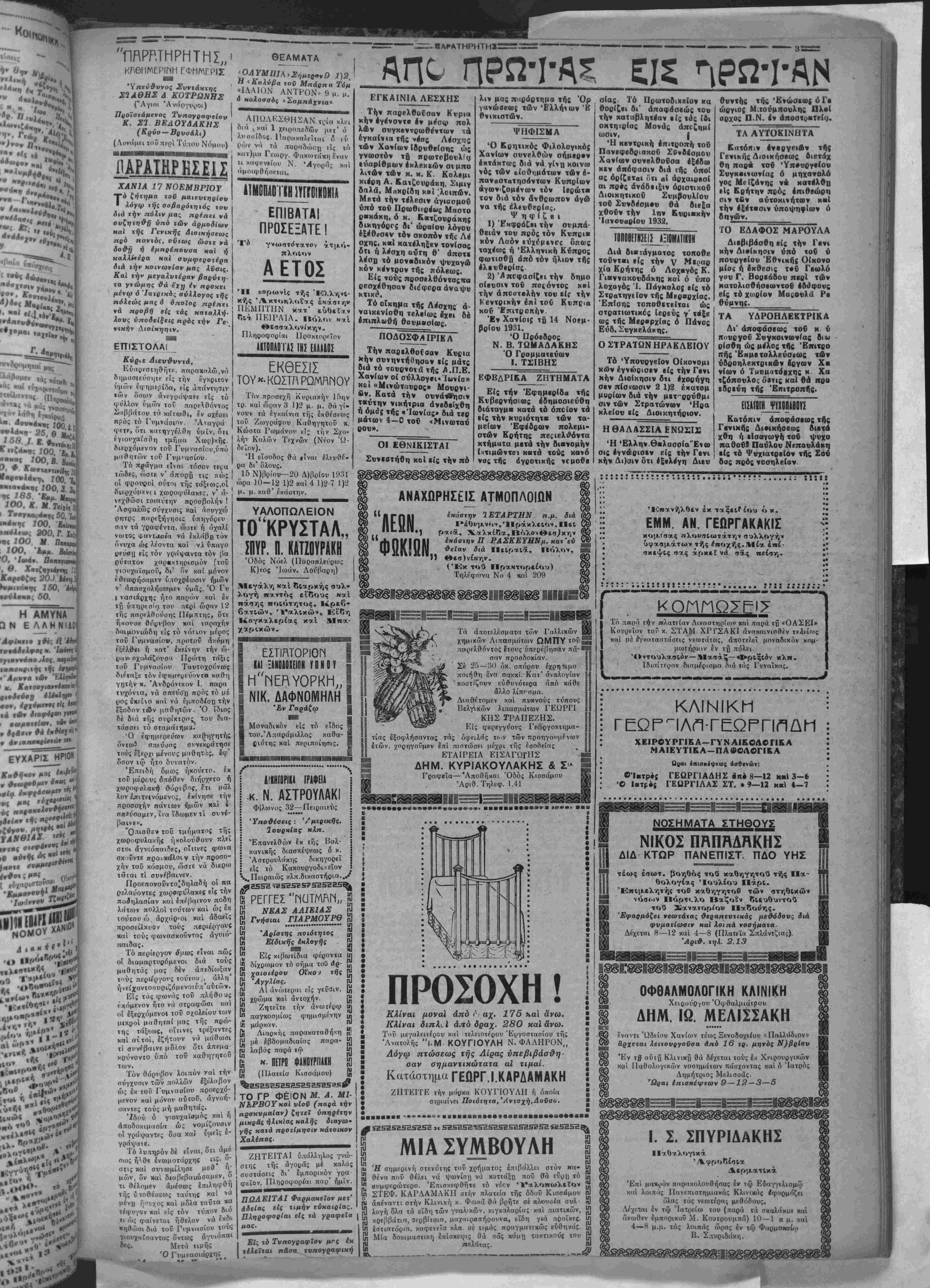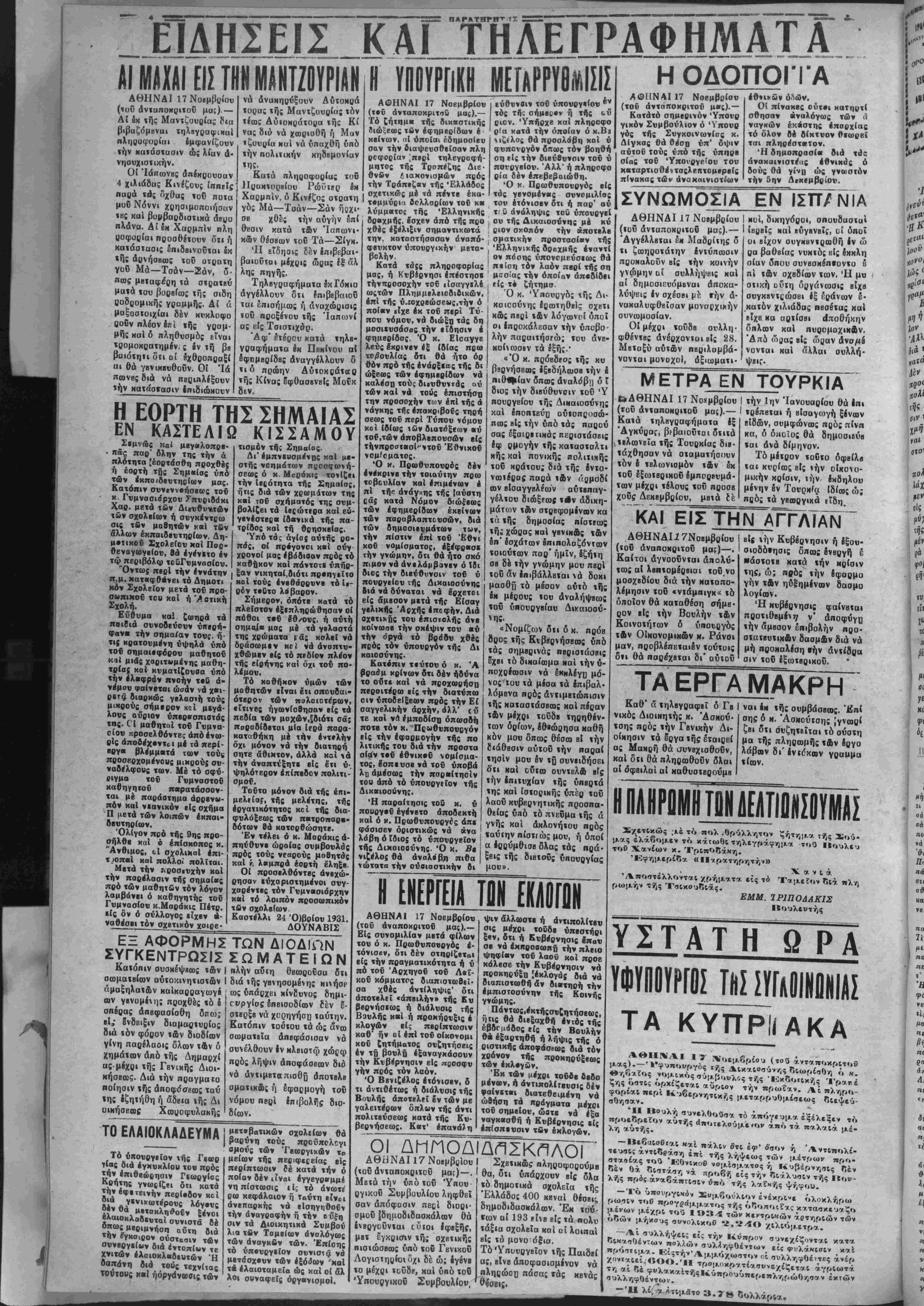 λαβών δι' ένι<5κων γραμμα «(ών. Π ΕΝΕΡΓΕΙΑ Τ1Ν ΕΚΑΟΓΠΝ Ηί<ίΡ1ΜΙΤΟΝ1ΕΑΤΙ1»ΣίΥΗΛΣ Σχετικώς ,ι.έ τό πολ ^θούλλητον ζήτημα τής Σού- μ.α.ς ελάβομ,εν τό κάτωθι τηλεγράφηΐ·.<α τού Βουλευ τού Χανίων κ. Τρι«οδάκη. 'Εφημερίδα «ΙΙαρατηρητήν» Χανιά Άποστέλλονται χρήματα είς τό Ταμείον διά πλη ρωμήν τής ΤσικουοΊ'ΐίς. ΕΜΜ. ΊΡ1ΠΟΔΑΚΙΣ Βουλεντής ΕΞ ΑΦΟΡΜΗΣ ΤΩΝ ΔΙΟΔΙΠΝ ΣΥΓΚΕΝΤΡΩΣΙΣ ΣΩΜΑΤΕΙΩΝ Καΐόηιν συσκέψαως «Αν | πλήν αΰιη θεωροϋσα διι σωμαιβίων αύ«οκινη«ισ«Αν Ι διά «ής γενησομένης κπήσρ άμαξηλα«ών καίκαρραγωγέ ως ΰπάρχει κίνδυνος δημι- ων γβνομίη; προχθβς τό έ Γυργίσς επεισοδίον δέν ?· σπέρας απεφασίσθη δίΐω; βΙ,' ένδειξιν διαμαρτυρίας διά «όν φόρον «Αν διοδίων γίνη παρέλασις δλων «Αν δ χημάτων άπό «ής Δημαρχ. άς μίχρι «ής Γβνικής Διοι- κήσΕοος. Διά «ήν πσαγμαίο ποίησιν τής αποφάσεως «αύ της εζητήθη ή αδεία «ής Δι οικήσεως Χωροφυλακής στβρξβ νά χορηγήοπ «αύίην. Κατόπιν ιούιου «ά ώς άνω σωμαϊΕΪα άπβφάσισαν νά συνέλθουν έν κλειστφ χώι^ω πρός λήψιν αποφάσεων διό νά ανΐφΒΐαπισδβ άποιβλΒ σματικΑς ή έφαςμογή ι ου νόμου πβοί έπιβολίίς δίων. διο· ΤΟ ΕΛΑΙΟΚΛΑΔΕΥΜΑ Τό υπουργείον τής ρ γίας διά έγχυκλίου τού πρός την έπιθβώρησιν Γβωργίος Κρήτης γνωςΐζβι ότι κατά την εφετεινήν περίοδον κεί διά γινικωτέρους λόγ·νς δέν θά μβτακληθοΰν ξένοι έλαιοκλαδΐυταί συνιστά δέ δπως μεριμνήση αυτή διά την έγχσιρον σύστασιν των συνβργβίων διά εντοπίων τε χνιτών έλσιοχλοιδβυτών Ή βαπάνη διά τούς τεχνίτας τούτους χ«1 ήόργάνοβσις των μβτββατιχών σχολείων βαρύνη τούς προϋπολίγι σμονς των Τβωογιχων %ο μείων τής πεαιφεβείας βίς περίπτωσιν ίέ κατά την ποίον δέν ιϊναΐ έγγεγρβμμί νη πίστωσις ι ίς τό άνωτι' ρω κεφάλαιον ή Ταύτη άνβπαρκής νά βίσηγη την άναγραφήν ή τί)ν οΰ|η σιν τα Διοικητικά Συμβού λια τδν Ταμείον αναλόγως των άναγκδν των. Επί ο ής τό υπουργείον συνιστά νά μετάσχουν των έξόά ί ΑΘΗΝΑΙ 17 Νοεμβριού (τοΰ άναποκριτοϋ μας).— Είς συνομιλίαν μετά φίλων τού ό κ. Πρωθυπονργός ε¬ τόνισεν, ότι δέν στηρΐζβταΐ είς την πραγματικότητα ή ύ πό τοΰ 'Αρχηγοΰ τοΰ Λβΐ- κοΰ «όμματρς διαπιστωθεϊ· σα χθές αντίληψις1 ότι άποτβλΐί €άπβιλην» τής Ε υ ββρνήσΐως ή διάλυσις τής Βουλής καί ή προκήρυξις έ κλογων βίς περίπτωσιν καθ* ήν οί επί τοΰ οίκονομι κου ζητήματος σνζτιτήσεις έν τό βουλΰ έξαναγχάσουν ήν Κυβέρνησιν είς ποοσφυ γήν πρός τόν λαόν. Ό Ββνιζέλος ετόνισεν, δ τι αντιθέτως ή διάλυσις τής Βουλής άποτελίί Ιν των με γαλειτέρων δπλων τής άντι πολιτβύσεως κατά τής Κυ¬ βερνήσεως. Κατ' έπανά)η ψιν άλλωστ· ή άντιπολίτευ ' σις μέχρι τούδε ύπεστήρι ξβν, δτι ή Κυβέρνησις έπαυ σβ νά έχπροαωηϋ την πλειό ψηφίβν τοΰ λαοΰ κοί προε κόλβσε την Κυβέρνησιν νά προκηρύξτι [εκλογάς διά νά διαπιστωθη άν διατηρή την εμπιστοσύνην τής Κοινής γνώμης. Πάντως,έκτήςσνΕητήσεως, ήτις θά διεξαχθή έντός τής έβδΓμαδος είς την Βουλήν θά εξαρτηθή ή λήψις τής ό ριστικής αποφάσεως διά τόν χρόνον τής προκηρύξβως των έκλσγών. Έκ των μέχρι τοΰδε δεδο μένοον, ή άντιπολίτβυσις δέν φαίνετειι διατεθειμένη νά ώθήση τα πραγματα μέχοι τοΰ σημείου, ώοτβ νά έξα ναγκασθή ή Κυβέρνησις ίίς έπίσπιυσιν τδν έχλογών. ΥΣΤΑΤ Η Ω Ρ Α ΥΦΥΠΟΥΡΓΟΣ ΤΗΣ ΣΥΓ ΑΟΙ «ΟΙ ΙΙΑΣ ΤΑ ΚΥΠΡΙΙ Α Κ Α ΟΙ ΑΜΠΟΑΙ/ΐηΣΚΠΛΟΙ ΔΘϋΝΔΐ 17 ΝοΒμβρίου { Σχετικώς πληροφορούμβ θα, διι ύπάρχουν βΐς δλα τό δημοτικά σχολεϊα «ής Ελλάδος 400 κεναί θέσεις δημοδιδασκάλων. Έκ «ού- άν«αποκριιοϋ μα;)—. Μβ«ο την ΰίΐό «οΟ Ύπου· ργικυΰ Συμβουλ(ου ληφθεΐ σαν άπόφοσιν πεςί διορι- σμοϋ (δημοδιδασκάλων θά ΙνΒργ