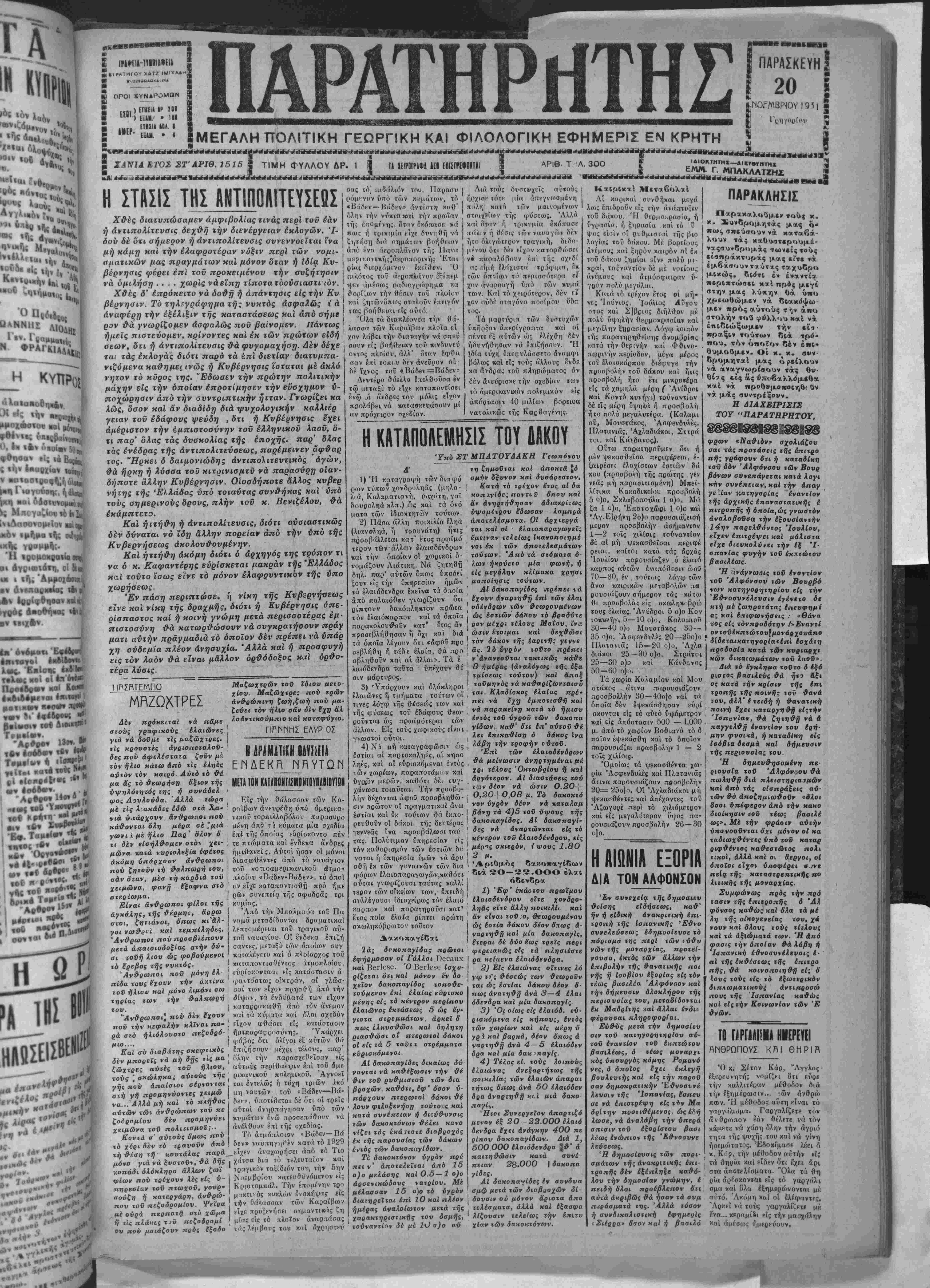 ΧΑΝΙΑ ΕΤΟΣ ΣΤ ΑΡΙΘ. 1515 Μ ΤΙΜΗ ΦΥΛΛΟΥ