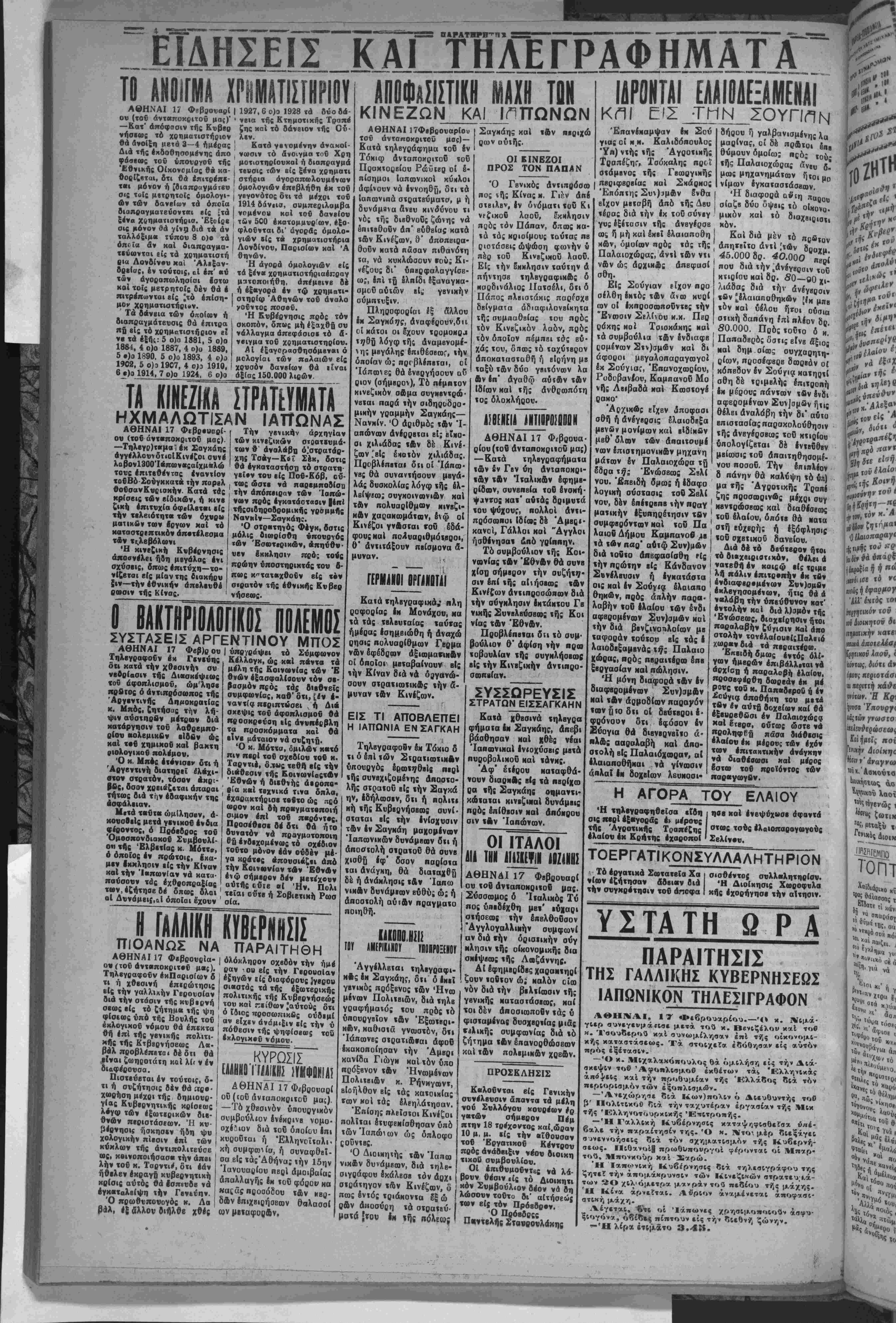 ΑΘΗΝΑΙ, 17 «1>·βρουαρίου.—-'<· κ. Νΐμά· γΐερ συνεγευμάπσε μετά τού κ. Βενιζέλου καί τού η. Τσουδερου καί συνωμίλησαν έ«1 τής οίκονομΐ- κής καταστάσεως. Τα στοιχεϊα εδόθησαν είς αυτόν πρός εξέτασιν. —Ό κ. Μιχαλακόπουλος θά ομιλήση είς την Διά¬ σκεψιν τού Άφοπλΐσμού έκθέτων τάς Ελληνικάς άκό^εΐς καί την προθυμίαν τής Ελλάδος διά τόν περιορισμόν των έξοπλισμών. —Ανεχώρησε διά Κων)πολΐν ό Διευθυντήν τού β' Ηολΐτικοϋ διά την ταχυτέραν εργασίαν τής Μΐκ τής 'Έλληνοτουρκΐκής Έ-ΐτροπής. — Ή Γαλλΐκή Κυβέρνησις καταψηφισθείσα υπέ¬ βαλε την παράίτησίν της. Ό κ. Ντθ μέρ δΐεξάγεΐ συνεννοήσεΐς διά τόν σχηματισμόν τής Κυβερνή¬ σεως. Ι1ιθανοί| πρωθυ-ουργοί φέρονταΐ οί Μπαρ- τού, Μπονκούρ Μαί Σαρώ. Ή Ιαπ<.·>νΐκή Κυβέρνησις βιά τηλβσιγράφου της