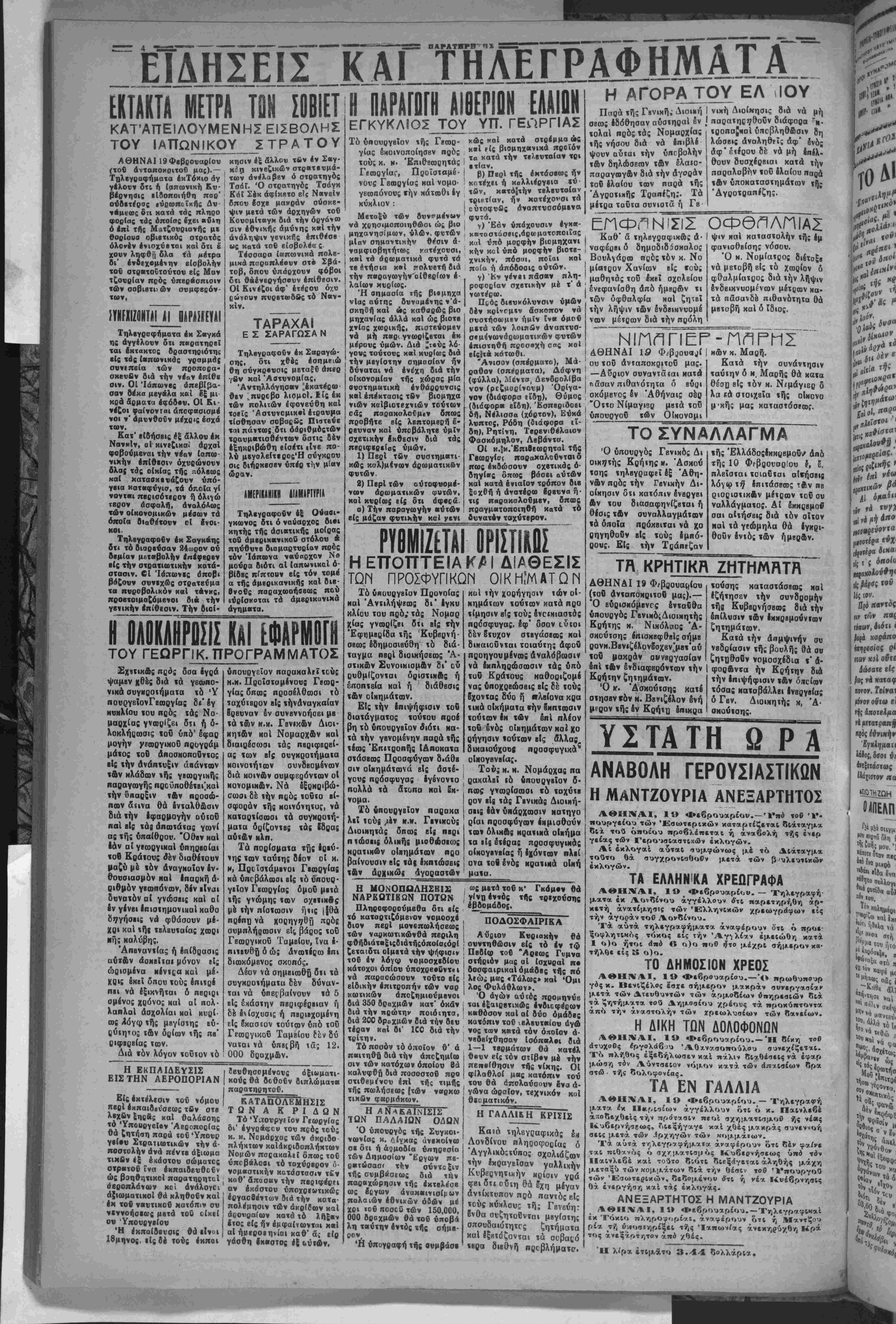 ΑΘΗΝΑΙ, 19 Φεβρουαρίου. — Τηλεγραφή