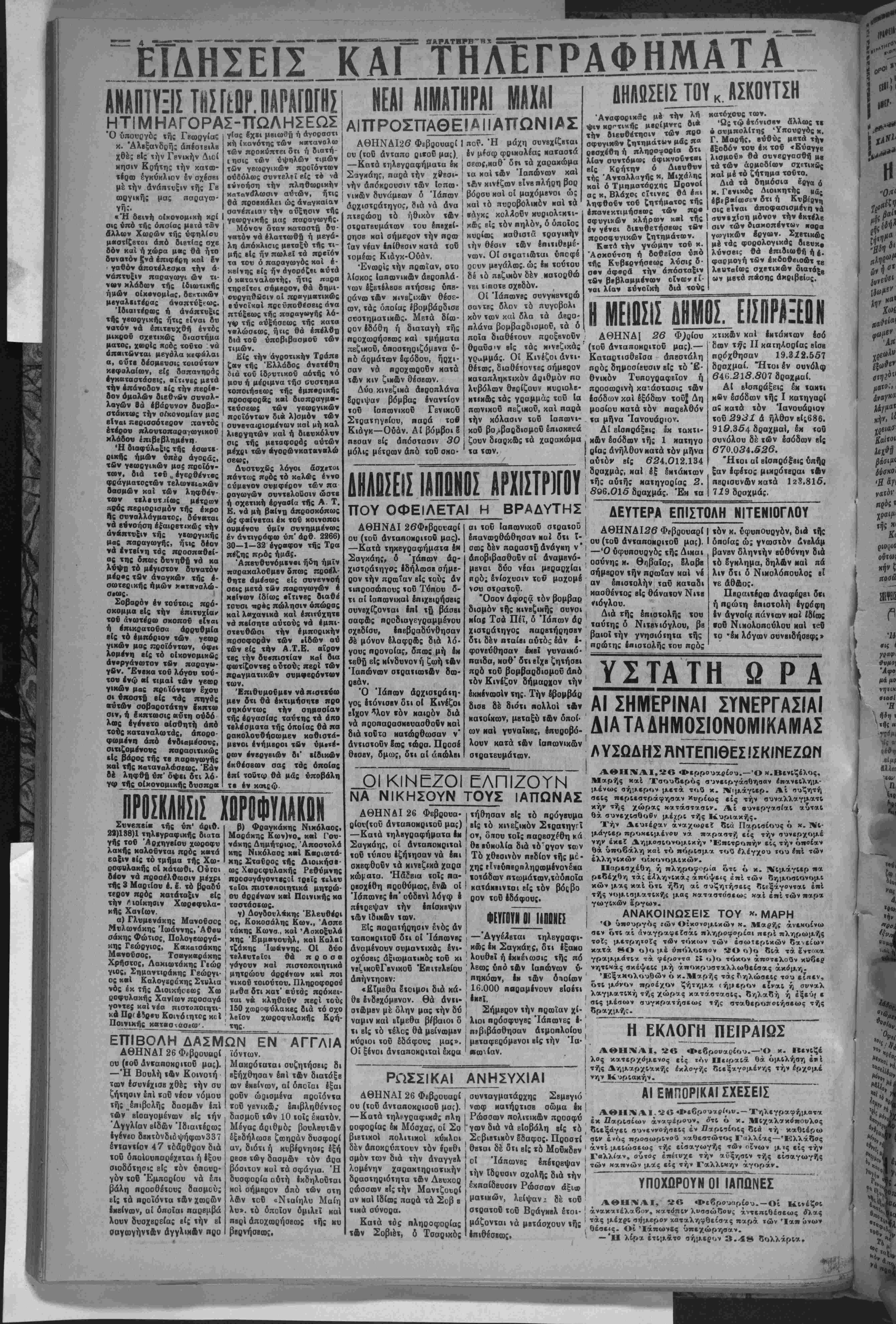 Εξακολουθών ό κ.Μαρής τάς ?<ηλώσεις τού είπεν, ότι μόνον προέχον ζήτημα (ήιιερον είναι ή συναλ λαγματιχή τής χώρας κατάστασις, δηλαδή ή έξεύ; ε σις μέσων αυγκρατήσεως τής σταθεροποιήσεως τής δραχμής.________________________ Η ΕΚΛΟΓΙΊ ΠΕΙΡΑΙΩΣ ΑΘΗΝΑΙ, 2β 4Γ*εβρουαρέου.—Ό κ. Βενιζέ λος κατερχόμενος είς τόν ΙΙ«ιραιά Θά ομιλήση ε*Ι τής Δημαρχιακής έκλογής διβξαγομένης την έρχομέ νην Κυριακήν._______________________________ 1 ΑΙ ΕΜΠΙΡΡίΚΑΙ ΣΧΕΣΕΪΣ 1 ΑΘΙΙΝΑΙ-2««1>*βρ01>αβίου.—Τηλεγραφήματα