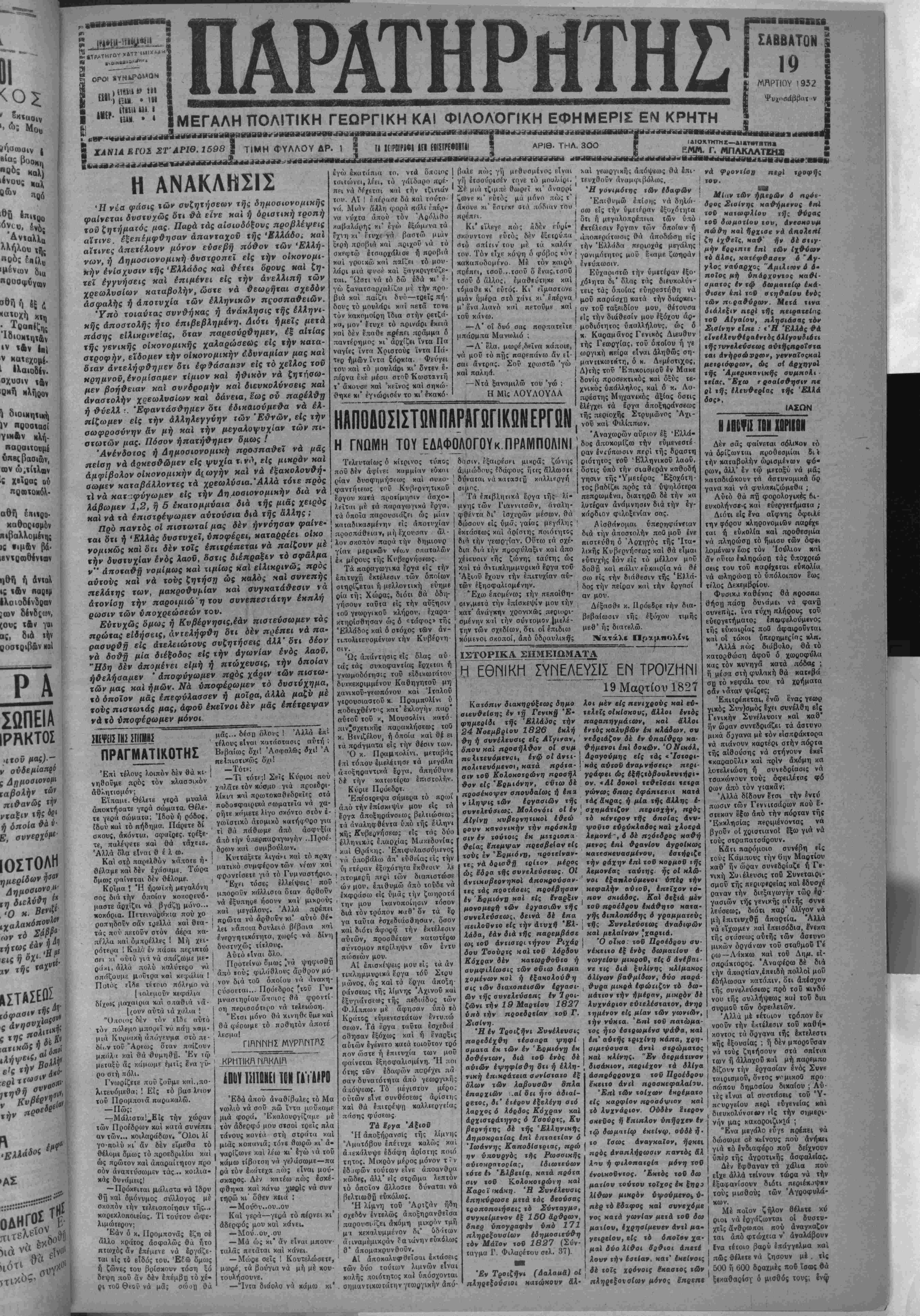 *η<Ρα β ««.««•«ε» ιιιι»|ϊυι · (υ Ι «» ί'ΓΊ". 1ΜΕΓΑΛΗΠΟΛΙΤΙΚΗ ΓΕΩΡΓΙΚΗ ΚΑΙ ΦΙΛΟΛΟΠΚΗ ΕΦΗΜΕΡΙΣ ΕΝ ΚΡΗΤΗ ΧΑΝΙΑ ΒΓΟΣ ΣΤ'ΑΡΙΘ. 1598 | ΤΙΜΗ ΦΥΛΛΟΥ ΔΡ. 1 | ΤΑ «ΙΡΟΙΡΑ*! ΑΠ ίβΙίΙΡίΙΜΙΛΐ ΣΑΒΒΑΤΟΝ | 19 Μ/ΐΡΤΙΟΥ 1932 |Τ·Τατν|« ΕΜΜ. Γ. ΜΠΑΚΛΛΤΕΗ11 Η ΑΝΑΚΛΗΣΙΣ Ήνέα φύσις ιών σνζητήσεων τής δημοσιονομιχής φαίνεται δνστνχώς δτι θά είνε και η δριστικη τροπή τοϋ ζητήμαίός μας. Παρά τάς αΐαιοδόξους προβλέψεις α'ίτινε. έξετΐέμφθησαν άπανταχοϋ «ής Έλλάδο. καί αίτινες απετέλουν μόνον εύαεβή πό&ον των Έλλη¬ ν ών, ή Δημόσιον ο μιαή δνστροπεϊ είς την οικονομι¬ κήν ενίσχυσιν «ής Ελλάδος χαί Θέτει όρους καί ζη¬ τεί έγγνήαεις χαϊ έπιμένει είς την άνελλιπή των χρεωλνσίων καταβολήν, ώοτε νά ϋεωρηται σχεδόν άαφαλής ή άηοτυχία των έλληνικών πςοαπα&ειών. Υπό τοιαύτας συνθήκας η ανάκλησις τής έλληνι- κης άποστολής ήτο επιβεβλημένη. Διότι ημείς μετά πάσης εΐλιπρινείας, δταν παρεσύρθημεν, εξ αίτίας τής γενικάς οικονομικάς χαλαρώσεως είς «ην κατα¬ στροφήν, είδομεν την οικονομικήν αδυναμίαν μας καί. οίαν αντελήφθημεν ότι έφ&άσαΗ3ν είς τό χεϊλος τοΰ πρημνοϋ,ένομίσαμεν τίμιον χαί ηθικόν νά ζητησω- μεν βοήθειαν καί συνδρομήν χαί διενχολύνσεις χαι αναστολήν χρεωλυσίων καί δάνεια, έ'ως οί παρέλ&ΐ] ή θύελΛ ·. 'Εφαντάσθημεν δτι εδικαιούμεθα νά ελ¬ πίζωμεν είς την αλληλεγγύην των "Εθνών, είς την σωφροσύνην άν μή χαί την μεγαλοψυχίαν των πι- στωτών μας. Πόσον ήπατήθημεν όμως / Άνένδοτος η Δημοσιονομικη προ^παΰ'εϊ νά μάς πείση νά άρηεσ&ώμεν είς ψνχία τ«νΛ, είς μικράν χαί αμφίβολον οικονομικήν άζωγήν χαί νά εξακολουθή- σωμεν καταβάλλοντες τα χρεωλυσία. Αλλά τότε πρός τ* νά κατ-:φύγωμεν είς την Δηχοαιονομικήν διά νά λάβωμεν 1,2, η 5 έχατομμύαια διά τής μιάς χειρός , καί νά τα επιτρέψωμεν αύτούσια διά τής αλλης ; Πρό παντός οί πιστωταί μας δέν ηννόησα* φαίνε- χαι ότι η Ελλάς δυστυχεΐ, ΰποφέρει, καταρρέει οίχο ■ νομικώς χαί ό π δέν τοις έΉιτρέπεται νά παίζουν μέ ', ζήν δυστυχίαν ενός λαοϋ, όστις όΊέπραξεν τό αφάλμα ν" άπο%α&ή νομίμως χαί τιμίως καί ειλικρινώς πρός αύτούς καί νά τονς ζητήση ώς χαλός παΐ σννεπής σιελάτης των, μαχροΦνμίαν και συγκατάθεσιν ν ά ατονίση την παροιμιώ'η νού συνεπεστάτην έκπλή ρωσιν των υποχρεώσεων τον. Εύτυχώς όμως η Κνβέρνησις,έάν πιστεύσωμεν τάς πρώτας είδήσεις, αντελήφθη δτι δέν π^έπει νά πα· ρασνρϋη είς άτελειώτονς σνζητήσεις άλλ' δτι δέον νά δοθή μία διέξοδος είς την αγωνίαν ενός λαόν. "Ηδη δέν άπομένει είμή ή πτώχευαις, την οποίαν ή&ελήααμεν ' αποφύγωμεν πρός χάριν των πιστω- τών μας χαΐ ημών. Νά υποφέρωμεν τό δνστύχημα, %ό οποίον μάς έπεφύλασαεν ή μοΐρα, άλλά μαζύ μέ τούς πιστωτάς μας, άφοϋ έχεινοι δέν μάς έπέτρεψαν νά χό υποφέρωμεν μόνοι. μας. . δέση όλονς ! Άλλά επί τέλους είναι κατάστασις αυτή ; Βεβαίως δχι! Ασφαλώς δχι! Ά πελπιστικώς οχι! —Τοτρ; —Τί τοτρ;! Σεΐς Κύριοι πού χα?άτε τόν χόσμο γιά προβδρι- λίκια χαί πρωτοκαίΗδρΗΡς στά ποδο·φαιρικά Γωματεΐα νά χα¬ ρήτε κάμετε λίγυ σκόντο στόν έ- γοηστικό άτομικύ «ατήφθρο για τί θά πάθωμε άπό άσφνξία ά ιό την υπερπαραγωγήν ..Προε- δοίον κιΐί συμβούλιον. Κυτταξιτε λιγάΉ καί τό πραγ ματικό συμφέρον των νέων καί ςρροντίσετε γιά τό Γυμναστήριο. "Εχρι τόσες έλλείψεις ποΰ μποροΰν κ<ίλλισια δταν άρθοΰν νά έξυπηρε ήσονν καΐ μιχρούς καί μεγάλους. Ά)λά πρέπει πρώτα νά άρθοΰν χι* αύτό θέ¬ λει κά'ποια δονλεια βεβαία καί Ινεργητικότητα, χωρίς νά δίνη δυστνχώς τίτλθυς. Αύτό ΐΐναι δλο. Προτείνω ομως ^νά ψηφισθή άπό τού; φιλιίθλους άρθρον μό νόν διά τοθ δποί