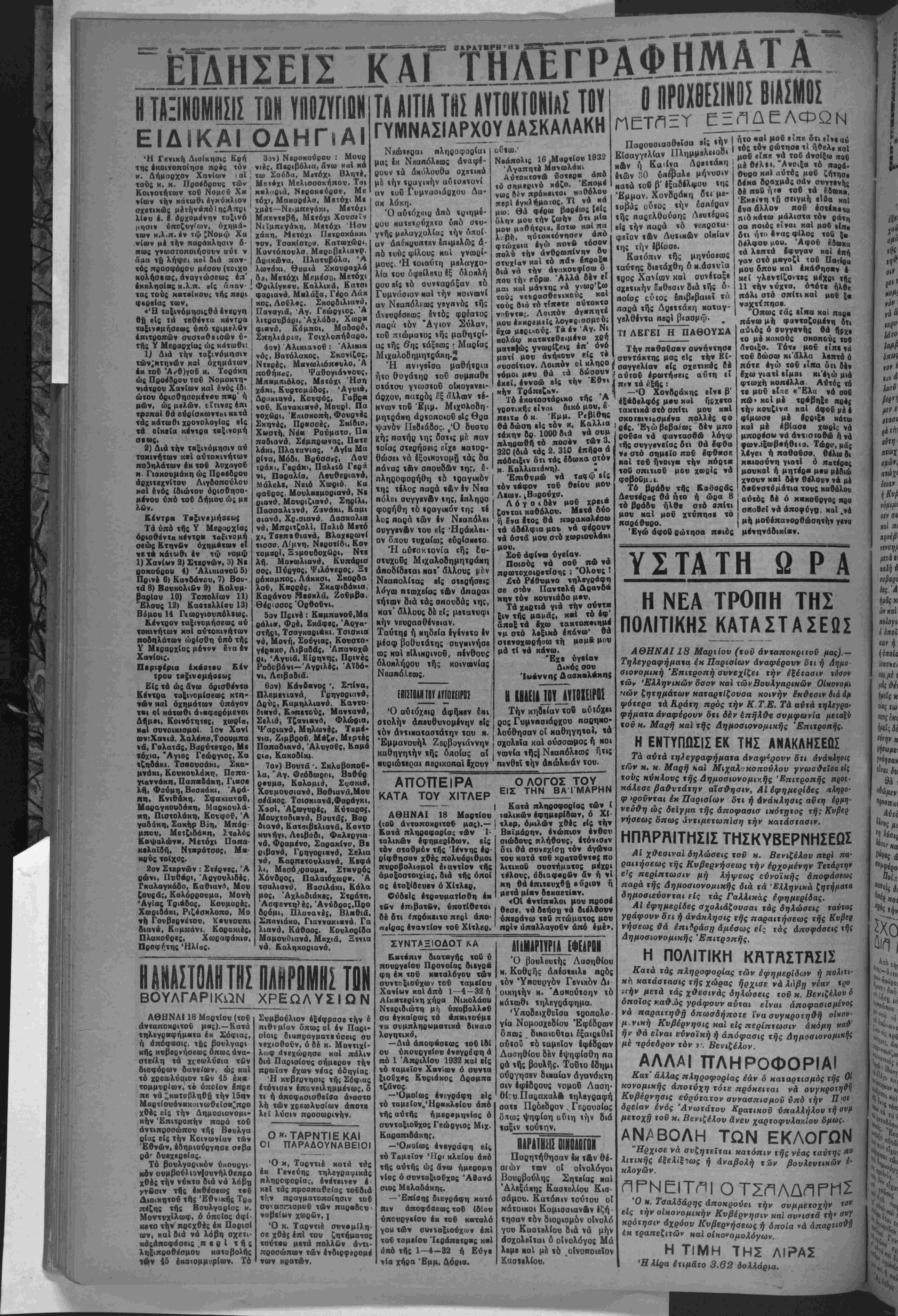 ρουν <ά άχόλουθα σχβιΐκά με «ήν ϊϋαγιχήν αΰΐοιιτονί αν ϊυϋ Γνμνασιόιρχου Δα- σκ λάχη. Ό αύΐόχβιρ Λπό ιριημδ- ρυυ καϊβτρύχβίθ υπό ο.υ- γνής μβλαγχολ.ας ΐήν οποί¬ αν άη^Μρυητβν δπιμβλώς ά· πό ιυύς φίλους κοί γνοοςί- μους. Ή τοιαύτη μβλαγχο- λία «ου όφβίλβϊϋ βξ δλοιιλή ρου είς τό συνταράξαν τό Γυμνάσιον καΐ '.ήν ποινωνί αν Νεαπόλεοας γβγπνός τής ανβυοίσβοος δνΐός φρέατος παρά (όν Άγιον Σύλαν, τοΰ πιώματος «ής μαθητρί¬ ας «ής 6ης τάξβοας γ Μαρίας Μιχαλοδημητ-θάχη.2 Ή ηνιγβϊσα μαθή<ρια ήτο θυγάΐηρ τοΰ συμπαθβ οΐάτον γνωσ«οΰ οΐκογενβι- άρχον, πατρόί εξ αΑ,λαιν «έ- κνων τοδ Έμμ. Μιχολοδη- μητράκη άρτοποιοΰ βΐς Θαα ψανόν Πββίάβος. ,'Ο δυστυ ή; παιήρ η; δσΐις με παν «οίας σιΐρήοβις εΐχβ Νανορ· θώσβι νά έξοικονομΒ «άς δα πάνας «Αν σπουδή ν »ηΓ, έ- πληροφορήθη «δ ΐραγιχόν της «ίλος παρά «&ν Ιν Νβα πόλει συγγβνΑν «ής, Ιπληρο φορήθη «ό «ραγικόν της τί λος παρά των Ιν Νβαπόλβι συγγενΛν τού είς Ηράκλει¬ ον δπου τυχαίως βΰρ(σΜβ«ο. Ή αύϊοκΐονία (ής £υ· σιυχοδς ΜιχαλοδημητράΝη άποοίδβται κα«'δλλους μέν Νβαπολίτας β(ς σϊβρήσβις λόγ- πτοοχβίας «ών απαραι «ήταν διά «άς σπουδάς «ής, κατ' δλλους δέ εί; μαιαΐυφι κήν νβυρασθένβιαν. Ταύτηβ ή Νηδβ(α Ιγίνβτο Ιν μίοφ βοθυ«α«ης ουγιιινήσβ ως καϊ βΐλικρινοΰ, πίνθονς ολοκλήρου τής κοινωνίας ΝβαπόλΒΐης, Ε01.ΓΟΑΤΓΟΥ ίΠΟΙΕΙΡΟΣ Ό αΰιόχβιρ άφήκβν έαι σιολήν ΑπΒυΘυνομίνην αίς «όν αντικαταστάτην «ου ν. Εμμανουήλ Ζδοβογιάννην Σνμβούλιον έξέφρασβ την πιθιμίαν δπως οί έν Παρι οΐοις διαπραγματβύσβις σν νβχισθονν, ό δέ κ. Μοντιχί- λωφ άνεχώρησβ χαΐ πάλιν διά Παρισίους σήμερον τη πρωΐαν έχων νβας όδηγίας Ή κνβΐρνησις τής Σόφιας ετόνισεν επανειλημμένας, δ τι ή αποφασισθείσα άναστο λή των χοεωλνσίων άποτβ λιί λύσιν προσωρινήν. Οκ.ΤΑΡΝΤΙΕΚΑΙ ΟΙ ΠΑΡΑΔΟΥΝΑΒΕΙΟ Ό μ, Ταρντιέ χαχά τάς έκ Γβνεύης τηλεγραφικάς πληροφορίας, ένέτβινβν έ κβί τάς προσπαθείας τονδιά την πραγματοποίησιν τοΰ σννασπσμοΰ των παροιδευ νοβείων χωρών, ι Ό κ. Ταρντιέ συνομίλη σε χθέςεπί τού ζητήματος τούτου μ·τά πολλών άντι προσώπων των ένδιρΦερομι νων κρατών. ου«οο.' Νεάπολις 16 ,Μαοτίου 1932 Άγαπητέ Μανωλάκι Αύτοχιονώ νΌτ·ο« Ληύ «ό σημββΐ'ό χάζο. 'Βπομί νως βέν πρόκειται χασόλον πβρίέγκ)ήματος.ΤΙ νά κά μω, Θά φίοω βαρέως ,βίς δλτρ μόν την ζωήν Οτι μ»α μόν μαθήτριο, «στ» χαΑχά λ, βίτ, ηυτοκτόνησε άπό φτώχεια έγώ πονβ τόσον πολύ την ανθρωπίνην δν στνχίαν κοί τό πάν β«βοξ- Βιά νά την άναχονφίσω ο που την βΰρω Άλλά β.ν «Ι μαι καί μάντης νά γνωρ'ζω το»; νβιοασθβν.κους «αι τούς διά τό τί*·™ αύτοκτο νονντας. Λοιπόν άγεΐπητε μόν έχκρεμεΐς λογ·βιασμνύ; βχω μβρικονς. Τα έν Αγ. Νι κολάω κατατεθειμένα χρή ματ·|ως γνωρ,Ιζβις επ όνό μοτί μου άνήχουν είς τ· σνσσίτιον. Λοιπόν νόμοι μ*υ θά τα έχβΐ, έννοώ *·ς «* κήν Τράπεζαν. Τό εκατοστάρικα γροτικής είναι δικό μου, β πβιτα ό κ. Εμμ. Ρ«β|θης θά δώση είς «όν χ. Καλλια τάχην δρ. 1000 διά νά συμ πληοωθή τό ποσόν των 3. 320 (διά τάς 2. 310 έπήοα ά πόββιξιν δΐι τάς δδωχα στόν κ. Καλλιατάκη). . Έπιβνμω νά Τααψ είς τόν τάφον τοΰ θείον μόν Λΐων. ιΒαοσύχο. Λ ό γ ο ι δέν μόν χρβι« ζονται καθόλου. Μ·τά βυο ή δνα Ιτος θά οιορακαλβσω τα άδέλφια μου νά φέβονν νά όστά μόν στό χωριονλάκι μου. Σοΰ άφίνω υγείαν. Ποιούς νά σον πώ νά πρωτοχοιρβτίσης ; "Ολονς ι £τό Ράθυμνο τηλβγράφη σβ στόν Παντβλή Δρανδά χην τόν κουνιάδο μ·υ, Τα χαρτιά γιά την σύντει ξιν τής μαμάς, κβί «ό έφ' άπαξ τα βχω τακτοπ·ιημ· ν μ στό λβξιχό έπάνοο' θά Σ ΠΕΤΠΞΥ ΕΞίΙΔΕΛΦΩΝ — α ·~.. -»λ *ί»ν Ι ήτο «αί μόν είπβ δτι ιΐνε αύ Παρουσιασθείσα