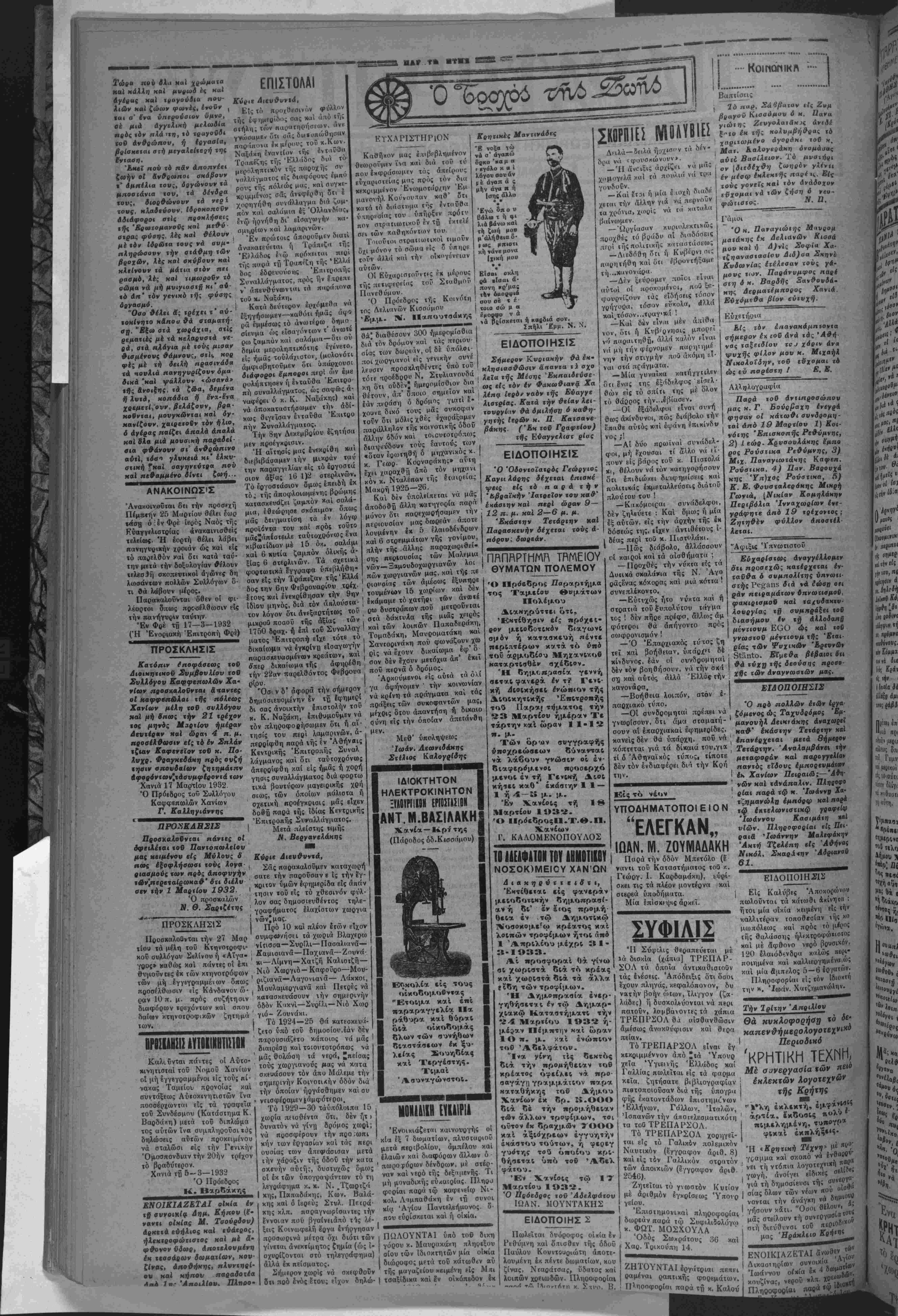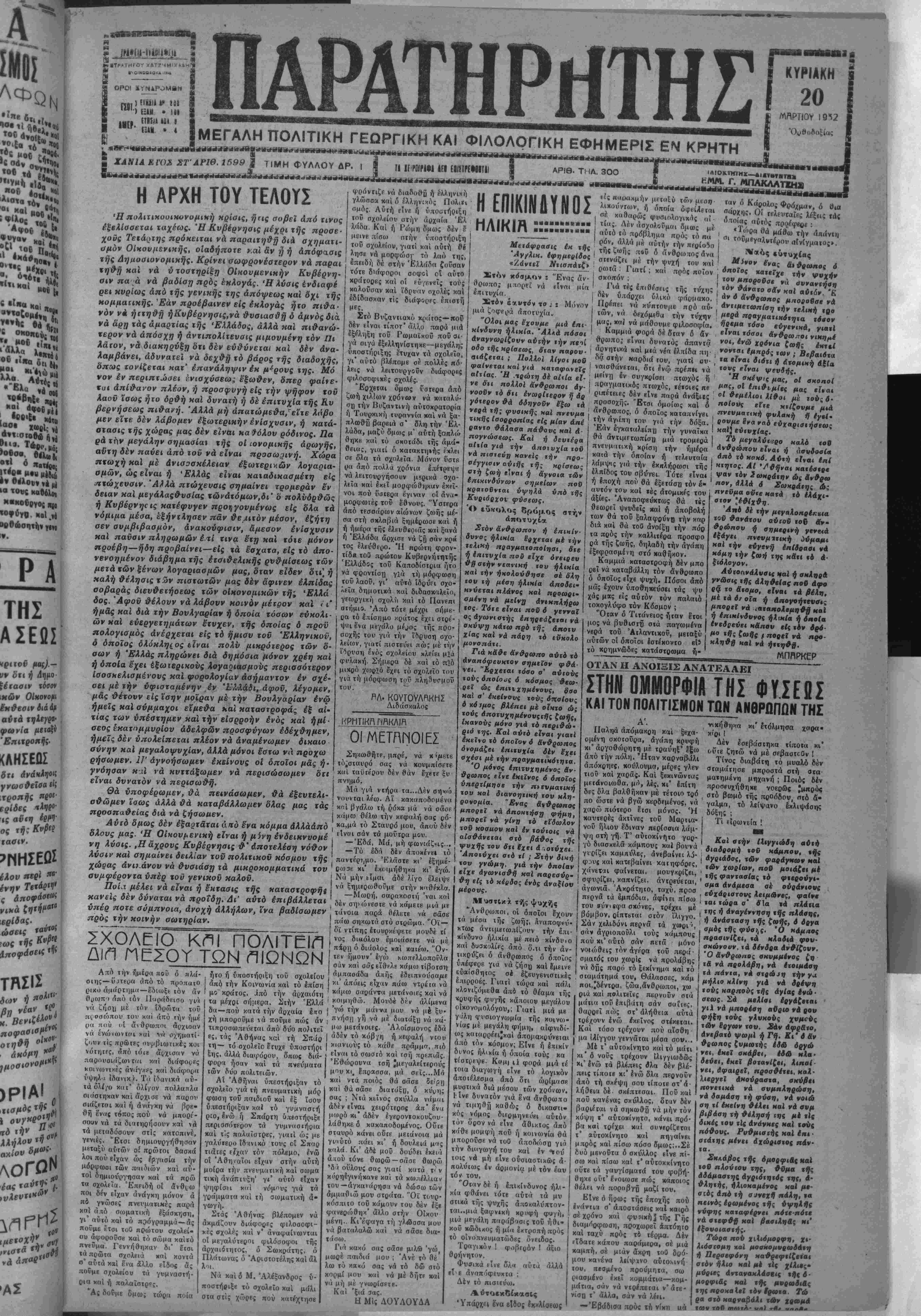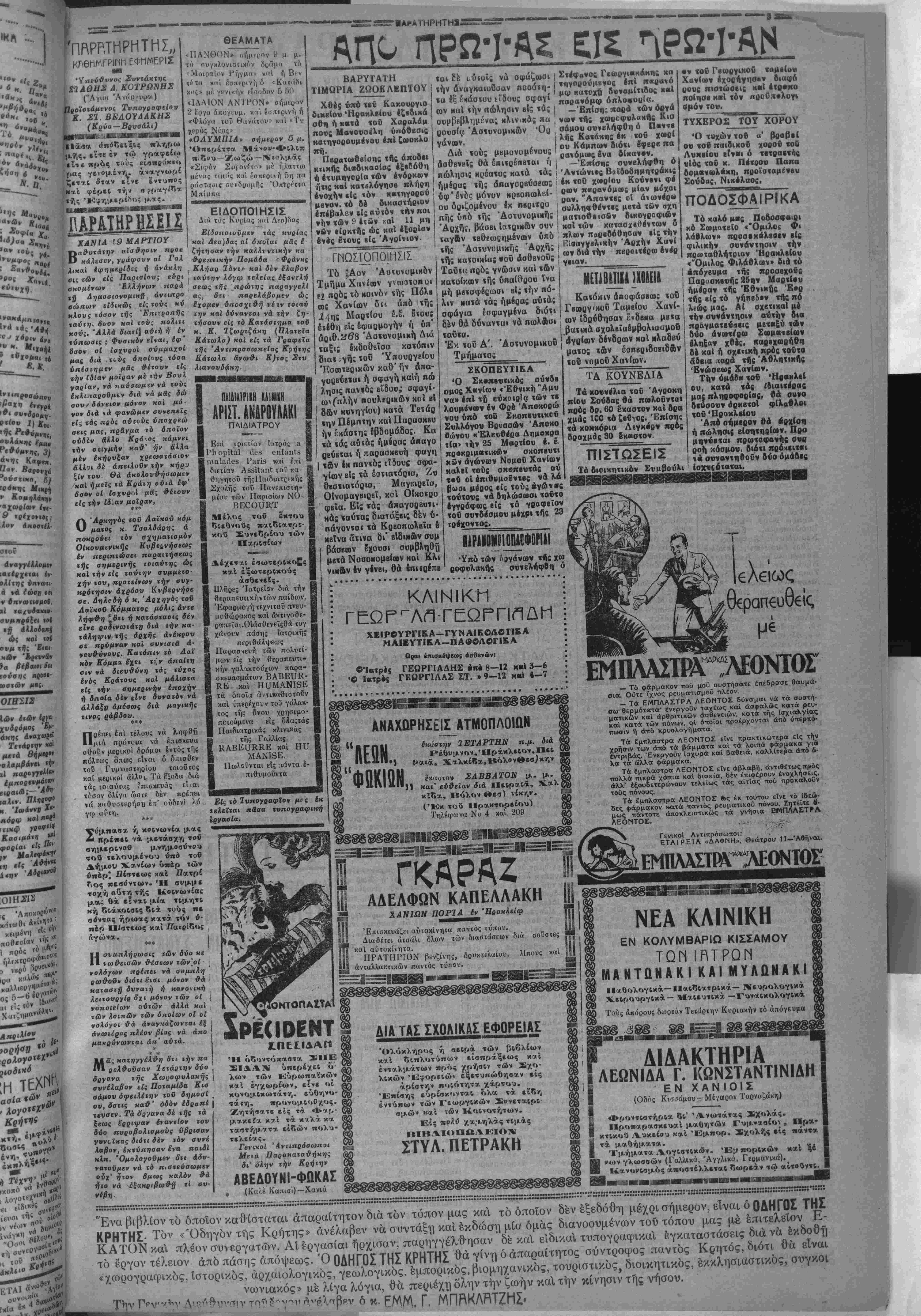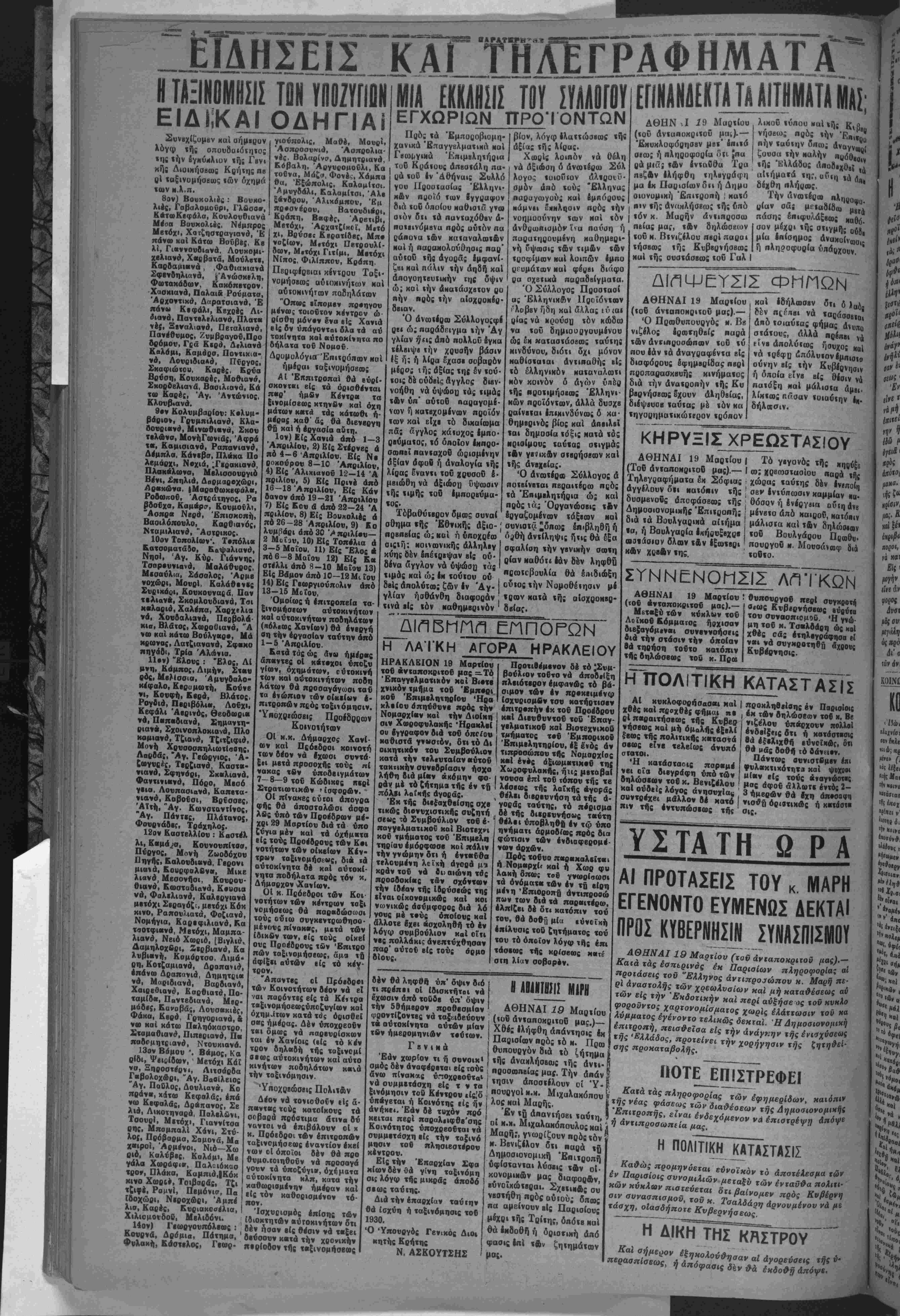 Προτιθέμενον δέ τό ι—»<· βούλιον τουτο νά άποδεΐξη πλειότερον έμφανώς «ό βά¬ σιμον «ών έν προκειμένω (σχυρισμβν τσυ κατήρτισβν επιτροπήν έκ τοϋ Πρόεδρον καί Διβνθνν«οΰ «οδ 'Επαγ- γελματιχοΰ καί Βιοτεχνιχοθ τμήματος τού Εμπορικον 'Επιμελητηρίον, έξ ενός άν τιπροαώπου «ής Νομσρχΐσς χειί ενός αξιωμαιτΐΜσΰ της Χωροφνλακής, ήης μβτοβαί νονσα επί «ου τόπον «ής «β λέσβως τής λοΐχής άγορδς ( θέλει βιβρβυνήση τα «ής ά¬ γοράς ταύτης, τό πορισμα δέ «ής διβρβυνήσως ταύτη 4 θέλει υποβληθή έν «φ υπο ηνήματι αρμοδίως πρός δια φώτισιν «ών ενδιαφερομέ¬ νων άρχών. Πρός «ουυο παρακαλείγαι 4 Νομαρχί» χαί ή Χωρ φ» λακή δπως τοΰ γνωρίσωσι «ά όνόματα των έν τή βίρη μένη 'ΕπιΟροηή άντιπροοώ «των των διά «ά παροιιτέρω, έλπΐζβι δέ δτι κατόπιν «ού τού. θά βοθί) μία εύνοϊκή έπίλυσις τοΟ ζη«ήματος «ού «ου τό οποίον λόγφ τής επι τάσεως «ής κρίσεως Μ«τέ στπ λίαν σοβορον. ΑΘΗΝΑΙ 19 Μαρτίου : (τοβ άνταποκριτοΰ μας).— Μετβξύ των κύκλων τού Λοϊχοΰ Εόμματος ήρχισαν διβξαγόμεναι σννεννοήσεις διά «ην στάσιν «ήν οποίαν Θά τηρήση τούτο κατόπιν «ής δηλώσεως «ού χ. Πρω θνπονργοΰ πβρΐ σνγχροτή σ«ως Κνββρνήσβως βΰρύια «όν σννασπιομοΰ, Ή γνώ- μη τοΟ κ. Τσαλβάρη ώς κα. χθές οάς έτηλ·γράφησα «Ι ναι νά σνγκβοτηβή ά Κυβέρνησις. Η ΠΟΛΙΤΙΚΗ ΚΑΤΑΣΤΑΣΙΣ δέν θά ληφθή ύπ' δψιν διό «ιπρέπει οί (δισκτήτοΐ νά έχωσιν άπό τούδε ύα' όψιν την 5θήμερον προθεσμίαν φροντΐεοντες νά ταξβιββύονν τα αύτοκίνητα αυτών μίαν τβν ήμερομηνιών τούτων. Γβνικά Εάν χωρίον «ι ή σννοιχ* σμός δέν άναφέρε«αι βίς τούς όνω πίνακας ύπθχρεοΦ«α· νά συμμετάσχη είς « ν τα ξινόμησιν τού Κέντρον είς,'δ ύπίγβται ή Κοινότης είς ή*ν άνήχει. Εάν δέ τυχόν πρό κείται πβρΐ πσραλεΐφθε'σης Κοινότητος ύποχρβοΰται νά σνμμετάσχη είς την ταζινό μησιν τοβ πλησιέστερον κέντρον. Είς την Επαρχίαν Σφα Μ(ων δέν θά γίνη ταξινόμη σις λόγφ «ής μικράς άποδό σβως «αύΐης. Διά την επαρχίαν «αύτην θά ίσχύη ή ταξινόμησις τοβ 1930. Ό Ύπουργός Γενικάς Διθι κητής Κρήτης Ν, ΑΣΚΟΥΤΣΗΣ ΜΙΡΗ ΑΘΗΝΑΙ 19 Μαρτίου («οδ ανταποκριιοθ μας.)— Χθές ελήφθη απάντησις έκ Παρισίων πρό; τό κ. Πρω θυπονργόν διά «ό ζήτημα «ής Αναχλήσβαις τής Αν«ι· προσωπΒ.ας μα{. Την Απαν «ησιν ΑποστΙλουν οί Ύ- πουργοΐ κ.κ. Μιχαλακόπου λοε καί Μαρής. Έν «ό Απαντήσει «αύτη, οί κ.χ. Μιχαλακόπουλος καί Μαρή;, γ>ωρίζονν πρός «όν