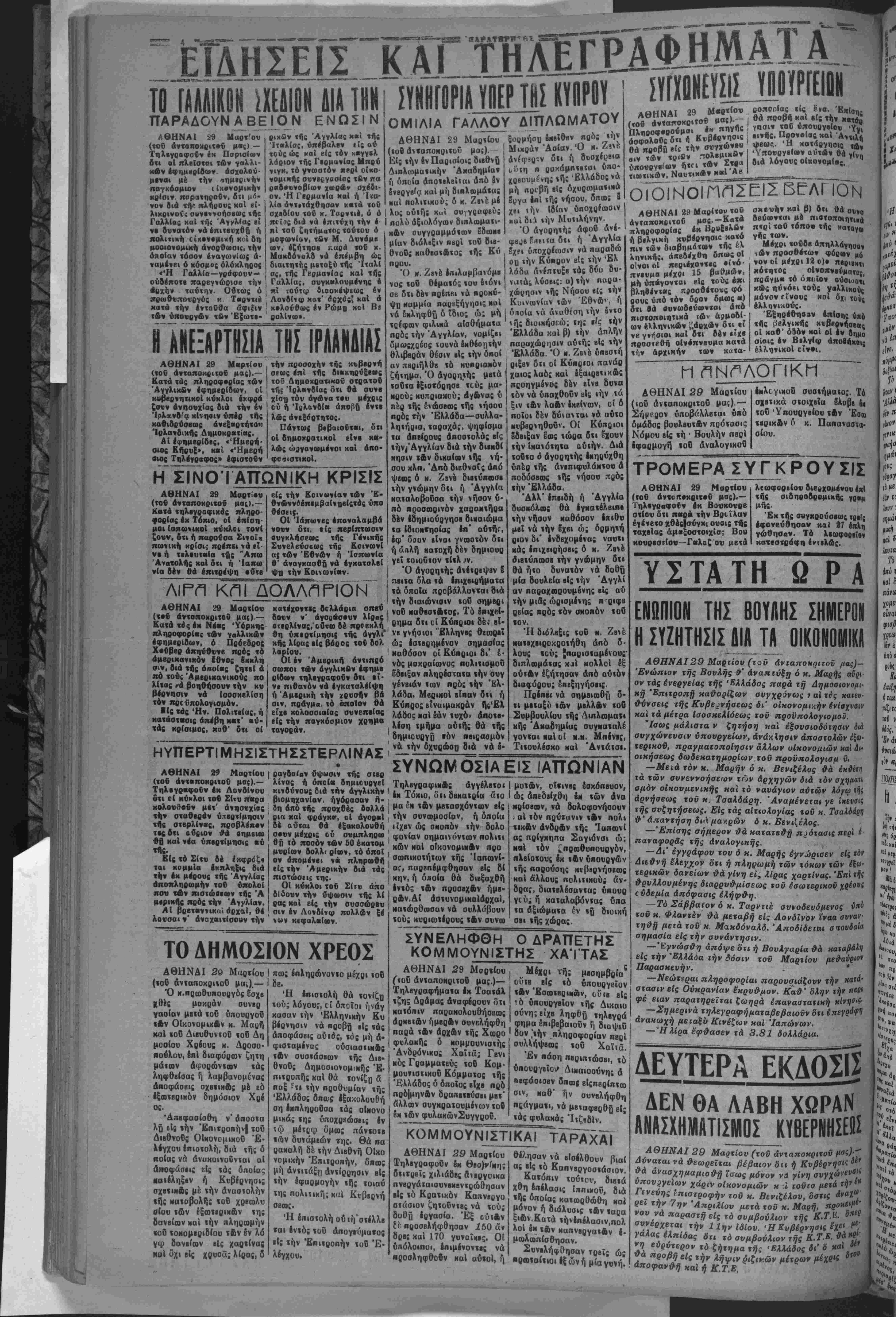 (<οδ άνταποκριτοϋ μα;).— Σήμροον ΰποβάλλβΐαι υπό ομάδος βουλβυτΑν πρότασις Νόμου βΐς «ή ' Βουλήν πβρϊ έφαρμογη' «οδ αναλογικοδ Ικλεγικυϋ συσ«ήμα«ος. Τα σχβτικά στοιχβϊα δλοββ «μ «οδ Ύπουργβίου τΑν Έσοο «βρικλν δ κ. Πακαναστα· σίου. ΤΡΟΜΕΡΑ ΣΥΓΚΡΟΥΣΙΣ ΑΘΗΝΑΙ 29 Μαρτίου (τοθ άντυπβχριτβΰ μσς).— Γηλεγραφοίν έκ Βουκονρε στΐου δτι παρα την Βριΐλαν εγένετο χθές|σύγκι ουοις τής ταχείας άμαξοστοιχίσς Βου κουρεστίου—Γαλοζ ου μβτά λΐακροριΐΌυ βιββχομβνου ίίτί τής σιθηοοδοομικής γο·μ μής. Έκ τής θΜγκρούσβως ~ο·ίς εφονεύθησαν καί 27 έπλη γώθησαν. Τό λιωφ κατεστράφη έντβλώς. ΥΣΤΑΤΗ ΩΡΑ ΕΝΩΠΙΟΝ ΤΗΣ ΒΟΥΛΗΣ ΣΗΜΕΡΟΝ Η ΣΥΖΗΤΗΣΙΣ ΑΙΑ ΤΑ ΑΘΗΝΑΙ29 Μαρτίου (χον άνταποπριτοΰ μας)- 'Ενώπιον τής Βουλής *' αναπτύξη ό κ. Μαρής αυρι¬ ον τάς ενεργείας τής Ελλάδος παρά τή Δημοσιονομι- χή Έπιτροπή καΰ·ορίζων συγχρόνως ι αί τίς χαιευ· θύνσεις τής Κυβερνήσεως δι' οικονομικήν ένίαχνοιν και τα μέτρα Ισοσκελίόεως τοϋ προνπολογιομοϋ. "Ισως μάλισΐα ν ζητήση και εξουσιοδοτηθή ίια συγχώνευσιν υπουργείων, άνάκΐησιν άποσχολών εξω¬ τερικόν, πραγματοποίησιν αλλων υίκονομιών παι Λ<· οικήσεως δωδεκατημορίων τοϋ προϋαολογιαμ ν —Μειά τόν κ. Μαρήν ό κ. Βενιζέλος θά τα των συνεννοησειν τόν όρχηγών διά τόν ,ΛΊ, σμόν οΐκουμενικής και τό ναυάγιον αυτών λόγω αρνήσεως τοϋ κ. Τσαλδάρη. Άναμένεται γε ίχει.., τής συζητήσεως. Είς τάς αίτιολογίας %οϋ κ. ΤοαΙδάξη θ' απαντήση δκ μακρών δ κ. Βενιίέλος. —Έπίσης σήμερον θά κατατβθή πρότασις περϊ έ παναφοράς τής άναλογικής. — Δι' έγγράφου τού δ κ. Μαρής έγνώρισεν είς ΐον Δΐί&νή έλεγχον δτι ή πληρωμή των χόκων των εξω¬ τερικών δανείων θά γίνη εί, λίρας χαρτίνας. ΈηΙ τήζ Θρυλλσυμένης όιαρρυθμίσεως τοΰ έαωτερΐΗθΰ χρέονί ^ ύδεμία απόφασις ελήφθη. — Γό Σάββατον δ κ. Ταρντιε συνοδευόμενος ύώ τοΰ κ. Φλαντέν θά μεταβή είς Λονδίνον ί'ναα άνναν· τη&ή μειά τοϋ κ Μακδόναλδ. Άποδίδειαι αημασία είς την συνάντησιν. —"Εγνώσθη άπόψε δτι ή Βουλγαρία θά κατα είς την Έλλάόα την δύσιν τοϋ Μάρτιον μεΰ Παρασκευήν. —Νεώτεραι πληροφορίαι παρουσιάζονν την στάσιν είς Ούκρανίαν έ'κρυθμον. Καν^' δλην την φέ ειαν παρατηρεΐται ζωηρά έπανααταχιηή —Σημερινά τηλεγραφήματαβεβαιοϋν δτι άνακωχή μετάξύ Κινέζων και Ίαπώνων. —Ήλίρα έφθασεν τα 3.81 δολλάρια. ΔΕΥΤΕΡΑ ΕΚΑθΐΒ ΔΕΝ ΘΑ ΛΑΒΗ ΧδΡΑΝ ΑΝΑΣΧΗΝΙΑΤΙΣΜΟΣ ΚΥΒΕΡΝΗΣΕ8Σ ΑΘΗΝΑΙ 29 Μάρτιον (τοΰ άνιαποκριτον μας Δύναται νά Θεωρεΐται βέβαιον διι η Κυβέρνηβ* θά άνασχημαμισθ.η ί'σως μόνον ν ά γίνη αυγχών υπουργείων χάριν οίκονομιών κ Ι τοϋιο μετά Γίνευης Επιστροφήν τοϋ κ. Βενιζέλου, όστις ρει την 7ην 'Απριλίου μετά τοϋ κ. Μαοή, ηρ νού νά παραατϋ είς τό συμβούλιον τής Κ.Τ.Ε αννέρχ^ χήν 11ην1δίου ,Η κυβέρνησις Η» Υαλας ελπίδας δτι τό συμβούλιον τής Κ.Τ.Ε. Η V* εύ6ντερον τό ζήτημα τής Ελλάδος δι' δ χαί Ζ ΛΡ°^ή είς την λήψιν ρΊζω&ν μέτρων μέχρΚ δι°ν αποφανθή καί ή Κ.Τ.Ε. Ι" V * «α! ■ν