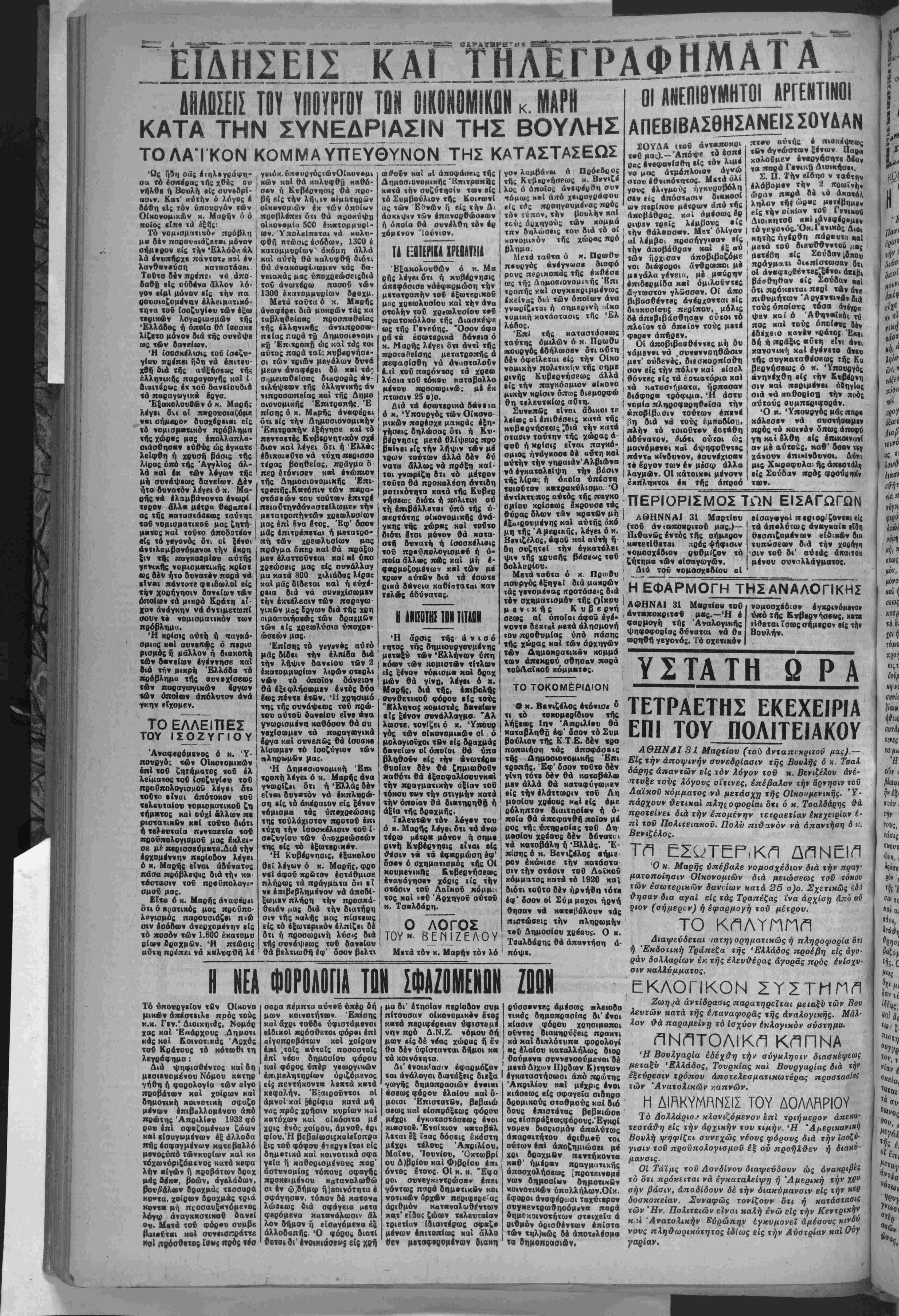 χόμματος κατά τό 1920 καΐ ■ _ ,—·-■■ ---------<----- — <-----■------» -·" —; διότι «οΰτο δέν ηρνήθη τότβ των εσωτεριχών δανήων χαιά 25 ο)ο. Σχετικώς έίί ι-.· χ—.. »ι νν.______ λ__.ι θησαν δια αγαι είς τάς Τραπέξας 'ινα αρχίση άι:δ αϋ οίον (σήμερον) ή έφαρμογή τού μέτρον. ΤΟ ΚΠΛΥΠΠΠ Διαψεύδεται ιατη) ορηματιχώς ή πληροφορία ότι ή Έχδοιιχή Τραπέζα τής Ελλάδος προέβη είς αγο¬ ράν δολλαρίων έκ τής ελευθέρας άγσράς πρός ενίσχυ¬ σιν χαλλύμματος. ΕΚΛΟΓΙΚΟΝ ΣΥΣΤΜΠλ Ζωηιά αντίδρασις παρατηρεΐται μειαξν των Βου λευτών χατά τής έπαναφοράς «ής άναλογιχής. Μάλ¬ λον θά παραμείνη τό ίαχύον έκλογιχόν σύατημα. ΠΝίΊΤΟΛΙΚη ΚΠΠΝΑ Ή Βουλγαρία εδέχθη τή/ αύγπληοιν διααηέψεως μεταξύ Ελλάδος, Τονρχίας καί Βουργαρίας διά την εξεύρεσιν τρόπον άποτελεσματιχωτέρας προοταθίαί των Άνατολικών χαπνών. Η ΔΙγΚΥΜΓΓίΣΙΣ ΤΟΥ ΔΟΛΛΗΡΐρΥ Τό Δολλάριο* κλονιζόμενον επι τριήμερον απεκα¬ τεστάθη είς την άρχιχήν τον τιμήν. 'Η Άμεριχανιηή Βονλή ψηφ'ιζει σννεχώς νέονς φόρους διά την ίαοζύ- γισιν τού προνπολογιαμόν εξ ου προήλθεν ή διακν- μανσις. Οί Τάϊμς τον Λονδίνον διαψενδονν ώς άνακριβεζ τδ δτι πρόχειται νά εγκαταλείψη ή Άμεριχή την %£υ αήν βάσιν, άποδίδουν δέ την διακύμανσιν είς την κε(? δοσχοπείαν. Συναφώς τονίζουν δτι ή χατάσταοΐζ των Ήν. Πολιτειών είναι χαλή ένώ εις την Κεντρικ^ «αί Ανατολικήν Ευρώπην έγπνμονεϊ άμέσονς κινδι* νους πληθωρικότητος ιδίως είς την Ανστρίαν χαί 0$Υ γαρίαν, ρύσσβντβς άμέσως πλβιοδο τιχθς δημοπραοίας δι' ένοι χίασιν φύρου χρησιμοποι ούντβς βιαχηρύξβις πρακτι κά καϊ βιπλότυπ- φορολογί άς ελαίου καταλλήλως βιοο θούμβνα συννβνοούμενοι δέ μβτάΔ)χων Π)οδων Κ)ΐητων έγχαταστήσωσι άπό πρώτης Απριλίου καί μέχρις ένοι χιάσβως βίς σφαγβΐα σιδηρο δρομικούς σταθμούς καί Οιό δούς έπιστάτας βββ«ιώοβ ως εΐσπράξβωςφόρους.Έγχρί νομεν διορισμόν απολύτως απαραιτήτου άριθμοΰ τοι ούτωνέπί άποζημιώσβι μέ Χ0ΐ δραχμβν πεντήκοντα καθ1 ημέραν πραγματικής άπασχολήσβως [προτεινομέ νων βημοσίνν βημοτικβν κοινοτικών ύπολλήλων.Οίκ. βφοροι άναφέρωσι ταχύτερον συγκεντρωθησόμ·να παρά δημ€καινοτήτων στοιχβΐα ά ριθμόν όριοθέντων έπίστα των τηλ)κώς δέ άποτελέσμα τα δημοηοασιβν, Ι