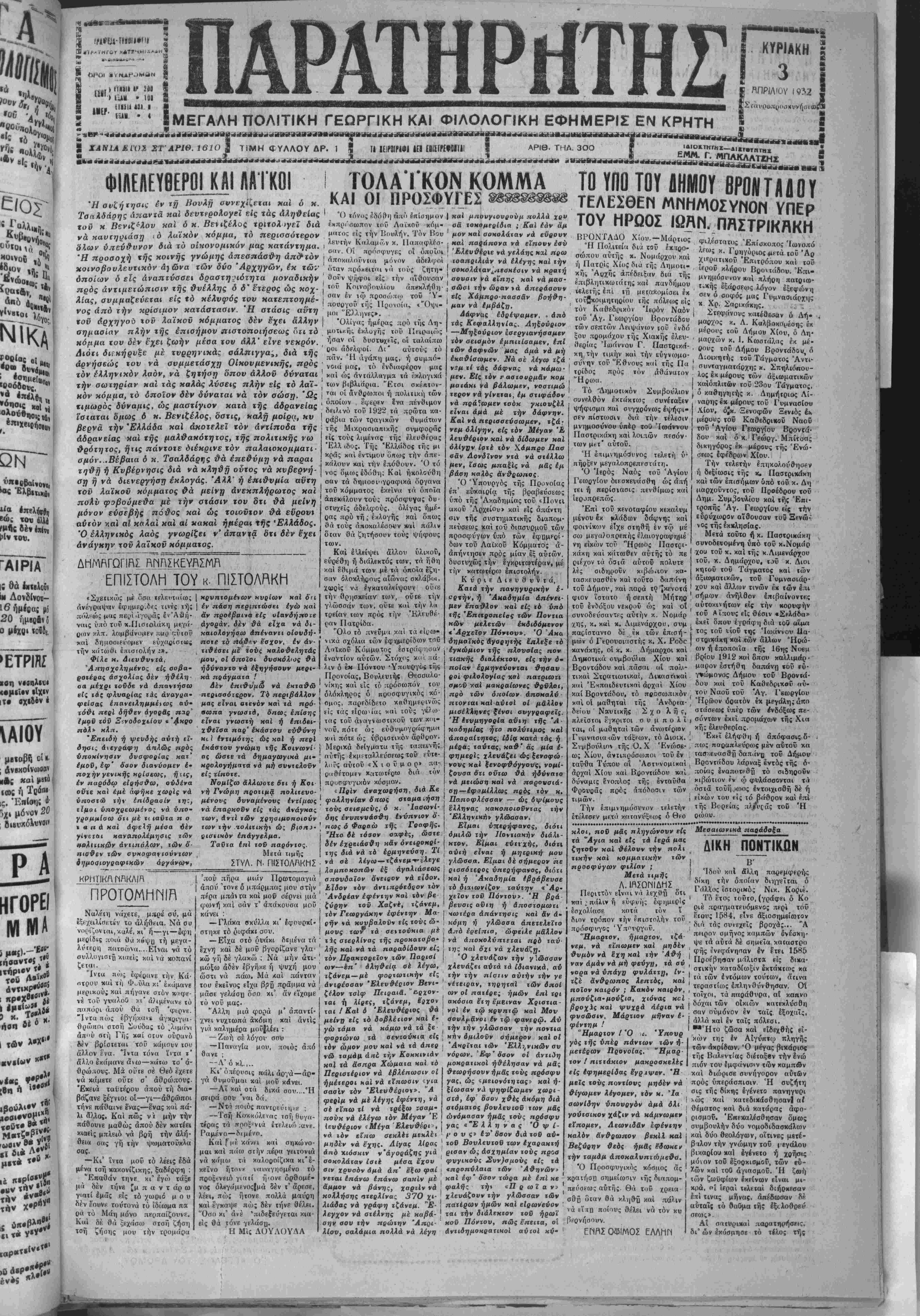 ο μέχο,ι ΐοννΕ< ►ΕΤΡΙΛΓ ιβη νεοπλιι» <·μ»ί·ν ιΐχιν ιτ· οχιδβνέ ΑΙΟΥ » ΚΥΡΙΑΚΗ Ι 3 ■ ΚΠΡΙΜΛ' 1932 «Μ* -><«ε*ε*ι»4εΙ··ι(·*4α**ε1ε1ειί*4ε»ι4ίΗ»{ ΒΜΕΓΑΛΗΠΟΛΙΤΙΚΗ ΓΕΩΡΠΚΗ ΚΑΙ ΦΙΛΟΛΟΠΚΗ ΕΦΗΜΕΡΙΣ ΕΝ ΚΡΗΤΗ ΤΙ ΙίΐΡΟΙΡΑΦΙ .ΕΙ αΐΗΚΜΠιΊ ΑΡΙΘ. ΤΗΛ. 3ΟΟ «Κ» 4·>«4