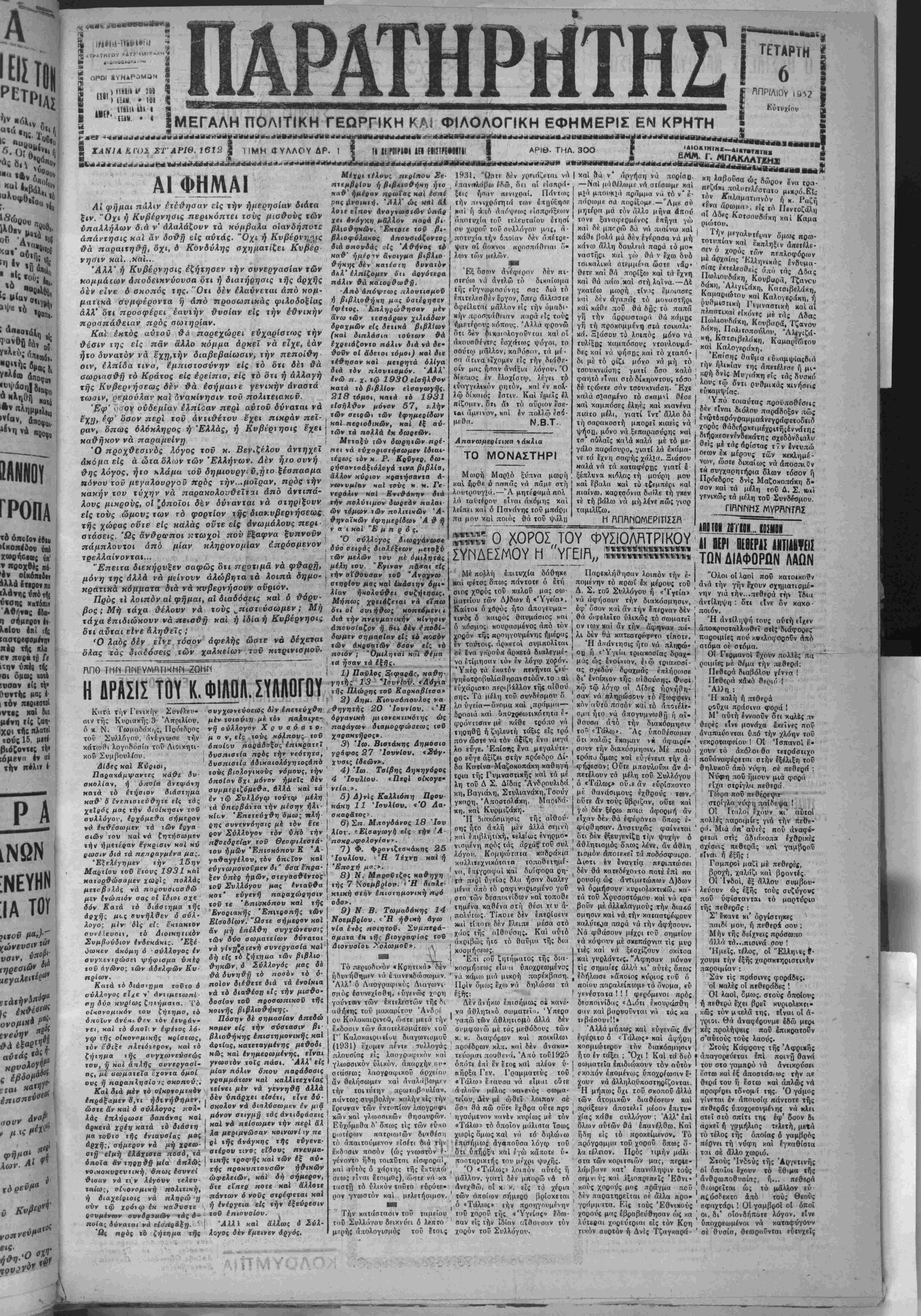 σήμερον <ν· έχί <ή( ιαοχαιφοφν χέρ τής πλο β* ποβ« ·ό Γ« ■την ΰπέί ίή{ Όϊ ομάς χανά ίνσαν ιίς φ ΰννττ,ς μας * ι «όν πεοΐίθτθί ιντ·ς χαΐ δια μένη ιίς ζωτι- χρι ΐής ηλατβΐ τού; 15, μΐΐΐ· βιόζονΐις Φ ίόμενα έ« οί την η·λι. · ΤΕΤΑΡΤΗ ϊ Ενΐυχίου ΜΕΓΑΛΗ ΠΟΛΙΤΙΚΗ ΓΕΩΡΓΙΚΗ ΚΛί ΦΙΛΟΛΟΠΚΗ ΕΦΗΜΕΡΙΣ ΕΝ ΚΡΗΤΗ ε»*** *·««<ε««.<«»*ε«»»««*&*ι*»»:ε<ε*εΐ««3^».νε1»^ ΧΑΝΙΑ ί,ΙΌ* ΣΤ ΑΡΙΘ. 1612 1 ;ΜΗ ΦΥΛΛΟΥ ΔΡ. 1 ! | ΤΙ Κ'ΟΐΡίί» είΙ {||!!«·Ο!Τ|| Ι ΑΡΙΘ. ΤΗΑ. 300 ττλονς π»ρ(ηου Σ*>· 1931. "Ωογρ δι-ν /ρριάζρτοι νά | καί 8ά ν