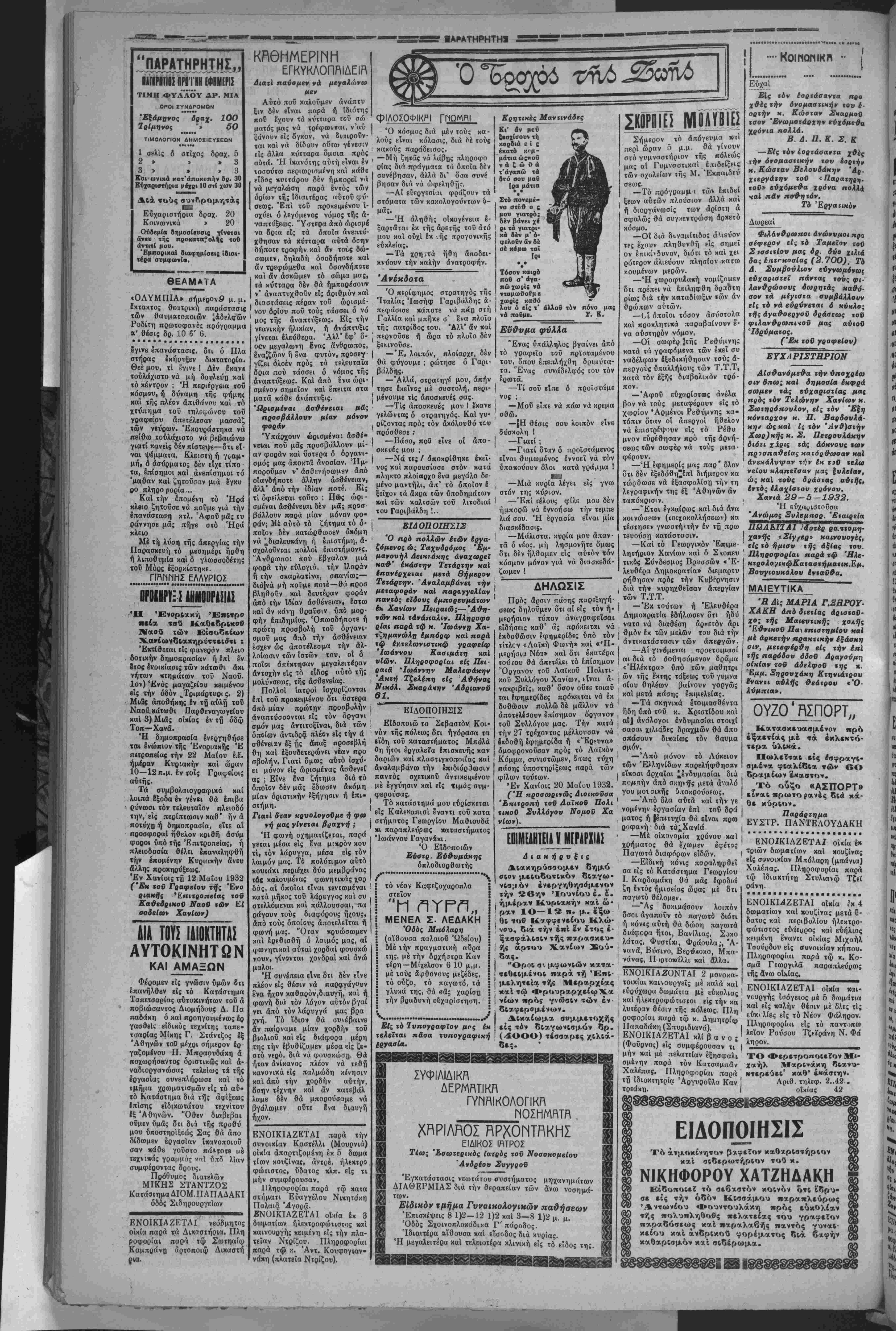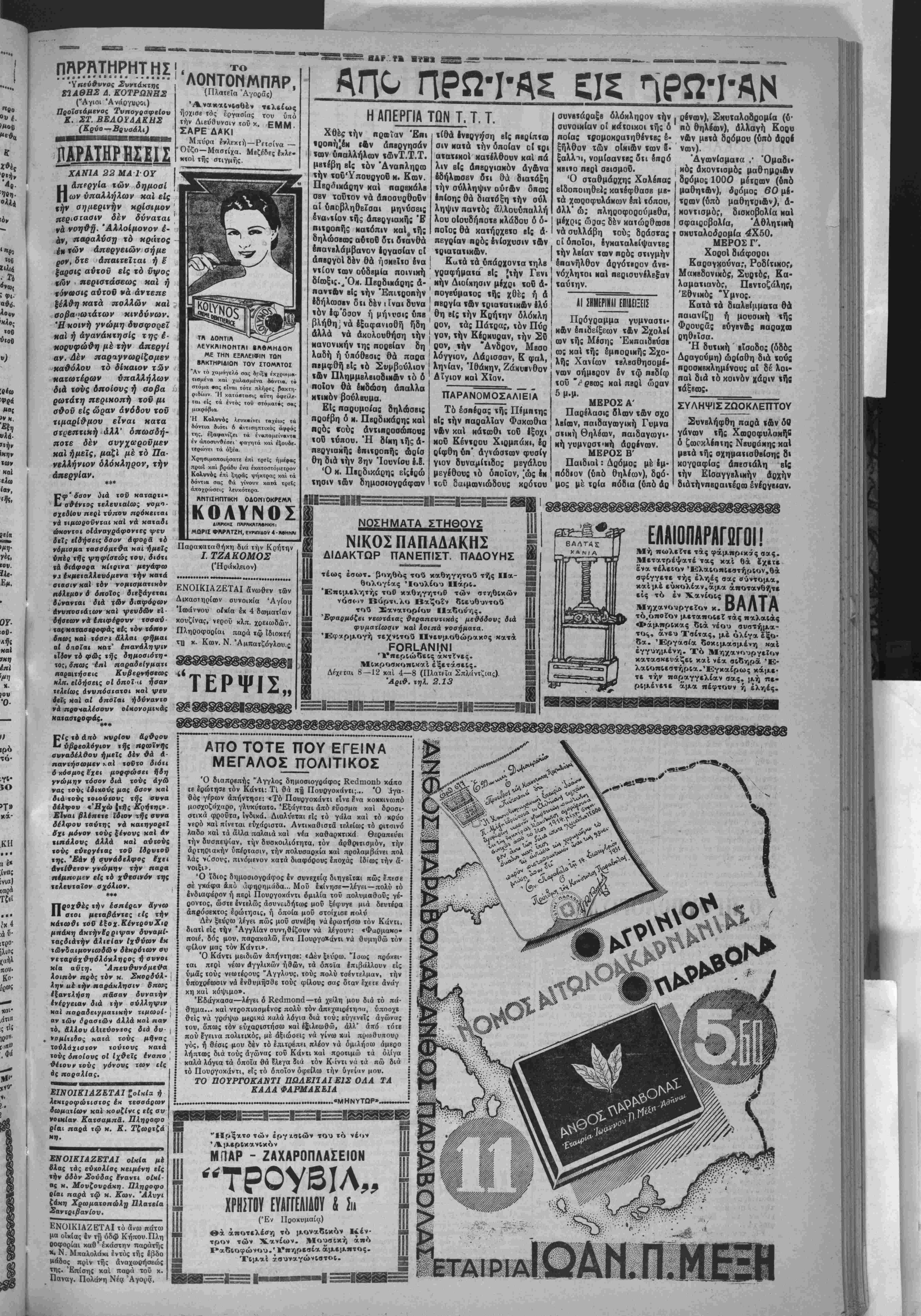 τέρας πατοιωτικάς ένώσ<ις Τογιΰμα Μιτσούρ·. ό όποΐ ος καίτοι 77 έτών καί άπό μοχος πολιτικάς θβωρβίται σήμβρον ό μόνος έχων την δύναμιν νά επιβάλη, την πβι ΦαρχΙαν είς τόν στρατόν. Οί ανταποκριταί τονΑζονν δτι ή Ίαπ_ν(α βιέρχεται την στιγμήν ταύτην την έπικιν δυνωδεστέ^αν πολιτικήν κ οί σιν δσων ΐσως έγνώρισβν είς την μακράν ΙστορΙαντής. Είς περίπτωσιν καθ' ή*ν δέν κληθή ό Μιτσούρα δύναται νά θεωρηθή βέβαιον δτι θά έκραγή υπο την άρχηγΐαν τού σοβαρόν φασιστικόν κΐνημα. Ό Μιτσούρα διε τέλεσεν άκλοιε φίλος στε νός τοδ δολοφονηθένταςπρω θυπουργοΰ Ίνουκάϊ μή στεο γόντος ν'άσπαθθή τάς άδιαλ λάκτους άπόψβις των έθνι κισιών. Ή λύσις τής Κυ ββρνητιχής κρίσεως βν Ία κωνΐα δέν βΐναι μόνον ζήτη μα έσωτβρικοΰ ενδιαφέρον τος, άλλά δύναται νά έχη σο βορωτατος διεθνβΐς ουνβηιί άς δοθέντος δτι είς περίκτω σιν καθ' ήν έπιχραΐήσουν οί έθνικισταί ·1 σχέσεις Ρωσσί άς καί Ιαπωνίαν μοιραίως θά ύποστοβν ριζικάς μετα βολάς. ΩΡΑ3-ΠΡΩΤΝΗ Ο κ ΒΕΝΙΖΕΛΟΣ ΥΠΕΒΑΛΕ ΤΗΝ ΠΑΡΑΙΤΗΣΙΝ ΤΗΣ ΚΥΒΕΡΝΗΣΕΒΣ ΕΞΑΚΟΛΟΥΘΉ Η ΑΠΕΡΠΑ ΤΩΝ Τ.Τ.Τ. ΚΑΙ ΟΙΚΟΝΟΜΙΚΟΝ ΑΘΗΝΑΙΖΐ Μαΐου (Τοΰ άνταηοχριχοϋ μας).— Σήμερον συνήλθεν είς συνεδρίασιν ή Βουλή. Καχά ταύτην ό Πρω&νπουργός χ. Βινιζέλος άφοΰ ανέπτυ¬ ξε διά μακρών την κατάστασιν δ,ΐως αΰττ) παρουσιά- ζεναι οήμερον ύηέβαλε την παραίτησιν τής Κυβερνή· σεως καί εκάλεσεν τούς άοχηγούς τώ^ κομμάτων Ά· πως σχηματίσουν την νέαν Κυβέρνησιν. ΤΙ ΣΥΝΕΒΟΥΛΕΥΣΕΝ Ό κ. Βενιζέλος μετά την υποβολήν τής παραιτή¬ σεως τής ύπ' αυτόν Κυβερνήσεως συνεβούλευβεν τόν σχηματισμόν Δημοκρατικής Κυβερνήσεως είς την ο¬ ποίαν έν άνάγκη νά συμμεθέξη καί τό Λαϊκόν κόμμα. _________________ ΟΙΛΟΓΟΙ ΤΗΣ ΠΑΡΑΠΉΣΕβΣ Οί λόγοΐ τής παραιτήσεως τής Κυβερνήσεως είνε οί εξής: Ό κ. Βενιζέλος εζήτησε ώς ύπεύθυνος Κυ- βερνήτης την ψήφισιν τού νέου νομοσχεδίου περί Τύ που επί τού νομισματΐκού ζητήματος είς την οποίαν άντέδρασε ή Αντιπολίτευσις, δι' αυτό δέ καί έκλή θη αυτή νά σχηματίση Κυβέρνησιν αναλαμβάνουσα Ολας τας ευθύνας.________________ Η ΠΙΘΑΝΗ ΚΥΒΕΡΝΗΣΙΣ Η ΚΑΤΑΣΤλΣΙΣ ΕΙΣ ΤΑΣ ΙΝ1ΙΑΣ Αί έξ Ίνδιών τηλεγραφΐ καί πληροφορίαι έξακολον θοΰν νά πι ρουσινζουν την έκεί κατάστασιν ώς σοβα ράν καί έκχρυθμον, καθό σον ό έρβθισμός των στα σιαστών συνβχΐζετα είς τρό πον ώστβ τα μετ», β «Αν άο χών νά χαθίστανται αύστη ρότερα. Σχετικώς αγγέλλεται τηλβ Υοαφιχώς έκ Βομβάης δτι ό «•«ββρνήτης τής πόλεως ίζί τησιν έκειγόντως στρατιω «κάς ένισχύσιις διά την καταστολήν «Αν ταραχών. ΝΗ ΚΥΒΕΡΝΗΣΙΣ Κατα τάς μέχρι τής στιγμής υπαρχούσας πληρο¬ φορίας την νέαν Κυβέρνησιν θά σχηματίση ό Άρχη¬ γός τής Δημοκρατικής Ενώσεως κ. Α· Παπαναστα¬ σίου. , Ό κ. Βενιζέλος ανελθών είς τό Κυβερνείον υπέ¬ βαλε είς τόν Πρόεδρον τής Δημοκρατίας Χ. ΖαΓμην , τή- παραίτησιν τής Κυβ·ρνήσεώς_του._______ ι ϊϊδΤΕ" ΣΧΗΜΑΤίΖΈΤΑΙ Ό κ. Ζαίμης απεδέχθη την ύποβληθεΐσαν παραί¬ τησιν τής Κυβερνήσεως τού κ. Βενιζέλου, θ* καλέ¬ ση αλληλοδιαδόχως έντός τής σήμερον τούς αρχηγούς των κομμάτων διά τόν σχηματισμόν τής νέας Κυβερ νήσεως. Ή Κυβερνητΐκή κρίσις θά έχη λυθή μέχρι τής Τετάρτης;_____ _____________ μ Λ ΑΠΕΡΠΑ ΤΩΝ Τ.Τ.Τ. Ή κηρυχθείσα άπό προχθές απεργία των Τ.Τ.Τ. κ*ί θίκονομΐκών εξηκολουθεί είς τάς υπηρεσίας των Τ.Τ.Τ. Αθηνών καί Πειραιώς. Τό * Υπουργείον τής Συγκοινωνίας καί Οίκονομΐκών λαμβάνεΐ έκτα- κτ* μέτρα πρός αντιμετώπισιν τής καταστάββως,.