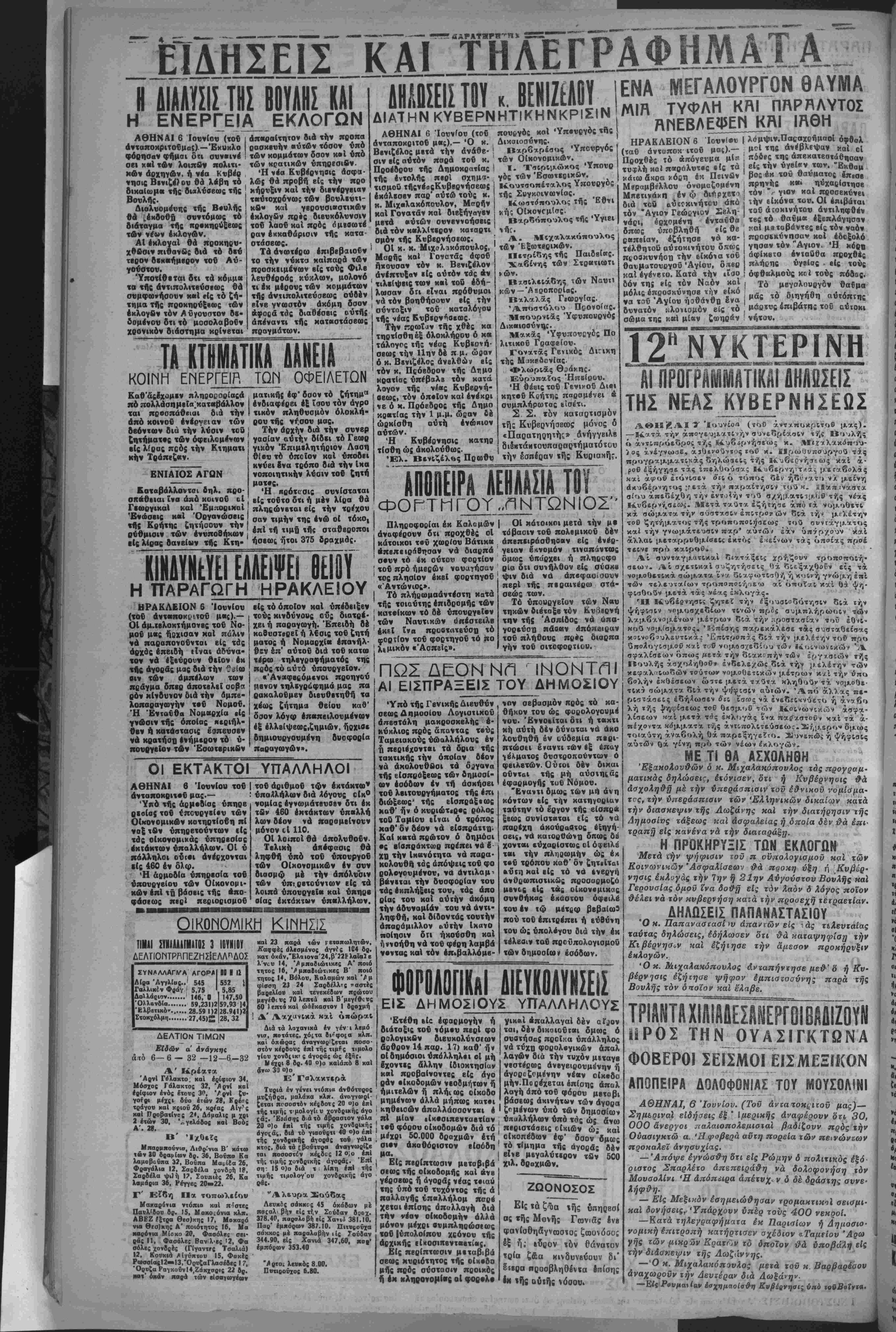 <Λ ΔΗΛΠΣΕΙΣ ΠΑΠΑΝΑΣΤΑΣΙΟΥ Οκ. Παπαναστααί^ν απαντών είς 'άς τελευταίας ταύτας δηλώσεις, εδήλωσεν δτι θά ηαταψηψίαΐ] τ¥ Κιβέρνησ&ν καί εζήτησε την άμεσον προκήρυξιν έκλογών. Ό κ. Μιχαλακόπουλος άνναπήνΐησε μεθ' δ η Κυ- βέρνηαις εζήιηαε ψήφον έμπιοτασύνης παρά τής Βουλής τόν δηοϊον καί έλαβε. ΤΠΜΠΐι^^ ΠΡΟΣ ΤΗΝ ΟΥΑΣΙΓΚΤΩΝΑ ΦΟΒΕΡΟΙ ΣΕΙΣΜΟΙ ΕΙΣΜΕΞΙΚΟΝ ΑΠΟΠΕΙΡΑ ΔΟΛΟΦΟΝΙΑΙ ΤΟΥ ΜΟΥΣΟΛΙΝΙ ΑΘΗΝΑΙ, 6 Ιούνιον. (Τοϋ άνταχοΗ{ίιτοϋ μας)__ Σημεριναί εΐδήσεις έξ ' Ιμερικής άναφέρονν δτι 30, ΟΟΟ άνεργοι ηαλαιοπολεμιαχαΐ βαδίζουν πρός την Ούασιγκτώ α Ήφοβςρά αυτή πορεία των πεινώντων ποοκαλεϊ ανησυχίας. — Άπόψε εγνώσθη δτι είς Ρώμην δ πολιτικάς έξό ριστος Σπαρλέτο άπεπειρά&η νά δολοφονήαη τόν Μουσολίνι Ή άπόπύΐρα άπέτυχ, ν δ δέ δράστης συνε¬ λήφθη. — Είς Μεξικόν εσημειώθησαν χρομακτικοϊ σεισμι¬ καί δονήσεις,,Ύπάρχονν υπέρ τούς 400 νεκροί. — Κατά τηλεγραφήματα έκ Παρισίων ή Δημοσιο- νομική επιτραπή κατήρτισεν σχέδιον «Ταμείον Άρω γής των μικρ3ν Κρότον τό οποίον θά υποβάλη είς την διάσκεψιν τής Αωζάννης. —Ό κ. Μιχαλακόπουλος μετά τοΰ κ Βαρβαρέαου άναχωροϋν την Δεντέραν διά Λωξάνην —Είς Ρουμανίαν έσχημαοίσθ»; Κυβέρνησις υπό τούΒοίντα.
