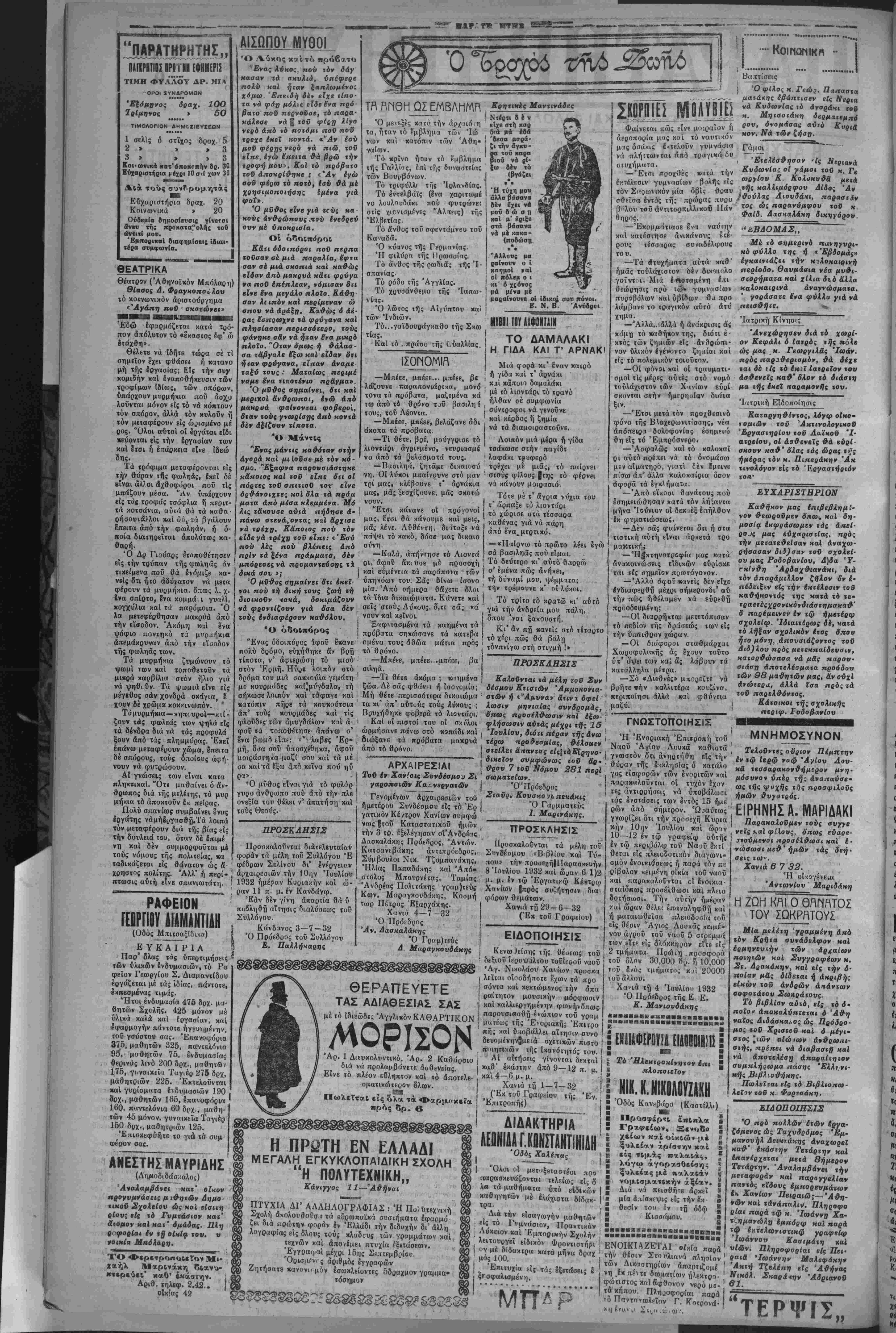 μέλλον.^ΐΐαρατείνεται <.ϋτω ή λέπρα καί ή φθορά. Έπαΐίξάνεται |ή δυστυχία. Δΐατηρεΐταΐ άκοίμητον τό μϊσος. Άντί προόδου, όπισθοδρομΐΜΟτης δΐακρί νει την εποχήν καί άπιιλεΐ νά θάψη ε»α μνημειώδη πολιτισμόν, ν ά έπχ«αφέρη τούς άνθρώπους είς αίώ"α ακότους καί β··ρβόρου. Καί όμως πρέπιΐ νά σωθώ μέν καί δυνάμεθα νά αωθώμεν ! Άπό την μαρασμώ βη καί άποχαυνωμένην σημερινήν ζωήν *κΙ ό πόλε μος, ό φανερός, είναι προτιμό'ερος. Ή άνάγκη τής σωτηρίας, ής έξόδου ά*ό τόν λήθαργον τής σημερι νής ζωής είται δύναμις, πού δέν δύναται κανείς να την παραβλέψη. ΔΙ* αυτό καίή Διάσκεψις τής Λωζά νης έπρεπε νά εύρη διέξοδον, πρέπει νά φθάση είς εν τέρμα. Δι' αύτό οί μέν Γερμανοί έδέχθηααν^ κατ' αρχήν νά πληρώιουν έπανορθώσεΐς, λύτρα είς τόν κακόν δαίμονα, διά νά έξευμενήιουν την θέαν Έίρή νην. Κάθεθσία δι* αυτήν δέν είναι μεγάλη. Δι' αύτό καίοίάλλοΐ πρέπει νά δεχθούν τήνήθικήν έξίσω βιν τής Γερμανας πρός τα άλλα κράτη. "Αν ή Γερ μανία'ήδί*η<ϊεν εαυτήν, την ιστορίαν κ*1 τόν πολιτι¬ σμόν της καί την άνθρωπότητα ολόκληρον, δέν έπε¬ ται ότι ή άδικία πρέπει να συνεχισθή έπ' άπειρον ά ά έ^ 1ΙΊΟΜΠΙΣΜΟΣ Άμφιβάλλω άν πράγματι υ¬ πάρχη άνθρω.ΐο; πιό μακάριος άπό τδν φίλον μου. Σάς τόν παρυυσιάζω χωρίς μεγίλε; δια- τυπώσεις, καίτοι χρειάζεΐαι μιά μεγάλη μελέΐη δ χαρακτήοας τού, άλλά νά μή χρονοτριβώ σάς τόν παρουσιάζω μέ μιο λέξη: Μακάριος '. Σεϊς θά νομίσειε κανέναν άσπρόμαλλο άπόμαχο τής ζωής άποΐραβηγμένον άπό κάθε δρά- ση χαί μέ τό άπαραίτητο ραβδί στό χέρι πλήν όμως λανθάνβσθε κατα Λύσιπον. Ό ήρως μου είνε νέος νεαρώ- ταΐος μάλιστα καί άν δέν έπβσε ται ότι ή αοικςα πμςττ*» τ» ■-.-...,..~~., — ------,- άπό τόν "Αρη, αφεύκτως θά Άλλα άν διά τής έΐομαλύναεως τού ζητήματος των εχνε γέννημα καί θρέμα των έπανορθώσεων, τό οποίον #το τό πλέον δύσκολον Χανίων. καί άκανθώδες καί Εφερε την διάσκεψιν επί ξηρού Ι Μπήκε—στό γραφείον μου—- άκμής, εφάνη ροδίζουσα ή λύσις, δέν έπεται ότι με χ0 οίώνιο χαμόγελο στά χεί· αυτή είναι εΰκολος καί ταχεϊα.Αί χθεσιναί είδήαβις, ' λη καί μέ τό άπαραίτητο.. κο- άναφέρουσαΐ την νέαν φάσιν των αυζητήαεων, αφίνουν < στοΰμι τού διότι δ φίλος μου ν» εννοηθή ότι είσήλθομεν είς την αρχήν τού τέλους ' χο{νει περιττήν χαί αυτήν την τοϋ παγκοσμίου δράματος καί ώς τοιούτον παρήγο- Ι —— .«/Λ,*.. ,<»> α*α,,λ_
