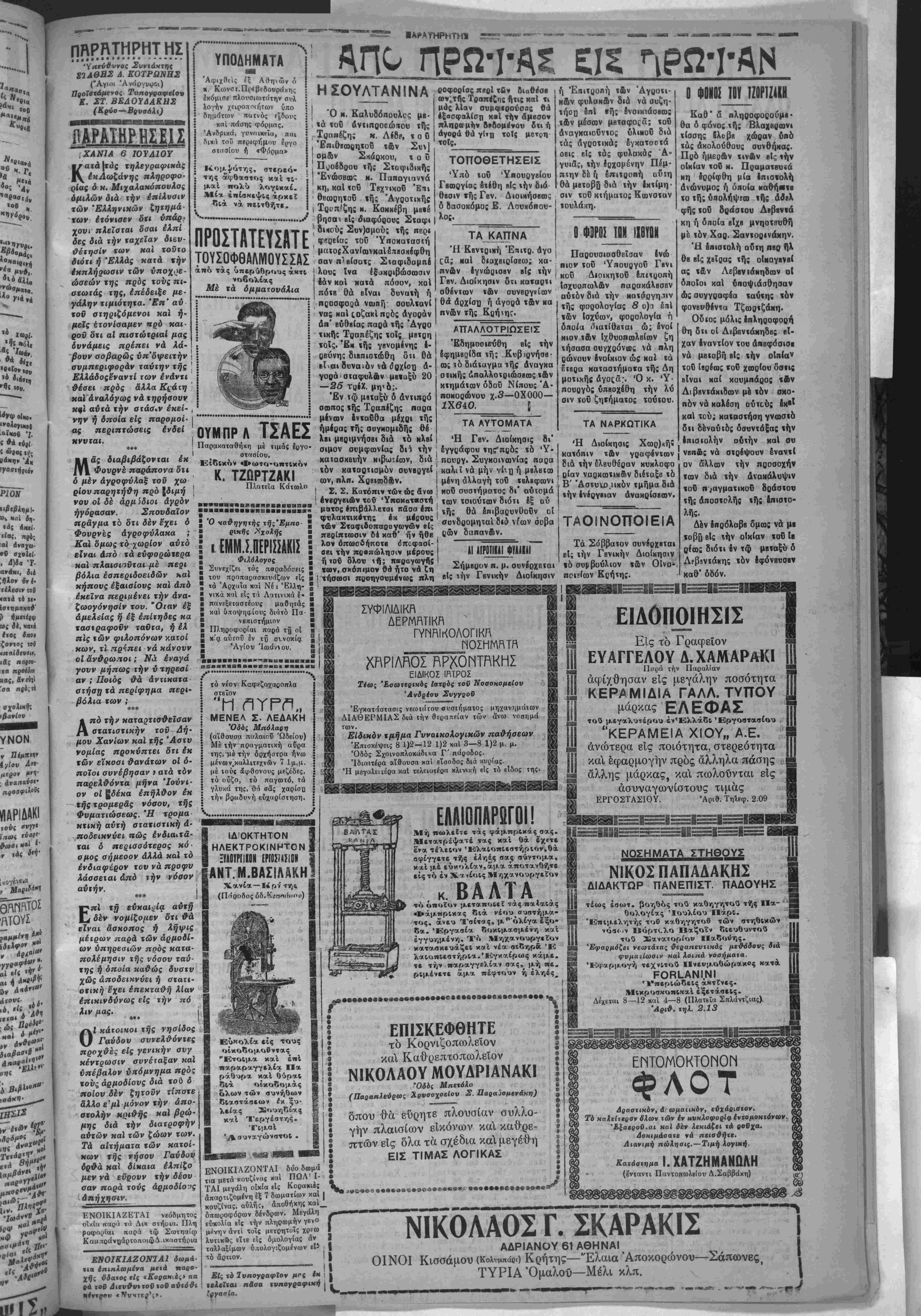 έκλβηησοιν την πβρΐλθοδββν νύκτα έλΓγ» χρήμ«τα< Τί|{ ύΐτβθίσεως βκελήφθηβαν ό ύ)ΐομ)ρχ·ς χ. Σαρτζέτη, Π «ν. καί ό ένωμβτ«ρχης Στβυριβνβυδβκιις Άνταίνι·;, #ττι'. νις κατώρθωσαν νά άνοκαλύψουν καί νά Χ*τβιοχ|σθϋν έκ) τεϋ Γενργίου Γβλιάτσου όστις εκείνην την νύχτβ Οι. ενυκτίρενβεν έντβς τοδ κατασηΐματβί, τεμβχια ύφβΟμ« των, κίλτβες καί διαφορβ αλλα δίδη βξ(«ς έ—7 χιλιβ{ων. δραχμδν, τα όποϊα δέν είχον «ννζητηθίι κειρά τού ν. Ίοχ«Μϋ. Ό δράστπς συνελήφθη καί κρατεΐται είς τό Β' '^βτ. Τμήμα. ΑΙ ΣΥΖΗΤΗΣΕΙΣ ΕΝ ΛΩΖΑΝΗ ΑΙ ΑΝΤΙΛΗΨΙΣ ΤΩΝ ΚΡΑΤΩΝ ΑΙ ΑΝΑΤ0ΑΙΚΪ1ΠΑΝ0ΡΘ0ΣΕΙΣ ΑΗΛΩΣΕΙΣΜ1ΧΑΛΑΚ0Π0ΥΛ0Υ ΑΦΗΝΑΙ 5 Ιουλίου (Τεϋ άντακοΜριτοδ μος?.— Ό κ. Ββνιζέλος πρό τΰς δια Γαλλίαν άνοχνρήββώς τού ουνηντήθη μετά χ€ϋ Προέδρου τής Δημοκρατίας μ. Ζ·ΐ- μη μβτοι τού όποίευ καί ουνωμΐλησι επί μακρόν. Κατβ την συνάντησιν ταύτην έ κ. Πρωθυπουργός χατέ οτησΐ Ενήμερον τέν μ. Ζαΐμην τδν εξωτερικών οίκονο μικων μας ζητημάτων ώ{ καί τάς Κυβερνηιιχβς άποφά- οεΐ{ επί των διαφόρων έσωτερικών ζητημάχών. τήοη τάς άπέψβις των ένβια φβρομένων διά την ρύθμι ! σιν των διαφόρων. Εάν αί ύποδείξβις τής 4 πιτβοπής πρός τϊιν Κνβέρνη σιν ιΐνβ άμέσως έφαρμόσι- μοί, |θ« πραγματοποιηθοΰν συντόμως ίνα λήξη ή πρό δβ κομήνου ύφισταμένη έκκρβ μότης έν τω Χρηματιστη ρί(ρ. Ι Έν τώ μβτοξύ καί έκιιδή ή Ισχύς τής τβλευταΐας ύ- πουργικής αποφάσεως πβρί τοΰ χλβισίματος τοΰ Χρημα τιστηοίου έληξβ την 2αν τρέχ. «πεφβοίσβη ή παρά τάσις τοδ κλεισΐματος επί δεκβπΐνθήμερον εΐιέτι. | Η ΕΝΕΡΓΕΙΑ ΤΩΝ ΕΚΛΟΓΩΝ ΑΘΗΝΑΙ 5 Ιουλίου (Τοδ ανταπβχριτοΰ μας).— Ό κ. Βίνιζίλβς καΐΒ την συνβντησΐν ταύτην δεν πβρί λβιψΐ νά Μα?ασήοη γνωστήν είς τον κ. Ζιΐμην την λη φβϊΐσαν άπέφκοιν περί διενεργβίβς των βουλβυτικδν καί γερβνσιβσηκών έχλβγών κ*τά την 25 ίρχομίνβυ Χι· ητ·μβ(ί·υ. Η ΑΠΑΝΤΗΣΙΣ ΤΟΥ ΠΡΟΣ ΤΗΝ ΑΝΤΙΠΟΛΠΈΥΣΙΝ ΑΦΗΝΑΙ 5 Ίευλίου (Τοΰ άνταποΜριτοδ μ«().— Έρωτηθβΐς παρβ τδν δτμεσιβγρίφων ό κ. Πραθυπουργος πέτε καί εάν θβ «πανττίση είς τβύ$ λογους των αφχηγων τής αντιπβλιτεύσεκς είπεν έ:ι τ)ά «παντήση μετά την έκ Μπανιόλ επιστροφήν τού χβ( κατά την τελευταίαν {ου νβδρίασιν τής Βουλής. ΗΘΕΡιΝΗΩΡΑ ΑΘΗΝΑΙ 5 Ιουλίου (Τοΰ άντσποκριτοΰ μας).— Άπό σήμερον 12 νυκτερινήν ώραν ήρχιαε ή <φ«ιρμ·γη τής νέβς θερινής ώρας. σχετικάς συζητήαεις, άλλ' ή τελική έχβασις έξαρταΐαι ά¬ πό τόν κ. Έρριω, ό οποίος δέν θά επανέλθη >(ς Την