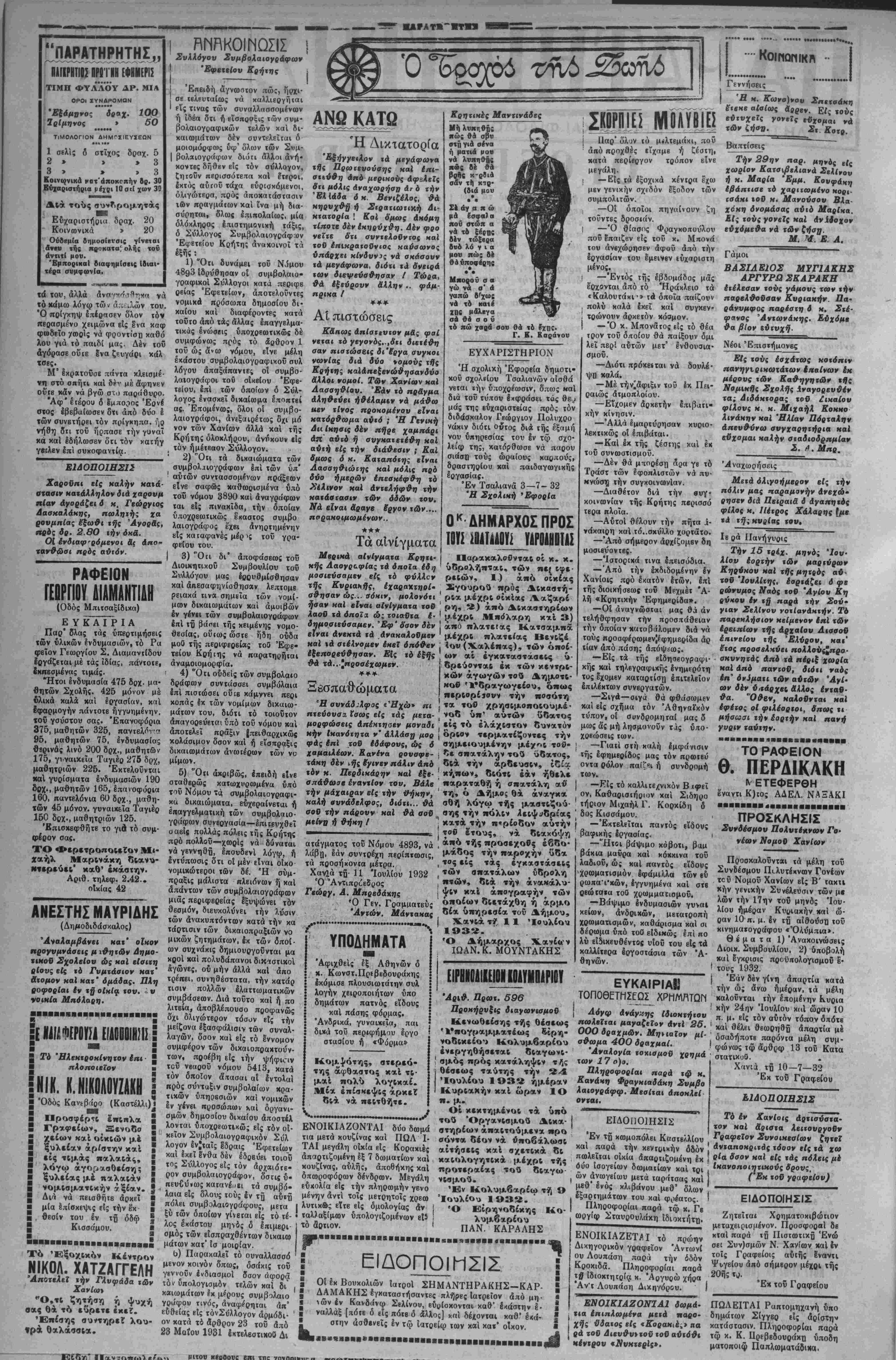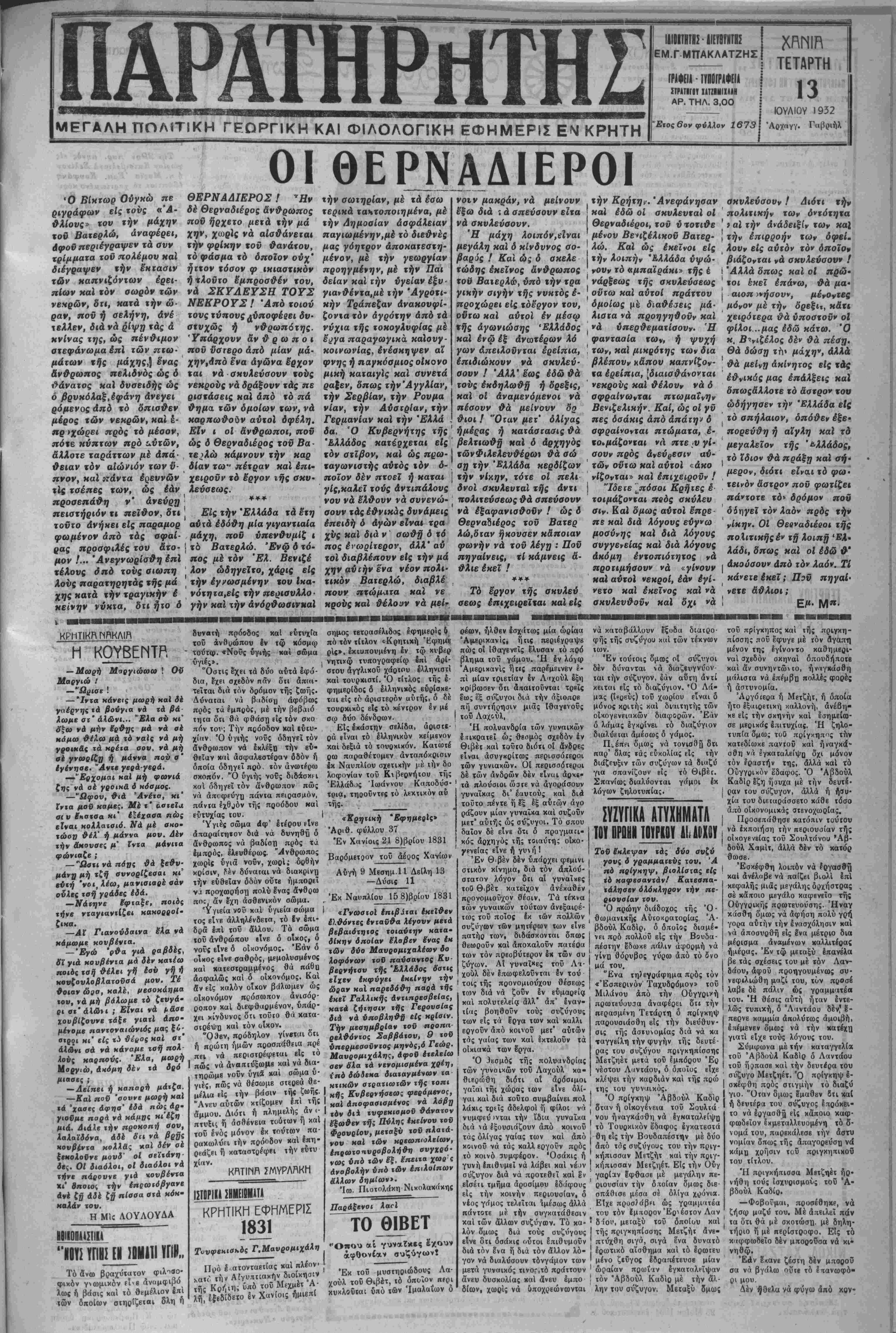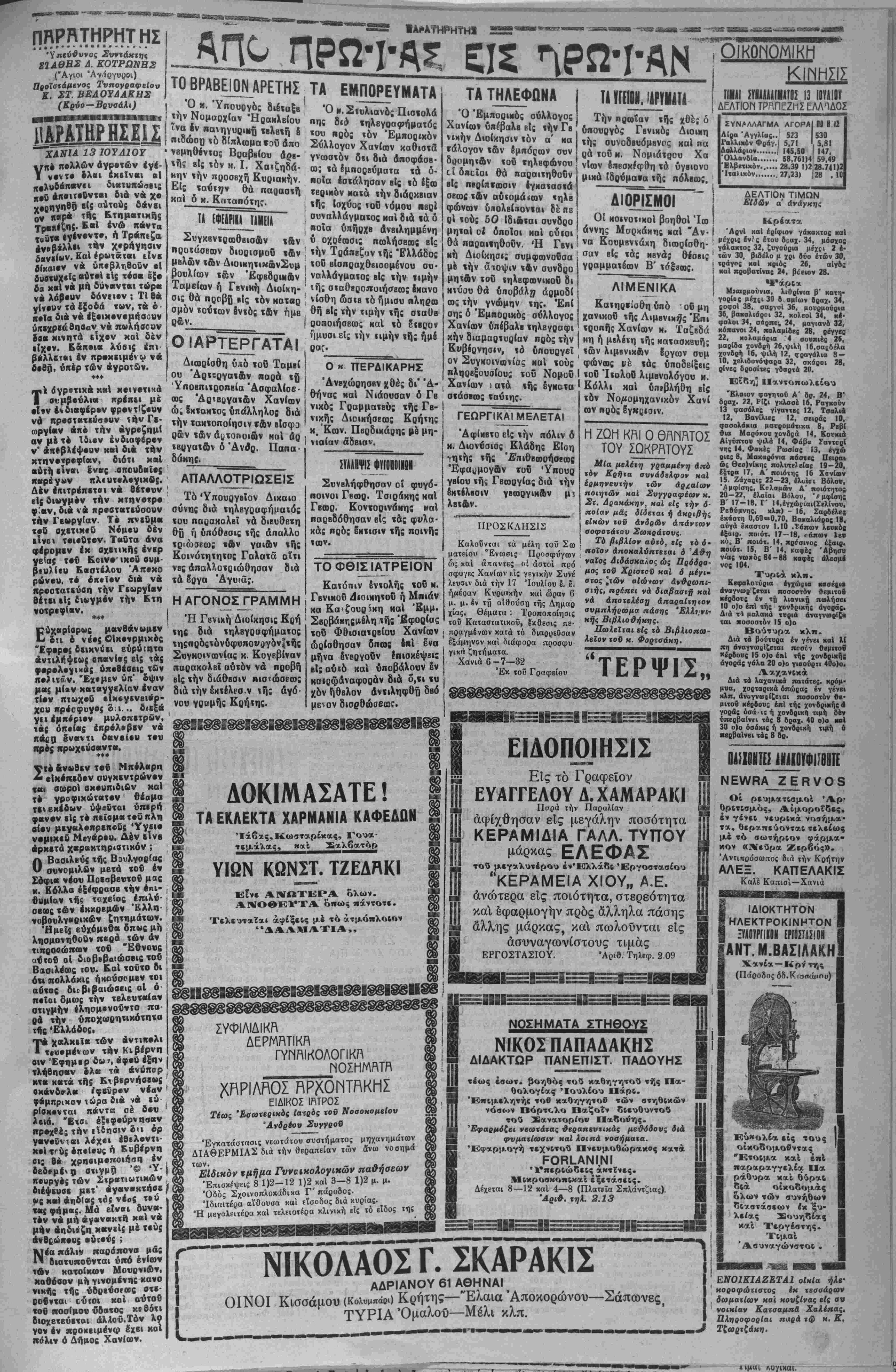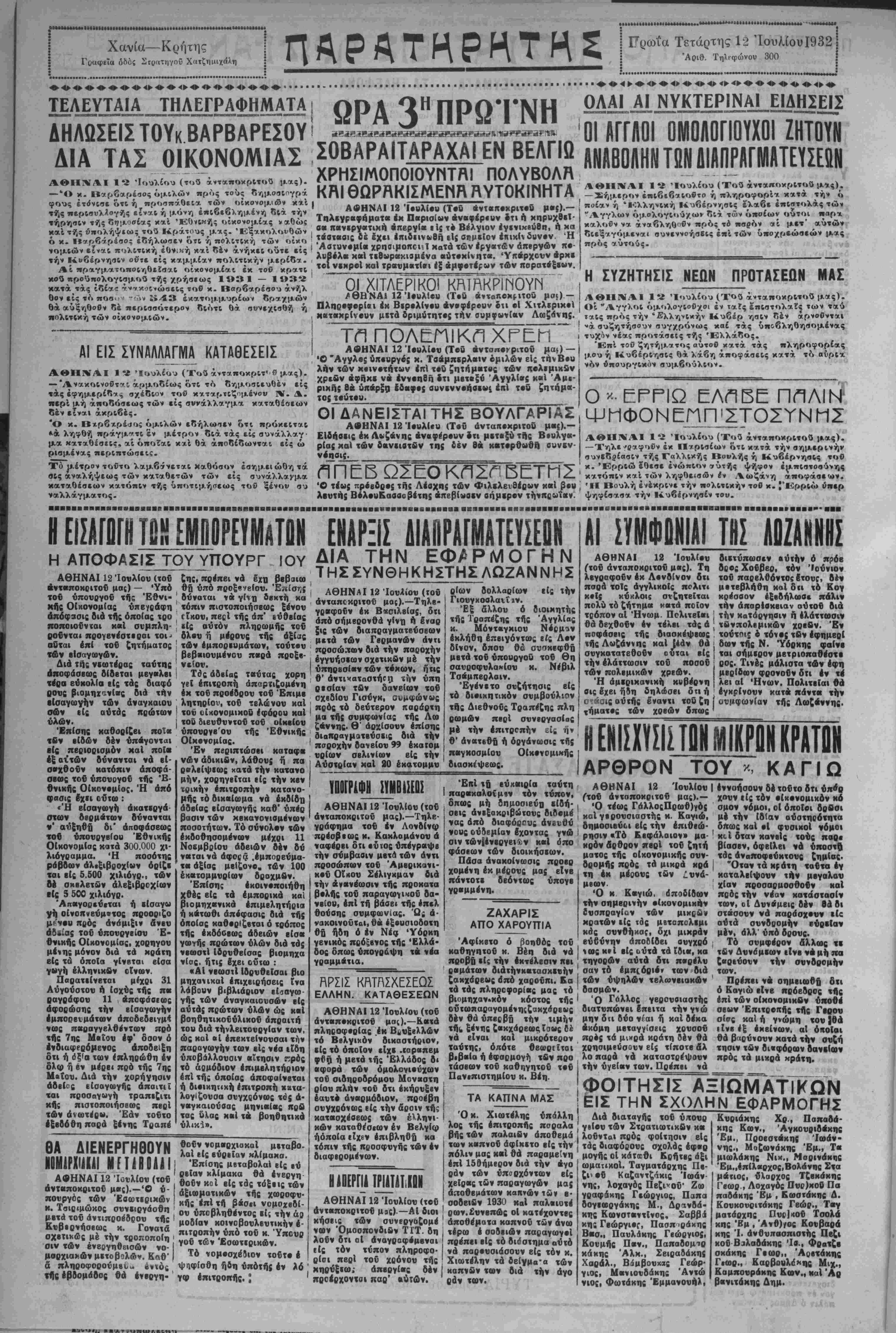 θΰ ηδη δ <ν Ν.α Ύόρκη γενικάς πρόξβνος τής Ελλά¬ δος δπως υπογράψη τ« νέα γραμματια. ΆΡΏΣ ΚΑΤΠΣΧΕΣΕΩΣ ΕΛΛΗΝ. ΚΑΤΑΘΕΣΕΩΝ ΑΘΗΝΑΙ 12 Ιουλίου (τοΰ άνταποκριτοΰ μας).—Κατά πληροφορίας έκ Βκυξβλλών τό Ββλγιχόν δικαστήριον, Είς τό οποίον εΐχΐ .(οραπβμ φ€0 ή μβτά τής Ελλάδος δι αφορά των όμολογισύχων τοΰ σιδηρόδρομον Μονβστη ρ(ου πλήν τοδ δτι εκήρυξεν έαυτσ άνβρμόδιον, προέβη συγχρόνως είς την άρσιν τής κατασχέσεως των έλληνι- κών καταθιίσεων έν Βελγίφ ήόποία ΐίχεν επιβληθή κα τόπιν τής κροσφυγής των έν διαφερομβνων. ΗΑΠΕΡΠΑΙτΊΑΤΑΙΙΩΙ ΑΘΗΝΑΙ 12 Ιουλίου (τοΰ άνταποκριτοΰ μας).—ΑΙ διοι κήσιις των συνεργοζομέ νων Όμοσπονδιβν ΤΙΤ. δή λοΰν δτι αί άναγραφομβναι είς χον τύπον πληροφο¬ ρίαι πβρί τοΰ χρόνου τής χηρύξεω; άπβργίας δέν ποοέβχοντσι καο' αυτών. Έκί τβ βύκβιρία ταύτη Ι παρακαλονμβν τόν τύπον· δπως μή δημοσιβύιι είδή- , σβις άνεξακριβώτους διδομέ | νας όπό διαφόρους άνβυθύ νους ουδεμίαν έχον τας γνώ ! σιν τών,ένεργειΦν καί ό πό φάσβων των διοικήσΐων. Πάσα ανακοίνωσις προερ χομένη έκ μέρονς μας εΐνβ πάντοτι δεόντως ύπογβ γρβμμένη. ΖΑΧΑΡΙΣ ΑΠΟ ΧΑΡΟΥΠΙΑ 'Αφίκβτο ό βοηθός τοΰ καθηγητού κ. Βέη διά νά προβή είς την εκτέλεσιν κιι ραμάτων διάτήνκατασκινήν ζακχάρεως όπό χαροΰπι. Εα τα τάς πληροφορίας μας τό βιομηχανίαν κόστος τής οΰτωηαραγομένηςζακχσρενς δέν θά ΰπβςβύ την τιμήν τής ξ'ντΐς ζακχάρεως ϊσως δέ νά είναι καί μικρότβοον ταύτης, όπότε θεωριΐται βεβαία ή έφαρμογή τδν προ τάσβων τοΰ καθηγητού τβΰ Πανεπιστημίου κ. Βέη. ΤΑ ΚΑΠΝΑ ΜΑΣ Ό κ. Χιωτέλης ύπάλλη λος τής έπιτροπής πσραλα βήςτών παλαιβν άποθεμά των καπνοΰ αφίκετο είς την πόλιν μας κβί θά παραμείνη επί Ιδθήμβρον διά την βγο ράν των νπορχόντων είς χείρας των παραγωγών μας άίϊθθβμάτοον καπνών ιω ν β· σοββιβν 1930 καί παλβιυτέ ρων.£υνβπώς οί κατέχοντες άποθέματα καπνοΰ των άνω τέρω έ σοδβιών παραγωγοί πρέπβι είς τό βιοΌΐημα αύτό νά παρβυσιάσουν είς τόν κ. Χιωχιλην τα ίεΐ^μα'α των καπνών των διά την άγο ράν των· ΑΘΗΝΑΙ 12 Ιουλίου (τοδ άνταποκριτοΰ μας). Τη λβγροφοΰν έκ Λονδίνον δτι πσρά τοίς άγγλικοΐς πολιτι κ·Ι( κύκλοις σνζητεΐται πολύ τό ζήττιμα κατά ποίον τρόπον αί Ήνωμ. Πολιτβΐαι θά δβχθοδν έν τέλει τάς ά ποφάσβις τής διασκέψεως τής Λωζάννης καΐ (εάν θά συγκατατεθοΰν ούται είς την ελάττωσιν τοΰ ποσοΰ των πολβμικΑν χρεων. Ή άμιρικανικτϊ κνβέρνη σις έχει ήδη δηλώσβι δτι ή ετκσις αυτής έναντι τοδ ζή χήματος των χρβών δπως διετύπωσεν αυτήν ό πρόβ δρος Χοδββρ, τόν Ιούνιον τοδ παοελθόντος βτουί, δέν μετββλήθη καί διι τό Κογ κρέσαον εξεδήλωσε πάλιν την άπσρΐοκειαν ού τοΰ διά την κατάργησιν Α ελάττωσιν τ£ν-ολβμικών χρ·βν. Έν τούτηις ο τόν·ς τΒν έφημβρί δών τής Ν. Υόρκης φαίνι ται σήμερον μετριοπαθέστ· ρος. Τινές μαλιστα των έφη μερίδων φρονοδν δτι έν χί λει αί Ήνων. Πολιτειαι θά έγκρίνουν κατά πάντα την ουμφωνίαν τής Λωζίννης. ΟΕΝΙΣΚΥΣΙΣΤίΝΐΙΙΙΚΡίΙΙΚΡΑΤΟΙ ΑΡΘΡΟΝ ΤΟΥ κ, ΚΑΓΙΩ ΑΘΗΝΑΙ 12 Ιουλίου (τοΰ άντσποκριτοδ μας).— Ό τέως ΓάλλοςΠρωθ)γό( καί γερουοιαστής κ. Καγιώ· δημοσιβύοι βίς την επιθεώ¬ ρησιν «Τό Κεφάλαιον» μα¬ κρόν Αρθρον πβρί τοδ ζηιή ματος τής οίχονομικής συν- δρομής πρός τα μικρά κρά τη έκ μέοους των Ιυνά- μβων. Ό κ Καγιώ, ίποδίδων την σημερινήν ο(κονομικί*ιν δυσπραγίαν των μικρων Μρατών είς τος μβταπολβμι κάς συνθήκας, δχι μικράν ευθύνην αποδίδει ουγχοό %ως κ»Ι βίς ούτά τα Ιδία, κα τηγορών αύτά δτι παρέλυ σαν τό έμπςόριάν των διά των ύψηλών τβλωνιιακων δασμών. Ό Γάλλος γερουοιαστής βιατυπώνβι δπβι