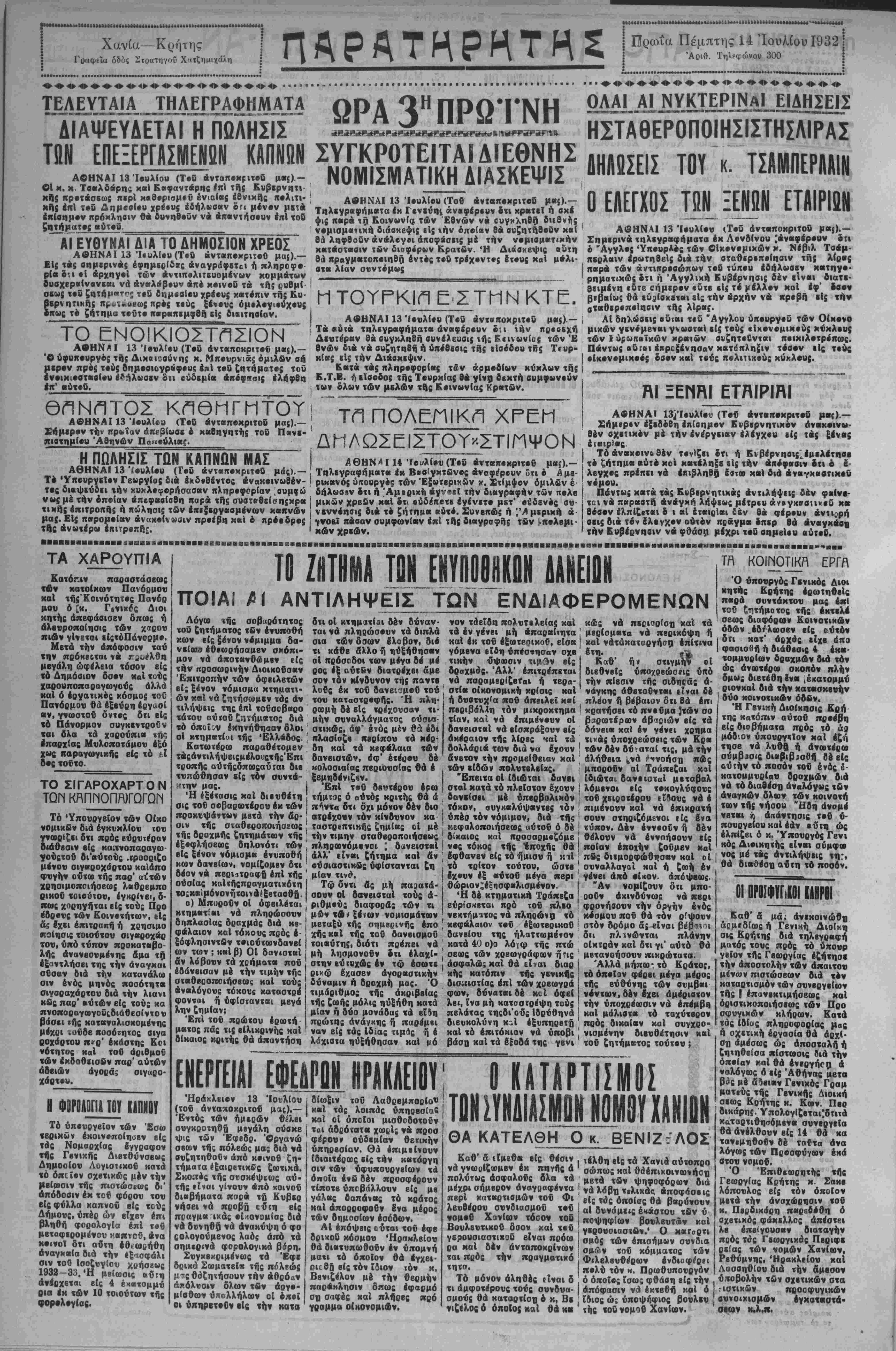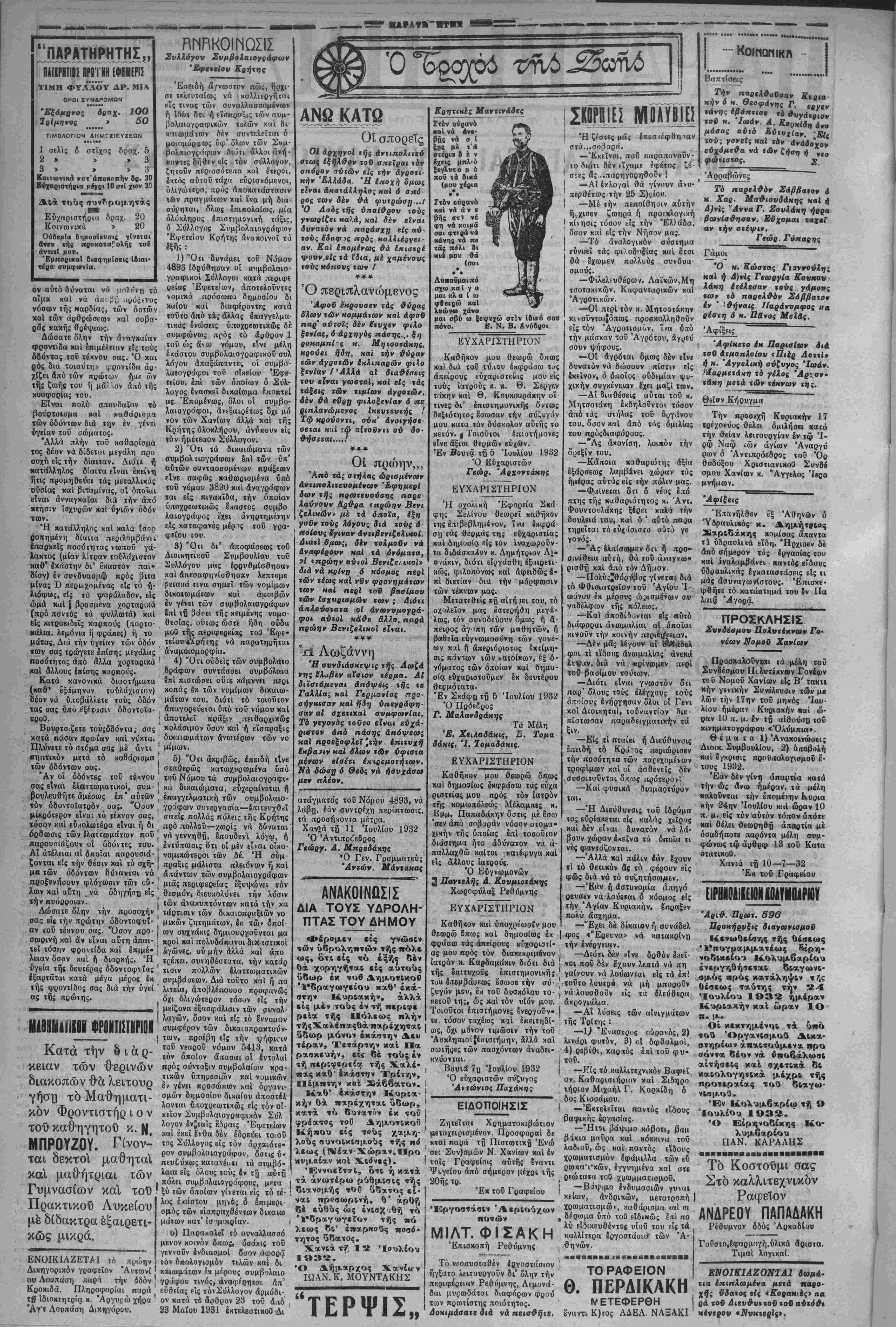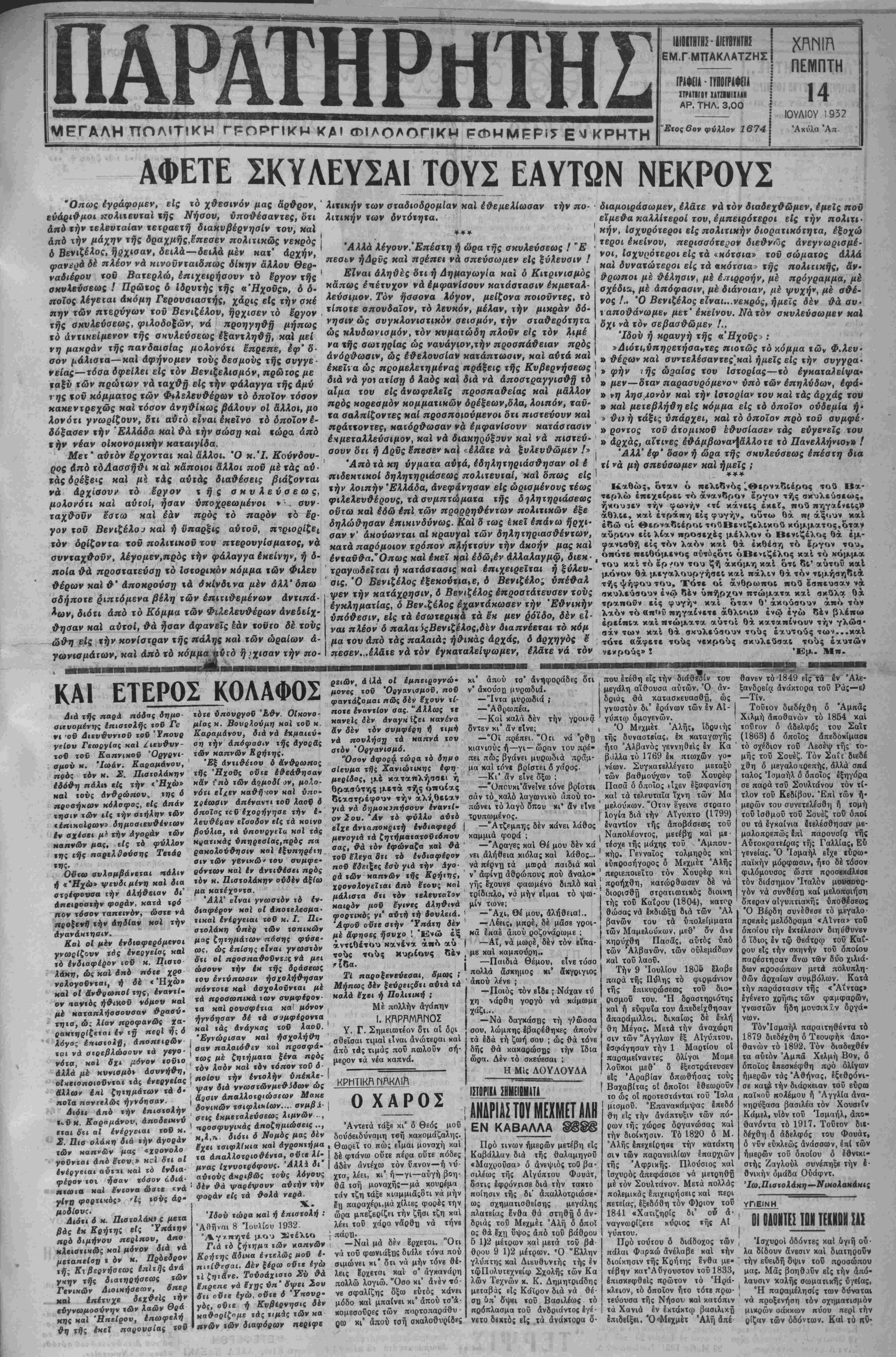 ΜΕΧΑΛΗ ΤΤΟΛ<Τ?ΚΗ ΓΓ=ΟΡΠΚΜ ΚΑ» ΦΙΛΟΛΟΠΚΗ ΡΦΜΜΕΡί* Ε^ ΚΡΗΤΗ ΙΙΙΒΙΤΗΤΗΜΙΕΥΟΠΙΓΙ! ΕΜ.Γ ΜΠΑΚΛΑΤΖΗΣ ίΡΑΦίΙΑ - ΪΪΙΟίΡΑΦίΙί πρίτΐίίϊ ητζηιΐΛΐιι ΑΡ. ΤΗΛ. 3,00 -τος 6ον φύλλον 1674 ΠΕΜΠΤΗ 14 ΙΟΥΛΙΟΥ 1932 Άκύλα Άπ. ΑΦΕΤΕ ΣΚΥΑΕΥΣΑΙ ΤΟΥΣ ΕΑΥΤΩΝ ΝΕΚΡΟΥΣ »__ _ Όπως έγράφομεν, είς τό χθεσινόν μας άρθρον, ' λιτικήν των σταδιοδρομίαν καί εθεμελίωσαν την πό- διαμοιράσωμεν, ελατε νά τόν διαδεχ&ώμεν, εμείς ποΰ εύάριθμοι «ολιιευταΐ ΐης Νήσου, ύποθέσαντες, ότι λιτικήν των δντότητα. είμεθα «αλλίτεροί τού, έμπειρότεροι είς την πολιτι- άπό την τελευταίαν τετραετη διακυβέρνησιν τού, «αί ¥¥Ϋ ' Μήν> Ιαχυρότεροι είς πολιτικην διορατικότητα, έξοχώ