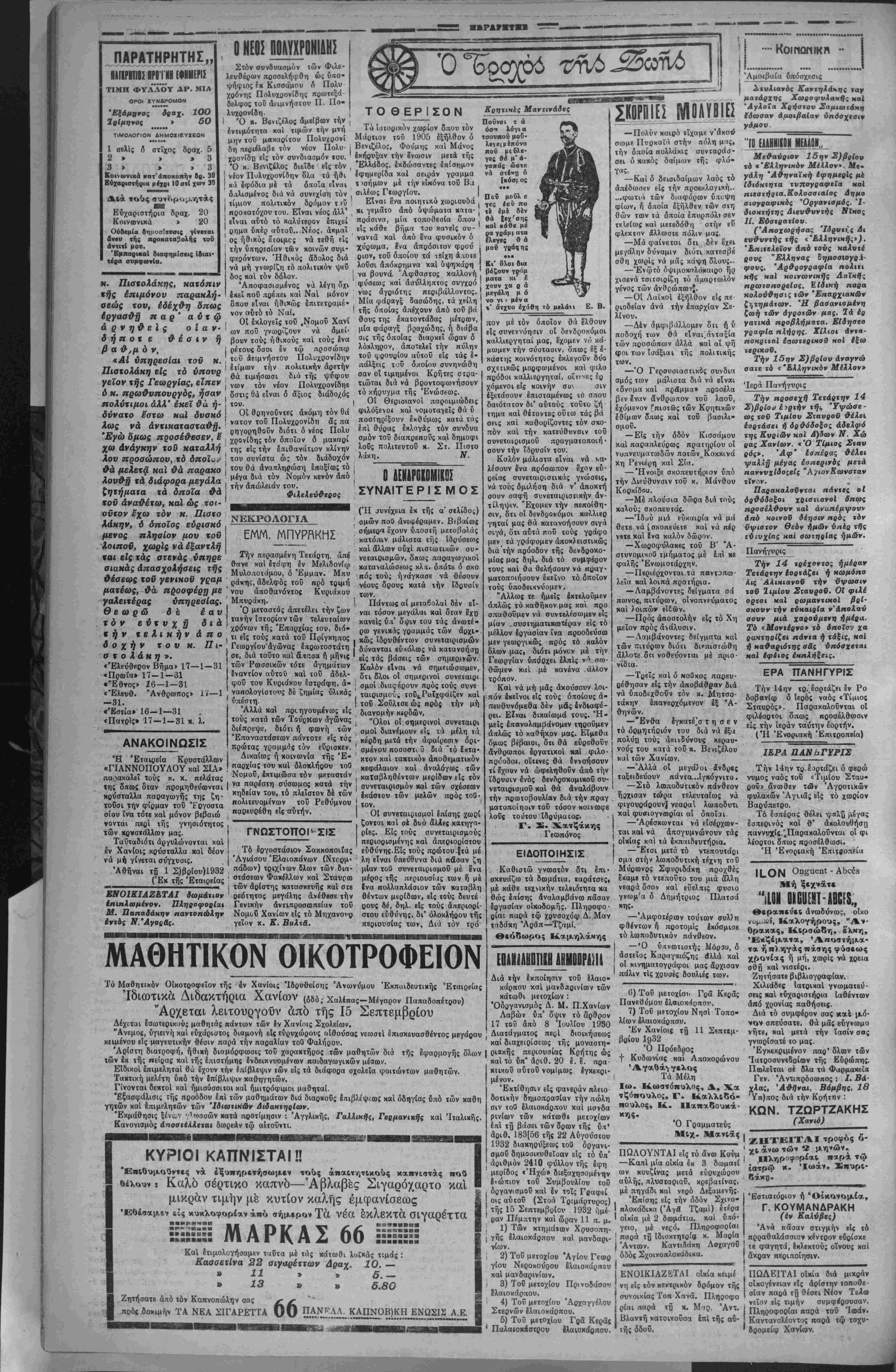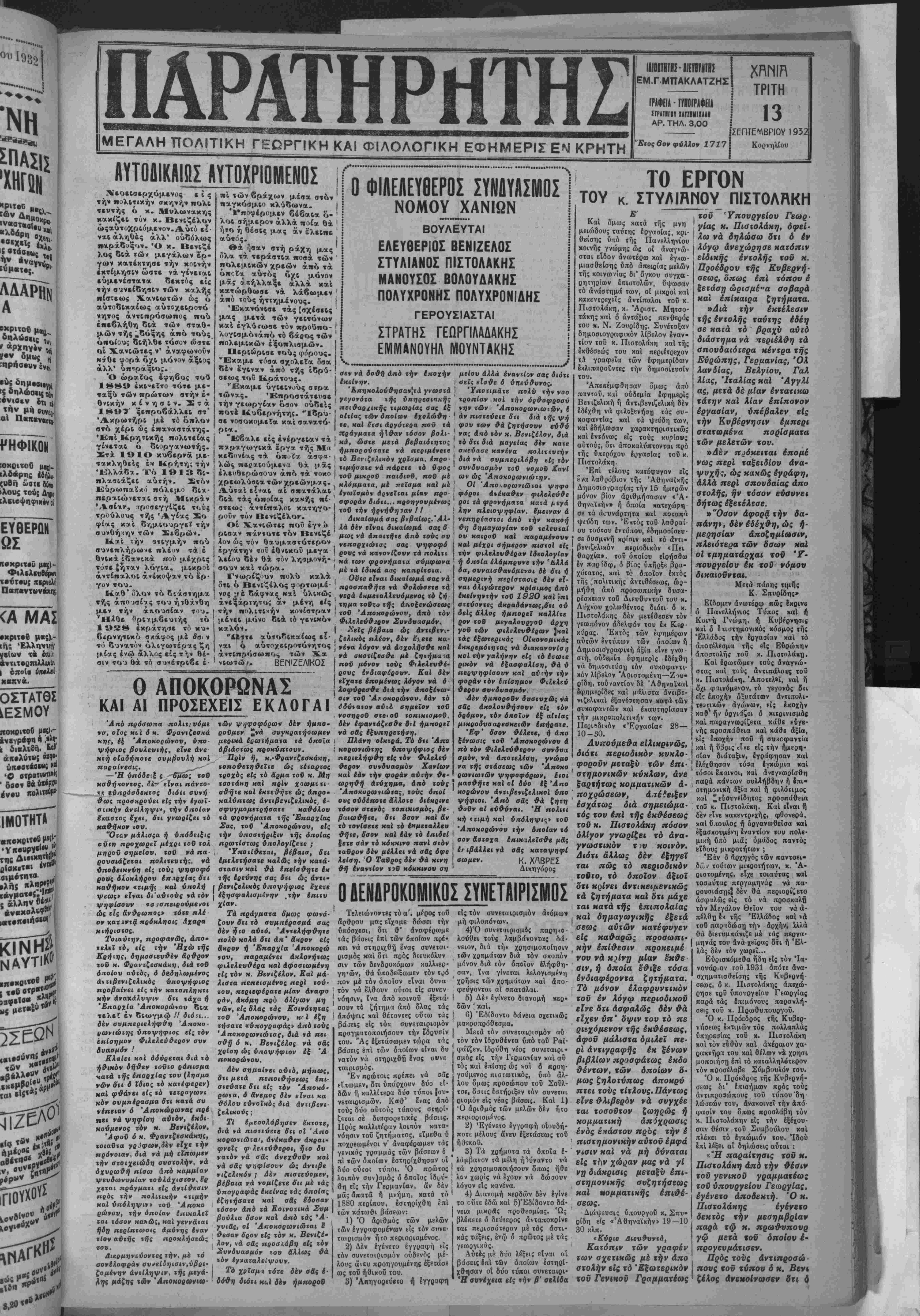 Χ·*!, <Ι ΡΗΤΗΪ ΜΕΓΑΛΗΤΤΟΛΙΤΙΚΗ ΓΕΟΡΠΚΗ ΚΑΙ ΦΙΛΟΛΟΠΚΗ ΕΦΗΜΕΡΙΣ ΕΜ ΚΡΗΤΗ ΑΥΤΟΔΙΚΑΙΩΣ ΑΥΤΟΧΡΙΟΜΕΝΟΣ Ι.ΙΟ.ΪΗΪΑΣΊΜΙΣ ΕΜ.Γ ΜΠΑΚΛΑΤΖΗΣ ίΡΑΦΕΙΑ-ΤΥΙΟίΡΑΦΕΙΙ ΣΤΡ4ΠΠ» ΗΠΙΜΙΙΑεΙ ΑΡ. ΤΗΛ. 3,00 ΤΡΙΤΗ 13 | ΙΣΕΠΤΕΜΒΡΙΟΥ 1952 Έτος βον φύλλον 1717 Κορνηλίου Νεοεισερχόμενος είς την πολιτικήν σκηνήν πολΐ τευτής ό κ. Μυλωνάκης κακίζει τόν κ. Βενιζέλον ώςαυτοχριόμενον.Λύτό εί¬ ναι άληθές άλλ' ουδόλως -αράδοξον. Ό κ. Βενιζέ λος διά των μεγάλων έρ¬ γων κατέκτησε την κοινήν εκτίμησιν ώστε νά γίνεται ευμενέατατα δεκτός είς την συνείδησιν των καλής πίστεως Χανΐωτών ώς ό αυτοδικαίως αύτοχεΐροτό νητος άντΐπρόσωπος πού επεβλήθη διά των σταθ- μών τής «δόξης άπό τούς όποίους διήλθε τόσον ώστε' οί Χανιώτες ν' άναφωνοϋν κάθε φορά ό'/ΐ μ.όνον άξιος άλλ' υπίράξιος. Ό ώραίος έφηβος τού 1889 έκι*είτο τότε με· ταξύ των πρώτων στήν ε¬ θνικήν κίνησιν. Στά 1897 ξεπροβάλλει στ* Άκρωτήρι μέ τό όπλον βτό χέρι ώς έπαναστάτης. 'Έπί.Κρητΐκής πολΐτείας ' γίνεται ό διοργανωτής. Στά 19 1Ο κυβερνά με¬ τακληθείς έκ Κρήτης την Έλλάδα. Τό 19 13 δΐ- πλασιάζει αυτήν. Στόν Εύρωπαϊχό πόλεμο δια- περαιώνεται στή Μικράν Άβίαν, προσεγγίζει τ«»ύς τρούλους τής Άγίας Σο φίας καί δημιουργεΐ την συνθήκην των Σιβμών. Καί την στιγμήν πού αυνεπλήρωνε πλέον τα έ θνΐκά. ίδανικά πού μέχρις τότε ζή τα ν λόγΐα, μΐκροί άντίπαλοι άνέκοψαν τό έρ¬ γον τού. Κ-χΟ' όλον τό αιάστημα τής άποοσί·»ς τουήϊθάνθη μέν την ά γ. θυσίαν τ»υ. ι νΗλΟε «ρι·»μβευιής τό 1928 έκράτηιε τό κυ· β«ρνητΐκό σκάφος μέ ό'σ. ν τό δυνατόν όλιγωτέρας ζή μίας ένώ άλλος είς τ V θέ¬ σιν τού θά τό συνέτριβε ε¬ πί ιών βράχων μέσα στόν παγκόβμιο χλύδωνα. Υποφέρομεν βεβαία δ- λοΐ σήμερον άλλά ποία θά ήτο η θέσις μας άν έλεΐπε αυτάς. Θά ^σαν στή ράχη μας υλα τα τεραστία ποσά των πολεμΐχών χρεών άπό τα οπεία αυτός δχΐ μόνον μάς «πήλλαξε αλλά καί κατώρθωσε νά λάβωμεν άπό τούς ήτιημένους. Έκανόνιβε τάς [σχέσεΐς μας μετα των γειτόνων καί έγλύι-ωσε τόν προϋπο- λογισμόνάηό τό βάρος των πολεμΐκών έξοπλισμών. Περιώρισε τούς φόρους. "Εκαμε τόσα βχολεία όσα δέν έγιναν άπό τής ιδρύ¬ σεως τοϋ Κράτους. "Έκαμε ύγιεινούς σ«ρα τώνας. 'Έπροστάτευαε την γεωργίαν όσον ουδείς ποτέ Κυβερνήτης. "Ιδρυ- σε νοβοκομεϊα καί σανατό- ριτ. Έβοιλε είς ενέργειαν τα παραγωγικά έργα τής Μα κεδονίας τα όποία ασφα¬ λώς πεοαιούμενα θά μ άς έλευθερώσουν άπό τα τοκο χρεωλυσία των χρεώνμας. Λύταί είναι αί σηατάλαι διά τάς οποίας χακής πί¬ στεως άντίπαλοι χατηγο- ροΰν^τόν Βενιζέλον. Οί Χανιώτες ποϋ έγν ί>