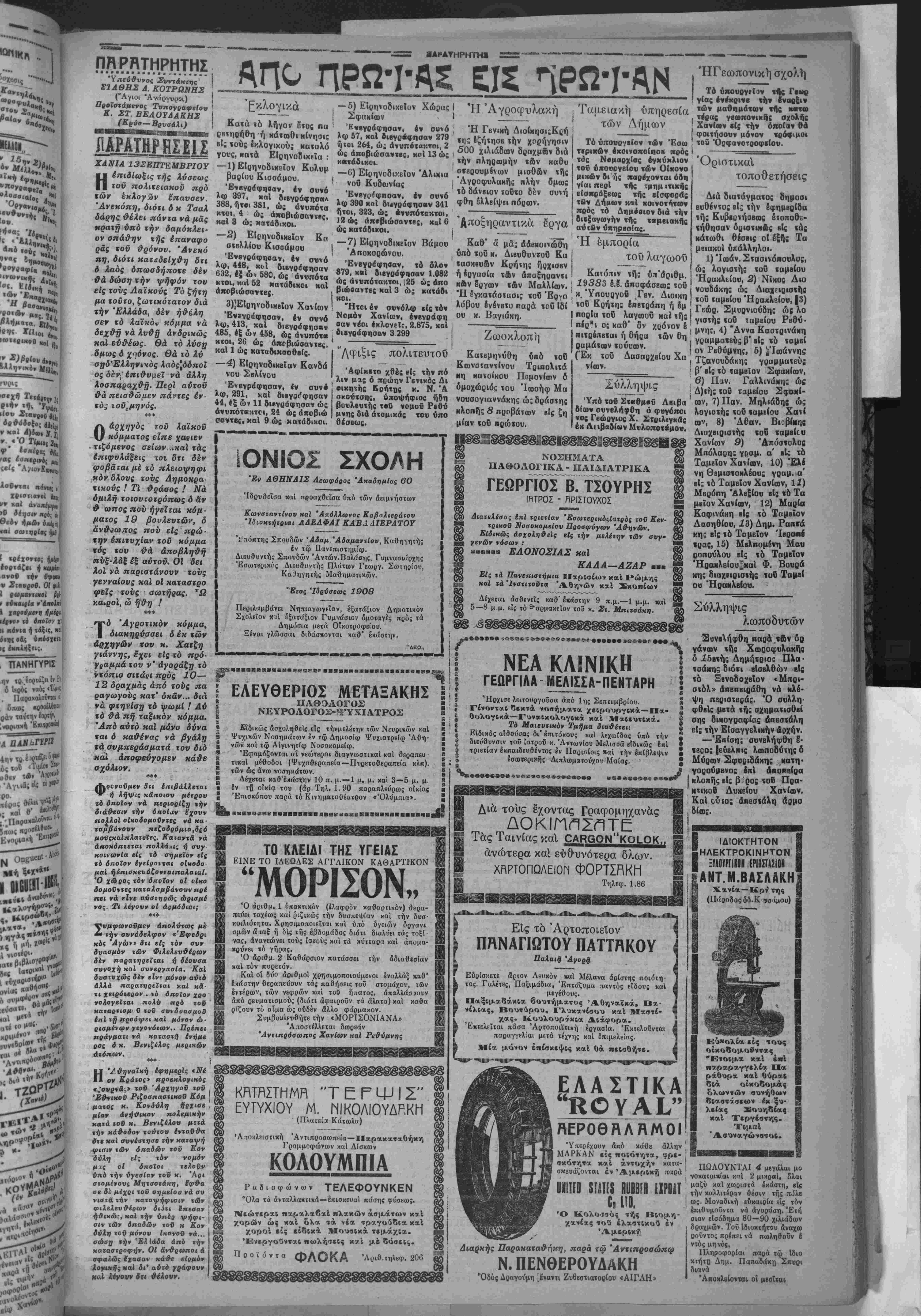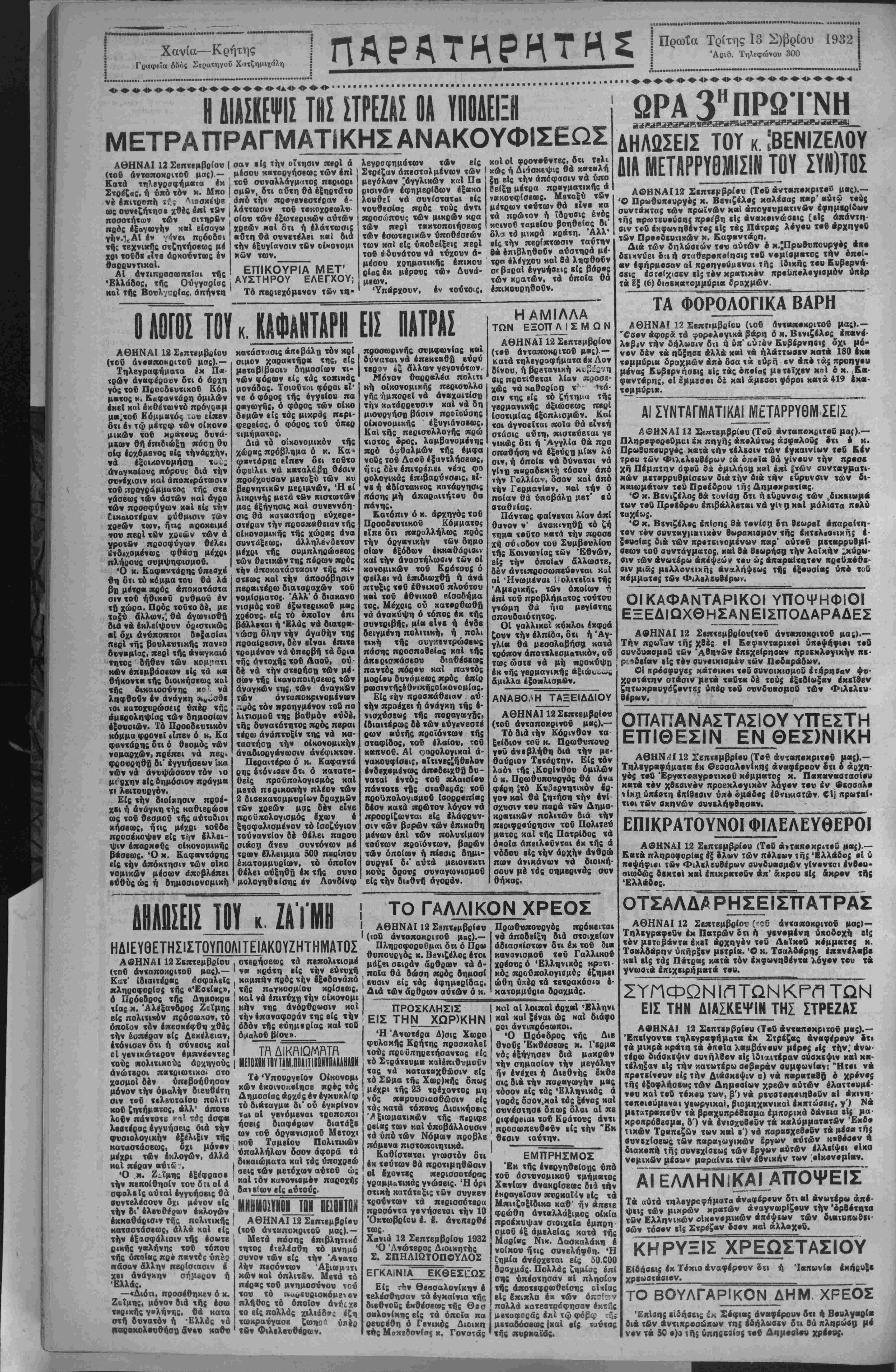 χον τό ?ίυ«<νρισκόμβ*ον πλήθος τό οποίον άντΗχε το είς πολλάς χιλιάδ»; έζη τωκραύγασε ζωηηά τβν Φιλιλευθέρων. Ι ΑΘΗΝΑΙ 12 Σεπτέμβριον Ι (ιθθ άνταποΜρκοΰ μας).— Πληροφοροΰμαι δή ό Προ* θνπονργός κ. Ββνιζέλος έτοι μόζβι σειράν άρθρων τα ό- ποΐα θά δώση πρός δημοσί ( ευσιν είς τάς εφημερίδας. Διά των άρθρων αυτών ό κ. ΠΡΟΣΚΛΗΣΙΣ ΕΙΣ ΤΗΝ ΧΩΡ)ΚΗΝ Ή Ανωτέρα Δ)σις Χωρο φυλακής Κρήτης προσκαλεΐ τούς προϋπηρετήσαντας είς τό Στράτενμα καΙέπιθυμο€ν τας νά καταταχθώσιν είς τό Σβμα τήβ Χωο)κής όπως μέχρι τής 23 τρέχοντος μη δς παρουσιασθώσιν είς τάς κατά τόπους Διοικήσεις Ά ξιωματικών τής ιτ·ριφε ρείας των καί ύποβάλλουσιν τα υπό των Νόμοαν προβλε πόμενα πιστοποιηχικά. Καθίσταται γνωστόν δτι έκ τεύτων Θά προτιμηθδσιν οί έχοντες περισσοτέρας γραμματικάς γνώαεις. Ή όρι στικτ] κατάτοξις τδν ουγκ εν τοούνχων τα περισσότερα προσόντα γενησεται την 10 Όκτωβρίου έ. £. άνυκΐρθέ τως. Χανιά 12 Σεπτέμβριον 1932 Ό Άνώτερος Διοικητής Σ. ΣΠΗΛΙΩΤΟΠΟΥΛΟΣ ΕΓΚΑΙΝ1Α ΕΚΘΕΣΕΩΣ Είς τ^ν Θεσσαλονίκην έ τελέσθτΐσαν τα έγκαίνια τής διεθνοδς εκθέσεως τής Θεσ σαλονίκης είς τα όποϊα πά ρενοέθη ό Γενιχός Δΐοικη τής Μσκεδον(σ$ κ. Γονατάς ΩΡΑ3ΗΠΡΩΤΝΗ Πρωθυπουργός πρόκειται νά άποδείξη διά στοιχείων άδιασκίστων δτι έκ τοΰ δια κανονισμοΰ τ·ΰ Γαλλικοΰ χρέους ό 'Ελληνικός κραχι- κός προϋπολογιομθς έζημεΐ ώθη υπέρ τα τετρακόσια έ- κατομμύρια δραχμάς. | καΐ αί λοιπαί αρχαί Έλληνι | καί καί ξέναι ώς καί διάφο ροι άντιπρόαωηοι. Ό Πρόεδρος τής Διε Ονους Εκθέσεως χ. Γιρμα νός έξήγησεν διά μακρών την σημασίαν την μεγάλην ή» ένέχει ή Διεθνής έκθε σις δια την παραγωγήν μας τόσον είς τάς Ελληνικάς ά γοράς δσον,χαΐ τάς ξένας καί συνέστησε όπως δλαι αί πε ριφέρειαι τοΰ Κράτονς άντι προσωπευθεδν είς την "Εκ θέσιν ταύτην. ΕΜΠΡΗΣΜΟΣ Έκ τής ένεργηθείσχις υπό τοΰ άσιννομικοΰ τμήματος Χανίων άνακρίσεως διά την έκραγεΐσαν πυρκαΐαν είς τα Μπΐτζαξΐδικα καθ' ήν «πέτε φβώθη ανταλλάξιμος οίκία προίκυψαν στοιχιΐα έμπρη σμοΰ έξ άμελείας κατά τής Μαρίας Νικ. Δασκαλάκη έ νοίκου ήτις συνελήφθη. Ή ζημία άνέρχεται είς 50.000 δραχμάς. Πολλάς ζημίας επί σης ύπέστησαν αί πλησίον τής άποτιφρωθείσης οικίας είς έπιπλα έκ των όπΓ':ν πολλά κατεατράφησαν έκτιΐς β¥ ταύτας φρς τφ μεταδόσεως ίκαί είς τής πυρκαΐδς. ΔΗΛΟΣΕΙΣ ΤΟΥ κ [ΒΕΝΙΖΕΛΟΥ ΔΙΑ ΜΕΤΑΡΡ][ΜΓΓΟΥ ΣΥΝ)ΤΟΣ ΑΘΗΝΑΙ 12 Σΐπ«μβρί·υ (Τοδ «νταπεκριτεθ μας).—· Ό Πρ»«»ΐτ«»ργ·ς κ. Βενιζέλος καλεσας ηαρ' αύϊώ τούς σ»ντακτσς των ηρβϊνών καί απογιυματινδν εφημερίδων της πρωτευούσης πρείβη «Ις ανακεινώοβις [·1ς απάντη¬ σιν τοδ έκφννηθέντες είς τάς Πάτρας λίγου τεΰ «ρχηγοδ τδν Πρεεδιυτΐκών Μ. Καφανχάοη. Διά των δηλώσΐών τευ αυτών ε κ.;Πρ«8νηουργες ακε διΐΗνΰει δτι ή οταθερεποίηβις τβΰ νεμίβματος την οποί¬ αν έφήρμβσαν αί ηρεηγεύμΐναι της Ιδικϋς τού Ευβερνή- σεις εσΓοίχισεν ιί$ τεν κρατικόν πρεϋπελ·γιομόν υπέρ τα '&Ι (έ) δΐοκκατομμόρια δραχμών. ΤΑ~ ΦΟΡΟΛΟΠΚΑ ΒΑΡΗ ΑΘΗΝΑΙ 12 ϋεπΤΕμβρίου (νοΰ θνταπεκριτοΰ μας).— '«2οεν άφορά τα φορολογικά βαρη ό κ. Βΐνιζέλος έπανέ- λ«β(ν την δήλωσιν δή ή ύη' &ικεν Ενβέρνηοις δχι μό¬ νεν δέν τα ηύξησε αλλα καί τα ήλαττωοεν κατά 180 έκα τεμμόρια δραχμών απε δσα τα εύρη εν βπε τάς προηγβυ μένας Ενβΐρνήσιις είς τάς όπείαί μετ·Τχεν κοί ό χ. ;Εα· φαντίρης, εί εμμΐσει δέ κ«ί αμεοει φόροι κατά 419 έκα- τεμμύρια. ΑΙ ΣΥΝΤΑΓΜΑΤΙΚΑΙ ΜΕΤΑΡΡΥΘΐνΐ ΣΕΙΣ ΑΘΗΝΑΙ 12 Σβπτεμβρίευ (Τοδ ίνταποκβΐτοδ μα{) —- Πληροφοροϋμιΐι έκ πηνήί απελύτνς άαφοιλοΰς ίτι Α κ. Πρωθυπευργος κατ» την τέλκοιν των ίγκα