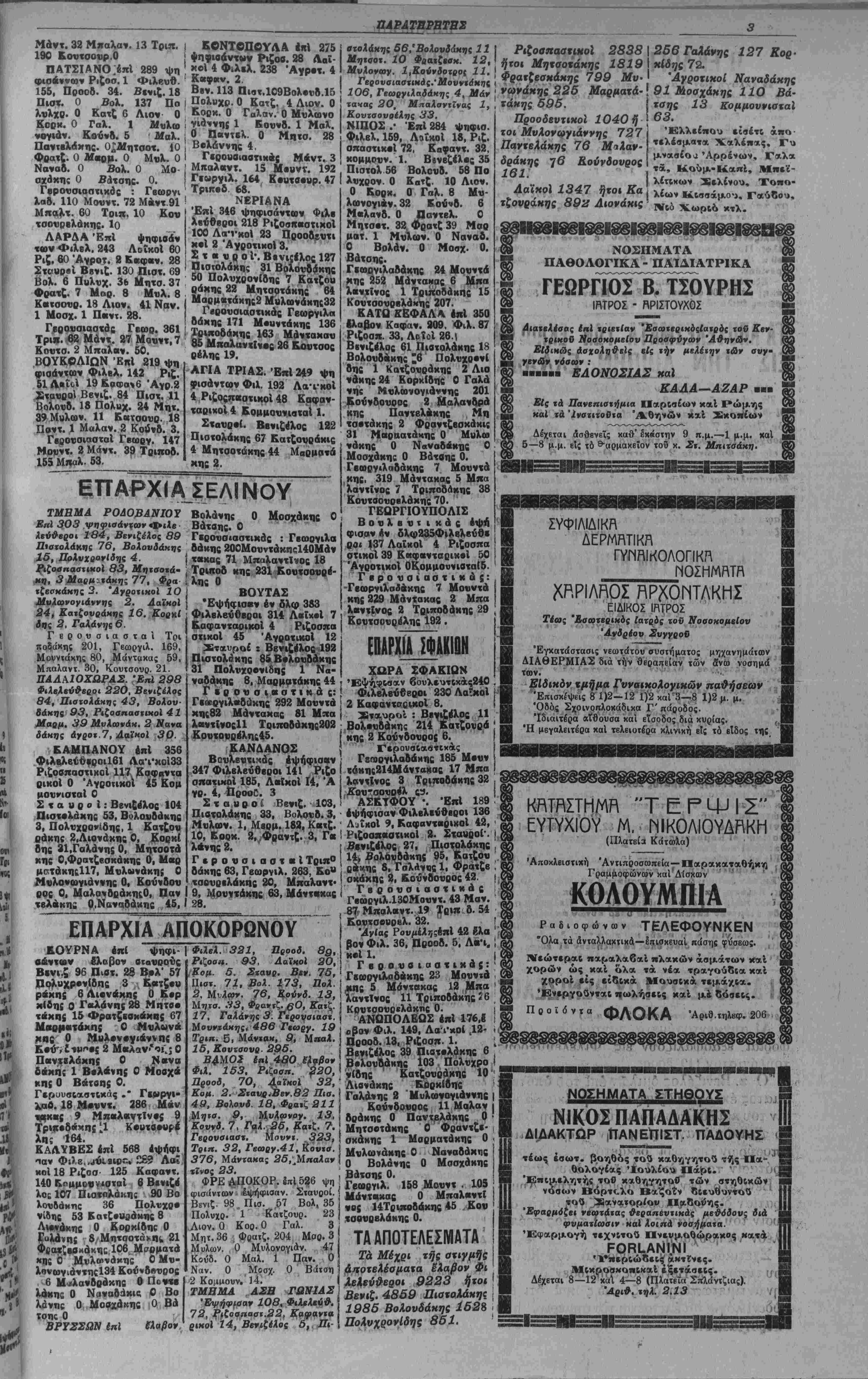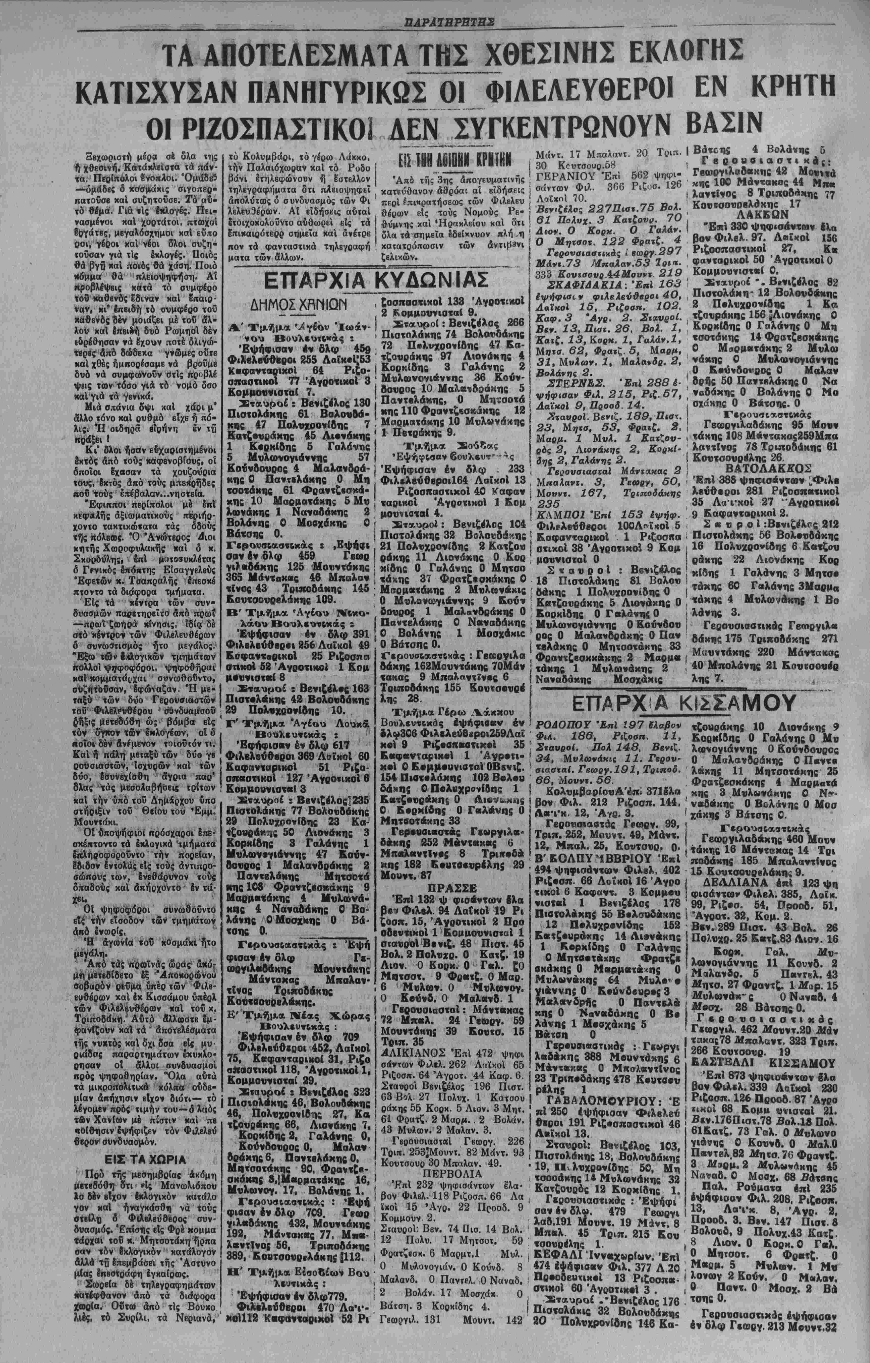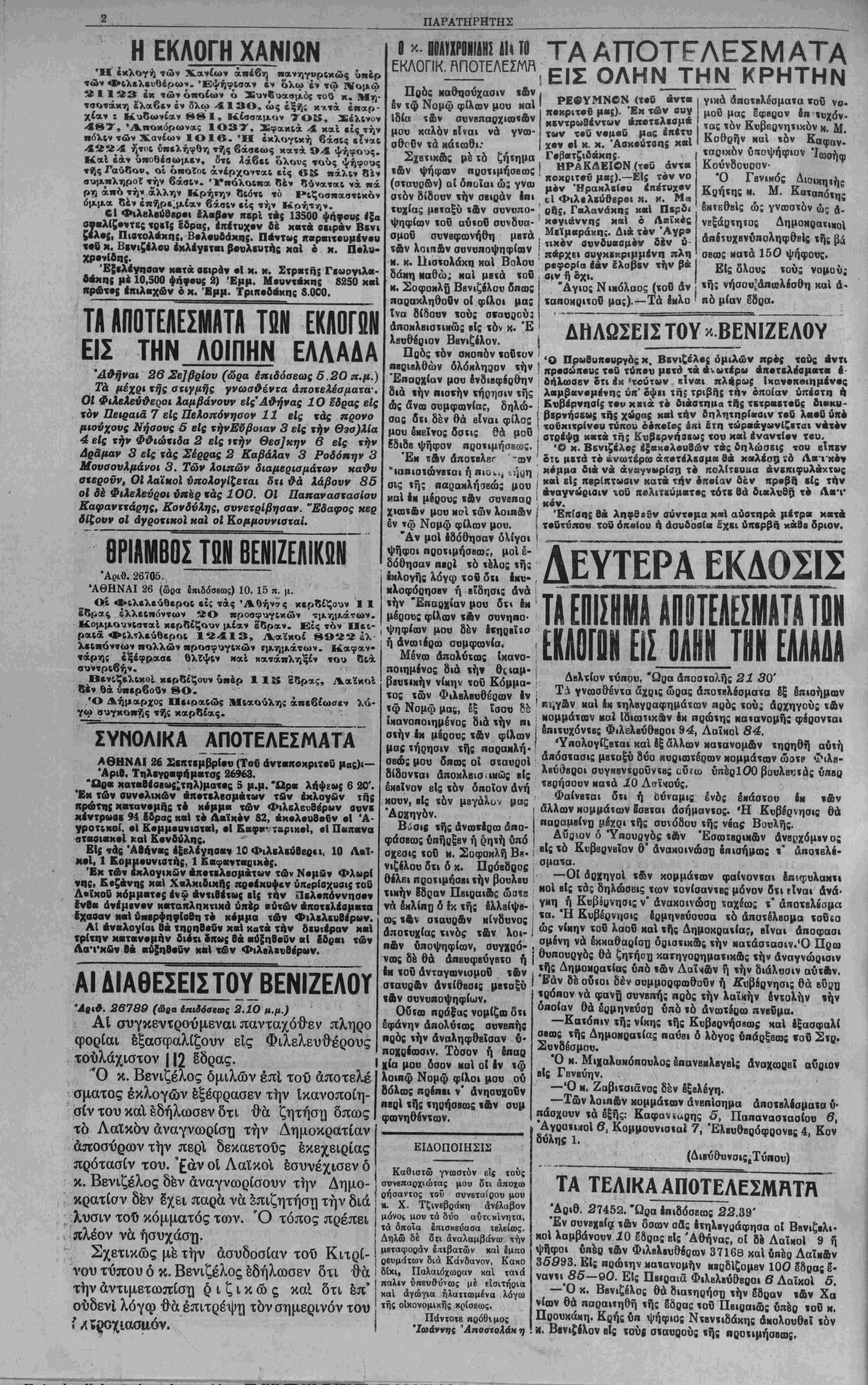 τρίτην κειτβνομην διϊτι <κ«ς θβ «όξηθοδν αί έδροιι «ών Λα'Γκδν 8β αύ5ηβ·δν καΙ των Φιλβλενθέρο»ν. Ο - ΟΟΑΥΧΡΟΝΙΔΙΙΣ ΔΗ ΤΟ ΕΚΛΟΓΙΚ. ΠΠΟΤΕΛΕΣΜΗ ί,,.' ΑΙ ΑΙΑΘΕΣΕΙΣΤΟΥ ΒΕΝΙΖΕΛΟΥ Αριθ. 26789 (ώαα έπιδόσεως 2.10 μ.μ.) Αί συγκεντρούμεναι πανταχό'θεν· πληρο φορίαι έξασφαλίξουν είς Φιλελευθέρους τοΌλάχιστον ||2 δδρας. "Ο κ. Βενιζέλος ομιλών επί τοΌ άποτελέ σματος έκλογών έξέφρασεν την Ικανοποίη¬ σιν τού κα εδήλωσεν δτι θά ζητήστ) δπως τό ΛαΧκόν αναγνωρίση την Δημοκρατίαν άποσύρων τϊτν περ δεκαετους εκεχειρίας πρότασίν τού. '£άν οί ΛαΧκοΙ εσυνέχισεν δ κ. Βενιζέλος δέν άναγνωρίσουν την Δημο- κρατίσν δέν δχει παρά νά επιζητήση την διά λύσιν τού κόμματός το^ν. Ό τόπος πρέπει πλέον νά ήσυχάσχ]. Σχετικώς μέ την άσυδοσίαν τοϋ Κιτρί-1 νού τύπου ό κ. Βενιζέλος εδήλωσεν δτι θά την άντιμετωπίστ) § ι ζ ι κ ώ ς καί δτι έπ' ούδενί λόγφ θά επιτρέψη τόν σημερινόν τού ? Λϊιοοχιασμ,όν. Πρός καθησύχασιν »4ν δν ιφ Νομφ φίλων μου καί Ιδία τ δι ν συνβπαρχιαιτΛν μου καλόν βΐναι νά γνοο- σθοθν νά κάιωθι: Σχετικώς μετό ζήνημα «ών ψήφων προτιμήσβως (σταυοδν) αί οποίαι ώ; γναι οτόν δίδουν την σειράν ·πι τυχίας μβταξύ «Αν συνυπο- ψηφίων τοΰ αύΐοθ συνδυα- σμοθ συνβφωνήθη μβτά «Αν λοιπδν σονυποψηφίων μ. κ. Πιστολάκη καί Βόλου δάκη καθώ; καί μβϊά τοδ ν. Σοφοχλά Βενιζέλου δπως παρακληθοθν ο. φίλοι μας Ινα δίδουν τούς σκαοαού: άποΗλβιοιΐΗω; είς νόν κ. Έ λβυθέριον Βενιζέλον. Πθός «όν σκοηόν «οθτον ηβρΐΒλθών δλΟΝληρον «ήν Επαρχίαν μου ένδιοφέρθην διά «ήν πιστήν τήρησιν «ής ώς άνω συμφωνίας, δηλώ¬ σας δΐι δέν θά είναι φίλος μου έΜεΐνος δσΐις θά μοϋ ίδιδβ ψήφον προΐιμήσβοος. Έν ν&ν οποτβλβΓ -α)ν ΊαΒΐστώνβναι ή πιο*., .ήρη σις «ή; παρακλήαΒώ; μου καί Ιμ μέρους «Αν συνβπαρ χιωνΑν μου και «ών λοιπλν έν »ω Νομφ φίλων μου. "Δν μοί εδόθησαν ολίγοι ψήφοι προτιμήσβω;, μοί ε¬ δόθησαν ΠΒ0.1 «ό «βλος «ής Ιπλογής λόγφ χοδ δΐι Ιμιι- ■λθφόρησβν ή είδησις ανά «ήν "Επαρχίαν μου δτι έκ μέρους ςρ.λων «Αν συνηπο· ψηφίων μου 8εν έτηρβΐΐο ή ανωτέρω ουμφωνία. Μόνω απολύτως ίκανο- ποιημένος διά «ήν θιιαμ- ββυτικήν νίκην τοΰ Εόμμα- τος «ών Φιλβλβυθέρων Ιν «φ Νομφ μας, έξ ΐσου δ£ ΪΝανοποιημένος διά «ήν πι σ«ήν Ιμ μέρους «Αν φίλων μαςτήρησιν τής παρακλή¬ σεως μου δπως οί σιαυροί δίδονται αποκλβισ ικώς είς έκΒΐνον βΐς τόν οποίον άνή κουν, είς «όν μεγάλον μας "Αρχηγόν. Βίσιβ «ής ανωτέρω απο¬ φάσεως υπήρξεν ή ρη«ή υπό σχέσις ϊοΟ ν. Σοφοκλή Β>·