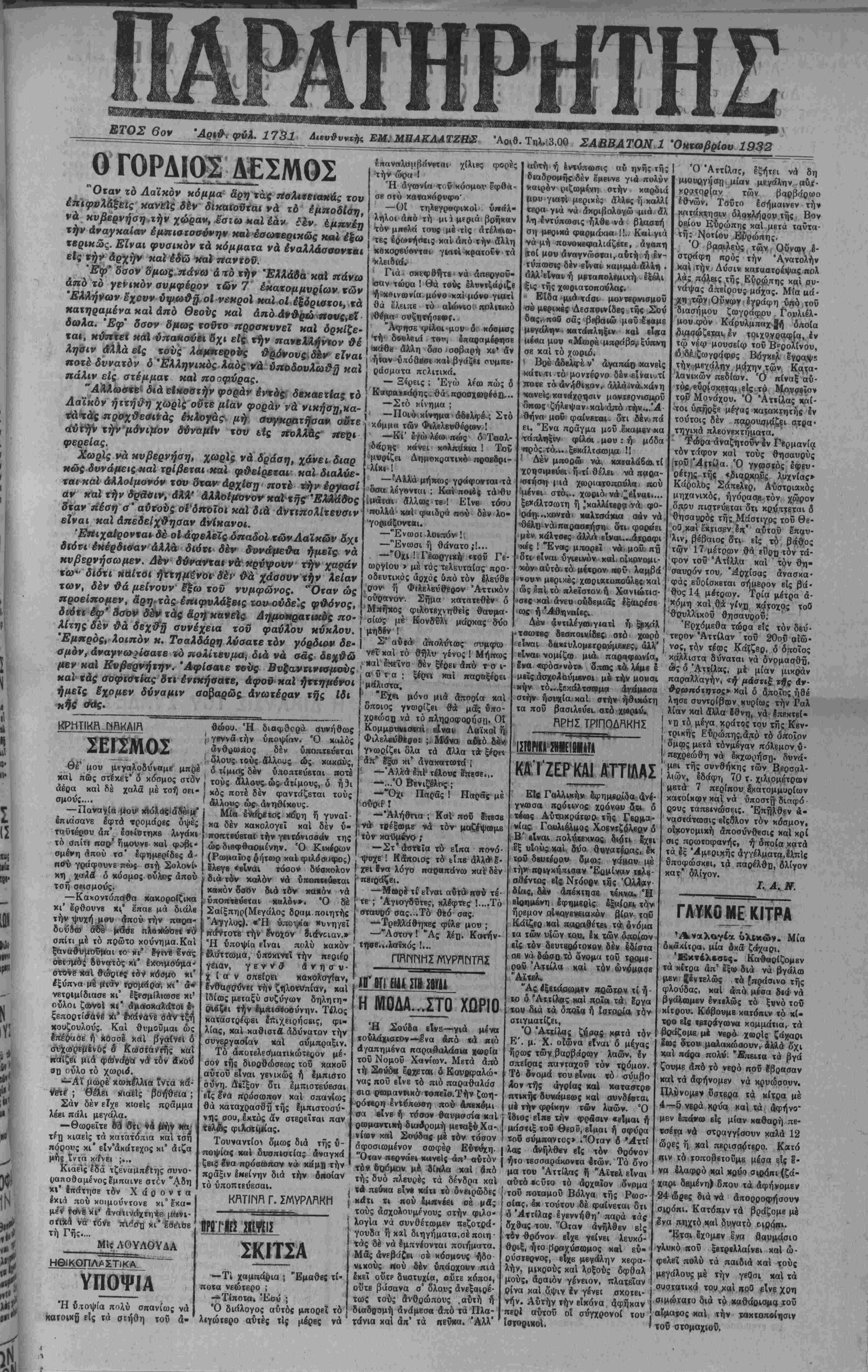 ΒΤΟΣ 6όν Άρ»θΓ φύλ. 17$1 Δ4βΐ»θυν.*ήβ ΕΜ;ΜΒΑΚΔΑΤΖΒ& ΆοΑθ. Τ«λ,ι3,00 ΣΑΒΒΑΤΟΝ 1 Όκζωβρίου 1932