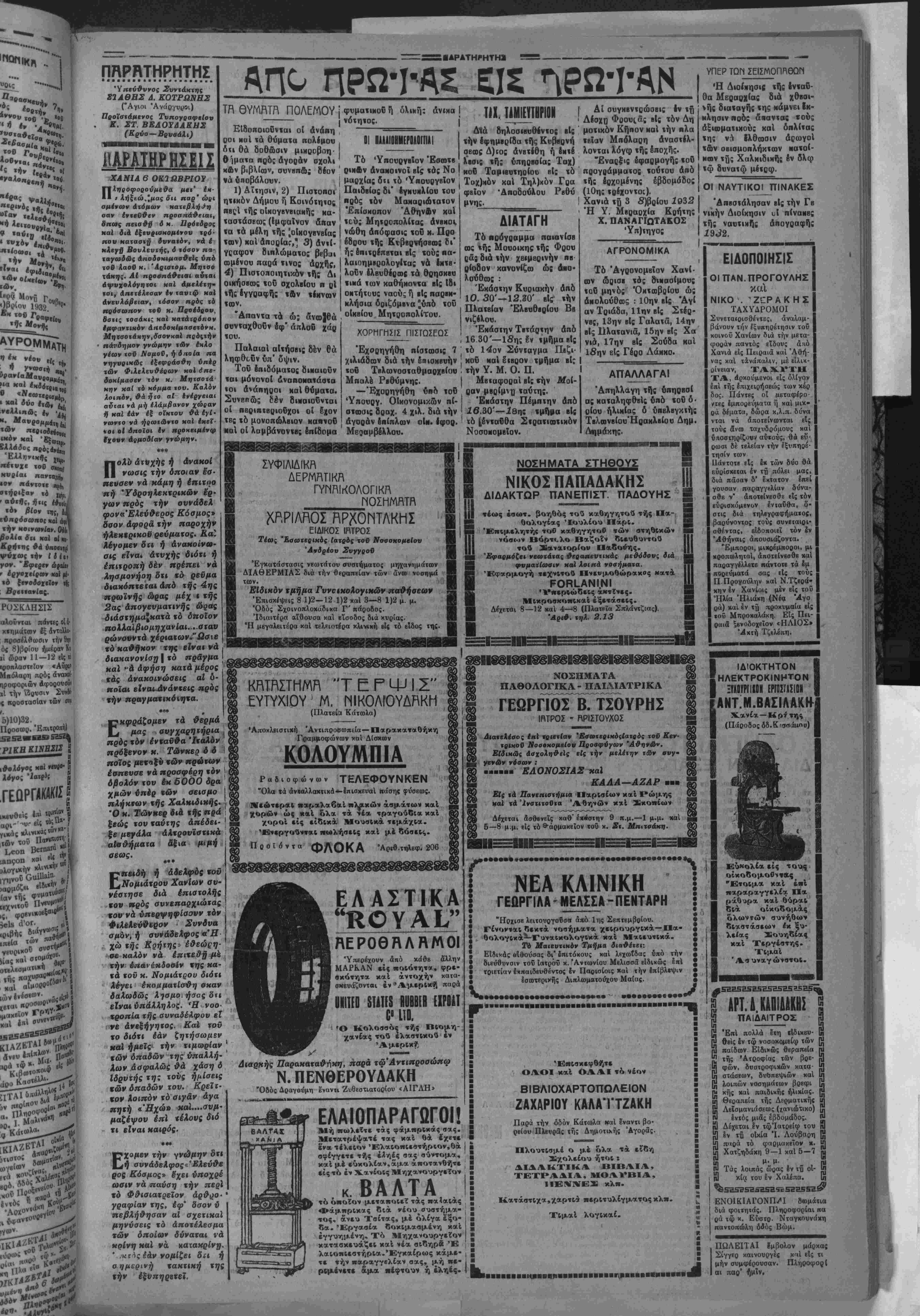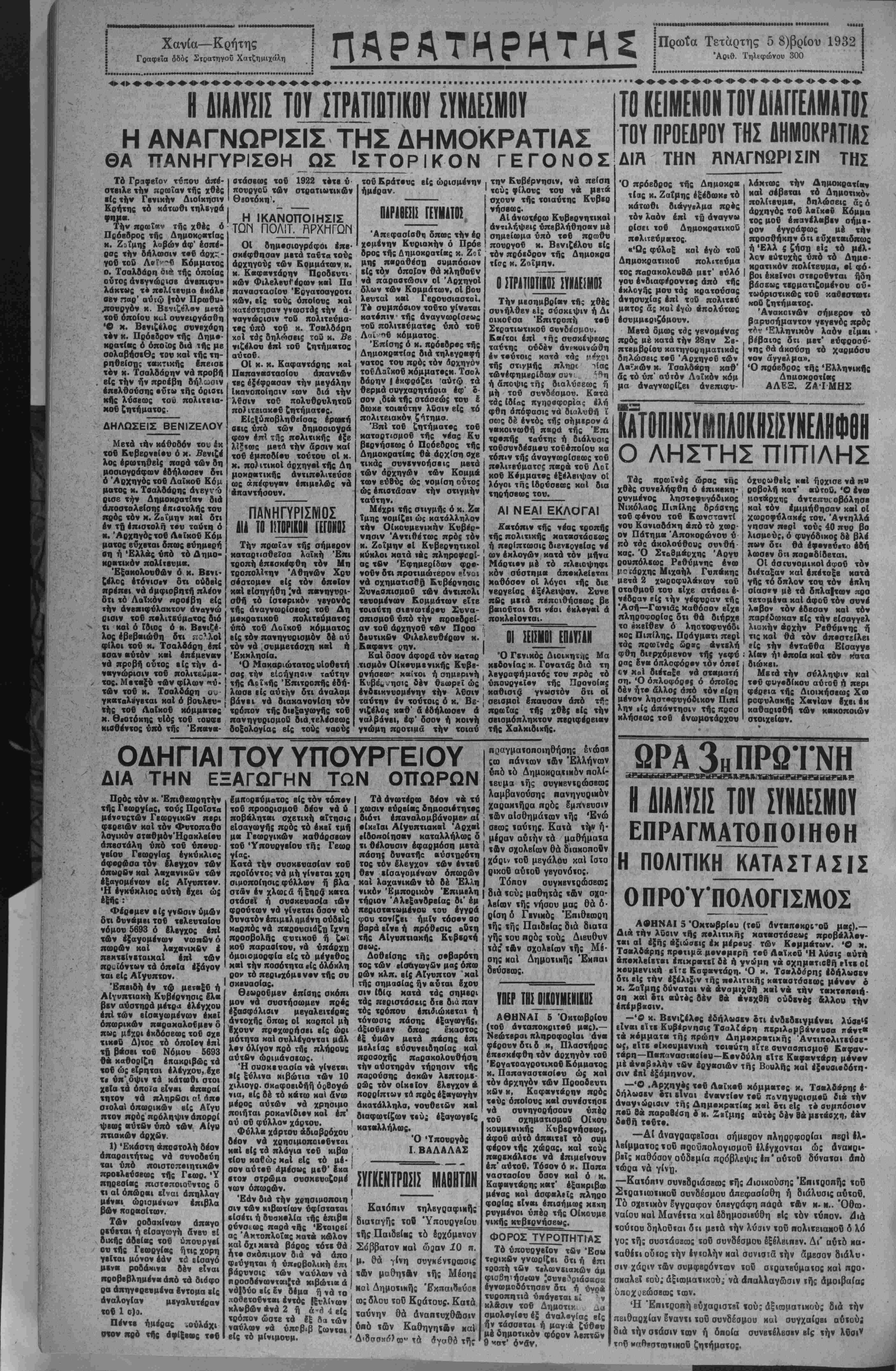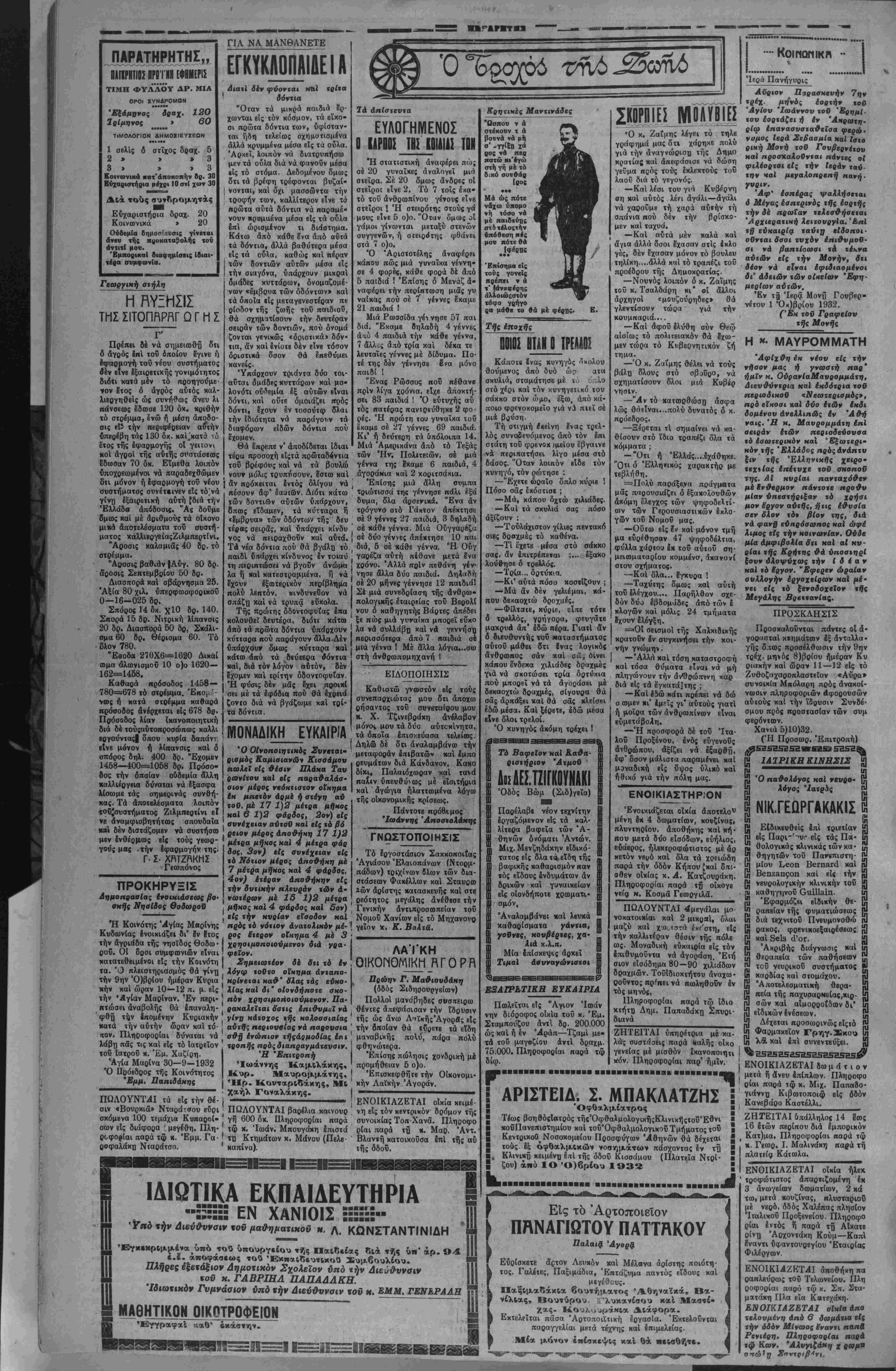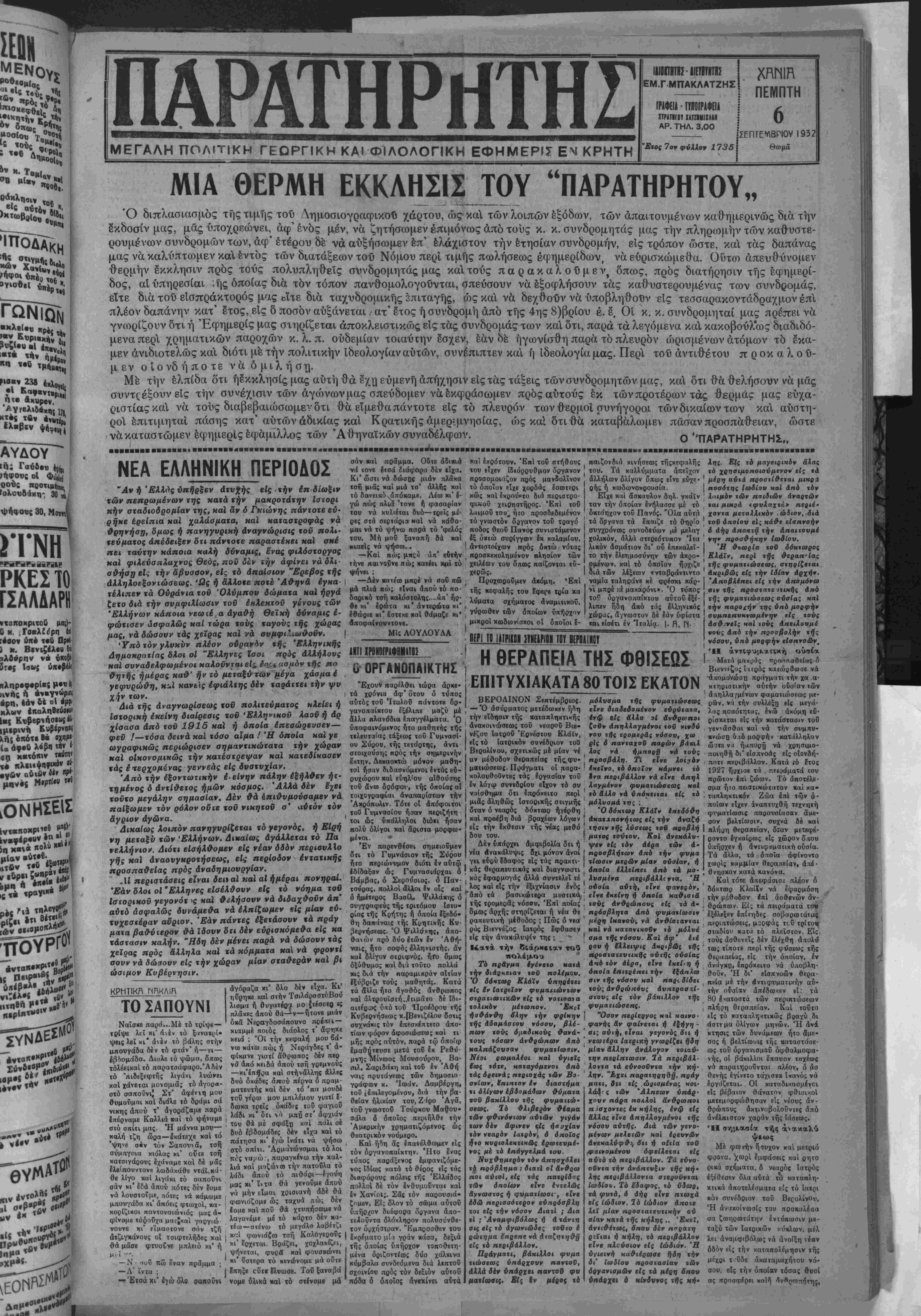 ία άφοδ λάβΠ Φ < οη κβτόηιν τΛ ει·*··"* αύιδ» »ν «Ρ·1 ί ·» μηνός Ρ ι·» ΙΙΑΡΑΤΗΡΗΤΗΣ ΜΕΓΑΛΗ ΠΟΛΙΤΙΚΗ ΓΕΩΡΠΚΗ ΚΑΙ ΦΙΛΟΛΟΠΚΗ ΕΦΗΜΕΡΙΣ ΕΜ ΚΡΗΤΗ ΙΙΙ0Π1ΤΠ - ΙΙΕΠΤ1Τ12 ΕΜ.Γ ΜΠΑΚΛΑΤΖΗΣ ΓΡΑΦΕΙΙ - ΓΠΟΓΡΑΦΕΙΑ ΙΤΜΤΙΓιϊ Ι.ΤΠΗΙΙΑ1Ι ΑΡ. ΤΗΛ. 3.00 ΠΕΜΠΤΗ 6 Έτος 7σν φύλλον 1735 ΣΕΠΤΕΜ8ΓΙΟΥ 1932 θωμά ΜΙΑ ΘΕΡΜΗ ΕΚΚΛΗΣΙΣ^ΟΥ "ΠΑΡΑΤΗΡΗΤΟΥ,, Ό διπλασιασμος της τιμής τού Δημοσιογραφικόν χάρτου, ώς·κα των λοιπών έξόδων, των απαιτουμένων καθημερινώς διά την δκδοσίν μας, μάς ύποχρεώνει, άφ'ενός μέν, νά ζητήσωμεν έπιμόνως άπδ τους κ. κ. συνδρομητάς μας την πληρωμήν των καθυστε¬ ρουμένων συνδρομών των, άφ' ετέρου δέ νά αύξήσωμεν έπ' ελάχιστον την ετησίαν συνδρομήν, είς τρόπον ώστε, κα τάς δαπάνας μας νά καλύπτωμεν καΐ έντός των διατάξεων τοΰ Νόμου περί τιμής πωλήσεως εφημερίδων, νά εύρισκώμεθα. Οντο) άπευθύνομεν θερμήν έκκλησιν πρός τούς πολυπληθεΧς συνδρομητάς μας κατούς παρακαλούμεν, δπως, πρός διατήρησιν τής εφημερί¬ δος, αί υπηρεσίαι ;ής οποίας διά τόν τόπον πανθομολογοΰνται, σπεύσουν νά έξοφλήσουν τάς καθυστερουμένας των συνδρομάς, είτε διά τού εισπράκτορος μας &ιτε διά ταχυδρομικής έπιταγής, ώς κάΐ νά δεχθοΰν νά ύποβληθουν είς τεσσαρακοντάδραχμον επι πλέον δαπάνην κατ' £τος, είς δ ποσόν αΰξάνεται / ατ' έτος ή συνδρομή άπό τής 4ης 8)βρίου έ. δ. Οί κ. κ. συνδρομηταί μας πρέπει νά γνωρίζουν δτι ή Εφημερίς μας σιηρίζεται αποκλειστικώς είς τάς συνδρομάς των καΐ ότι, παρά τα λεγόμενα καΐ κακοβούλως διαδιδό- μεναπερι χρηματικών παροχών κ. λ. π. ουδεμίαν τοιαύτην δσχεν, εάν δέ ηγωνίσθη παρά τό πλευρόν ωρισμένων άτόμων τό £κα- μεν άνιδιοτελώς και διότι μέ την πολιτικήν Ιδεολογίαν αυτών, συνέπιπτεν καΐ ή Ιδεολογία μας. Περ τοΰ άντιθέτου προκαλοΰ- μεν οιονδήποτε νά ομιλήση. Μ έ την έλπίδα δτι ήδκκλησίς μας αύτη θά έχη εύμενή απήχησιν είς τάς τάξεις τώνσυνδρομητών μας, κα δτι θά θελήσουν νά μάς συντχέξουνεΐς την συνέχισιν των άγώνων μας σπεύδομεν νά εκφράσωμεν πρόςαύτούς έκ των προτέρων τάς θερμάς μας ευχα¬ ριστίας καΐ νά τούς διαβεβαιώσωμεν δτι θά είμεθα πάντοτε είς τό πλευρόν των θερμοι συνήγοραι τώνδικαίωντων και αύστη- ροΐ έπιτιμηται πάσης κατ' αυτών άδικίας καΐ Κρατικήςάμεριμνησίας, ώςκαΐδτιθά καταβάλωμεν πάσαν προσπάθειαν, ώστε νάκαταστώμεν εφημερίς έφάμιλλος των Άθηναϊκώνσυναδέλφων. , Ο'ΎϊΑΡΑΤΗΡΗΤΗΣ,, ■ ■■■■■■■ ■■■■■■■ε■■■■■■■■«■·■■■■ ********Λ*****»»Μ**ΜΛ***»*»Μ*^η»********»ΛΜ***Μ*»*»»Μ**Λ********Μ*****»>***********************************