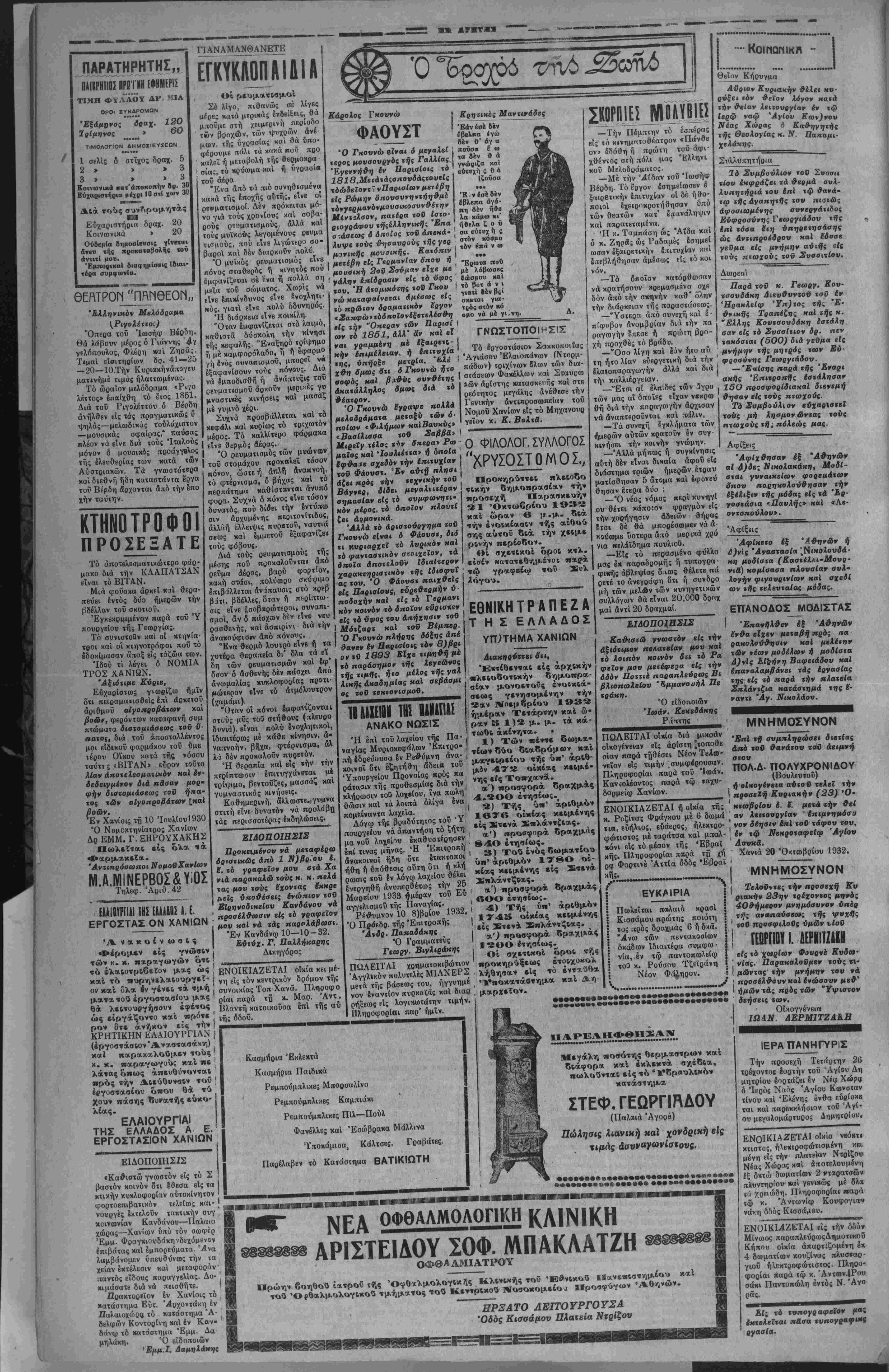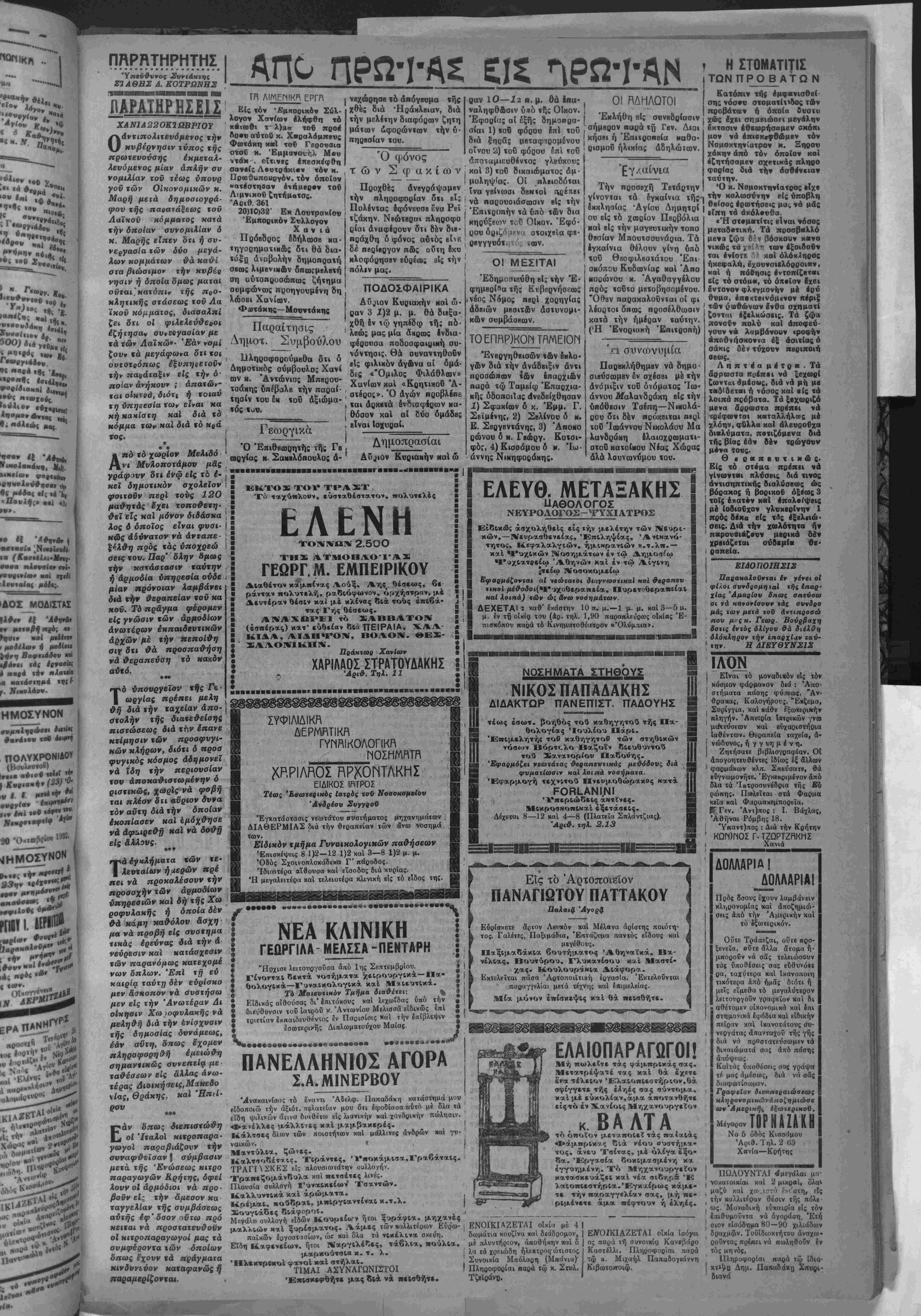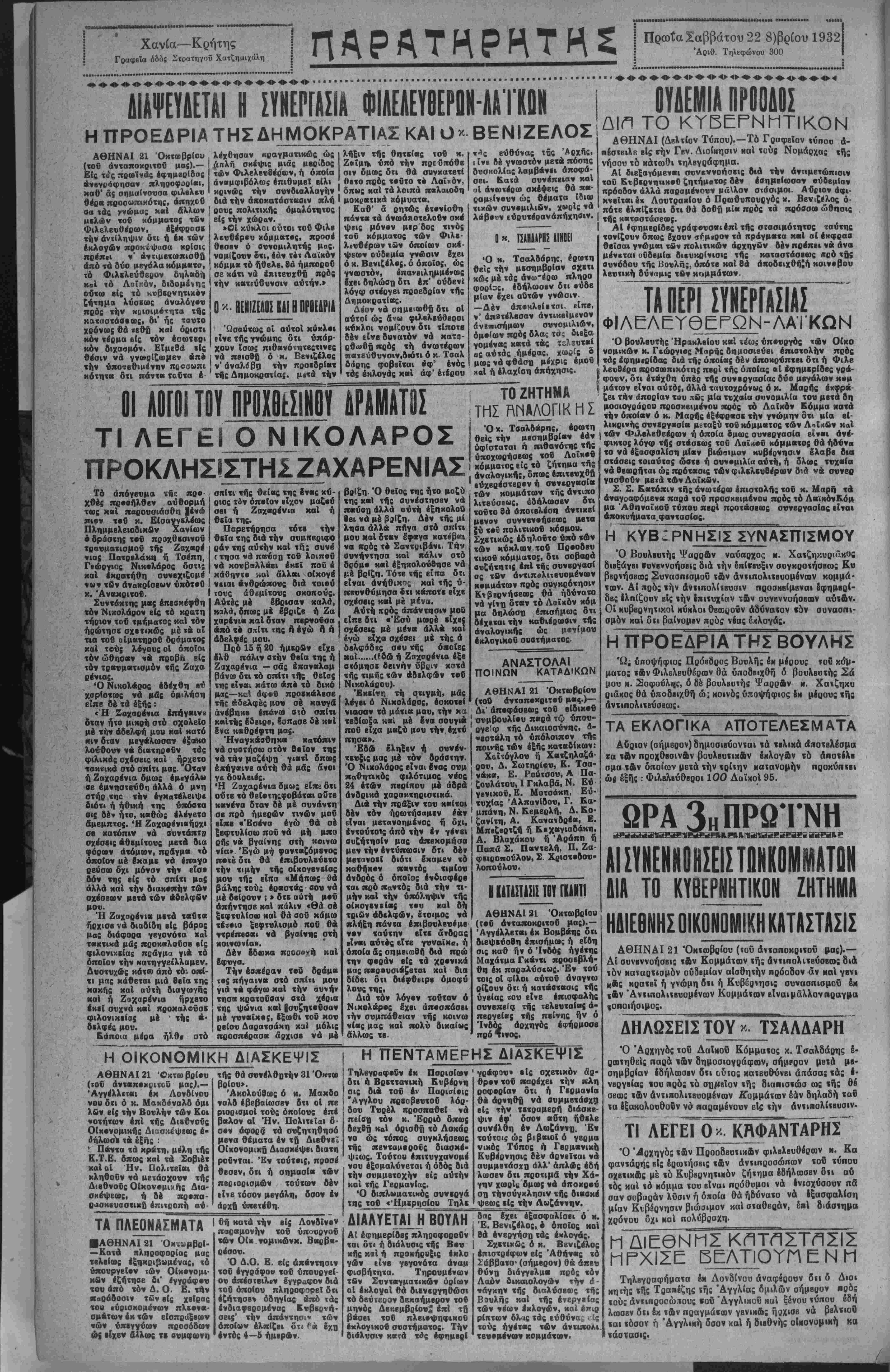 γών <1νβ γβγονότα άναμ φισβήιητα. Τηρουμένων τβν Συνταγματιχών όρίων αί εκλογαί θά δικνεργηθώσι τό δεύτεοον δεκαήμερον τοβ μηνός Δεκεμβριού* επί τή βάσει τοΰ πλβι·ψηφικοϋ έκλογικοΰ συστήματος. Την διάλυσιν κ«τά τάς έφημβρί δας έχβι έξασφαλίσβι ό κ. | Έ. Βενιζέλος, λ οποίος καί Ι Θά ενεργήση τάς εκλογάς. | Σχετικώς ό κ. Βενιζέλος λπιστρέφων είς Αθήναις τό Σάββατο» (σήμερον) θ« άπβυ θύνπ διάγγβλμβ πρός τόν Λαόν δικαιολογίαν την α¬ νάγκην τής διαλύσεως τής Βουλής χαί τής ενεργείας των νβ*ων έκλογών, καί έ~ιρ ρίπτων δλας τάς ευθύνας . ίς τούς ηγέτας των άντιποΑΐ τευ·μένων κομμάτων· Σ βΠ ΤΟ ΚΥΒΕΡΝΗΤΙΚΟΝ ΑΘΗΝΑΙ (Δελτίον Τύπου).—Τό Γραφείον τύηου α¬ πέστειλε βΐς την Γεν. Διοίκησιν ΜαΙ «ούί Νομάρχας «ής νήσου τό κάτωθι «ηλβγράφημα. ΑΙ διεξαγομένη συνεννοήσεως διά την αντιμετώπισιν τοΰ Κυβερνητικόν ζητήματο; δέν εσημείωσαν ουδεμίαν πρόοδον άλλά παοαμένουν μάλλον στάσιμοι. Αΰβιον αφι¬ κνείται έκ Λουτρακίου ό Πρωθυπουργός κ. Βενιζίλος ό πότε έλπίζκται δτι θά δοθή μί« πρός τα πρόβσω ώθησις τής καταστάσεως. ΑΙ Ιφημβρίδβς γράφβυσβι επί τής σϊασιμόιητος ταύτης τονίζουν όπως βχουν σήμερον τα πράγματα καί αί έκφραα θβίσαι γνωμαι τβν πολιτικών άρχηγών δέν πρέπει νά άνα μένεται οΰδβμία διευκρίνισις τής καταστάσεως «ςό τής αυνόδου τής Βονλης, όπότβ καί Θά άκοδβιχθή^ή κοινοβου λευτική δύναμις τβν κομμάτων. ΤΑ ΠΕΡΙΣΥΙΕΡ ΦΙΛΕΛΕΥΘΕΡΟΝ ίΛΣΙΑΣ -ΛΑΓΚΩΝ Ό βουλευτάς Ήρακλβίου κκΐ τέως ύπουργός των Οίχο νομικών κ. Γεώργιος Μαρής δημοσιβύβι επιστολήν πρός τάς εφημερίδας διά τής οποίας δέν άποκρύπτβι δτι ή Φιλβ λευθέρα προσωπικότης πβρί τής οποίας αί ίφημιρίδβς γρά- φουν, δτι έτάχθη υπέρ τής συνβργασίας δύο μεγάλων κομ μάτων είναι αύτός, άλλά ταυτοχρόνως ό κ. Μαρής έκφρά- ζει την απορίαν τού πβς μ(α τυχαία συνομιλΐα τού μβτά δή μοσιογράρου προσχειμένου πρός τό Λαϊκόν Κόμμα κατά την οποίαν ό κ. Μαρής εξέφρασε; την γνώμην δτι μία ει¬ λικρινός συνκργασίο» μεταξύ τοΰ κόμματος των Λοΐχβν κ οί των Φιλβλεθεέρων ή δποία ομως συνβργασία είναι άνέ- φικτος λόγφ τής στάσεως τοΰ Λαϊ«βΰ κόμμκτος θά ήδύνα το νά εξασφαλίση μίαν βιώσιμον κυβέρνησιν Ιλαββ δια στάσεις τοιαύτας ωστβ ή συνομιλία αυτή, ή δλως τυχαία νά Θβωρήται ώς πρότασις τώνφιλβλβυθβ'ρων διά νβ συνβρ γασθούν μβτά των ΛαΙχβν. Σ. Σ. Κατόπιν τής ανωτέρω έπιστολής τοΰ κ. Μαρή τα άναγοαφόμενα παρά τοϋ προσχειμένου πρός τό Λαϊκόν—όμ μα Άθηναϊκοΰ τύπον πβρί προτάσεως συνεργασίος είναι άποκυήματα.φαντασίας. Η ΚΥΒΈΡΝΗΣΙΣ ΣΥΝΑΣΠΙΣΜΟΥ Ό Βουλβυχής Ψαρρων ναύαρχσς κ. Χατζηκυριάχος διβξάγβι ·υνβννοήσΒΐς διά την επίτευξιν συγκροΐήσβως Ευ ββρνήσβως Συνασπισμοΰ τ. ώ ν άντιπολιχβυομένων κομμά¬ των. Αί πρός «ήν ανϊΐπολίϊΒυσιν προαΜ8(μβναι δφημβρί- 8βς Ιλπίζουν βΐς «ήν επιτυχίαν των ουνΒννοήαβων αύι&ν. Οί ΝυββρνητικοΙ Ηυπλοι θεωροΰν αδύνατον «5ν σηνασπι- σμόν καί διι βαίνομβν πρός νέας εκλογάς. Η ΠΡΟΕΔΡΙΑ ΤΗΣ ΒΟΫΛΗΣ Ώ; ΰποψήφιος Πρόβδρος Βουλής έκ μέρους «οθ κόν- ματος «Αν Φιλελευθέρων θά ύ/ΐοδβιχθή δ βουλβυτής Σά μου κ. Σοφούλης, δ δέ βουλβυΐήί ΨαρρΛν ν. Χαϊζηκυ ριακος θά ύποδειχθΐ) ώ; κοινός ύποψήφιος &η μίρους «ής άνχιηολΐτ,Βυσβως. ΤΑ ΕΚΛΟΓΙΚΑ ΑΠΟΤΕΛΕΣΜΑΤΑ Αυριον (σήμβρον) δημασΐΒυονιαι «ά «βλΐΝά τα «Αν προχθεσινόν βουλβυτικ&ν δκλογΛν «5 αποτίλβ σμα «&ν οποίων μεχά «ήν «ρίιην κατανομήν προκύπ«βι ώί εξής : ΦιλβλϊύθΒθοι 100 ΔαΐχοΙ 95. ΑΙΣΥΝΕΝΝΟΗΣΕΙΣΤΩΚΚΟΜΜΑΤΩΝ ΔΙΑ ΤΟ ΚΥΒΕΡΝΗΤΙΚΟΝ ΖΗΤΗΜΑ ΗΑΙΕ8ΝΗΣ ΟΙΚΟΝΟΜΙΚΗ ΚΑΤΑΣΤΑΣΙΣ ΑΘΗΝΑΙ 21 Όκ«ωβρ