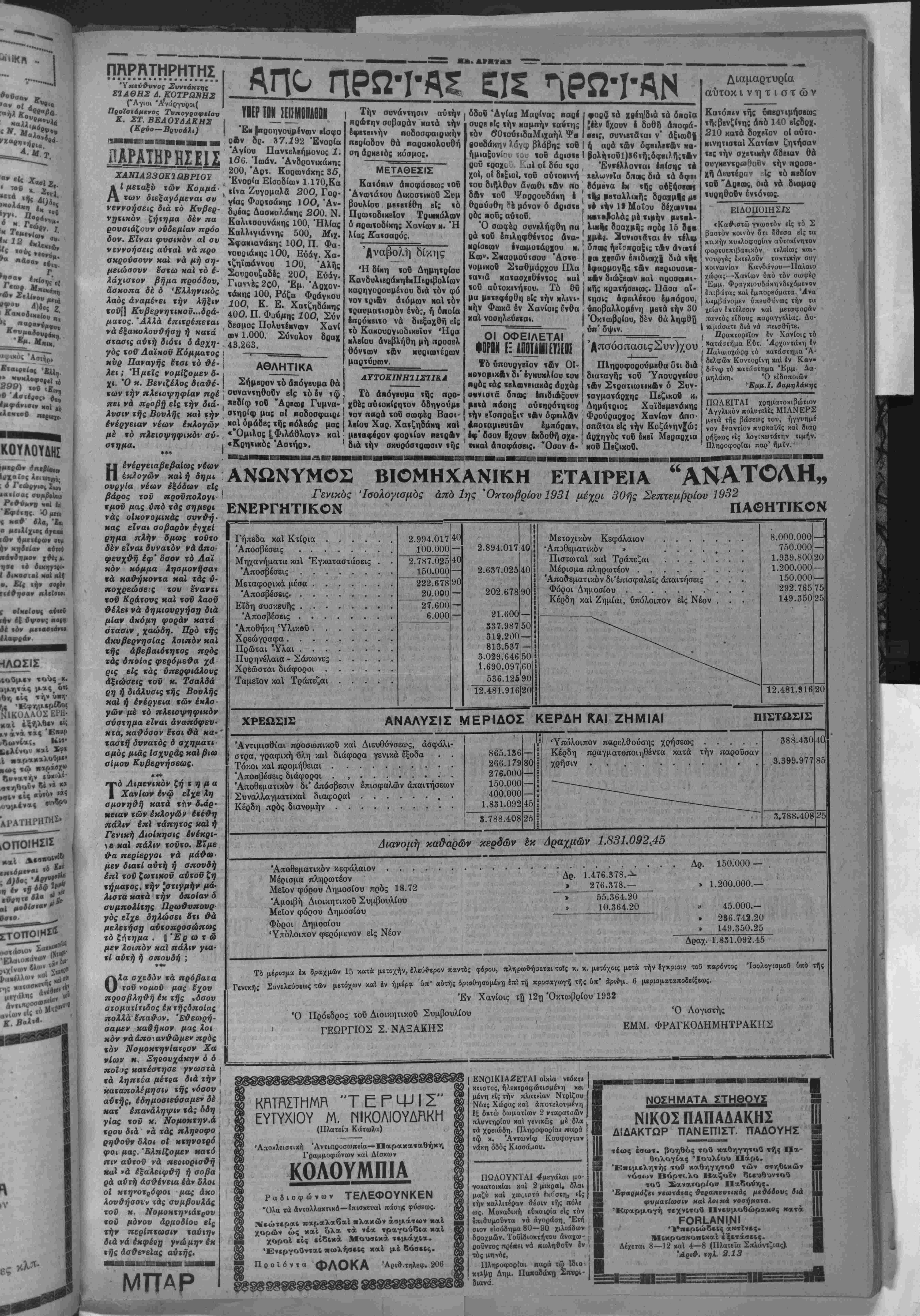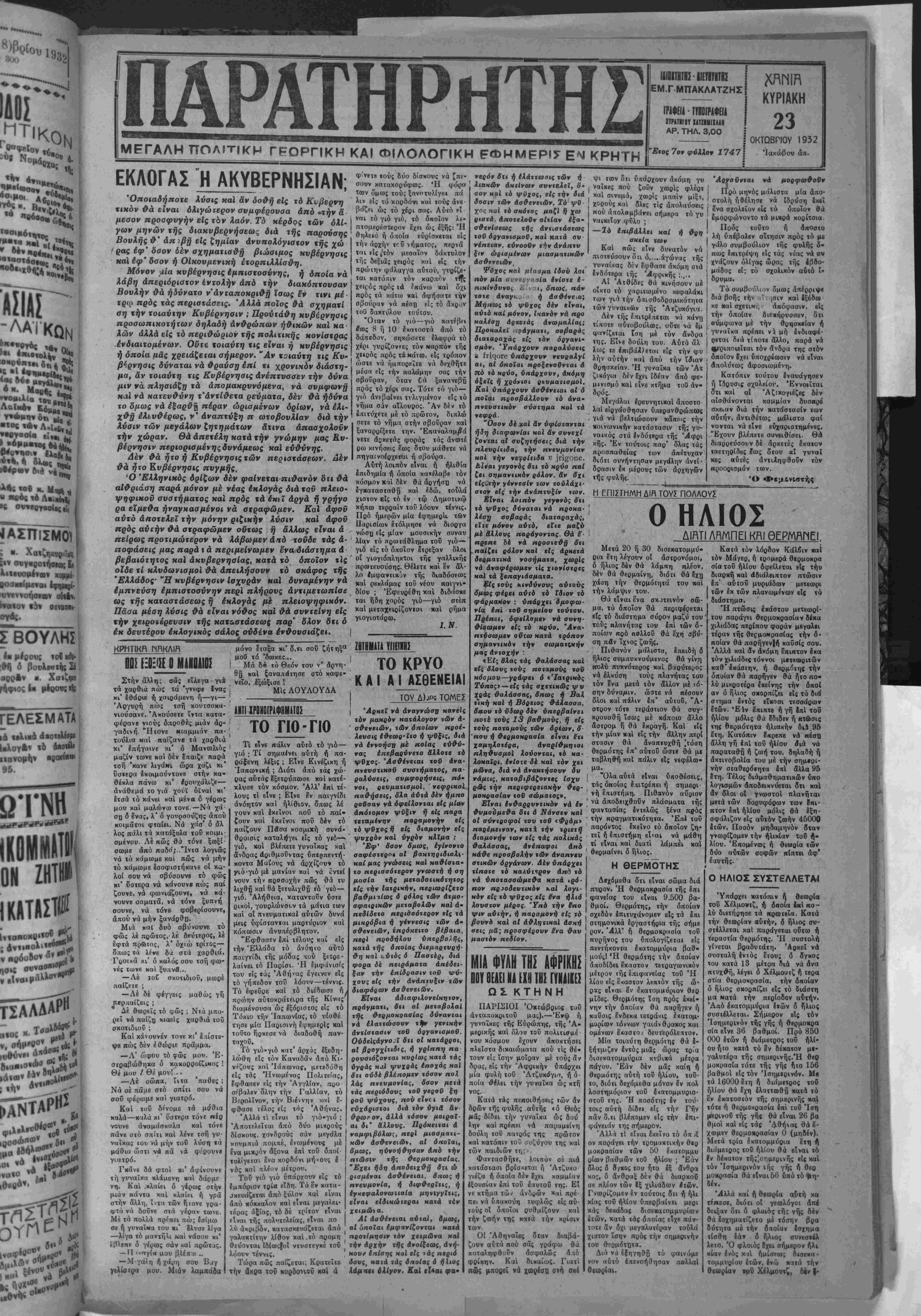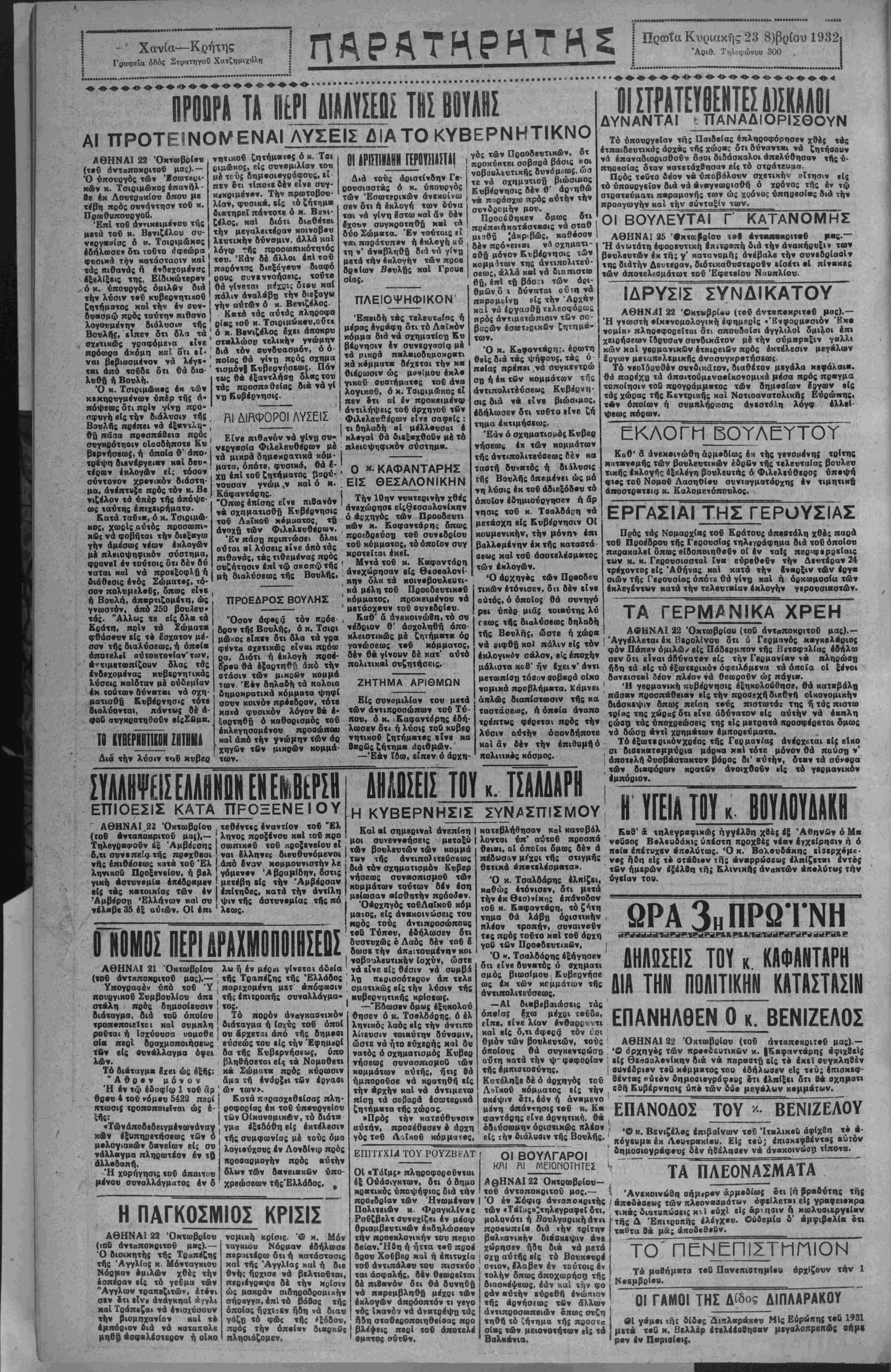 ΕΠ1ΤΓΧΙ4 ΤΟΥ ΡΟΥΖΒί<ΛΤ ΟΙ «Τάϊμς» πληροφοροδνται έξ Ονάθιγκτων, δτι ό δημο κρατικός ύποψήφιος διά την προεδρίαν των Ήνωμένων Πολιτβιών κ. Φραγκλϊνες Ροδζββλτ συνεχίζβι έν μέσω Οριαμβευτικών έκδηλώσεων την προβκλογικήν τού περιο δείαν.'Ηδη ή ήττα τοΰ προέ δρου Χο€ββρ χαί ή έπιτυχία τοδ αντίπαλον τού πιστβύο ται άσφαλής, δέν Οβωρβΐται δέ πιθανόν δτι Οά δννηθή νά παρεμβλήθη μέχρι των έκλογών άπρόοπτόν τι γεγο νός Ικανόν νά ανατρέψη τάς ήδη σταθβροποιηθβίβας προ βλέψκις πβρΐ τοΰ άποτβλέ οματος σύτβν. ΑΗΛϋΣΕΙΣ ΤΟΥ κ ΚΑΦΑΝΤΑΡΗ ΔΙΑ ΤΗΝ ΠΟΛΙΤΙΚΗΝ ΚΑΤΑΣΤΑΣΙΝ ΕΠΑΝΗΛΘΕΝ Ο κ. ΒΕΝΙΖΕΛΟΣ ΑΘΗΝΑΙ 22 Όκτωβρίου (τοΰ άνταποκριτοΰ μας).— ·© όρχηγας των προοδευτικήν κ. |Κ«φηντ«ρης αφιχθείς είς Θεσσαλονίκην διά νά πορβατη είς τό ίκεΐ αυγκληθέν συνέδριον τοδ κσμμκτοςτου εδήλωσεν είς τεύ; έπισκεφ- θέντας ούτον δημοαΐφγρόφευς ότι ιλπΐξει δτι θά αχηματι οθί. Κυβέρνησις υπο των δύο μεγάλων κομμάτων. ΕΠΑΝΟΔΟΣ ΤΟΥ *■ ΒΕΝΙΖΕΛΟΥ ' Ό κ. Βκνιζέλος έπιβαίνων τοΰ "Ιταλικού αφιχθη τό ά- ________________ πόγευμ» έκ Λουτρακίου. Είς τού; ίπισκεφθ.ντβς «υτόν ΟΙ ΒΟΥΛΓΑΡΟΙ δημοοιογράφους δίν ήθέλησεν νά άναχοιναίοη τίποτα. κη' λ!-^-0ΤΒΗ7Σ ' ΤΑ ΠΛΕΟΝΑΣΜΑΤΑ ΑΘΗΝΑΙ 22 Οκτρωββίου— ____________ τοδ άντοποκριτοΰ μας.— *, ·Ανεκοινώθη σήμερον αρμοδίως 2τι (ή βραδύτης της Ό έν Σόφια ανταποκριτάς ι βπ»δ·σεως των πλβονααμάτων όφεΐλετβι είς γροιαειοκρα των «Τβϊΐίς»;τηλβγραφβΙ δτι, τικάε διατυπώαει; κ^ί ουχί είς άρνησιν ή κωλναιεργείαν —·—"-■·-—·■■- ·· Οώδεμία δ' άμφιβολία ότι μολονότι ή Βουλγαρική άντι προσωπεία διά την τρίτην βαλκανικήν διάσκεψιν άνε χώρησβν ήδτ) διά νά μετά οχη αυτής βίς τό Βουκουρέ τής Δ Έκιτροπης ελέγχου. ταϋ*τα θά μά; άποδεθοΰν. ΤΟ ΠΕΝΕΠΙΣΤΜΠΙΟΝ ^^^ωρ&,ΙΙ; „ Ι» διασκέψεως, εάν καί την φο Νοκμβρ»·» ϊίΓίίΧ·^·«/«?»:! ΟΙ ΓΑΜΟΙ ΤΗΣ Δίδος ΑΙΠΛΑΡΑΚΟΥ άντιπροσωπβιών δπως συζη τηθή τό ζήτημα τής προστα οίας των μειονοτήτων είς τα Βαλκ«νια. 01 γίμβι τής δίδος Δικλβρακου Μ.ς Εύρώηης τού 1931 μετά τβΰ χ. Βελλβρ ετελείωσαν μεγαλοπρεπώς βήμ· ρον έν Π·ρια(·ΐ{.