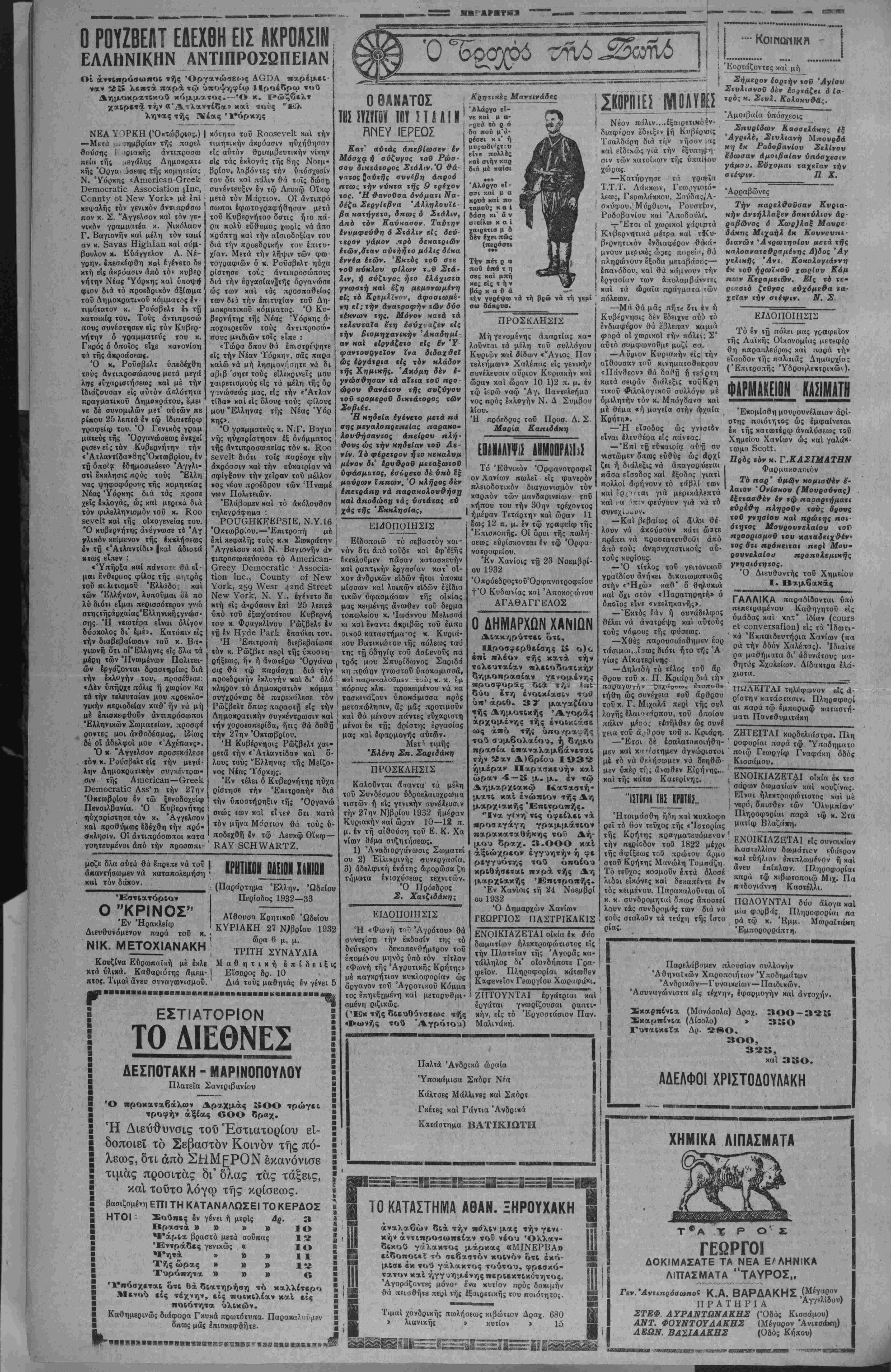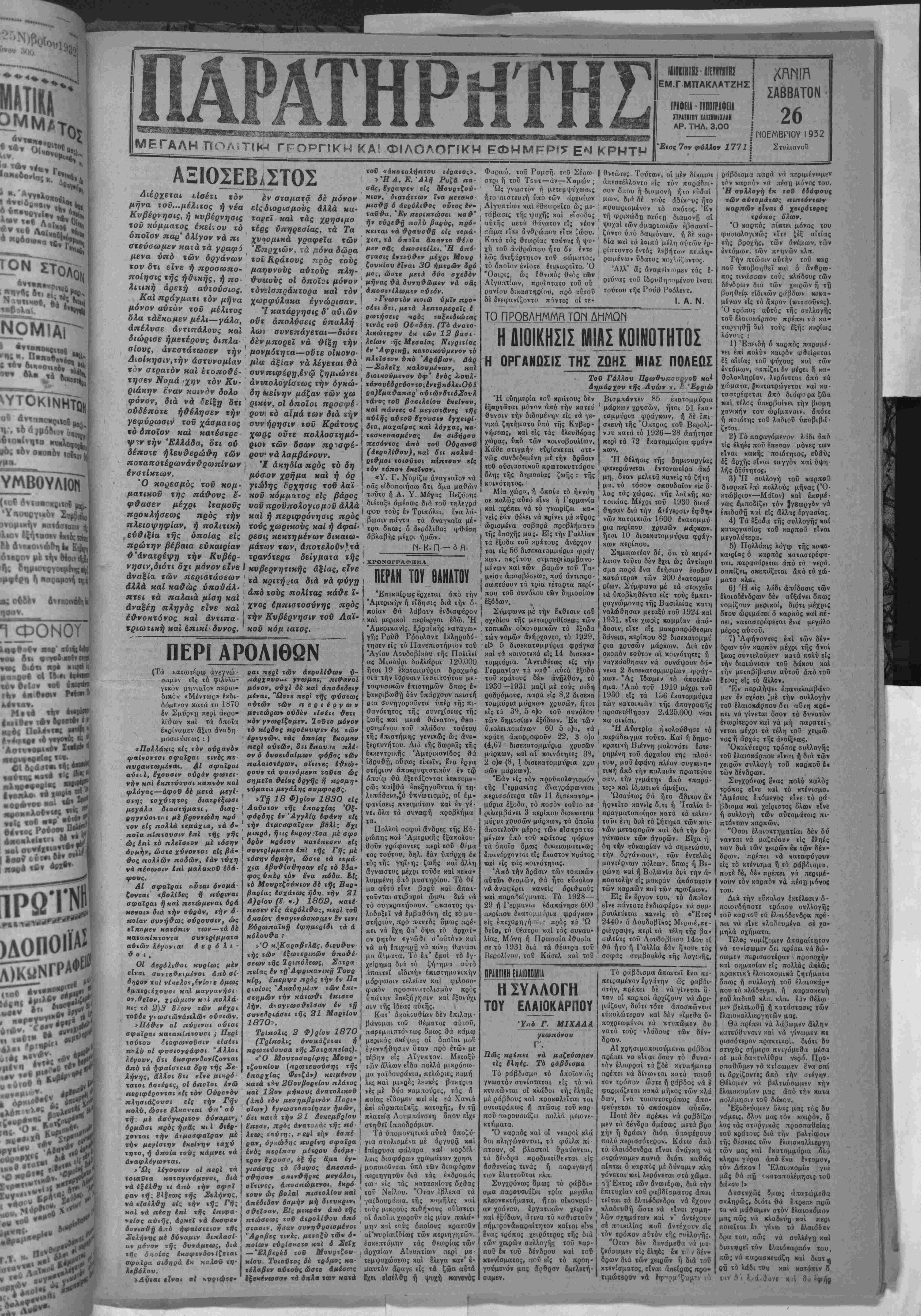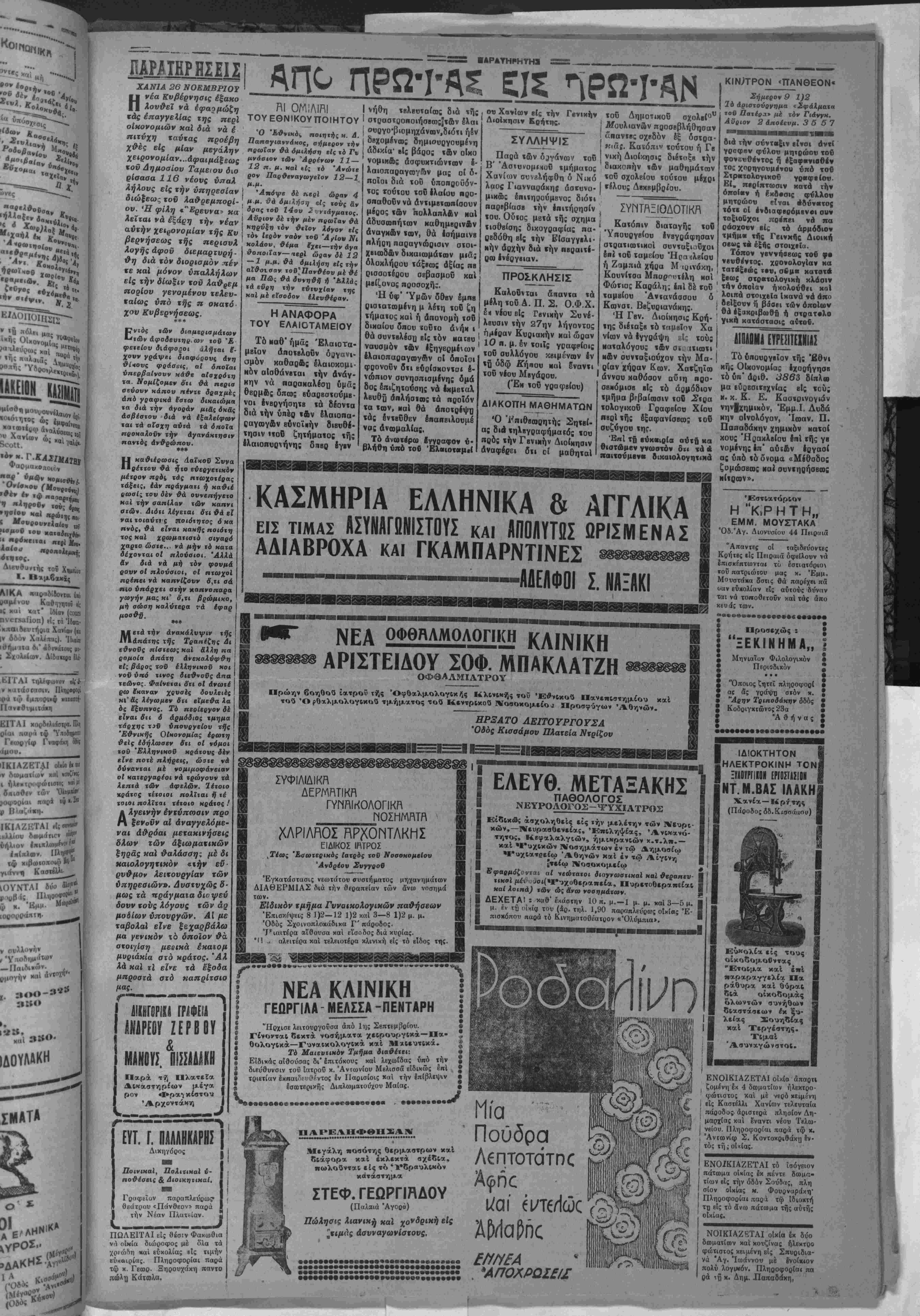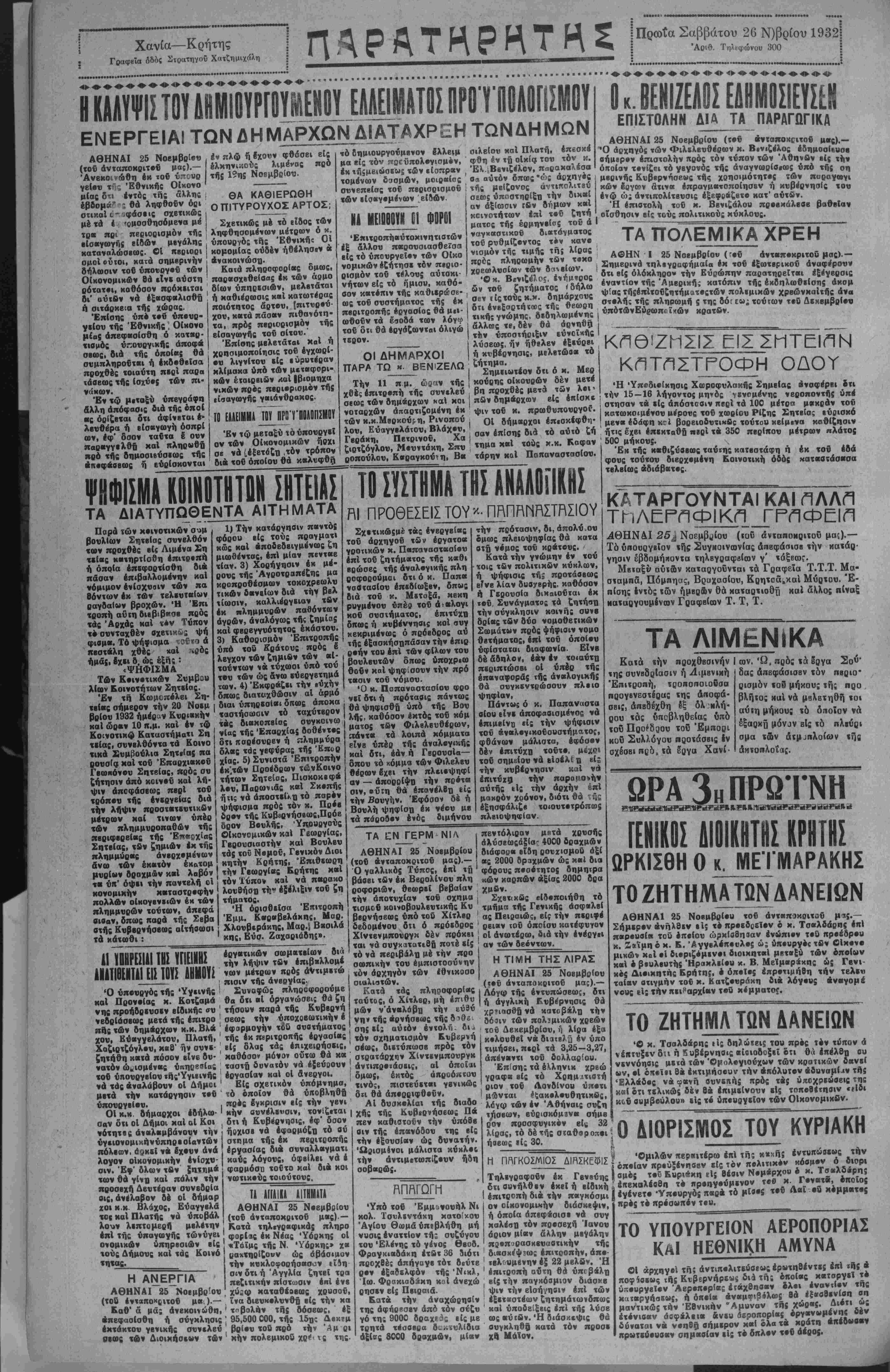 κήν πολεμιχοΰ χρ<* ς της. πρός τόν στρατάρχην Χίντενμπουργκ άντιπρβϊάσεις, αί οποίαι δμως, έκτός άπροό«του τινός, πιστεύετνι γενικώς δτι θά άπορρΐφθοΰν. ΑΙ δυσχολίαι τής διαδο χής τής Κυβερνήσεως Πά πεν καθιβτοΰν την ύπόθε β ιν τής έπανόδου της βίς την εξουσίαν ώς δυνατήν. Ώοισμένοι μάλιστα κύχλοι την άντιμβτωπίζβυν ήδη σοβαρώς. πεντόλιραν μβτά χρνσής άλύσβωςάξία- 4000 δραχμών διάφορβ βϊδη ρουχισμοϋ άξί αίς 2000 δραχμών ώς χβιΐ δια φόρους ποσέΐητος δήμητρα κων καρπών άξίσς 2000 δρα χμδν. Σχβτιχδς βίδοποιήθη τό τμήμα τής Γενιχής ασφβλβί άς Πειραιώς, εί; την περιφβ* ρειαν τοΰ οποίον κατέφυγον οί ανωτέρω, διά την ίνέργεΐ αν των δεόντων. Η ΤΙΜΗ ΤΗΣ ΛΙΡΑΣ ΑΘΗΝΑΙ 25 ΝοβμβρΙου (τοϋ άνταποκριτοΰ μας).— Λόγω Τής έντυπώσεω;, δτι ή αγγλικη Κυβέρνησις θά χρ?ιασθή νά καταβάλη την δόαιν Των πολΐμικών χρεών τοΰ Δεχεμβρίον. ή λίρα έξα κολονθεΐ νά διατβ^ϋ έν υπο τιμήσει, περΐ τα 3,25—3,27, άπένβντι τοΰ δολλαρίου. Έπίση; τα έλληνικ χρβώ γραφβ είς τό Χρημιτιβτή ριον τον Λονδίνου ύπ·τι μώνται έςακολουθητικβς, λόγφ των έν Αθήναις σνζη τ-ήσεων, βύρισκόμβνει σήμβ ρον προσφνγικόν είς 32 λίρας, τό δέ τής σ<αθβροπ·ι ήβεως ιίς 30. Ή Ύπβδιβίκησις Χοοροφνλακής Σημείας άνσφέρβι ότι την 15—16 λήγοντος μητός γενομένης νεροποντής ύπί στησαν τα είς άηόστοβιν πβρί τα 100 με*τοα μακράν τοΰ χατωχοιμένου μ^ρονς τοΰ χωρίου Ρίζης Σητβίσς εύοισκό μενά έδάφη κγΙ βορειοδυτικ&ς τούτου κείμινα καθίζηοιν ήτις εχει έπεκταθή πβρι τα 350 περίπου μέτρων πλάτος 500 μήχους. Έκ τής καθιζύαβως ταύτης κατβστάφη ή έκ τοΰ εδά φους τούτου διερχομένη Κοινοτική όδός «ατβσϊάσασα τελείως άδιάβατβς. ΚΑΤΑΡΓΟΥΝΤΑΙ ΚΑΙ ΠΛΛ" ΤΙίΛΕΡγΊΦΙΚγΊ ΓΡΠΦΕΙΠ ΑΘΗΝΑΙ 25^ Νοεμβριού (ίοΰ ανταηοΗρΐτοϋ μα{)·— Τό ύηουργιΐον τής ΣυγΜοινωνίας αηβφάσισβ την κατάρ¬ γησιν εβδομήκοντα τηλεγραφβίων γ' τάξβωί. Μβιαξύ αύΐων καταργοΰνται τα Γραφεϊα Τ.Τ.Τ. Μα¬ σταμπά, Πόμηηας, Βραχασίου, Ερητσά.καΙ Μύρτου. Έ- π.σης Ιντός ΐών ήμερ&ν θά καταρτισθή καί ά~λλος πίναξ Ναταργουμίναν Γραφείων Τ. Τ, Τ. ΤΑ ΛΙΜ.ΝιΚΑ Εατά την προχθβσινήν Ι ών. Ώ, ηρός τα §ργα Σού*' δ της συνβδρΐασιν ή Λιμβνική Έπιτροπή, τροποηοίθδσα προγβνεστίρας της άποφά- σΒΐς, απεδέχθη δ| δλ Ηλή>