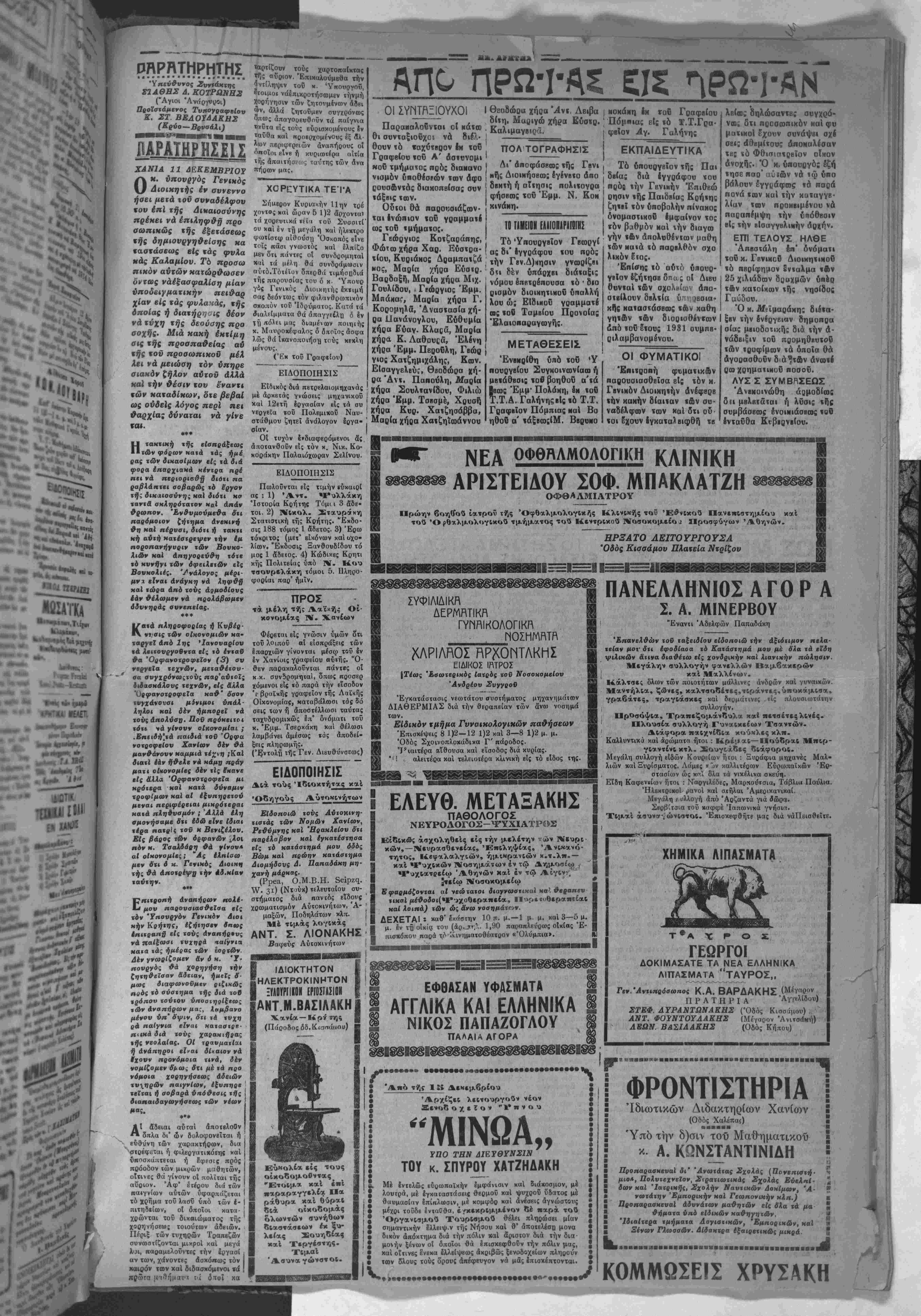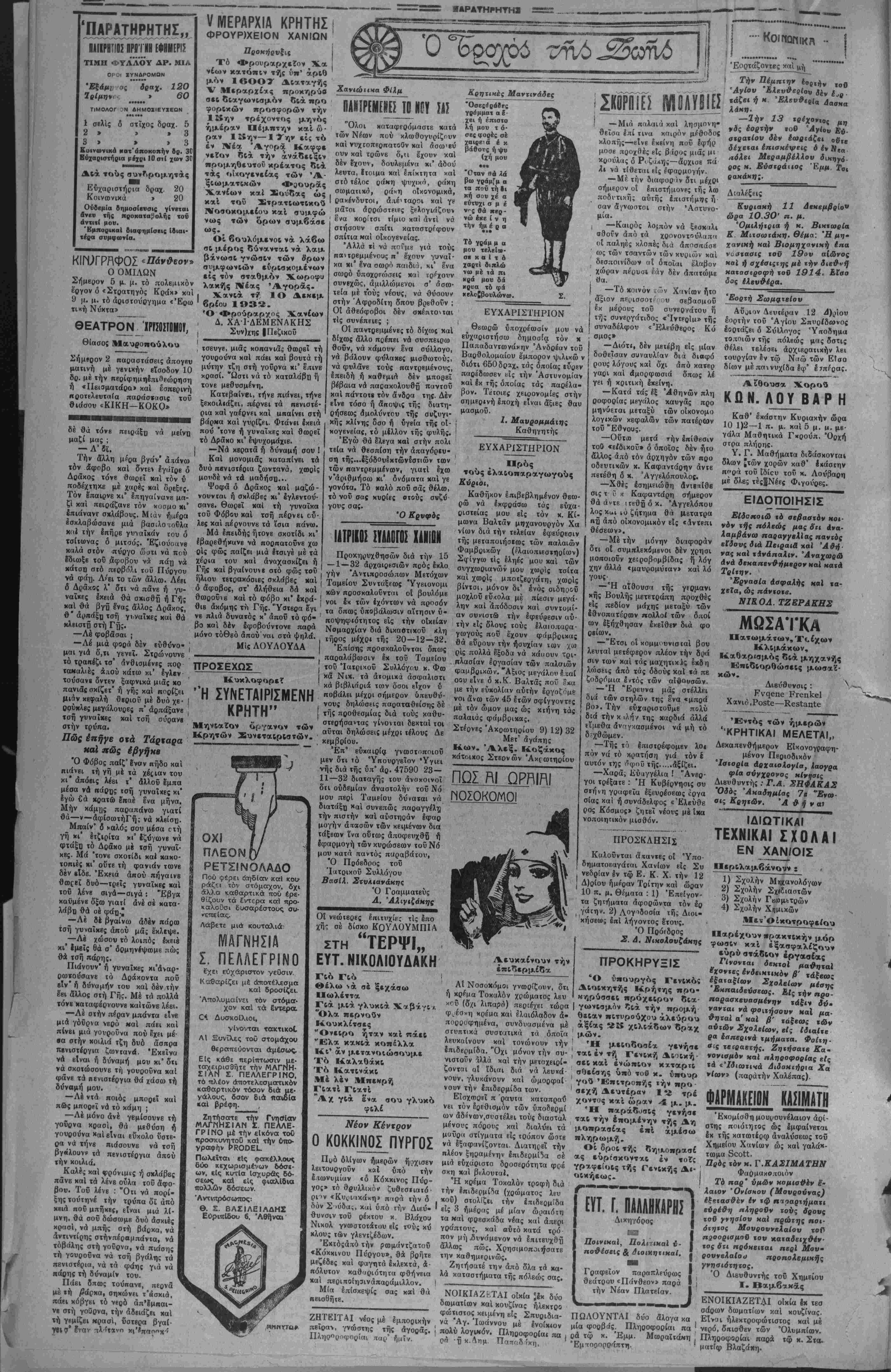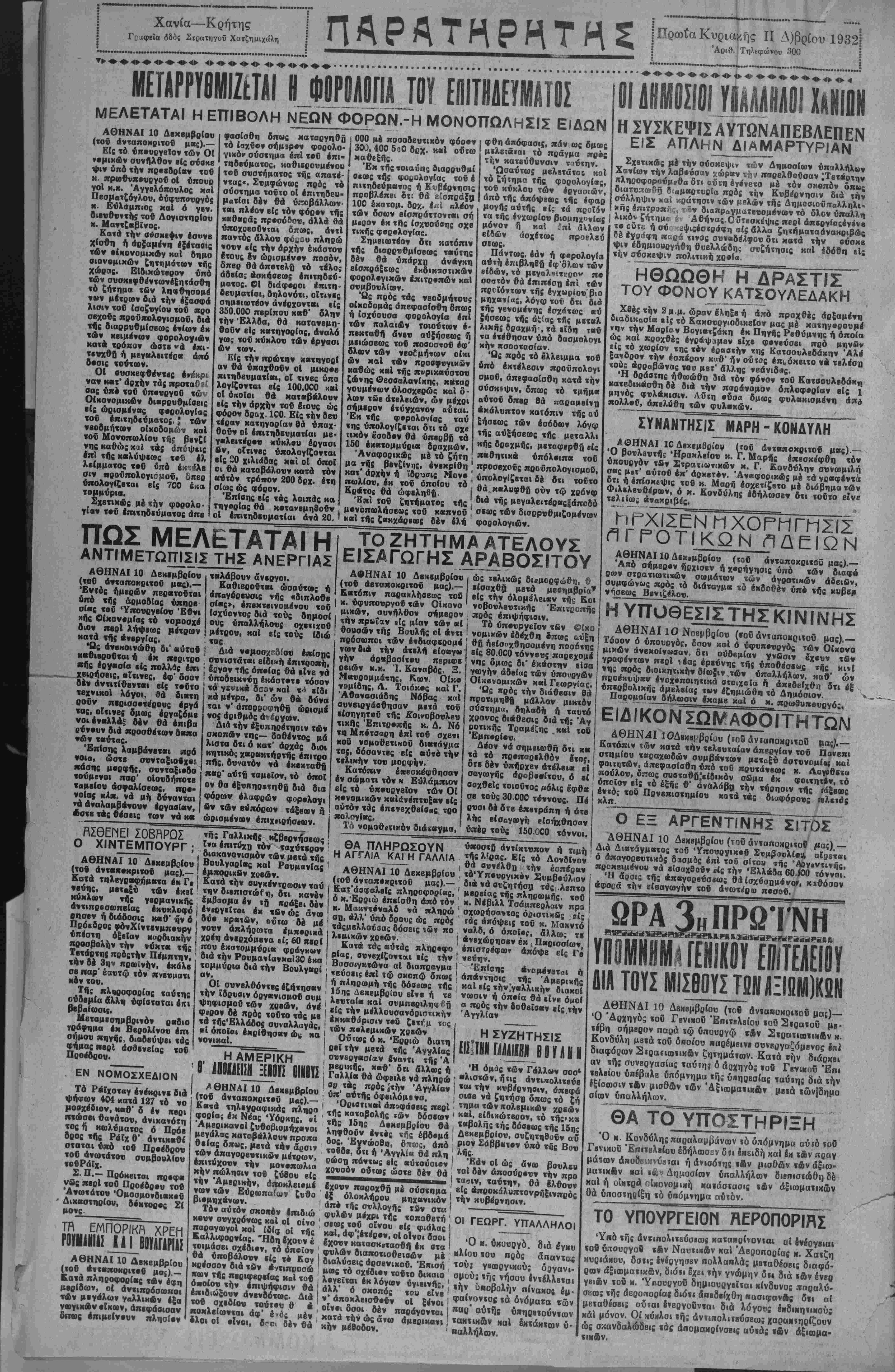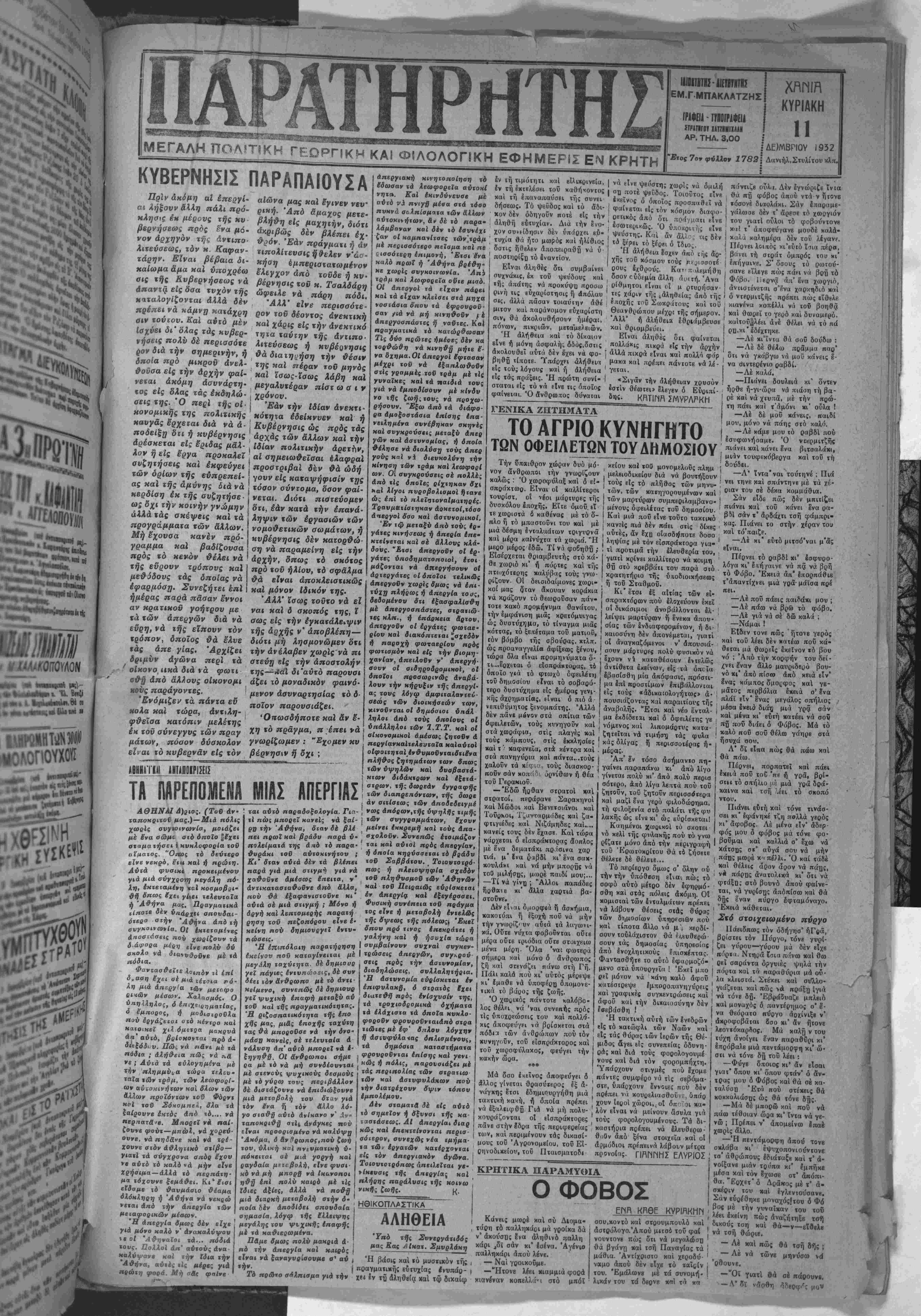 ϊ' ΜΕΓΑΛΗΠΟΑ'ΤΙΚΗ ΓΕΟΡΠΚΗ ΚΑΙ ΦΙΛΟΛΟΠΚΗ ΕΦΗΜΕΡΙΣ ΕΝ ΚΡΗΤΗ ΙΙΙΟΙΓίίΙΜΙίΝΠίΚ ΕΜ.ΓΜΠΑΚΛΑΤΖΗΣ Κγρ|ΑΚΗ 11 {ΔΕ)ΜΒΡΙΟΥ 1932 'Ετος 7ον φύλλον 1782 Δανιήλ,Στυλίτου κλπ. ίΡΑΦΕΙΑ-ϊΠΙΟίΡΑΦΕΙΙ ΣΤΡϋΊΓΟΥ Ι1ΤΖΙΜΙΧΛΑΙ ΑΡ. ΤΗΑ. 3,00 ΚΥΒΕΡΝΗΣΙΣ ΠΑΡΑΠΑΙΟΥΣΑ Πρίν άκόμη αί έπεργί· αι λήξουν ά'λλη πάλι πρό¬ κλησις εκ μέρονς τής κυ βερνήσεως πρός έ'να μό¬ νον αρχηγόν τήί, άνχιηο- λιχεύοεως, τόν κ. Καφαν¬ τάρης. Είναι βεβαία δι¬ καίω μα ά'μα «α. ύποχρέω σις τής Κυβερνήσεως νά άπαν τί} είς δα α τυχόν τής Ηΐταλογίζονται άλλά δέν πρέπει νά κάμνη καχάχρη σιν χούΐου. Καί αντό μέν Ιαχύει δι* όλας τάς κυβερ- νήοεις πολύ δέ περισσόχε ρον διά την σημερινήν, ή όποία πρό μικρόν άνελ· &οΰσα είς την αρχήν φαί- νεχαι άκόμη άουνάρτη- %ος είς όλας τάς έκδνλώ- αεις της. Ό περϊ τής οί· κονομικής της πολιτικής Ηανγάς άρχεται διά νά ά- ποόείξτ] διι ή κυβέρνησις άρέακεται είς έριδος μάλ¬ λον η είς 8ργα προκαλεΐ σνζηιήαεις καϊ έκφεύγει των όρίων «ής εύπρεπεί- άς καϊ τής αμύνης διά νά κερδίση ε» τής συζητήσε¬ ως δχι την ποινήν γνώμην άλλά τάς σκέψεις καϊ τα ηρογράμματα των άλλων. Μή έχουσα κανέν πρό- γραμμα καϊ βαδίζουσα πρός «ό κενόν θέλει νά τής εύρουν τρόπονς κα μεΰ'όδονς τάς οποίας νά εφαρμόση. Συνεζήτει επί ημέρας παρά πασάν 'έννοι αν κρατικοϋ γόητρον με χά των άπεργών διά νά εΰρη, νά ΐης είπουν χον χρόπον, οποίος θά έλυε κάς άπε γίας. Άρχίζει δριμύν άγώνα περϊ χά ' οίκον ο ιικά διά »ά φωτι σθή άπό αλλους οικον ο μι Ηθϋς παράγονχες. Ένόμιζεν τα πάντα εϋ κολα «αί χώρα, άνχ%λη~ φ&εϊαα κατόπιν μελέχης έκ τού σύνεγγυς των πραγ μαΐων, πόσον δύσκολον είναι τό κυβερνάν είς χον αΐώνα μας καϊ έγινεν νευ' ρική. Άπό άμαχος μετα¬ βληθή είς μαχηχήν, διότι ακριβώς δέν βλέπει έχ· &ρόν. Εάν πράγματι ή άν τιπολίτευσις ήθελεν ν'άσ- κήση έμπερισναχωμένον έλεγχον άπό τούδε ή κυ¬ βέρνησις χοϋ κ. Τσαλδάρη ώφειλε νά πάρη πόδι. Άλλ' είνε περισσότε¬ ρον τοΰ δέοντος άνεκχική καϊ χάρις είς την άνεκτικό χητα ταύτην τής αντιπο¬ λιτεύσεως ή κνβέονησις θά διατηρήση την θέσιν της καϊ πέραν τοΰ μηνός καϊ ϊσως-'ίσως λάβη καϊ μεγαλυχέραν πίστ ώσιν χρόνον. "Εάν *ην Ιδίαν άνεκχι- κόχηχα έδεΐηνυεν καϊ ή . Κυβέρνησις ώς πρός τάς , αρχάς των άλλων καϊ την Ι ιδίαν πολιτικην αρετήν, αί σημειωθεΐσαι έλαφραϊ προσίριβαι δέν θά ώδή γουν είς καχαψήφιαίν της Ι τόσο» σύντομα, όσον φαί- νεται. Διότι πιστεύομεν ότι, εάν κατά την επανά¬ ληψιν των εργασιών των νομοθετικών σωμάτων, ή κυβέρνησις δέν κατορθώ¬ ση νά παραμείνη είς την 1 αρχήν, όπως τό σκότος πρό τοΰ ηλίου, τό αφάλμα θά είναι αποκλειστικώς καϊ μόνον Ιδικόν της. Άλλ' ΐσως τούτο νά εί ναι καϊ δ ακοπός της, Χ σως εις χήν εγκατάλειψιν τής άρχής ν' αποβλέπη— διότι μή λη σμόν ώ μέν ότι την άν έλαβεν χωρϊς νά πι στεύτ) είς την αποστολήν της—»ία*1 δι'αύτό παρονσι άζει τό μοναδικόν φαινό¬ μενον άαυναρτησίας τό δ- ποίον παρουσιάξει. Όπωσδήποτε καϊ άν έ¬ χη τό πραγμα, π έπει νά γνωρίζωμεν : "Εχομεν κυ βέρνησιν η όχι ; ΑΒΗΗΑΊ'ΚΜ ΑΝΤΑΠΟΙΡΙ—ΕΙΣ ΤΑ ΙΙΑΡΕΠΟΜΕΙ,Α ΜΙΑΣ ΑΠΕΡΓΙΑΣ ΑΘΗΝΑΙ Δ)βιος. (Τοΰ άν ταποκρίτο* μας.)—Μιά πόλις χωοίς σνγχοινωνΐα, μοιάζει μέ ένα οώμο σΐό δποΐο |έχει σταμα τήσβι 4 κνκλοφορία τού αΐματος. "θΛθς τό δευτέρα ΒΪνε νεκρά, ΙΓΐιι καί ή πρώιη. Αύτά φυαικΐ προκειμένον νιά μιά αύγχροιη μεγάλη πό- η, έκτεταμένη καϊ κοομοβαι· φή όπως έχει ν/·βι τελευταία ή Άθήνα μας. Πραγματικά ί(αοί8 δέν ύηάρχίΐ αηονδαι- ότεαο Οτήν Ά#ήνα άπό ΐή ανγκοινω*ία. Οί Ικτεταμένες Αηοσιάσεις ηού χωρίζουν τα δ άφορα μέρη εΙνε πολύ δύ οκολο νά όΊαν