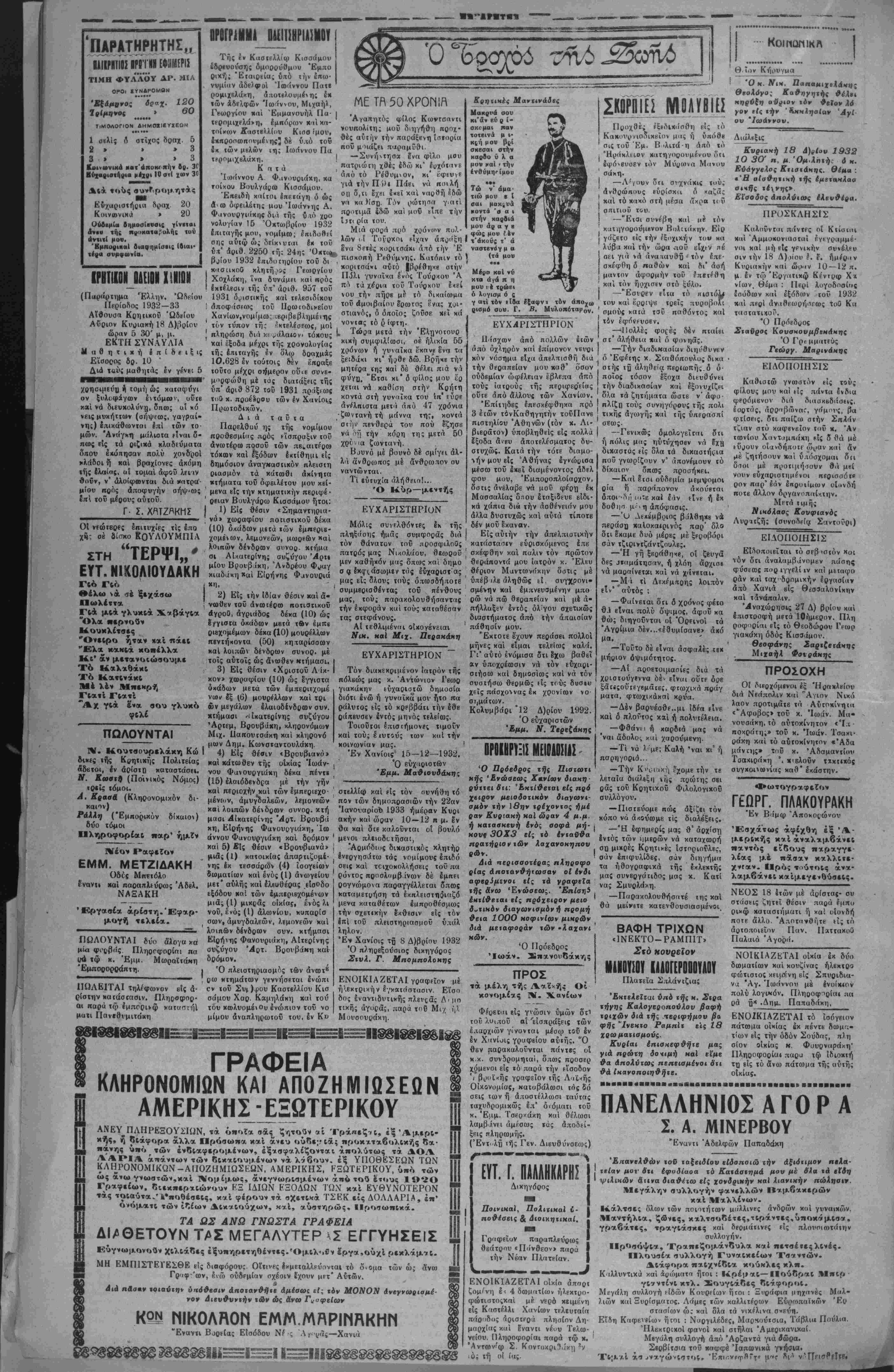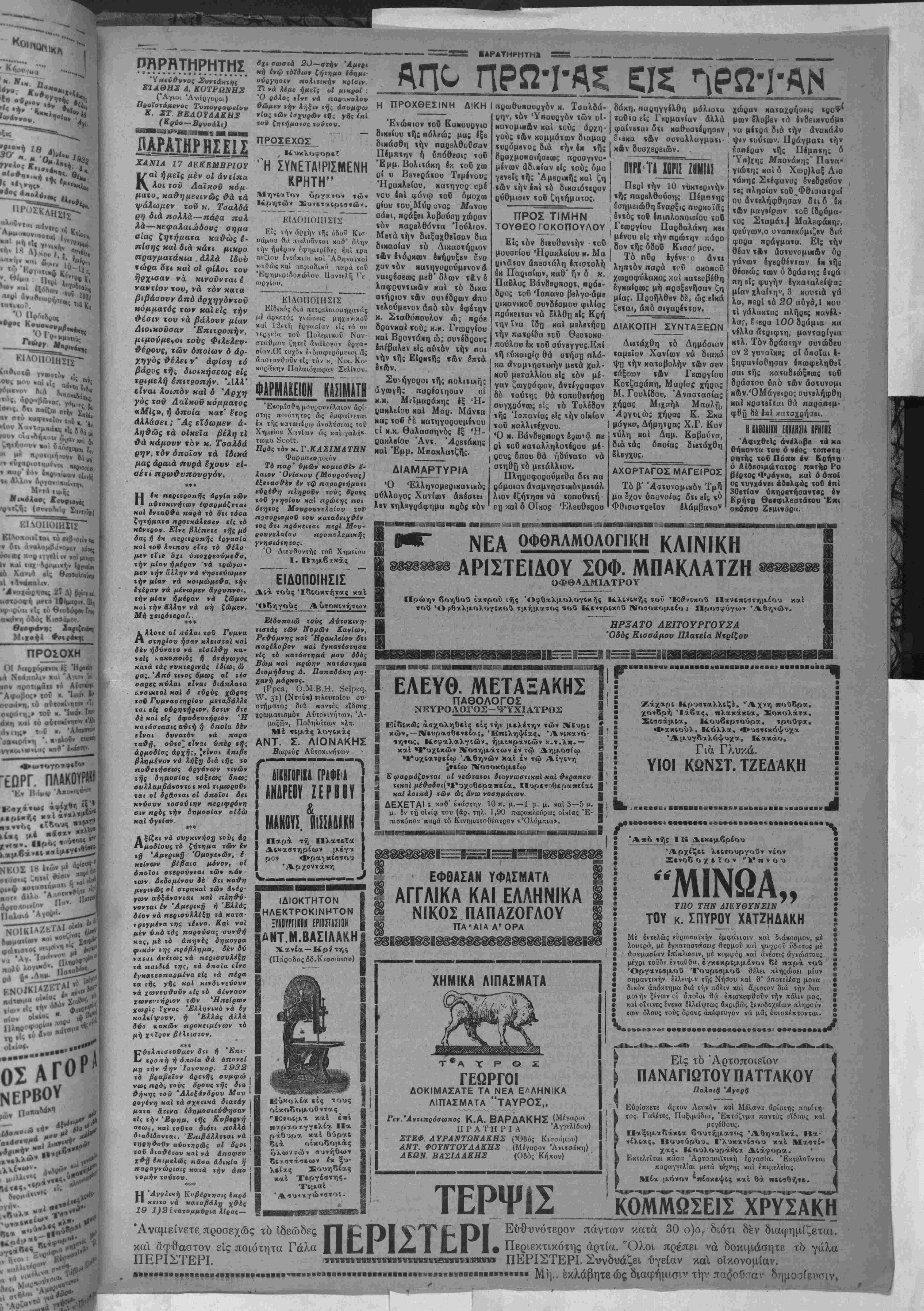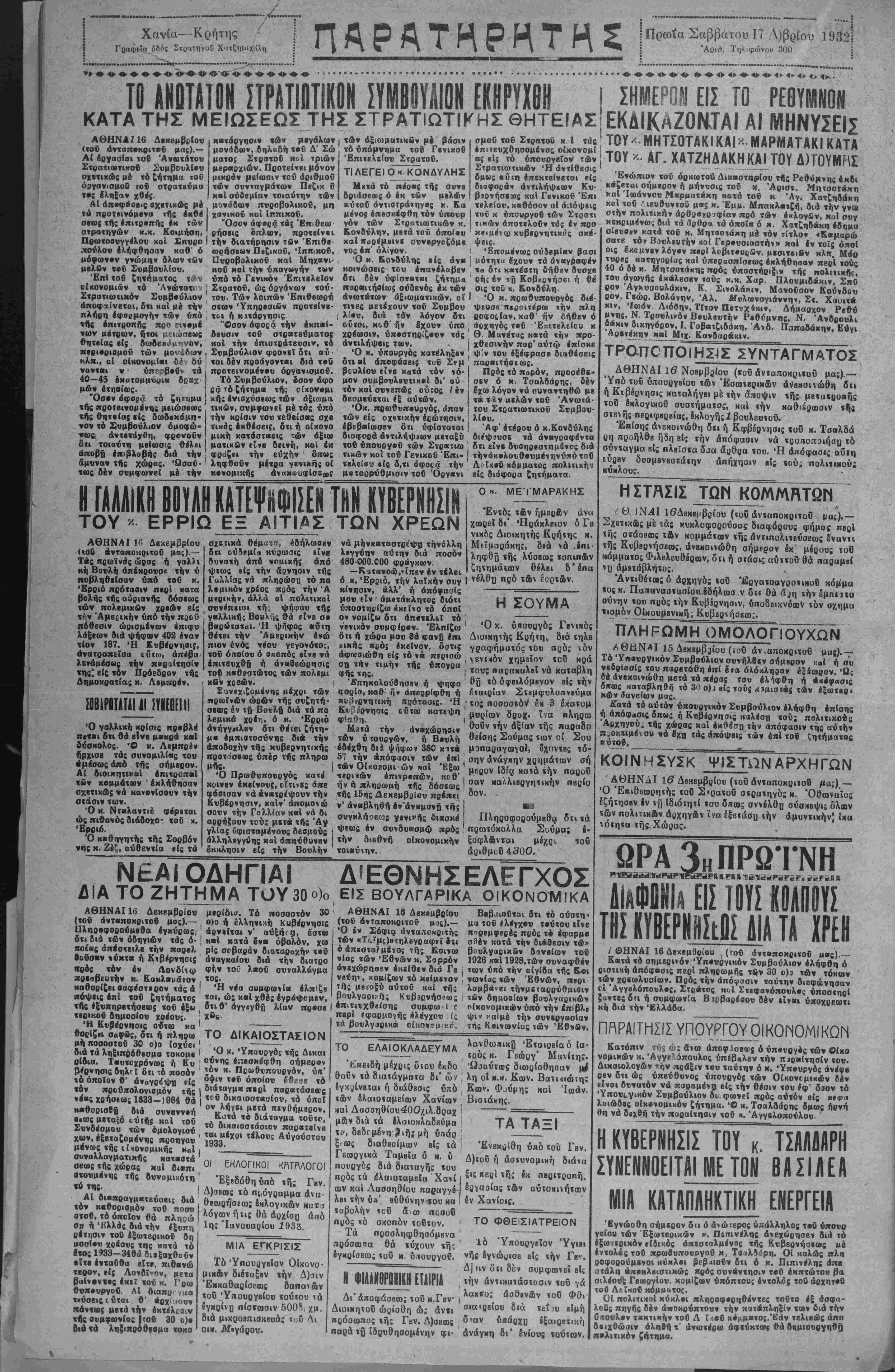θβ(ση; Σούμας <ων οί 2ου μοπαοαγωγο·, βχοντβς τό- ( σην ανάγκην χοημάιων σή μερον Ιδία καιά «ήν παροΰ | σαν ΗαλλιβργηΐΐΜήν πβςίο δόν. . «1111 Πληροφορούμεθα δτι τα πρωτόχολλα Σούμας ■- ξοφλανται άο.θμυΰ 43θΟ. ΝΕΑΙ ΟΔΗΓΙΑΙ ΔΙΑ ΤΟ ΖΗΤΗΜΑ ΤΟΥ30ο)ο ΔΈΘΝΗΣΕΛΕΓΧΟΣ ΕΙΣ ΒΟΥΛΓΑΡΙΚΑ ΟΙΚΟΝΟΜΙΚΑ ΑΘΗΝΑΙ 16 Δβκβμβο.ον (τοΰ άνταποκοιτοΰ μσς).— Πληο·φορούμβθα εγκύρως, δτι διά των όδηγιων τάς ο¬ ποίας απέστειλε την παρβλ βοΰσαν νύκτα ή Κυβέρνησις κρός «όν έν Λονδίνω ίτρΐσβευτήν κ. Κακλαμά'βον καθορίζβι βαφέστερον τάς ά πόψιις έηί «ου ζητήματος «ής ·ξνπηρβτήσβως τοΰ έξω τερικοΰ δημοσίου χοέΌυς. Ή Κυβέρνησις οΰτω κα θορ(ζ·ι σαφδς, δτι ή πληρω μη ποσοστοΰ 30 ο)α ίσχύει διά τα ληξιπρόθεσμα τοκομβ ρίδια. Ταυτοχρόνως ή Κυ βέρνησις δηλίϊ ότι τό ποσόν «ό οποίον θ' άναγράψη είς νόν προϋπολογισμόν τής ν<«ς χρήσεως 1833—1984 θά κβθορισδή διά συνβννβή α·ως μΐταξό (.ύΐής καΐ τθΰ Συνδεσμου των όμολογιού χων, έξβταζομένης προηγου μένοος τής ιί-ίονομικής καί συναλλσγματικής καταοτά σβως τής χώρας καί δι«πι οτουμβνης τής δννσμικότη «ύ της. ΑΙ διαπραγμβτεύσβις διά τόν καθορισμόν τοΰ ποσο ατοΰ, τό οποίον 0ά πλη^ώ ου ή Ελλάς διά την <ξνπη ρίτησιν τού εξωτερικόν δή αοσΐου χοέους της κατά τό «τος 1933-34θά διεξαχθοϋν •Ετβ ένταΰθα είτε, πιθβινώ τβρον, είς Λονδίνον, μετα βαίνόντος έκιί τοΰ κ. Γρω θνπουργοΰ. Αί διαπ» ν·ια τβύσβιςιύται ϋ' «ρχ ουν πάντως μβτά την εκτέλασιν τής συμφωνίας |το0 30 ο)· διάτά λη,ιπρόθ*ομα τοκο μβρίδια. Τό ποσοστόν 30 ο)α ή έλληνιπή Κυβέρνησις ορνείται ν' αύξήι η, έστω κ«1 κατά δνα οβολόν, χω ρίς σοβαράν διαταραχήν τού άναγκαίου διά την διατρο φί,ν τοΰ λαοΰ σνναλλάγμα τος. Ή νέα συμφωνίαι έλπ!ζ« ται, ώς κ«1 χθές έγράψομβν, δτιθ' άγγεγθη λίαν προσε β ΤΟ ΔΙΚΑΙΟΣΤΑΣΙΟΝ | -------- ι Ό χ. Ύπονργός τής Δικαι ούνης επεσκέφθη σήμερον τόν χ. Ποωθνπονογόν, νη' όψιν τοΰ όποίου έθβαε τό . διάταγμ* περί παοαίτάσενς ! τού διχαιοστασίον, τό όποί 1 ον λήγει μετά πίνθήμβοον. Κατά τό διάταγμα τουτο, τό δικαιοστάσιον παρατείνβ ι ται μέχο.1 τέλους Αύγουστον 1933. |--------------------------- ΟΙ ΕΚΛΟΠΚΟΙ ΚλΤλΛΟΓΟΙ Έξβδόθη υπό «ής Γβν. ' Δ)αβως «ό π^όγραμμα άνα- , θβαιρήσΐ'ω; βΜλογικών Ματα λόγων ήτις θά ορχ.σο άπό 1ης "Ιανουάριον 1933, ΜΙΑ ΕΓΚΡΙΣΙΣ Τό Ύπουργβϊον Οικονο¬ μικόν διέ«αξβν «ήν Δ)αιν Εκκαθαρίσεως δαπαών «ου Ύηουργβίου τούτου ι ά έγχοίνΗ πίσβΌοσιν 500^χμ. διά μικροΒπισκβνα; τοϋ Δι οί». Μιγάρον. ΑΘΗΝΑΙ 16 Δβχίμβοίου (τοΰ άνταποκριτοϋ μας).— Ό έν Σόφια άνταποκριτής Των «Τ;ι'·'μς)»τηλβνραφή ίτι ο άπεστα?μένος τής Εοινω νίας των Εθνών κ. Σσρρόν ανεχώρησεν εκείθεν διά Γ β νβύηι, κομίζων τό κείμενον της μβταξύ αύτοΰ καί τής βουλγαρική; Κυββρνήσβοο; έπιΤενχθ«ίσης σνμφω-1 ζ πβρί ίφαρμογής Ιλέγχου ί; τα βουλγαρικά ί Βββαιοΰται δτι τό σύστη·· μα τοΰ έλεγχον τούτου ·Ινε π^ρρμφβρές πρός τό εφαρμο σθέν κατά την διάθεσιν τώ» βουλγαρικήν δανείων τοΰ 1926 καΐ 1928,των συναφθέν των υπό την οίγίδα τής _οι νωνίας των Εθνών, πβρι λαμβάνβι τήνμεταρρύΟμισιν τβν δημοοΐων βονλγαρικών οίκονομικών υπό την επίβλε¬ ψιν ναΐμέ την συνεργασίαν τής Κοινωνίας ιών Εθνών. ΤΟ ΕΛΑΙΟΚΛΑΔΕΥΜΑ Έπειδή μέχρις δΐου έκ δ ο θοϋν τα διανάγματα δι' ών ίγ/.αίνβΐαι ή διάθεσις υπό των ελαιοταμείων Χανίων καΐ Δασοηθίου400χιλ,δραχ μην διά τα έλαιοΜλαδεύμα %ΰ, δβδομένη ϋιή; μη ύπάρ ξ:ως διαθβο.μων βΐς νά Γεοοογιχά Ταμβΐα δ ν. ύ πονργός διά διαταγής τού πρός τα ελαιοταμβϊα Χανί ών καί Λασσηθίου παραγγέ λβι την ύ-ϊ' ευθύνην «ου πά τοβολήν ΐοθ δ', ω ποσυδ πρός ιό σκοπόν τούτον. Τα προσληφθησόμ