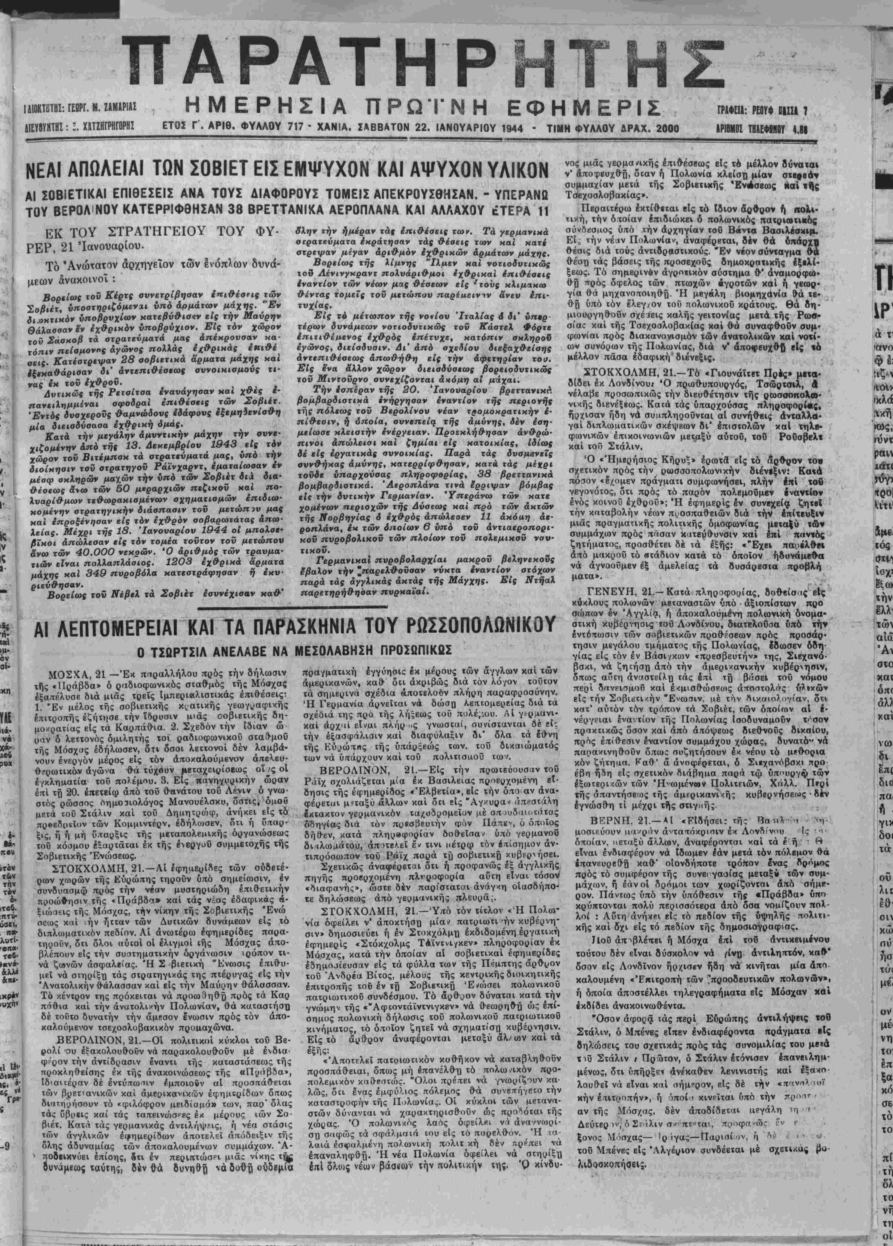 ΜΕΤΙΥ1ΤΠ: Ι. ΧΑΤΖΗΓΡΗΓΡΡΗΣ ΕΤΟΣ Γ'. ΑΡΙΘ. ΦΥΛΛΟΥ 717 - ΧΑΝΙΑ. ΣΑΒΒΑΤΟΝ 22. ΙΑΝΟΥΑΡΙΟΥ 1944 ■ ΤΙΜΗ ΦΥΑΑΟΥ ΔΡΑΧ. 2ΟΟΟ ΑΡ1ΒΙΟΣ ΤΒ&ΕΦΒΙΙΟΥ 4.81