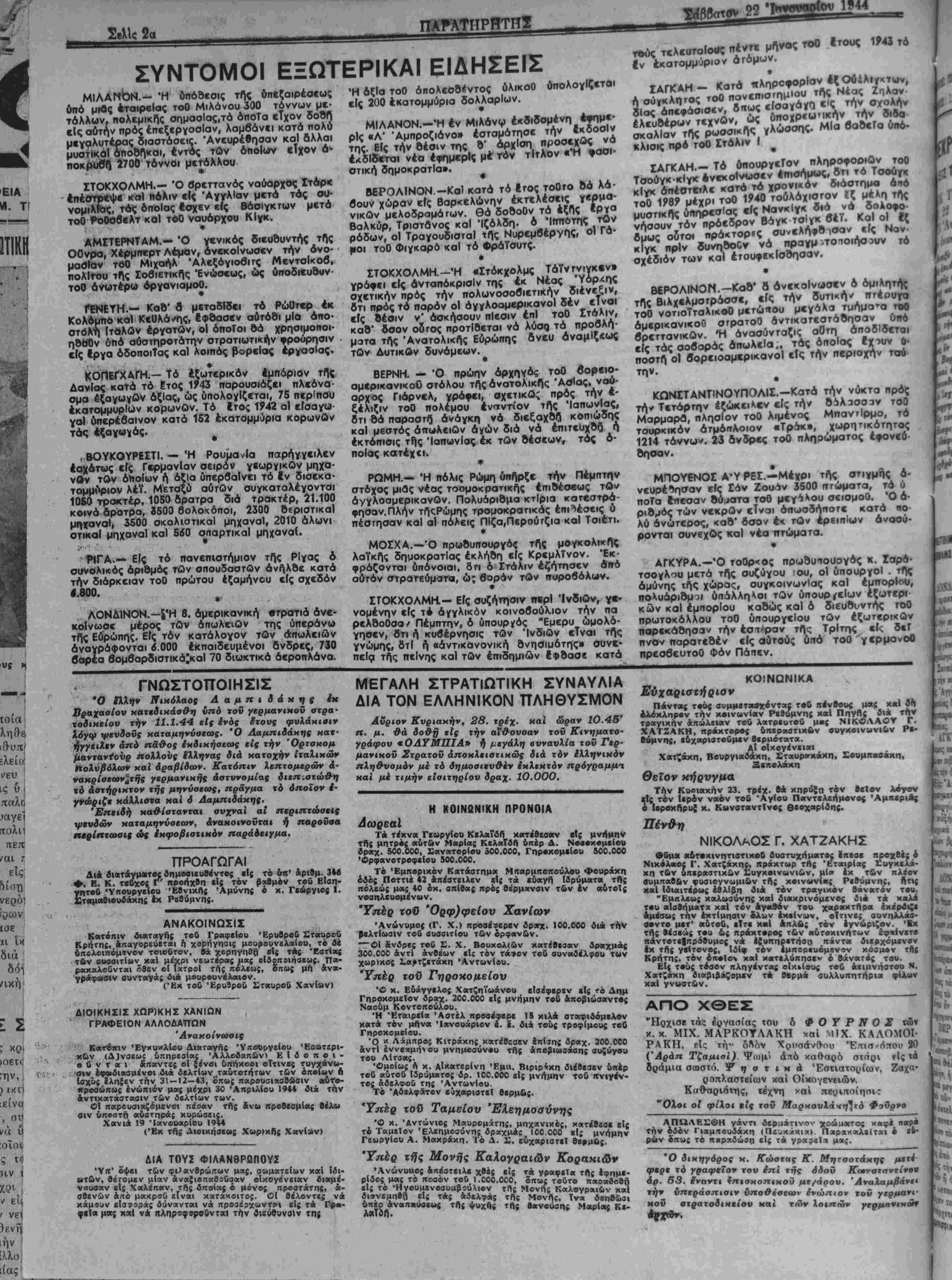 παρίκάσησαν την έθΊ°ραν τής Τρίτης €ί<; δ€ΐ πνον παρατεθέν είς αύτούς υπό τοθ γερμονοθ πρεσβευτοθ Φόν Πάπβν. ΓΝΩΣΤΟΠΟΙΗΣΙΣ Ό Ιίλην /Γικόλαος Ααμπιδάκης έκ ΒραχααΙον κατεδικάσθη υπό τού γερμανικοΰ οτρα- τοδικείου την 11.1.44 είς ενός Ιτονς φυλάκισιν Χόγψ ψινδονς καταμηνύσεως. Ό Λαμπιδάκης κατ- ήγγϊιλεν άπό πα&ος εκδικήσεως ιΐς την Όρτσκομ /ιανταν^οΰρ ηολΐονς έλληνας διά κατοχήν ίταλιχών Μολυβόλων κα( άραβϋων. Κατόπιν λεπτομερων ά- νακρίοεων^τής γερμανικής άστυνομίας δκπ.στώθη τό άστήρικτον τής μηνΰσεως, πράγμα τό οποίον ε¬ γνώριζε κάλλισΐα χαί ύ Ααμπιδάκης. Έηαθι καθίστανται συχναϊ αί περιπτώσεις ψΐνίών καταμηνύοεων, ανακοινούται ή παροΰσα «Μρίπτωοιι ώς Ικφοβισΐικόν παράδειγμα. ΠΡΟΑΓΩΓΑΙ ΟΜΤβί δημοαιευ9<ντο( είς το &π' χβ{ Γ' προήχίη (Ι; Τβν βχβμβν ίγίΐβυ Έβνιχης Αμύνης β χ. Ι Διί βικτανι ♦. Β. Κ. τεθι. . .... γητβθ Ύπβυργίΐβυ Έβνιχης Αμύνης Εταμαβιονίάχης (χ Ρββΰμνης. «ριβμ. 31ί τβδ Εΐοπ- Γεώργιος Ι. ΑΝΑΚΟΙΝΩΣΙΣ Κατόπιν διαταγάς τβθ Γραφϊΐβυ ΈρυβρβΟ Σταυροΰ Κρήτηί..*πογορεύΐτ5ΐι η χορήγηοις μΐυρουνελθίΐβυ, τό 4έ ϊπΰλοιπόμιινΰν τοιούτον, βα χορηγηθη είς τας Έατίχς τ&ν αυοσιτίων χαΐ μεχρι νεωΓβρας αας εΐδΐποιηαεως. τχχ- ραχκλοϋνται ό9ζν β! (χτροΐ τής πέλε«ς, ϊπως μή ανα- γρ*Φ0·«ΐν ουντκγάί οικ μουρβυνβλαιβν. (Έμ τού Έρυ9ροϋ Εταυρου Χανίων) ΔΙΟΙΚΗΣΙΣ ΧΩΡ)ΚΗΣ ΧΑΝΙΩΝ ΓΡΑΦΕΙΟΝ ΑΛΛΟΔΑΤΤΩΝ Ανακοίνωσις Κατίπιν ΈγχυκλΙου Λικτανής Ύκββργείου Έσωτίρι- χ&ν (Δΐνοΐωί ΰπηρΐαΐας 'Αλλβοαπ&ν) Ε Ι ό ο π ο ι - ο Ο ν τ α ι δπαντες οί {ίνβι 6ηήχοβι οΐτινες τυγχκνω- «ιν ϊΐρ«ίιχαμίνβι Διά ύελτΐων τα&τοτήτων τί»ν οπ·ΐ«ν Α Ιαχΰς ΐΧηξεν την 31 — 12—13, όπως παρουαιαβθβαιν αύτβ- <τρααώκ»ς ενώπιον μας μίχρι 30 Απριλίου 1941 διά την αντικατάστασιν των δαλτίων τ»ν. ΟΙ παρβυαιαςομΕνβι πίοαν τΑ( &ν« προβεσμίας β«λ« βιν ύπβοτή αυστηράς κυρώσεις. Χανιά 19 Ίανβυαριου 1911 (Έχ τής Λιοιχήαε»: Χωρ)χΓίς Χανίων) ΜΕΓΑΛΗ ΣΤΡΑΤΙΩΤΙΚΗ ΣΥΝΑΥΛΙΑ ΔΙΑ ΤΟΝ ΕΛΛΗΝΙΚΟΝ ΠΛΗΘΥΣΜΟΝ Αυριον Κυριακήν, 28. τρέχ. καί ώραν 10.45" η. μ. θά δοθή '^Ι την αίθουσαν τον Κινηματο- γράφον «ΟΛΥΜΠΙΑ» ή μεγάλη ουναυλία τ οί Γβρ- μανικοΰ Στρατοΰ αποκλειστικώς δια τόν ελληνικόν πληθυσμόν μέ τό δημοσιευθή εκλεκτόν πρόγραμμι καί μί τιμήν είσιτηρίου ίραχ. 1Ο.ΟΟΟ. Η ΚΟΙΝΩΝΙΚΗ ΠΡΟΝΟΙΑ Δωρεαί Τ4 τίχνα Γεωργίβυ ΚελαΤδη κβτέβεσιχν είς μνήμην της μήτρος αύτ&ν Μαρίας ΚελαΤδη υπέρ Δ. Ν···χ·μ*1οβ βραχ. 500.000, ΧανατβρΙου 500.000, Γηρ·χομείβυ 300.000 ΌρφανβτρβφεΙβυ 500.000. Τ* Εμπορικόν Κατάστημα Μπαρμηοπούλου Φουρίχη οδβς Ποττιέ 42 «πίοτΐιλβν είς τα εΰοιγή Ιδρύματα της πόλϊοις μας 40 βχ. συίΒας πρός βίρμανοιν των 4ν αύτβΤς νβσηλίυβμίνΜν. Υπέρ τού Όρφ)φεΙου Χανίων 'Ανώνυμβς (Γ. Χ.) προαένερεν δρα—. 100.000 δικ την ρελτΐωσιν τού αοοβιτΐου τδν βρφ«ν&ν. ΟΙ ϊνδρες τοδ £. Χ. Ββυχολ(&ν κατέβΐααν δραχμάς 300.000 αντΐ ανβεων εί; τβν τά»ον τοθ ουναδΐλβου τ«ν χ«ρ)κος Ις 'ΑΙ Υπέρ τού ΓηροΗο/ιεΙου ΔΙΑ ΤΟΥΣ ΦΙΛΑΝθΡΟΠΟΥΣ Ύΐΐ' όψει τδν φι;«νβρώη»ν μ«ς, οοιματε(»ν χαΐ |«ι- »τδν, βετομεν μίαν ανα{ιβπαβ3θ3αν οικογένειαν οιαιιΐ- νβοοαν είς Χαλίπαν, τής βποίας ό μονβς πρββτίτης, 4- ββενίιν «πό μακροϋ ΐΐναι κατάκοιτος. ΟΙ θέλοντες νά κάμουν εΐατβρας δύνανται νά ηροαέρχυντβΊ είς τί Γρ«- «/*!« μ~ χαΙ ν« ΠλΠρβφβρβδνταΙ την δΐίύίυναΐν τπς •β χ. Ευάγγελος Χατζηϊωανβ» εΐαίφερΐν «Ις τό Δημ Γπρβχομεΐον δραχ. 200.000 είς μνήμην τβδ αποβιώσαντος Ναούμ Κοντοπούλου. •Η Έταιρεΐα 'Αστελ πρβοέβερε 1$ χιλ* οτ«?ιδόμ·λον χ«τ« τόν μήνα Ί«νουαριον έ. Ι. διά το6ς τροβίμβος τβθ Γηρβχομεΐβυ. 'θ * Λάμπρβς Κιτράχης χκτέβοοεν έπίβης βραχ. 200 0