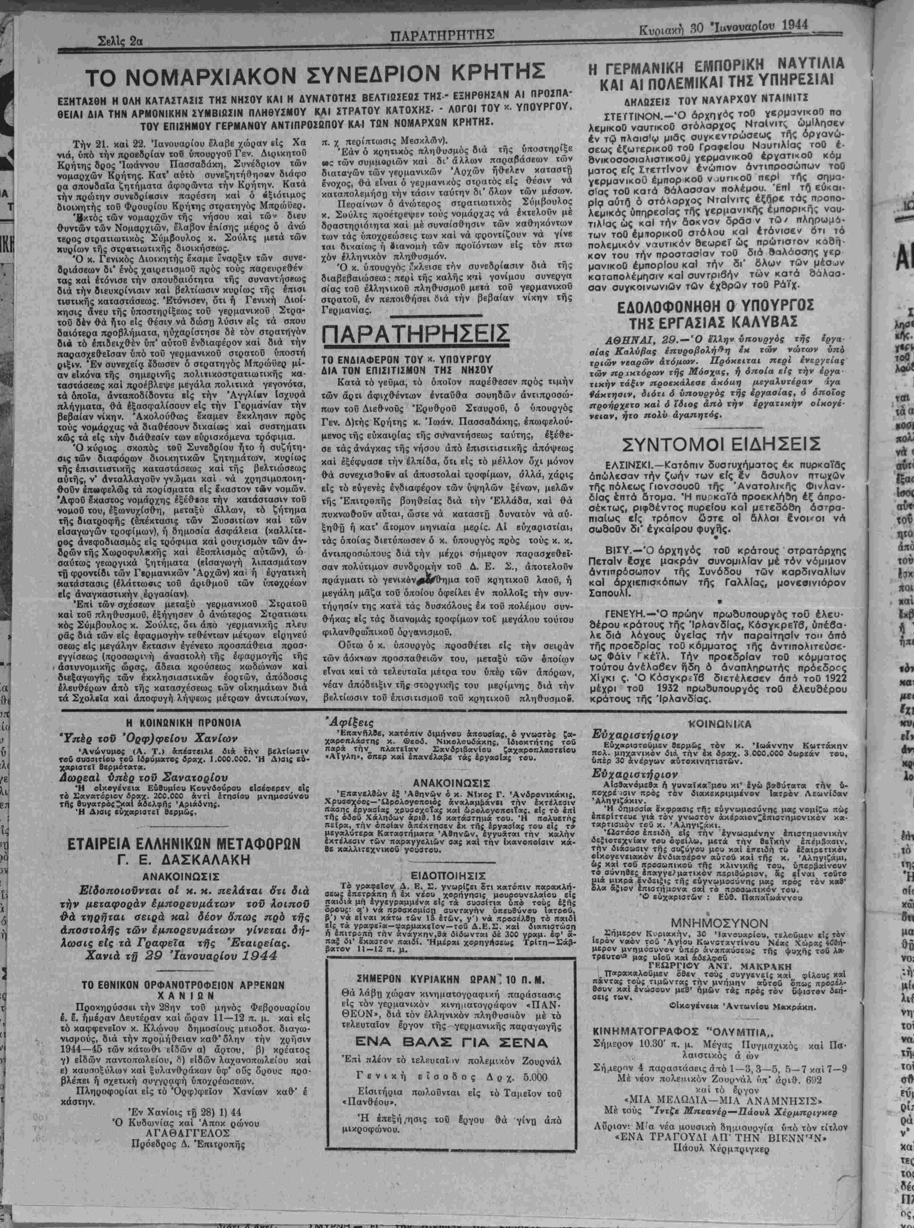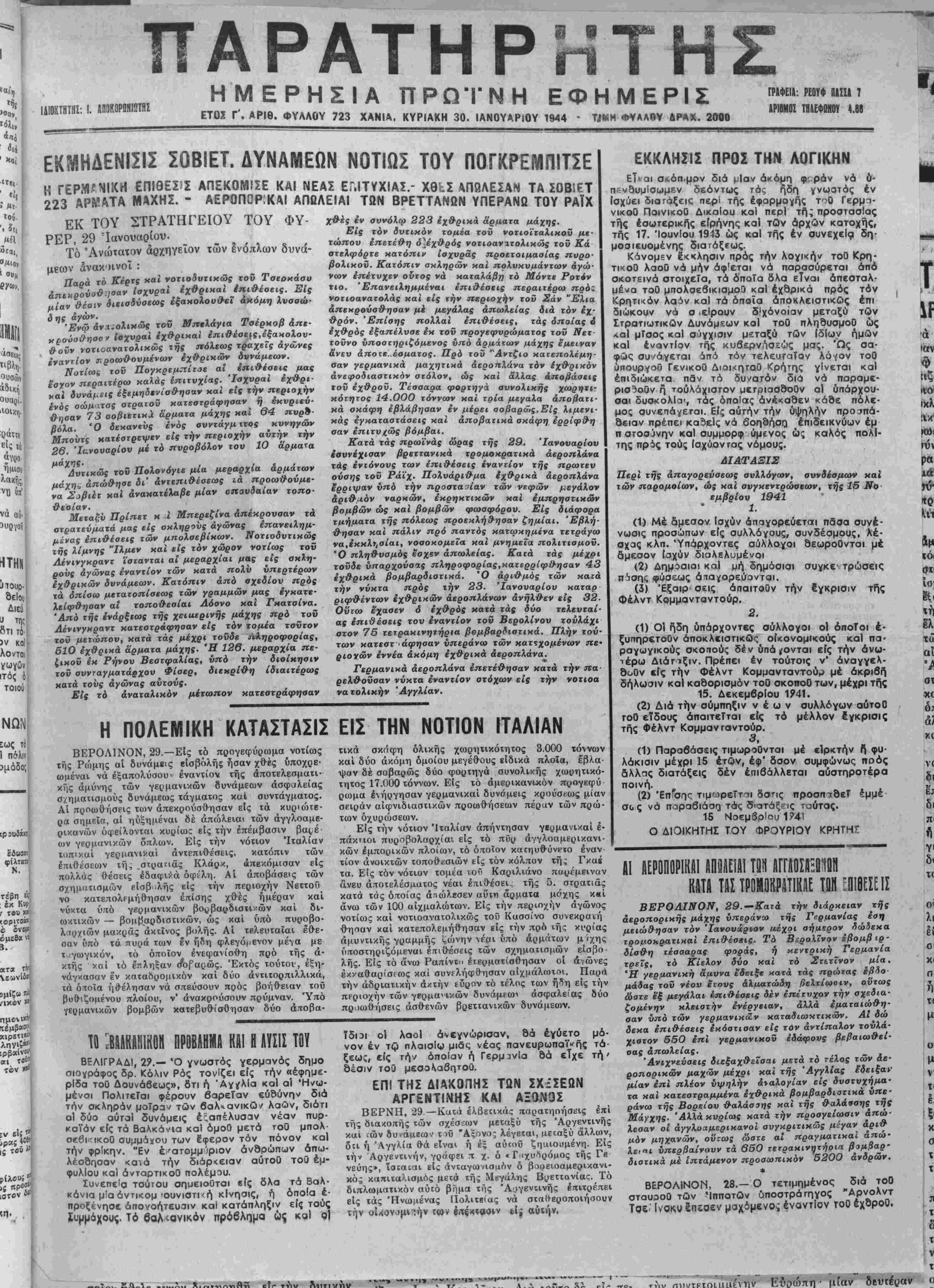 ΕΤΟΣ Γ . ΑΡΙΘ. ΦΥΛΛΟΥ 723 ΧΑΝΙΑ, ΚΥΡΙΑΚΗ 30. ΙΑΝΟΥΑΡΙΟΥ 1944 · Τ/ΚΗ ΦΥΛΛθν ΔΡΑΧ. 2000