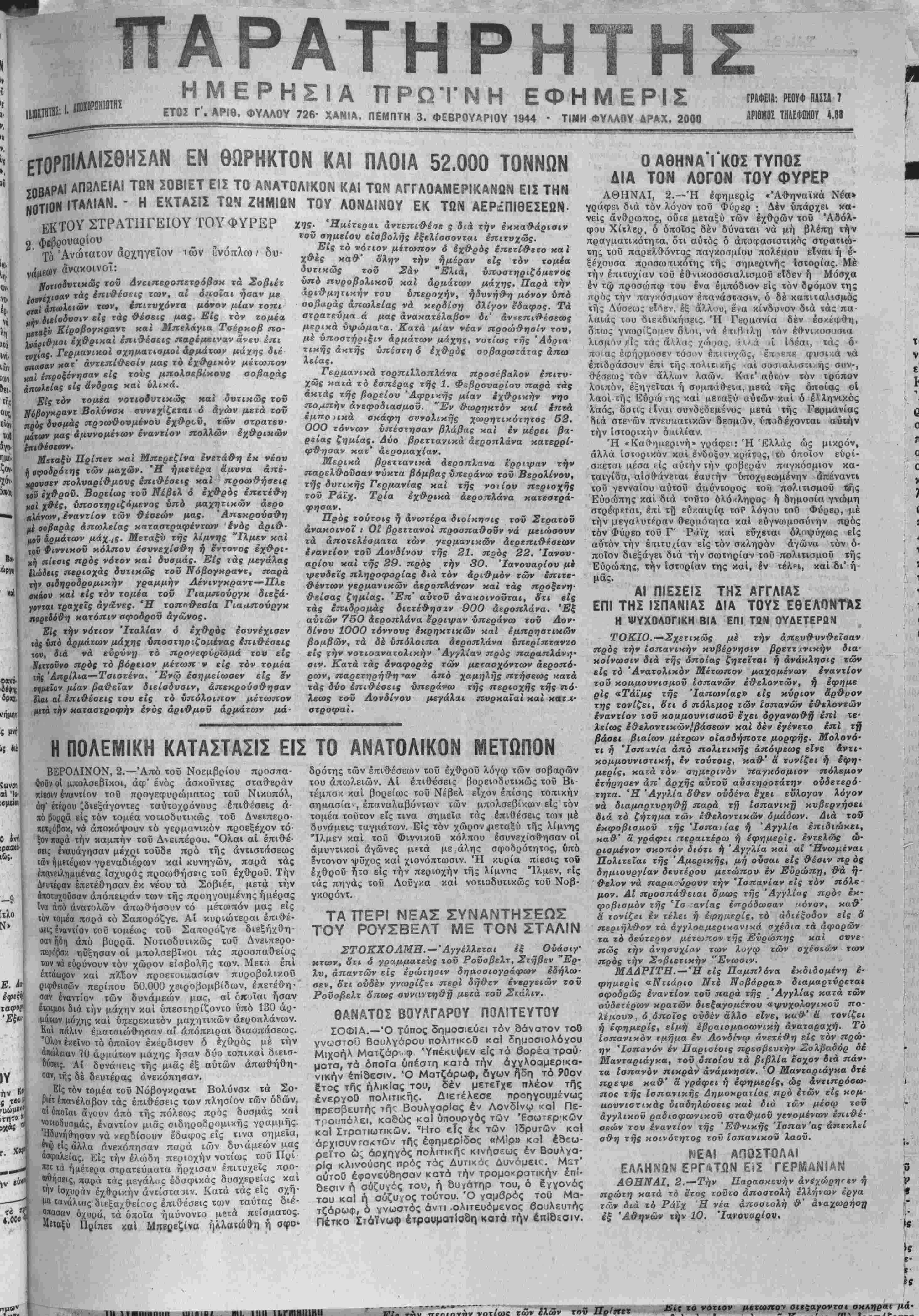 ΕΤΟΣ Γ . ΑΡΙ8. ΦΥΛΛΟΥ 726- ΧΑΝΙΑ, ΠΕΜΠΤΚ 3. ΦΕΒΡΟΥΑΡΙΟΥ 1944 ■ ΤΙΜΗ ΦΥΛΛΟΥ ΔΡΑΧ. 2000