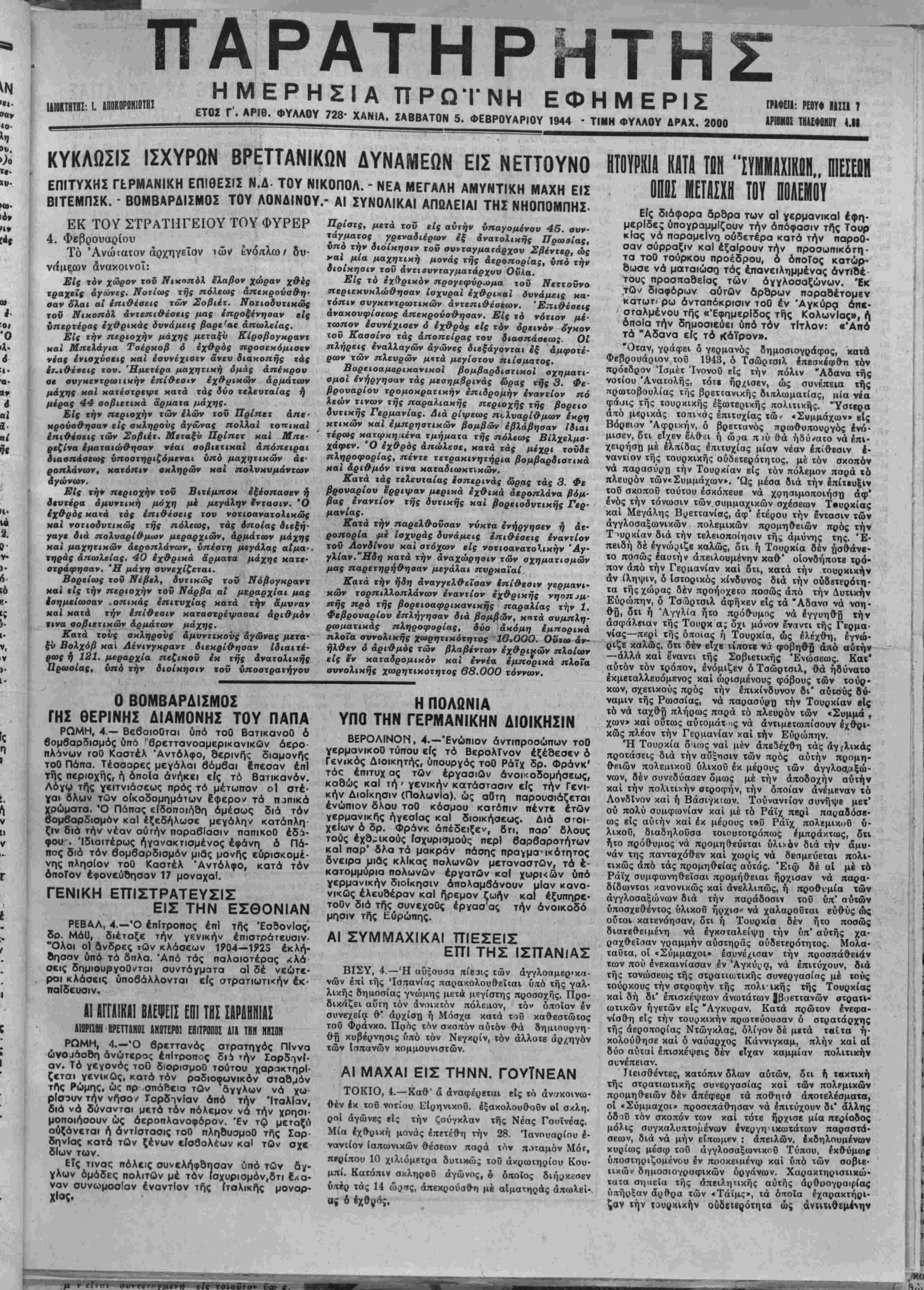 ΕΤΟΖ Γ". ΑΡΙΘ. ΦΥΑΑΟΥ 728- ΧΑΝΙΑ. ΣΑΒΒΑΤΟΝ 5. ΦΕΒΡΟΥΑΡΙΟΥ 1944 · ΤΙΜΗ ΦΥΑΛΟΥ ΔΡΑΧ. 2000