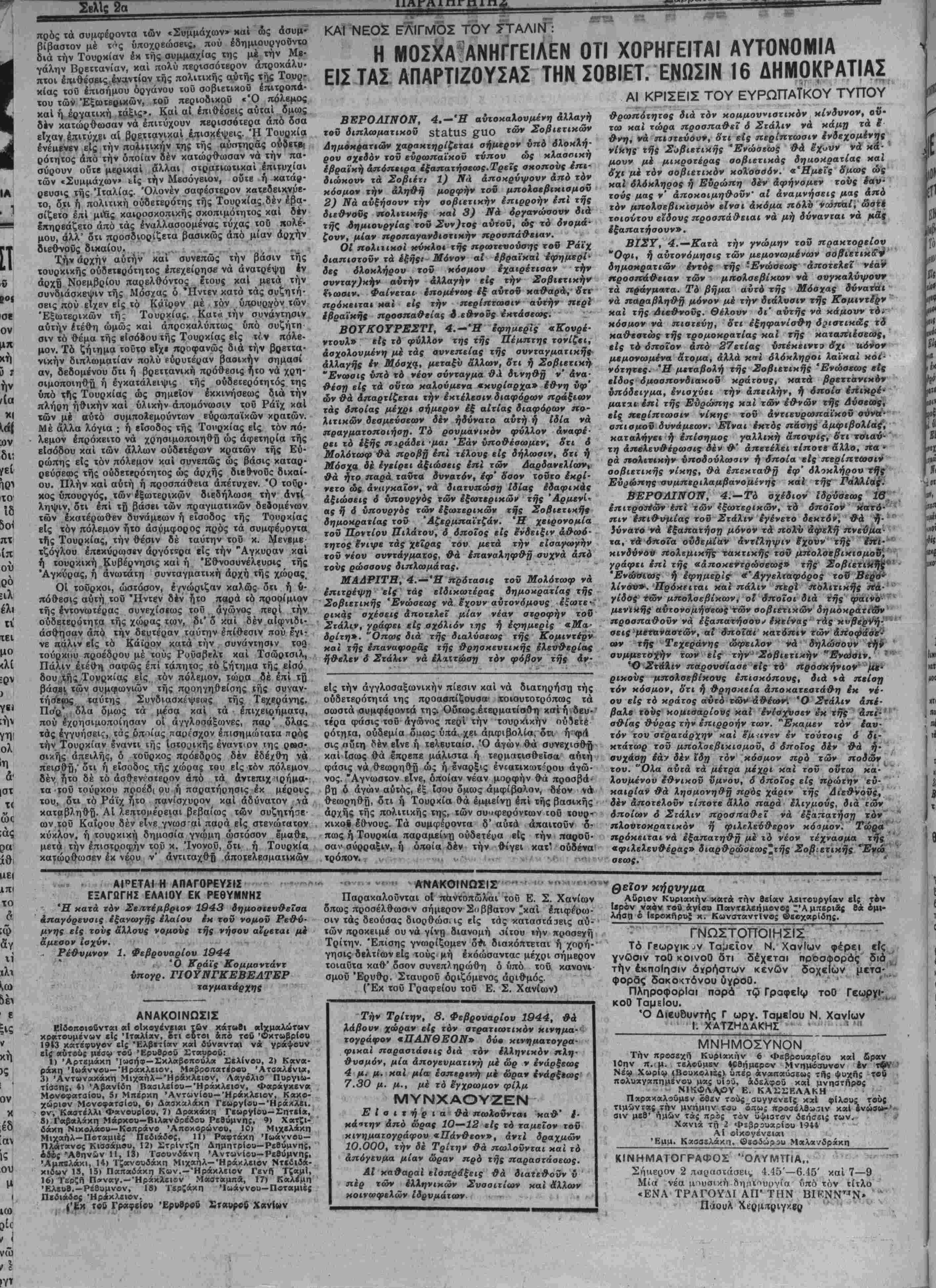 τόν τού στρατάρχην «αί εμ<ινϊν έν τούτοις ό δι¬ κτάτωρ τοΰ μπολσεβικισμόν, ό οποίος δέν θά ή· συχάσγι έάτ δέν ίδη τόν κόσμον πρό των ποδών χον. "Ολα ανιά τα μέτρα μέχρι καί τοϋ οντω χά· Χουμένον εθνικον νμνου, ό οποίος είς πρώτην ευ¬ καιρίαν θά λησμονη&ΐ) πρός χάριν τής Δι'εθνόΰς, δέν άποτελονν τίποτε άλλο παρά έλιγμούς, διά ι (όν οποίων 6 Σιάλιν προσηαθεϊ νά εξαπατήση τόν" - πλοντοκρατικόν ή φιλελεύθερον κόσμον. Τώρα πρόχειται νά εξαπατηθϋ μέ ζό νέον τέχνααμα τής «φιλελευθέρας» διαρθρώαεως'τής Σοβιετικής *Ενώ σεως. ΑΙ°ΕΤΑΙ Η ΑΠΑΓΟΡΕΥϊιΣ ΕΞΑΓΟΓΗΣ ΕΛΑΙΟΥ ΕΚ ΡΕΘΥΜΝΗΣ Ή κατά τόν Σεπτέμβριον 1943 δημοσιευθείσα Απαγόρευσις έξανωγής ελαίου ίκ τοΰ νομόν Ρεθύ¬ μνης είς τούς αλλους νομονς τής νήσου αΐ'ρεται μέ άμεσον ισχύν. Ρέθυμνον 1. Φεβρουάριον 1944 * Ό Κράϊς Κομμαντάντ ύπογρ. ΓΙΟΥΝΓΚΕΒΕΛΤΕΡ χαγματάρχης .......·· ' ΑΝΑΚΟΙΝΩΣΙΣ *.........." Παρακαλοΰνται οί παντοπώλαι τοΰ Ε. Σ. Χανίων όπως προσέλθωσιν σήμερον Σάββατον 'χαί έπιφέΌω- σιν τάς δεούσας διορθώσ. ις είς τάς καταστασίς αύ- · των προκειμέ ου νά γίνη διανομή οίτου <ήν πρασεγή Τρίτην. Έπισης γνωρίζομεν ότΗ διακόπτετπι ή χορή- γησις δελτίωνείς τούς μή έχόώσανΐαε μέχρι σήμερον τοιαϋτα καθ" όσον συνεπί ηρώθη ό υπό τοΰ κανονι σμοϋ Έρυθρ. Σταυροϋ όριζόμενος άριθμός. (Έκ τού Γραφεΐου τοΰ Ε. Σ. Χανίων) είς διό ΑΝΑΚΟΙΝΩΣΙΣ Εΐδβΐιβιβθντβι α! οΙχονέν«.ι«ι των χάτοβι «1χμοιλώτ»ν κρ«τουμέν»ν εί; Ιταλίαν, ότι βοτβι &πο τβΰ Όκ-τωβρΙβυ 1913 κατίφυγβν είς Έλβΐτίον χκΐ ίϋνανται να γράφουν είς αύτοι»; μέαν «ΰ Έρυθρβΰ Εταυρβϋ: 1) Άρτεμβχη 'ΙΜθήφ-ϊκλοΐβοτβυλοι Εβλΐνου, 2) Κανα- ρίχη Ίββννβυ—Ήράχλίΐβν, Μ«βοβη«τέρ·υ ΆτσαλένΐΛ, 3) 'Αντοιναχάχη Μιχαήλ—"Ηρίχλβιον, Λαγβλιβ Πυργιω- τίαβης, Ι) 'Αβανίίη Βχαιλίίβυ—Ηράκλειον, Φαράγχενα Μονβφαταίου, 5ι Μπβρχη 'Αντωνίου— Ηράκλειον, Κακο- χώριβν Μονοφοταΐου, 6) Δαβκχλ&χη ΓβΜργΙβυ—ΉράχλΕι. βν. Καστέλλι Φανβυρίβυ, 7) Δραχάκΐί Γεωργίου-Εητεί», β) ίαΒαλίχη Μάρχβυ-Βιλβνίρέδβυ ΡεβύμνΠί, 9) Χατζι- οαχη Νικβλάβυ— Κβπράνβ 'Αποχορωνβυ, 10) Μιχελχχη Μιχαήλ-Πβταμιέ; Πεδιάίοί, 11) Ραίρτάκη Ίωάννβυ- Πλατανο; Κιαβάμου, 12) ΣτρΙντζη Δημητρίβυ-Ρεβυμνηί, βίέ; Άβηνών 11, 13) Τοβονδάνη ΆντΜνίβυ-ΡΕβΟμνΐΐί, Άμ—λ&χι, 14) Τζανβυδάχη Μιχαίΐλ-Ήράχλειον Ντεδιδά- κιίων 18, 15) Παπαδάκη Κων.-Ήράχλίΐβν Γίνη Τς«μΙ, 16) ΤϋρζΛ Π»ναγ.-·Ηράχλειβν Μ«ατ«μπ4, 17) Καλεμη ■Ελευβ.-Ρέθυμνον, 18) Τερζάκη Ί«άννου-Ποταμιε; Πεδιάδος Ηράκλειον. , _ , ί'ί,Λ τβδ Γραφείον Έρυβρβδ Εταυρβδ Χαν(»ν ι ' ι . . Γήν Τρίτην, 3. Φεβρουάριον 1944, θά λάβονν χώραν είς τόν στρατιωτικόν κινημα-' τογράφον *ΠΑΝΘΕ0Ν» δύ· κινηματογρα- φικαΐ παραοτάοιις διά τόν ελληνικόν πλη¬ θυσμόν, μία άπογενματινή μέ ώρ ν ενάρξεως 4 μ. μ. χαί μία- εσπερινή μέ ώραν ενάρξεως 7.30 μ. μ., μέ τό εγχρωμον φίλμ ΜΥΝΧΑΟΥΖΕΝ Ε Ι α ι τ ή ρ ι α θά πωλοΰνται καθ" Ι- χά-την άπό ώρας 10—12 είς τό ταμείον τοϋ χινηματογράφου «ΖΤάνθεον», άνΐί δραχμών 10.000, την δέ Τρίτην θά πωΧοϋνται καί τό άπόγενμα μίαν ώραν πρό τής παραοτάαεως. Αί χαθαραί είοπρίξεις θά διατεθοΰν ΰ πέρ των έλλην ι χ ών Συσσιτίων χαί άλλων χοινωφελων ΐδρυμάτων χήβυγμα Αυριον Κυριακήν κατά την 9ε(αν λειτβυργΐαν εί; τβν Ιερόν ναόν τού αγίοο Παντελεήμβνβ; ~'Λ μπερια; θά ομι- λιίαο έ Ιηροχηρυ; χ. ΚωνσταντΤνος <8ε«χ«ρίδη{._______ : ΓΝΩΣΤΟΠΟΙΗΣΙΣ Τό Γϊωργικ^ν Ταμείον Ν. Χανίων φέρει γνώσιν τοθ κοινοθ δτι δέχεται προσψοράς την εκποίησιν άκρήστων κενών δοχείων μετα·Μ φοράς δακοκτόνου ϋγροθ. ' ' Πληροφορίαι παρά τφ ΓραφεΙψ τοθ κοθ ΤαμεΙου. Ό Διευδυντής Γ ωργ. ΤαμεΙου Ν. Χανίων ___________Ι. ΧΑΤΖΗΔ
