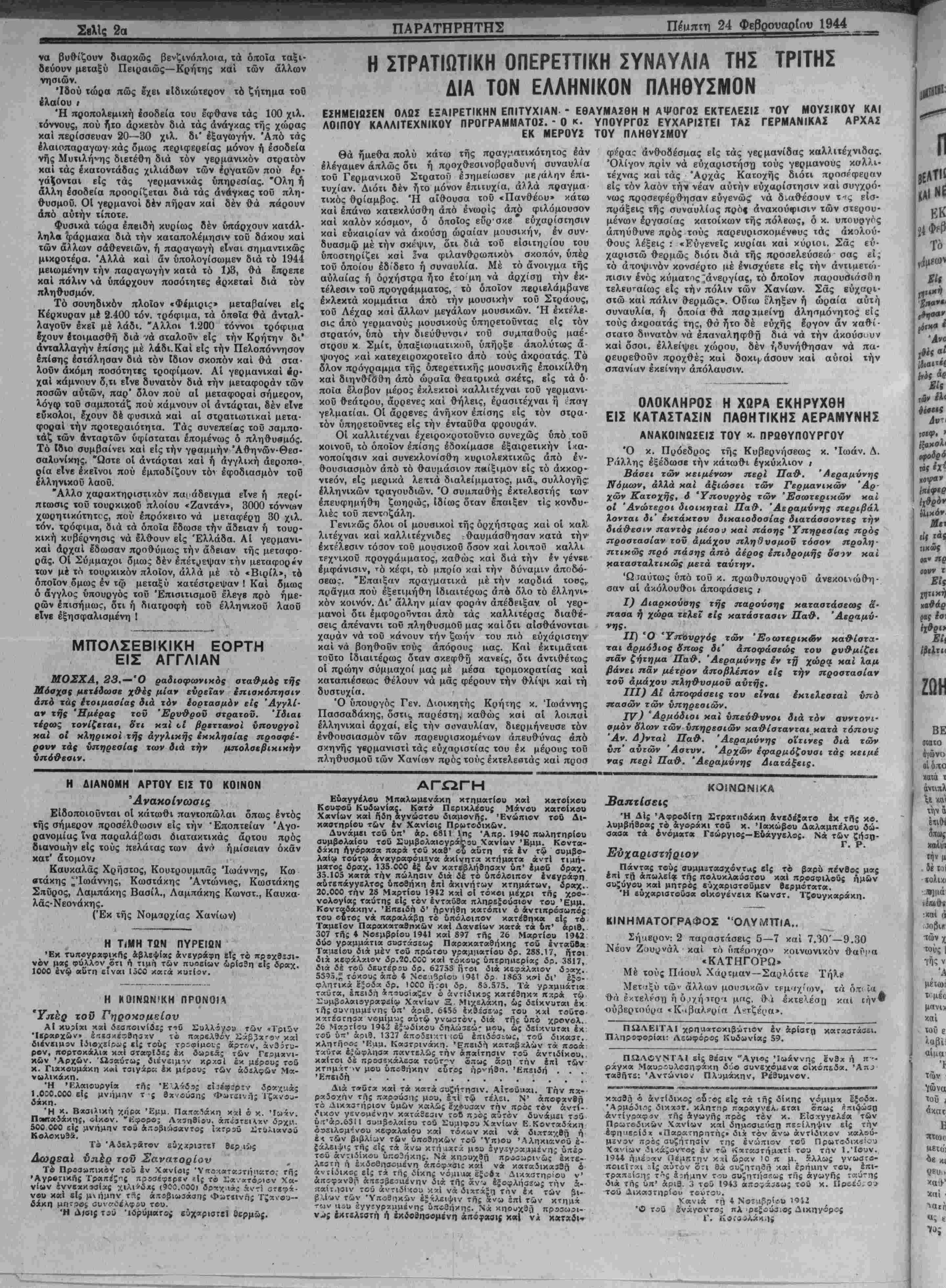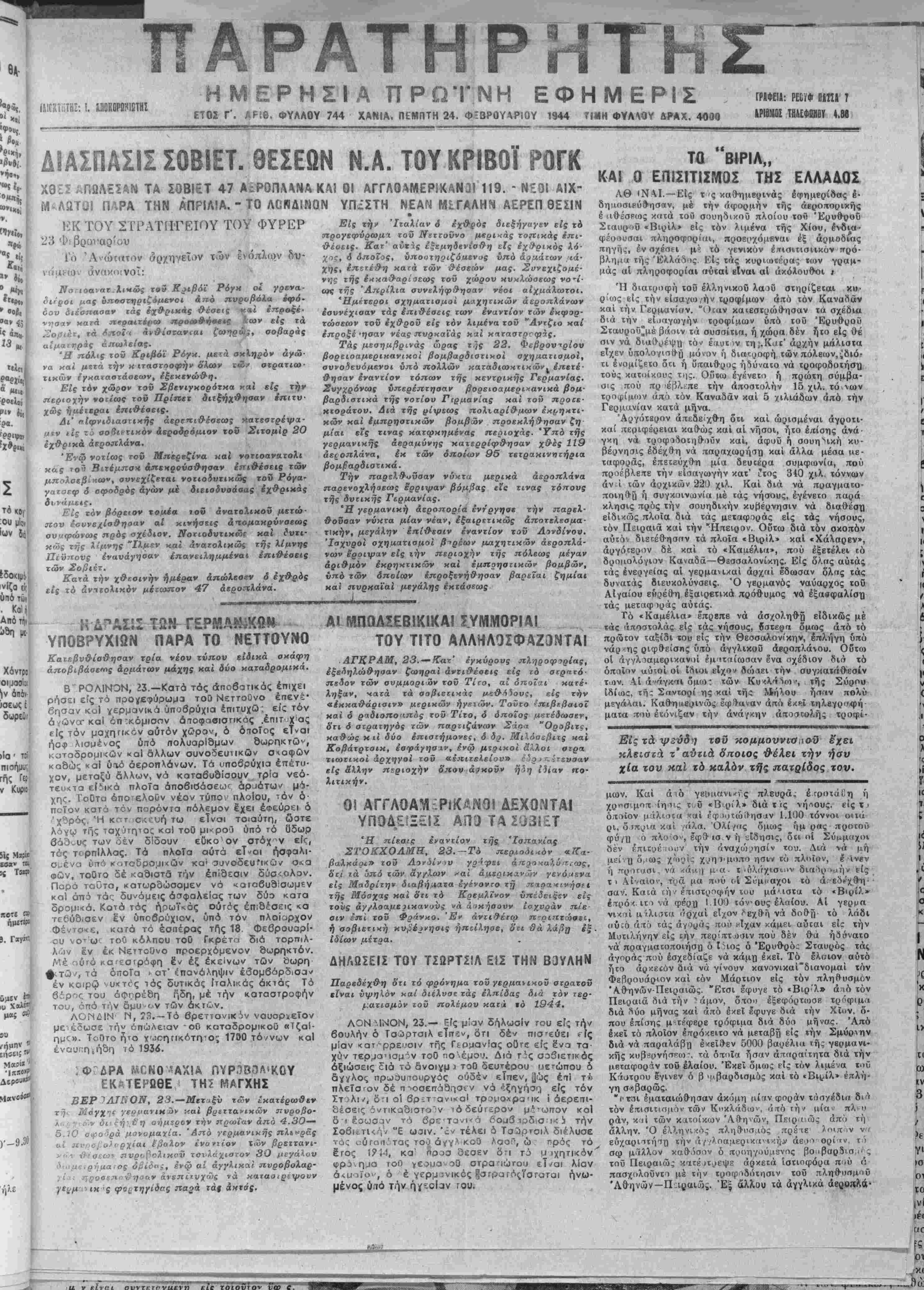 ΕΤΟΣ Γ'. ΑΡίθ. ΦΥΛΛΟΥ 744 ΧΑΝΙΑ. ΠΕΜΠΤΗ 24. ΦΞΒΡΟΥΛΡΙΟΥ 1944 ΤΙΜΗ ΦΥΛΑΟΥ &ΡΑΧ. 4009