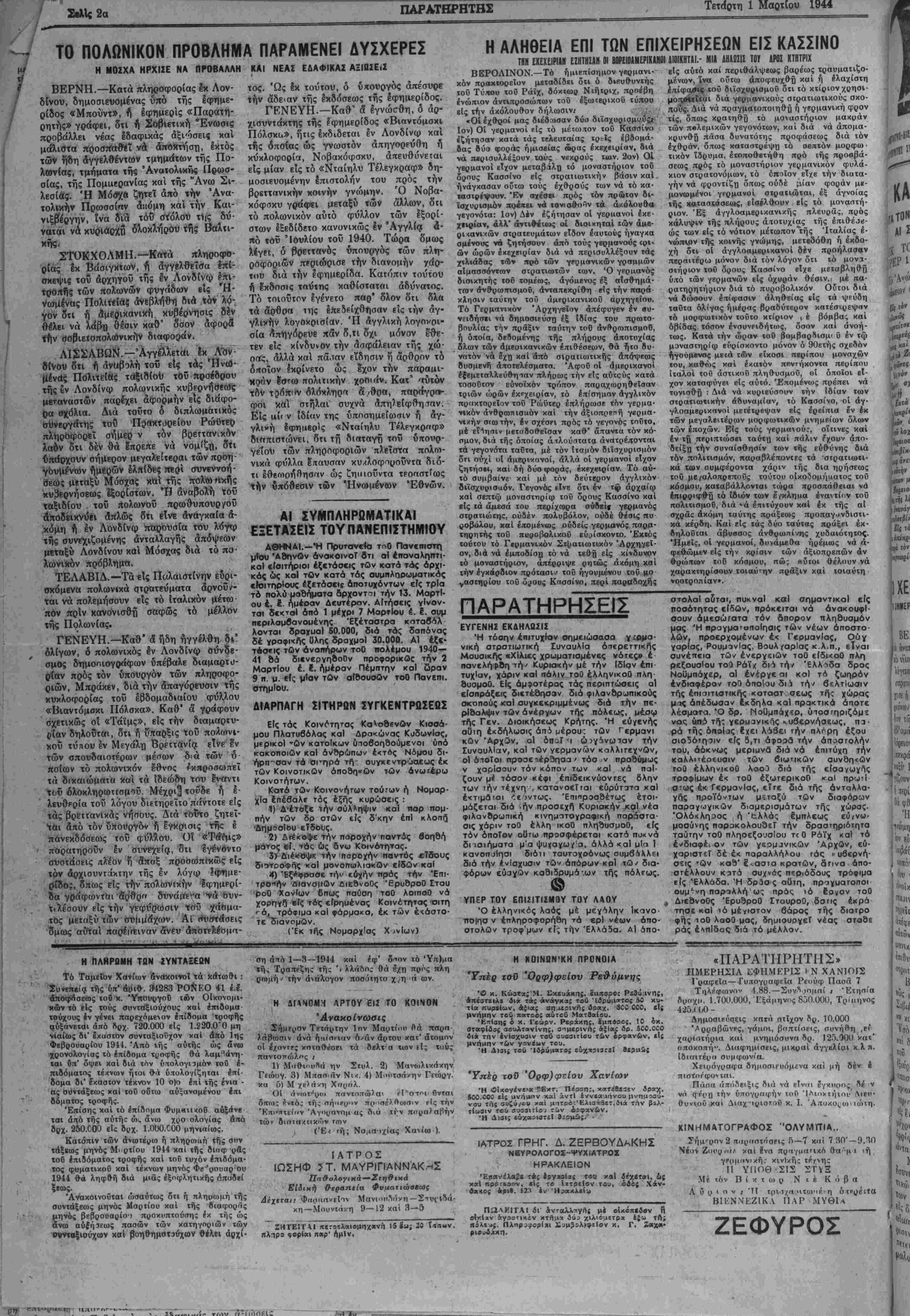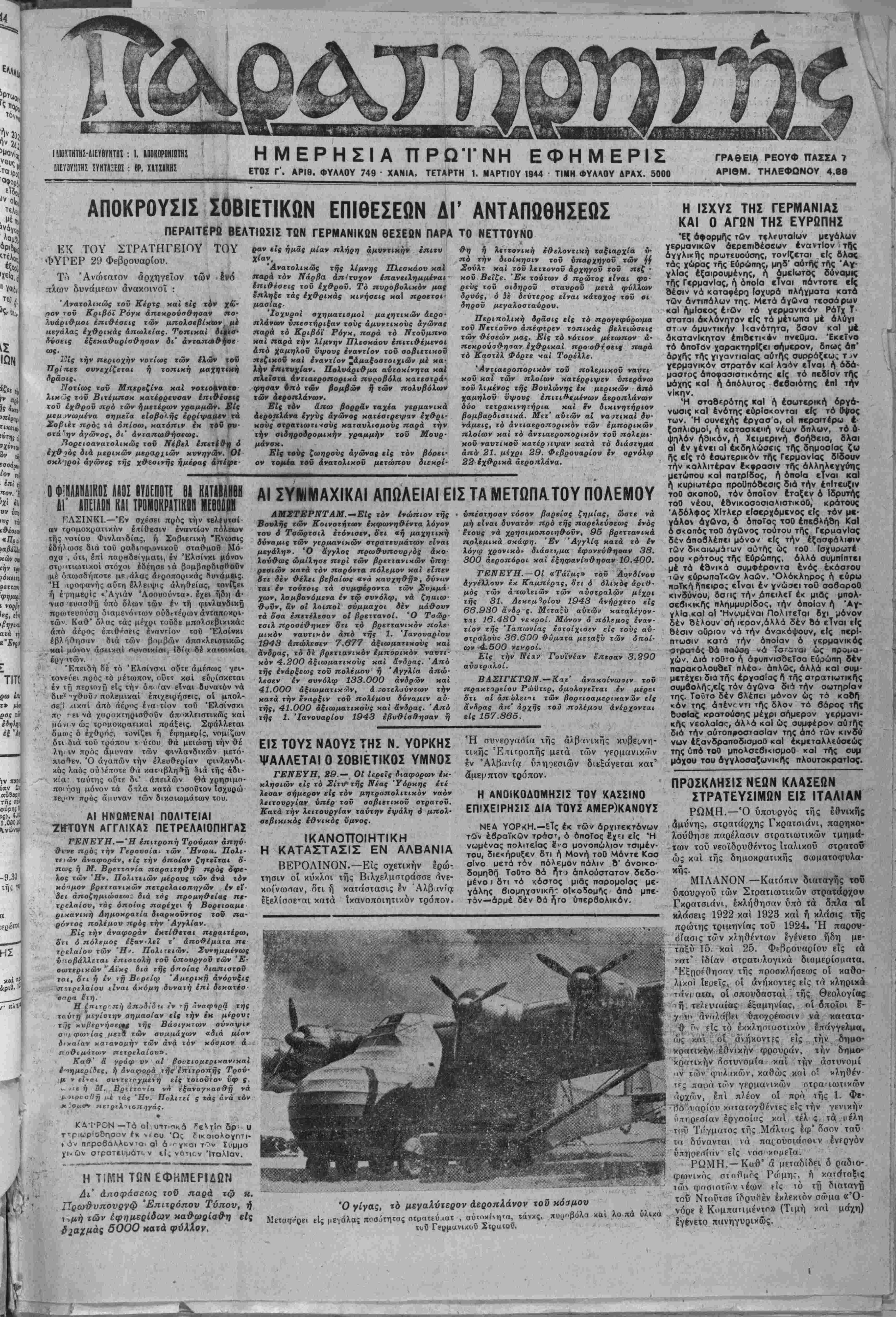 ΕΤΟΖ Γ". ΑΡΙΘ. ΦΥΛΛΟΥ 749 · ΧΑΝΙΑ. ΤΕΤΑΡΤΗ 1. ΜΑΡΤΙΟΥ 1944 ΤΙΜΗ ΦΥΛΛΟΥ ΔΡΑΧ. 5000