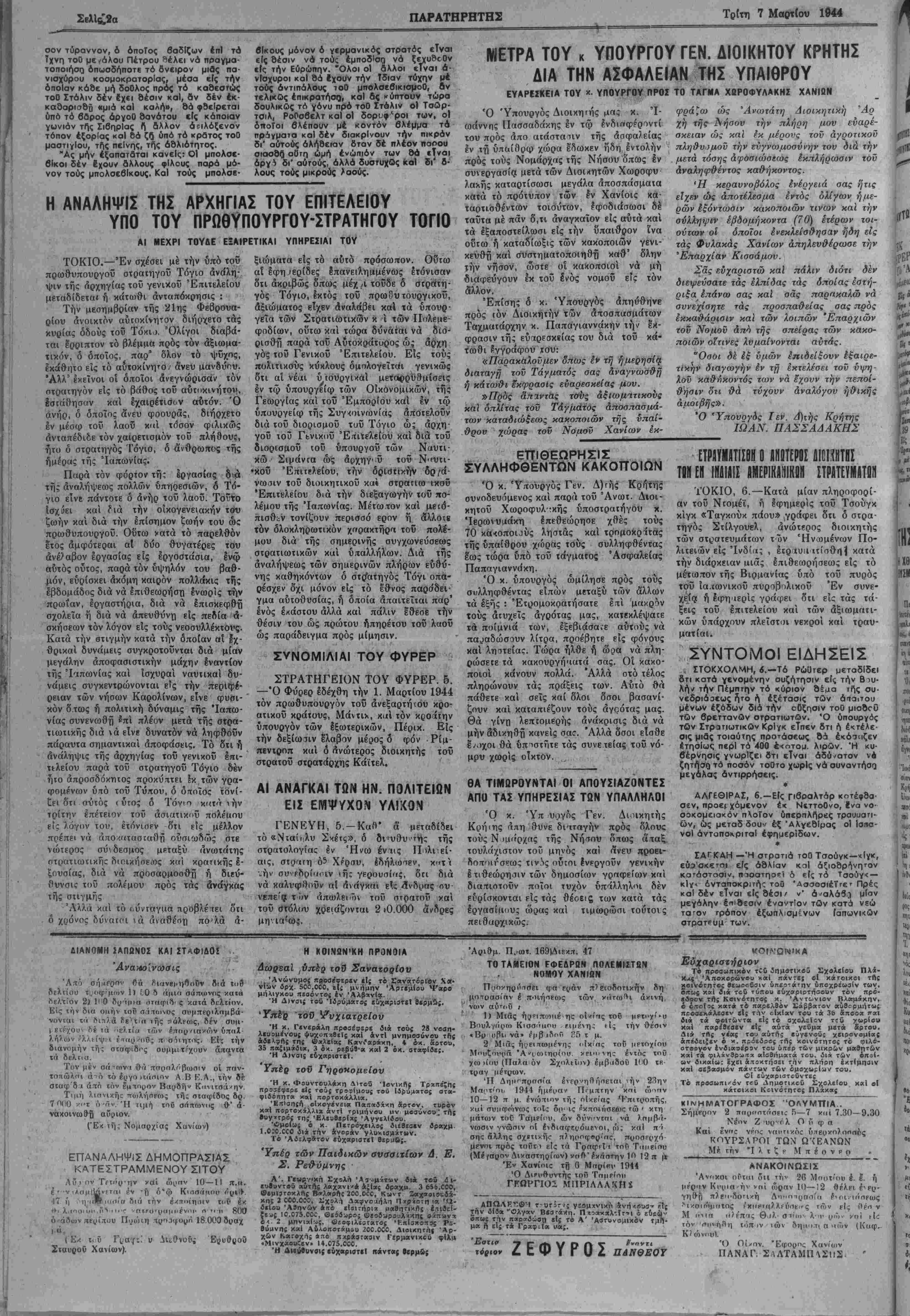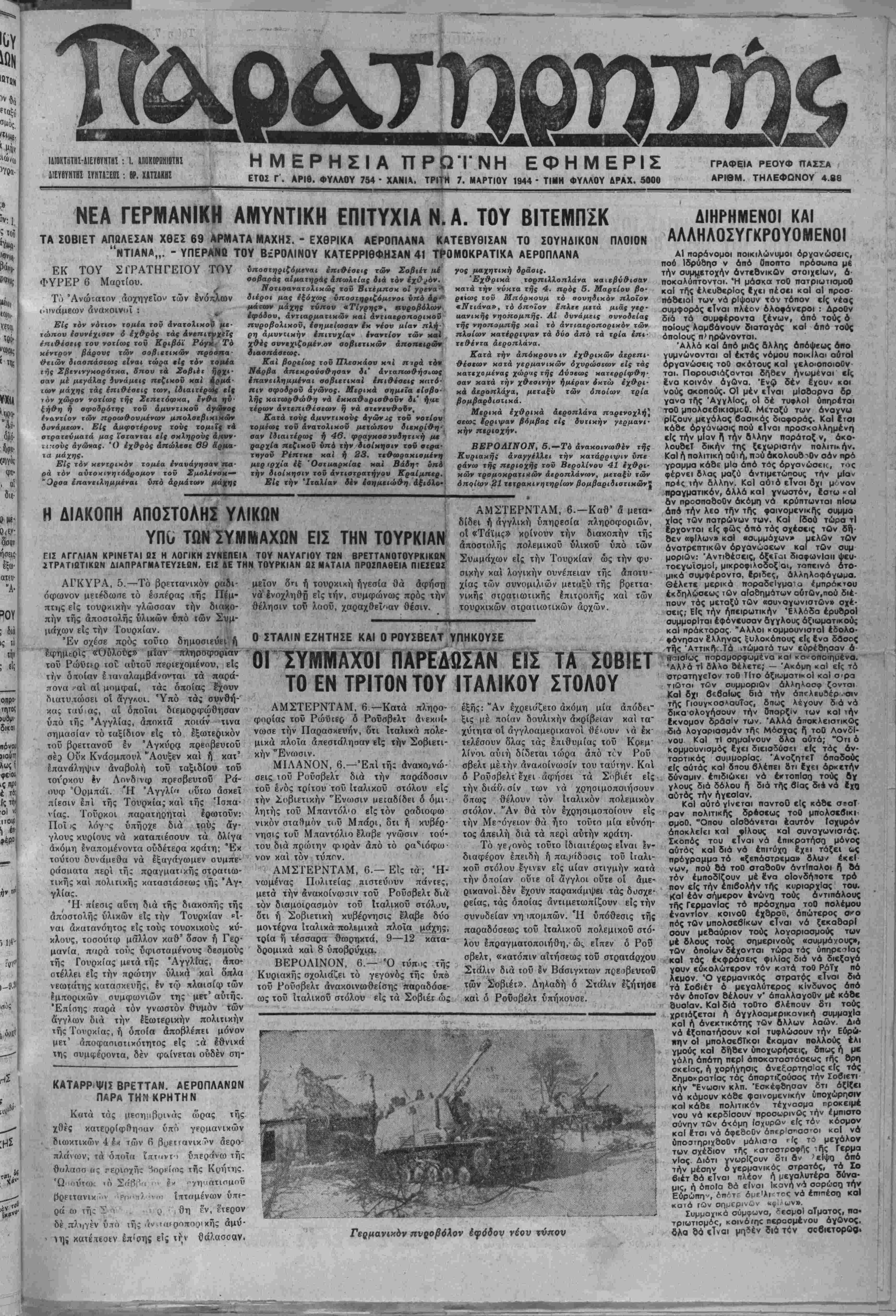 ΕΤΟΣ Γ'. ΑΡΙΘ. ΦΥΛΛΟΥ 754 - ΧΑΝΙΑ. ΤΡΙΤΗ 7. ΜΑΡΤΙΟΥ 1944 - ΤΙΜΗ ΦΥΛΛΟΥ ΔΡΑΧ. 5000