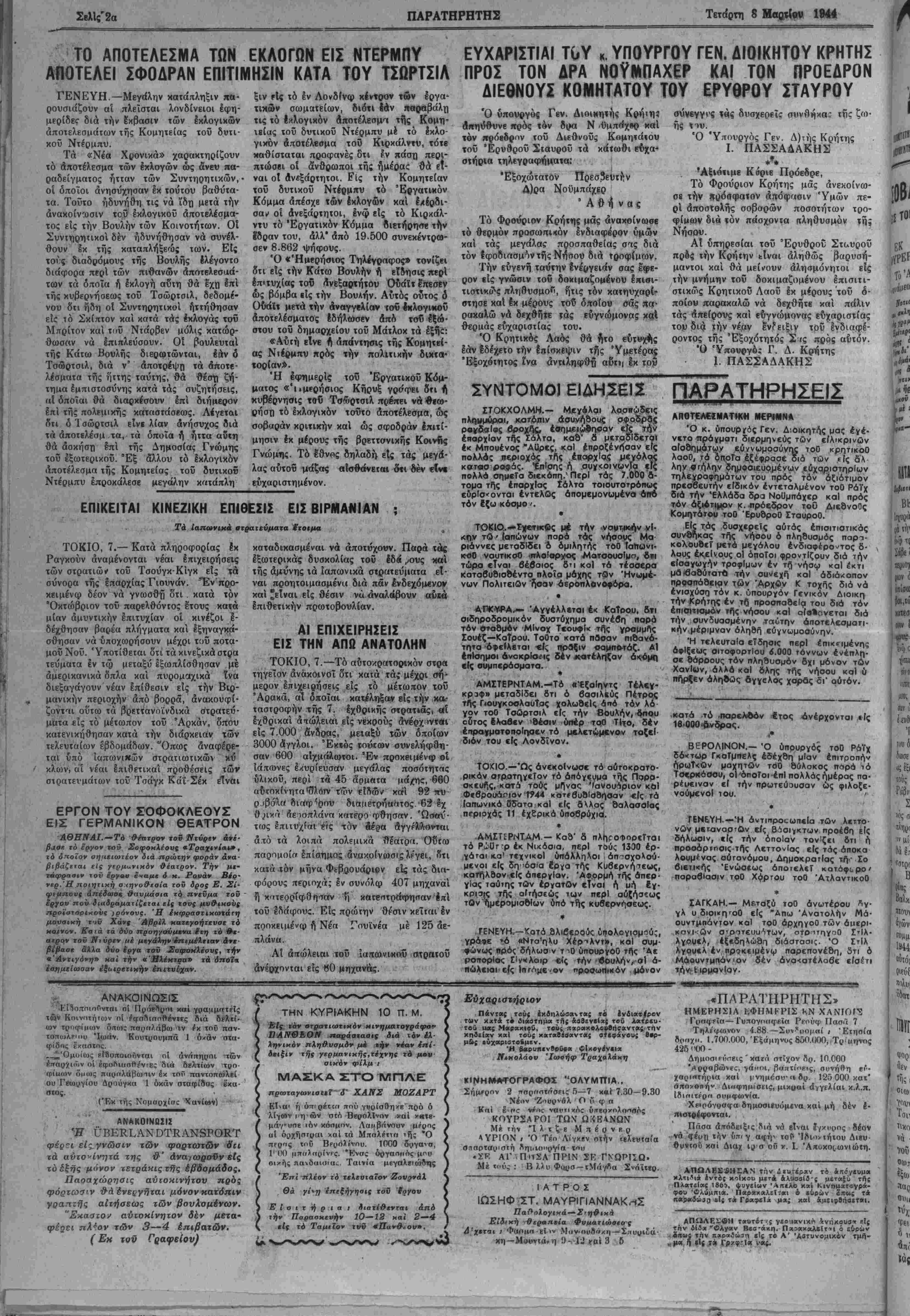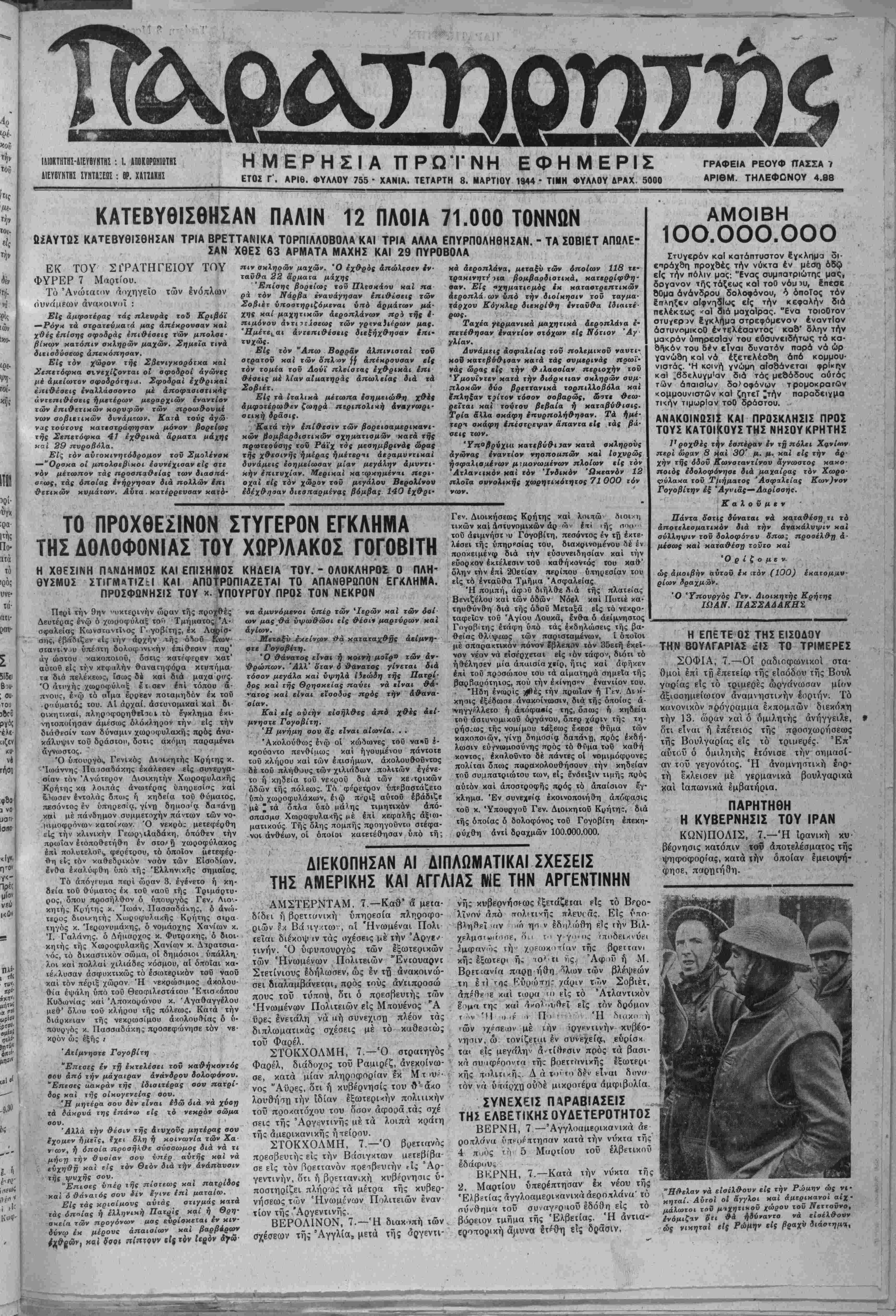 ΕΤΟΣ Γ'. ΑΡΙΘ. ΦΥΛΛΟΥ 755 · ΧΑΝΙΑ. ΤΕΤΑΡΤΗ 8. ΜΑΡΤΙΟΥ 1944 · ΤΙΜΗ ΦΥΑΛΟΥ ΔΡΑΧ 5000