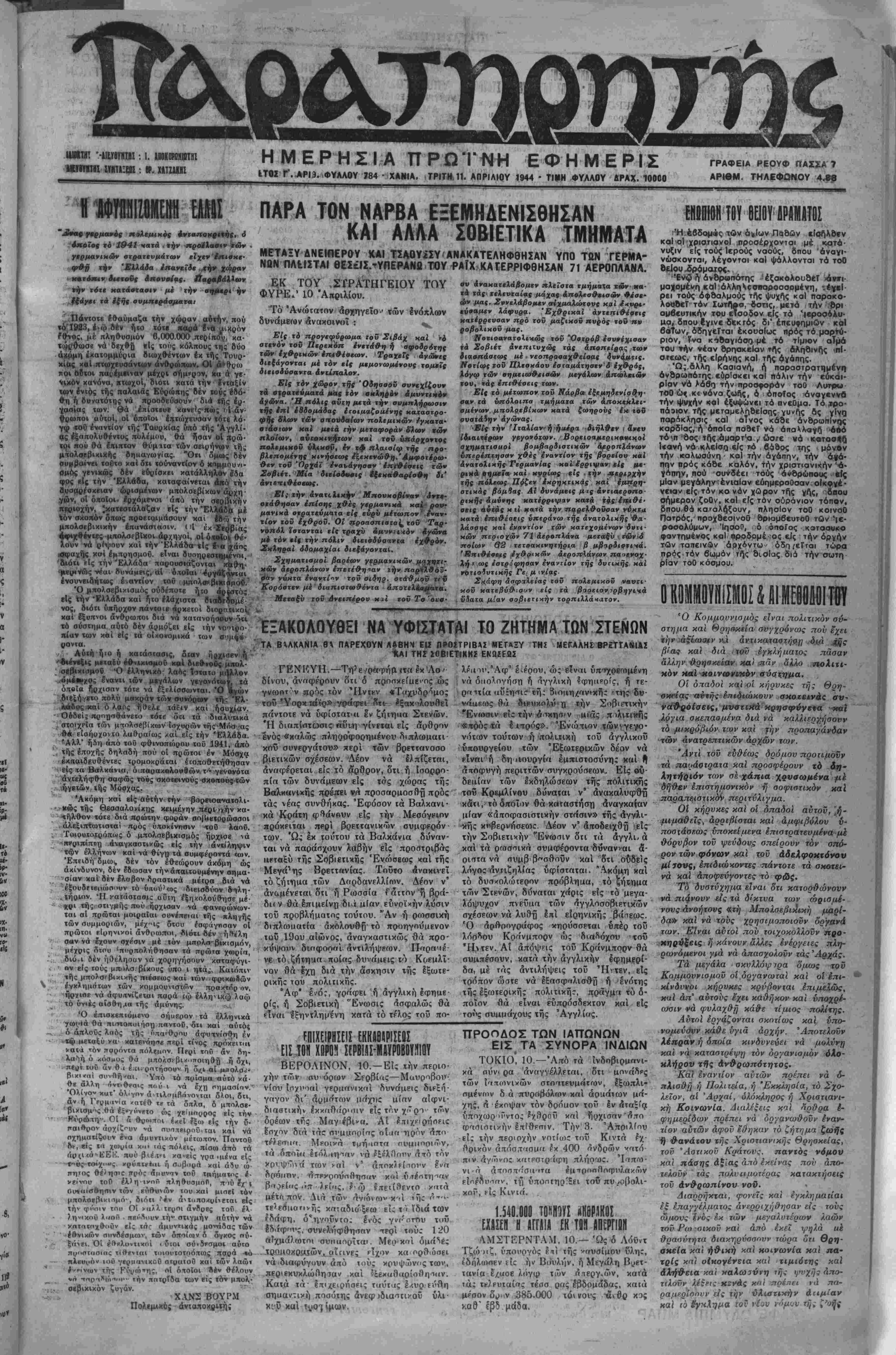 ίΤΟΣ Γ'.ΑΡΙΒ.ΦΥΛΛΟΥ 184 · ΧΑΝΙΑ. ΤΡΙΤΗ,ΙΙ. ΑΠΡΙΛΙΟΥ 1944 - Τ1Ι1Η ΦΥΑΛΟΥ ΛΡΑΧ. 10000