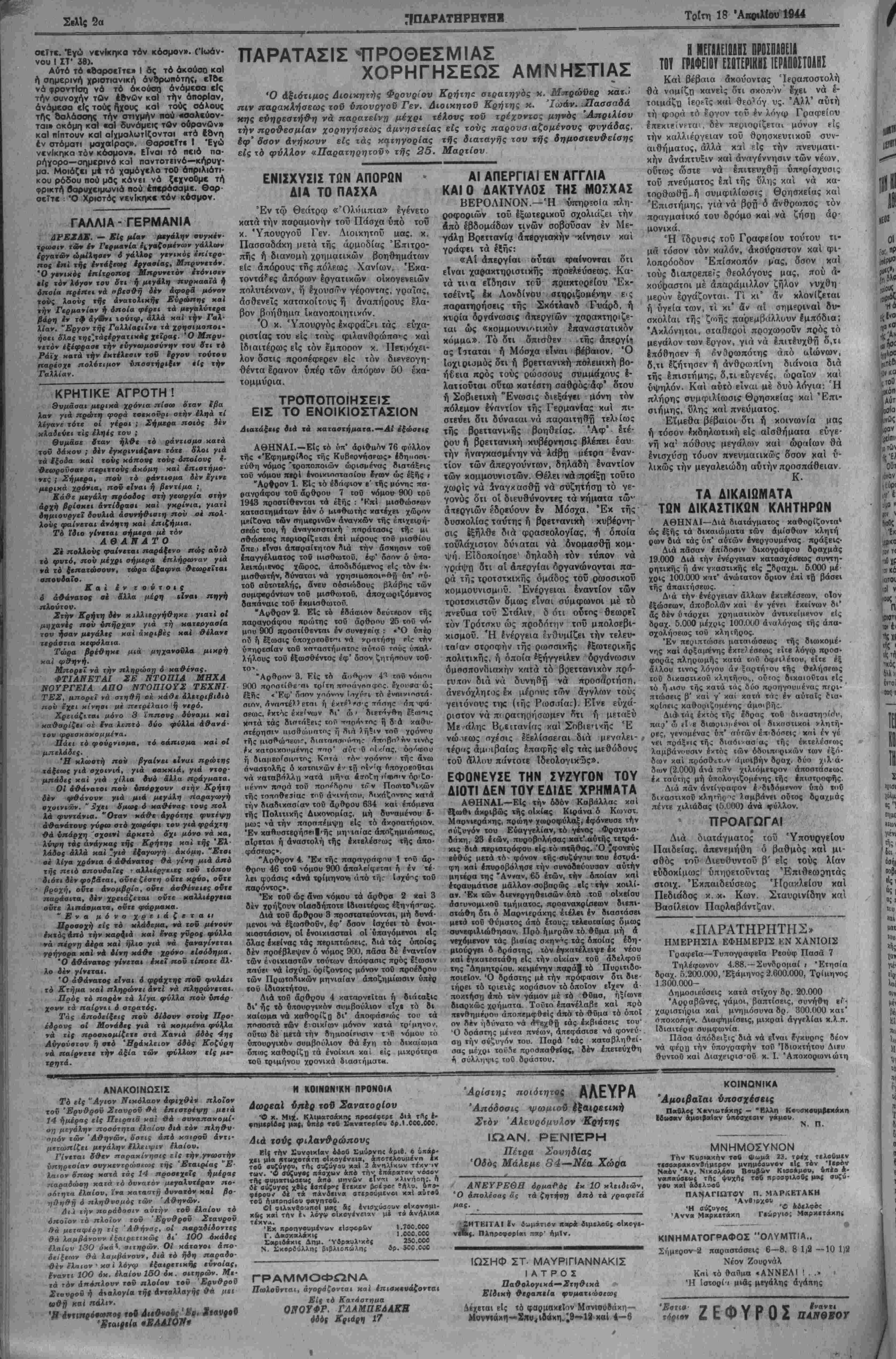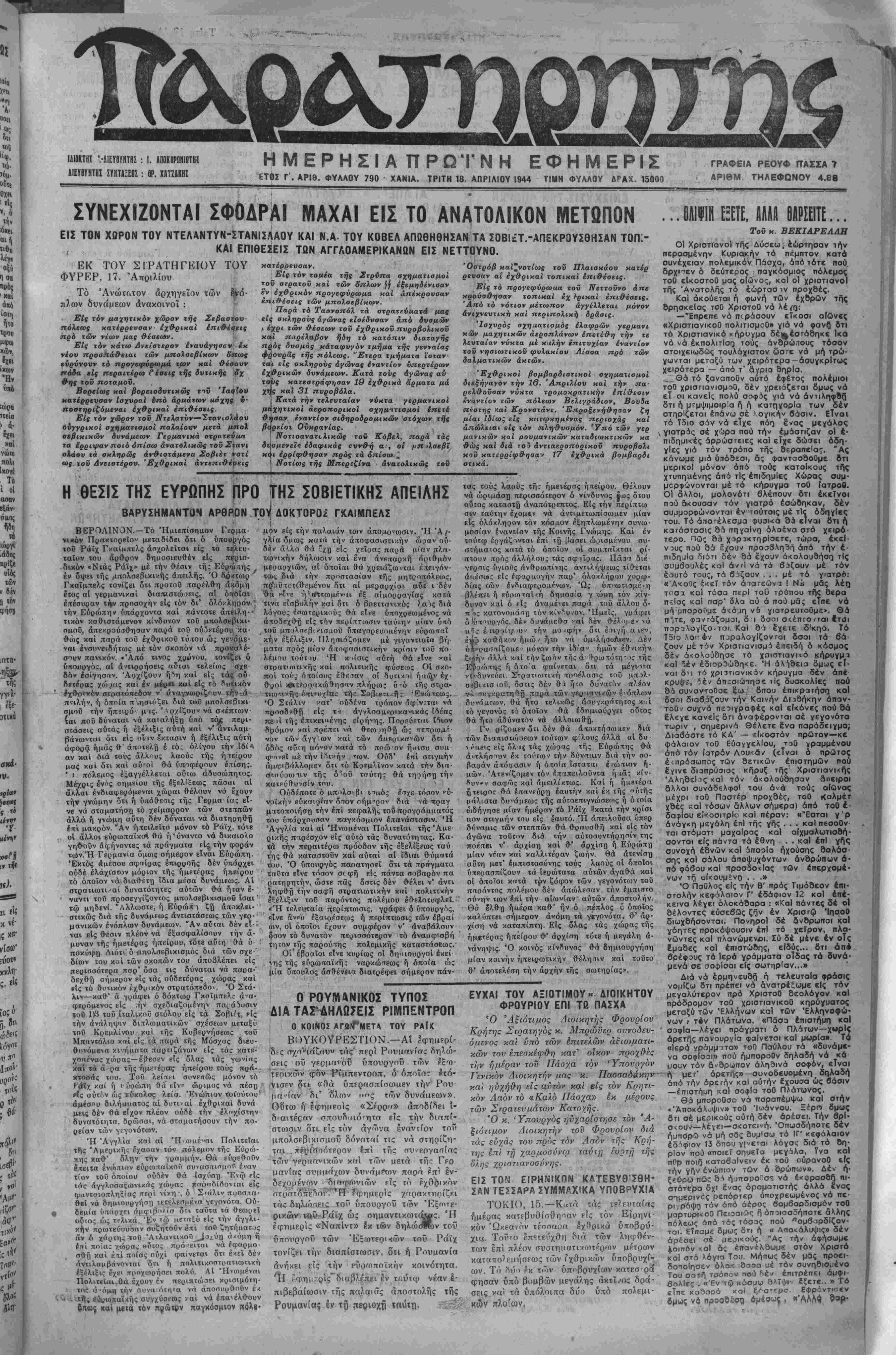 ΕΤΟΣ Γ'. ΑΡΙΘ. ΦΥΛΛΟΥ 790 ΧΑΝΙΑ. ΤΡΙΤΗ 18. ΑΠΡΙΛΙΟΥ 1944 ΤΙΜΗ ΦΥΛΛΟΥ ΔΡΑΧ. 15000