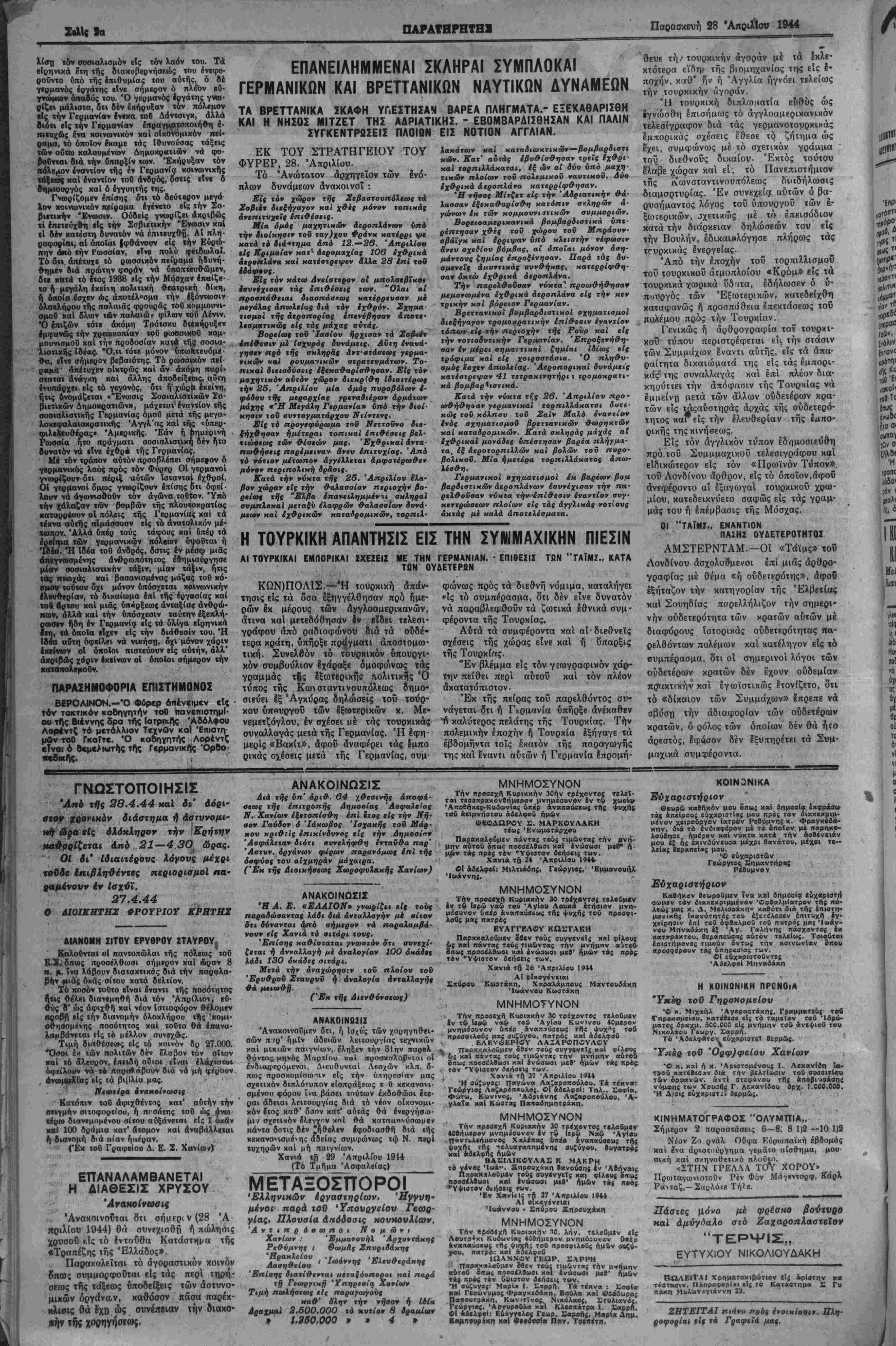 ϊΤΟΙ Γ'. ΑΡΙΘ. ΦΥΑΑΟΥ 799 · ΧΑΝΙΑ, ΠΑΡΑΜΙΥΗ 28. ΑΠΡΙΛΙΟΥ 1944 · ΤΙΜΗ ΦΥΛΛΟγ- ΑΜΧ, 15000