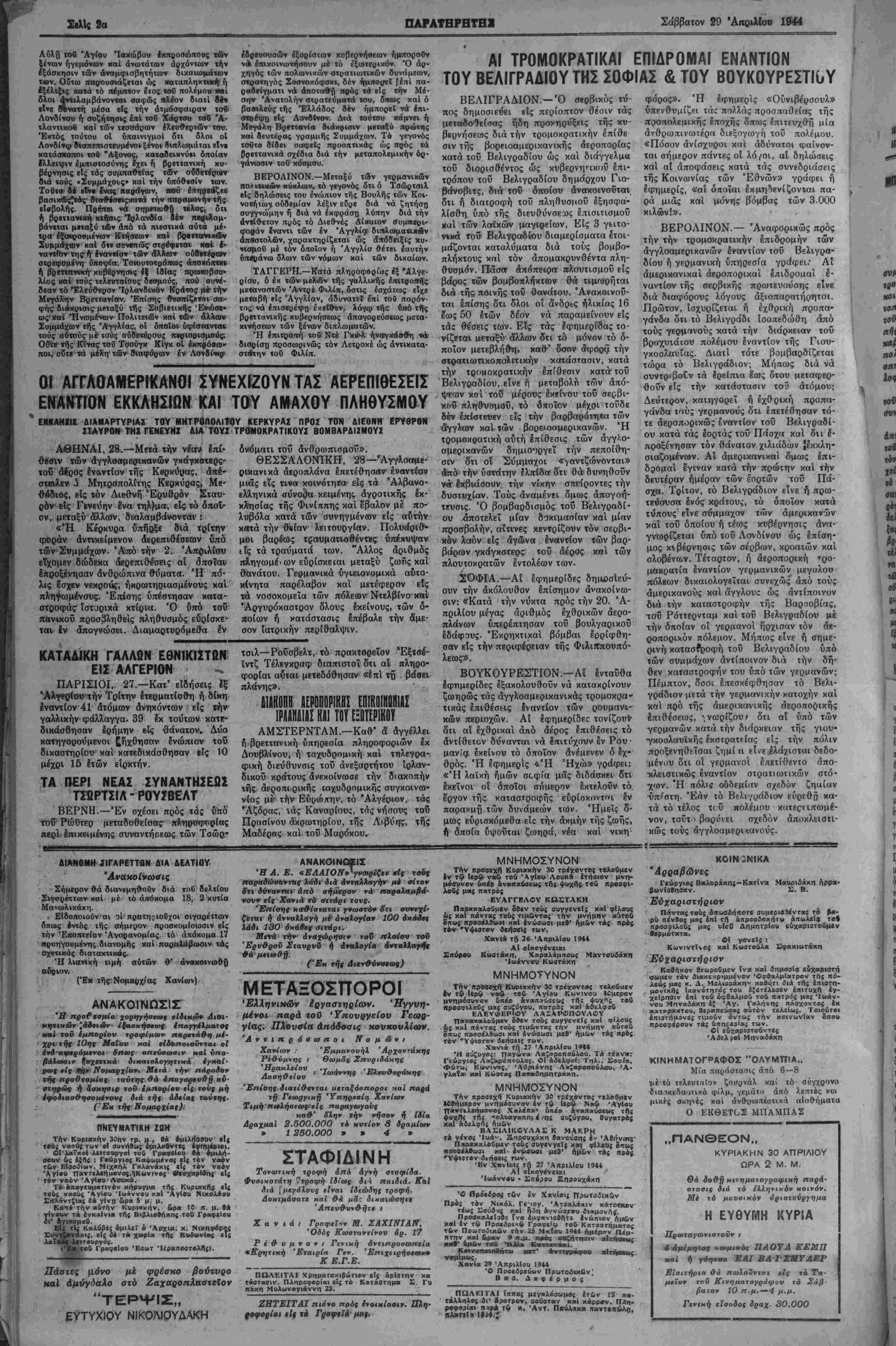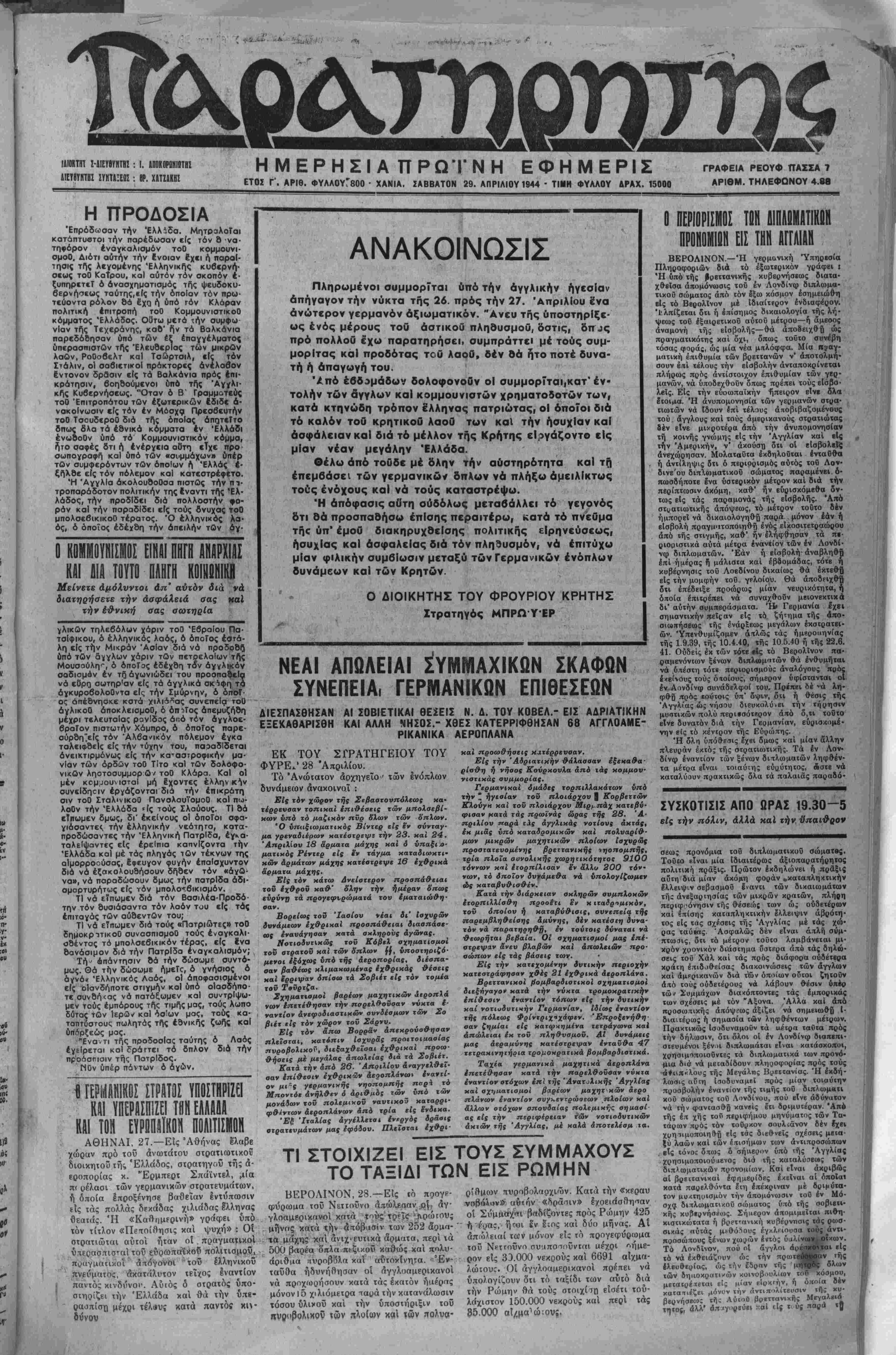 ΕΤΟΣ Ι". ΑΡΙΘ. ΦΥΛΛΟΥΓ8ΟΟ · ΧΑΝΙΑ. ΣΑΒΒΑΤΟΝ 29. ΑΠΡΙΛΙΟΥ 1944 ■ ΤΙΜΗ ΦΥΑΑΟΥ ΑΡΑΧ. 15000
