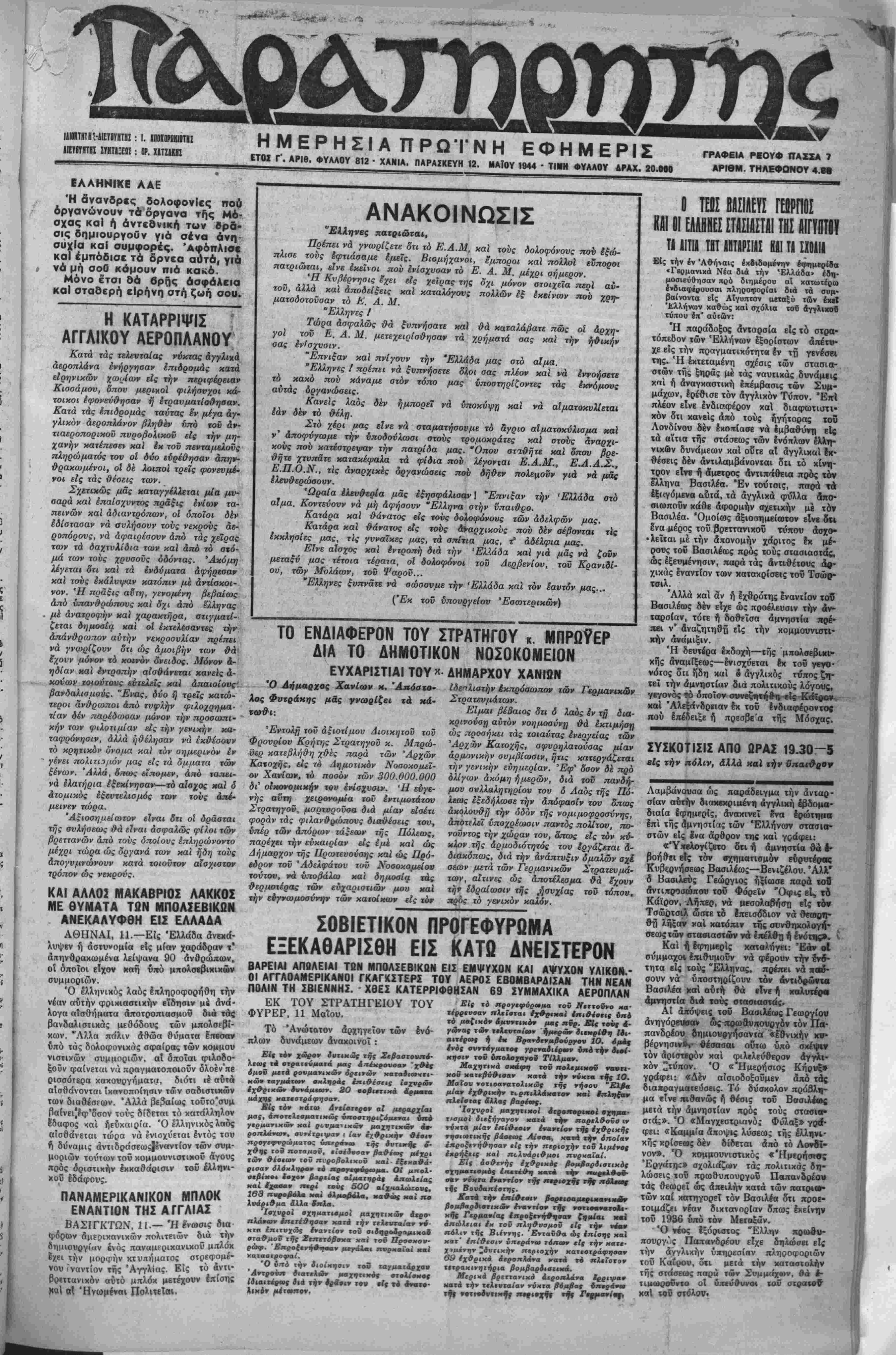 ΕΤΟΐ Γ'. ΑΡΙΘ. ΦΥΛΛΟΥ 812 · ΧΑΝΙΑ. ΠΑΡΑΚΕΥΗ 12. ΜΑΐΟΥ 1944 ■ ΤΙΒΗ ΦΥΑΑΟΥ ΑΡΑΧ. 20.000
