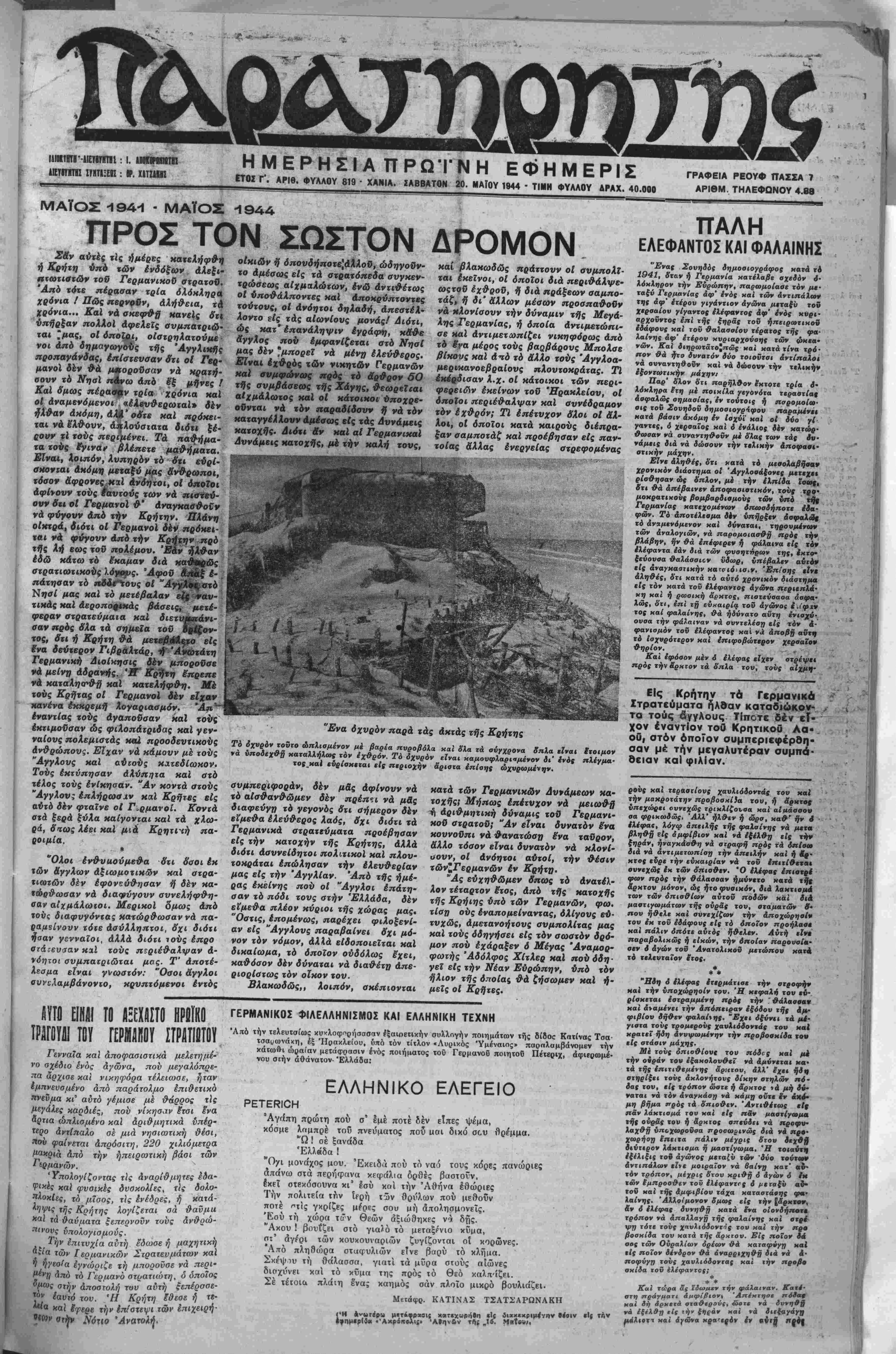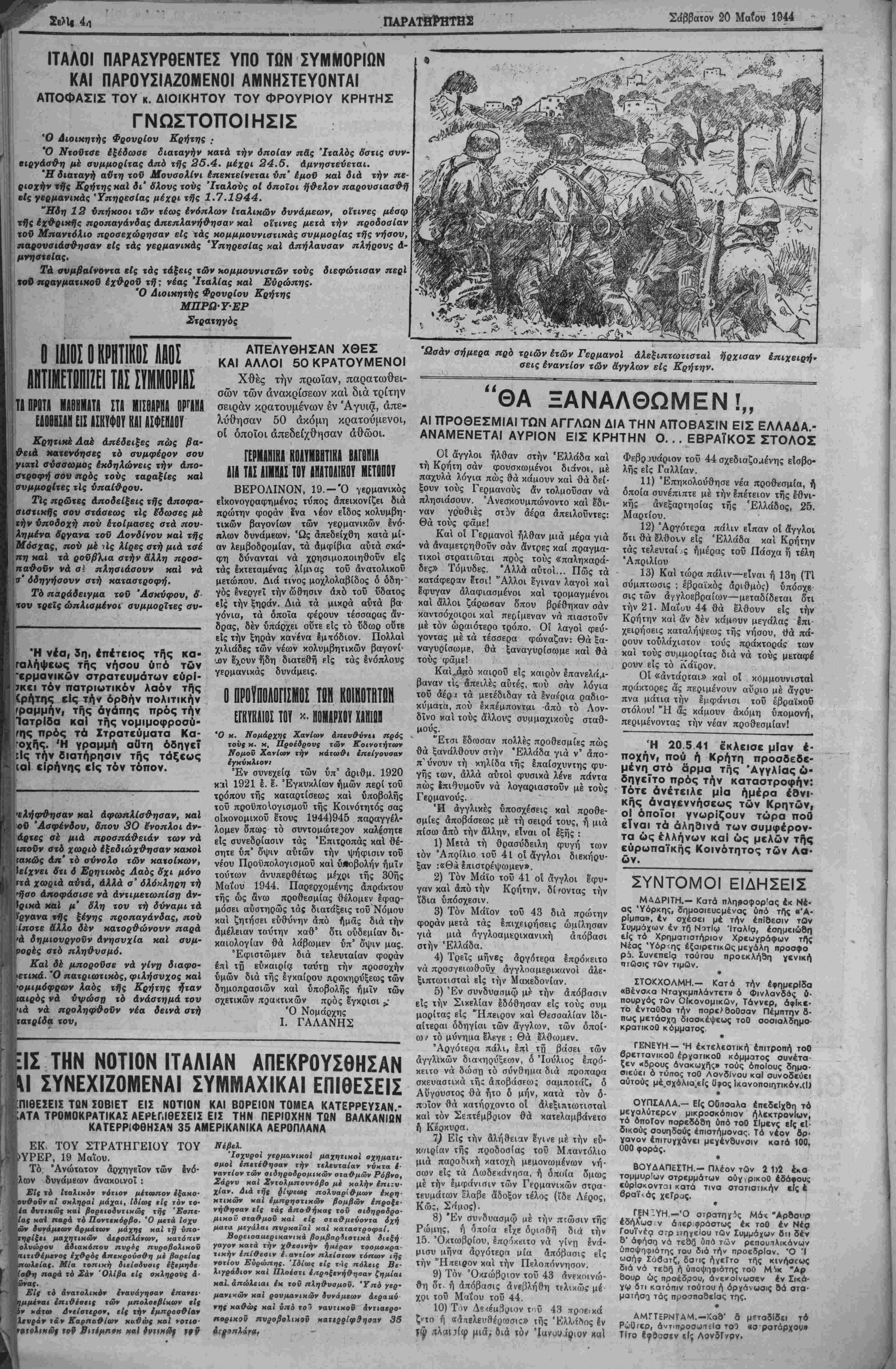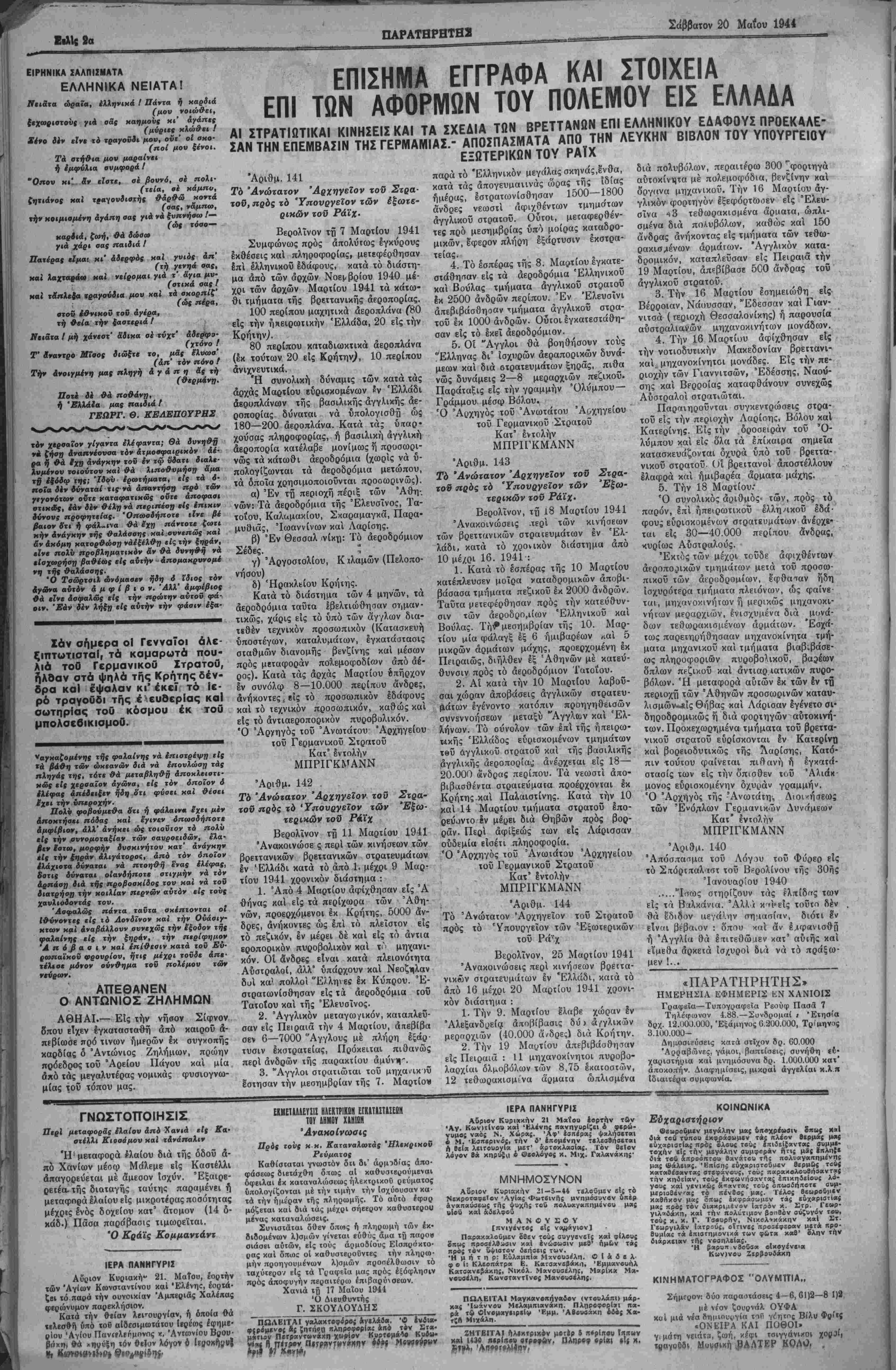 ΕΤΟΖ Γ'. ΑΡΙΘ. ΦΥΑΛΟΥ 819 · ΧΑΝΙΑ. ΣΑΒΒΑΤΟΝ 20. ΜΑΐΟΥ 1944 - ΤΙΜΗ ΦΥΛΑΟΥ ΔΡΑΧ. 40.000