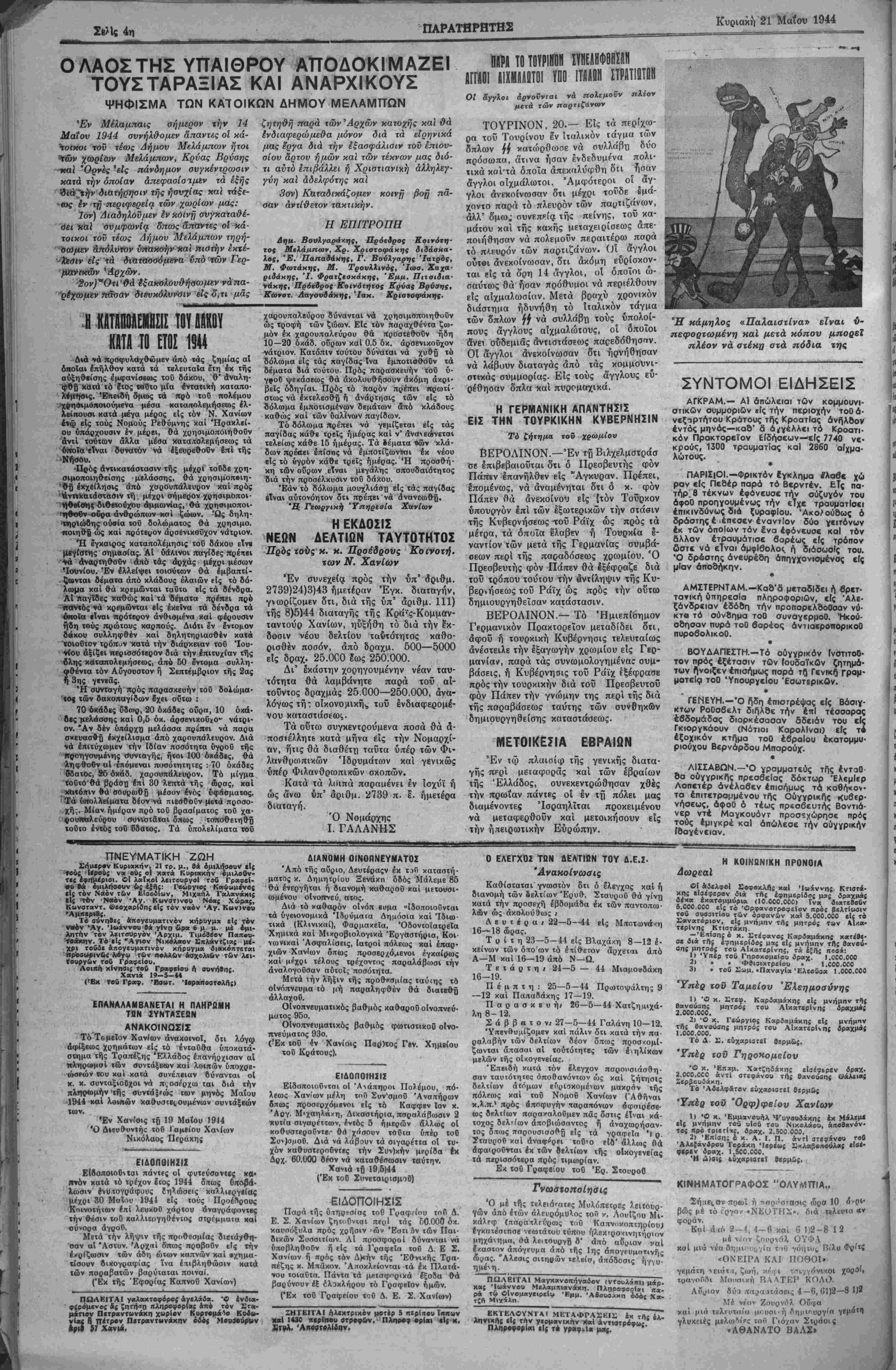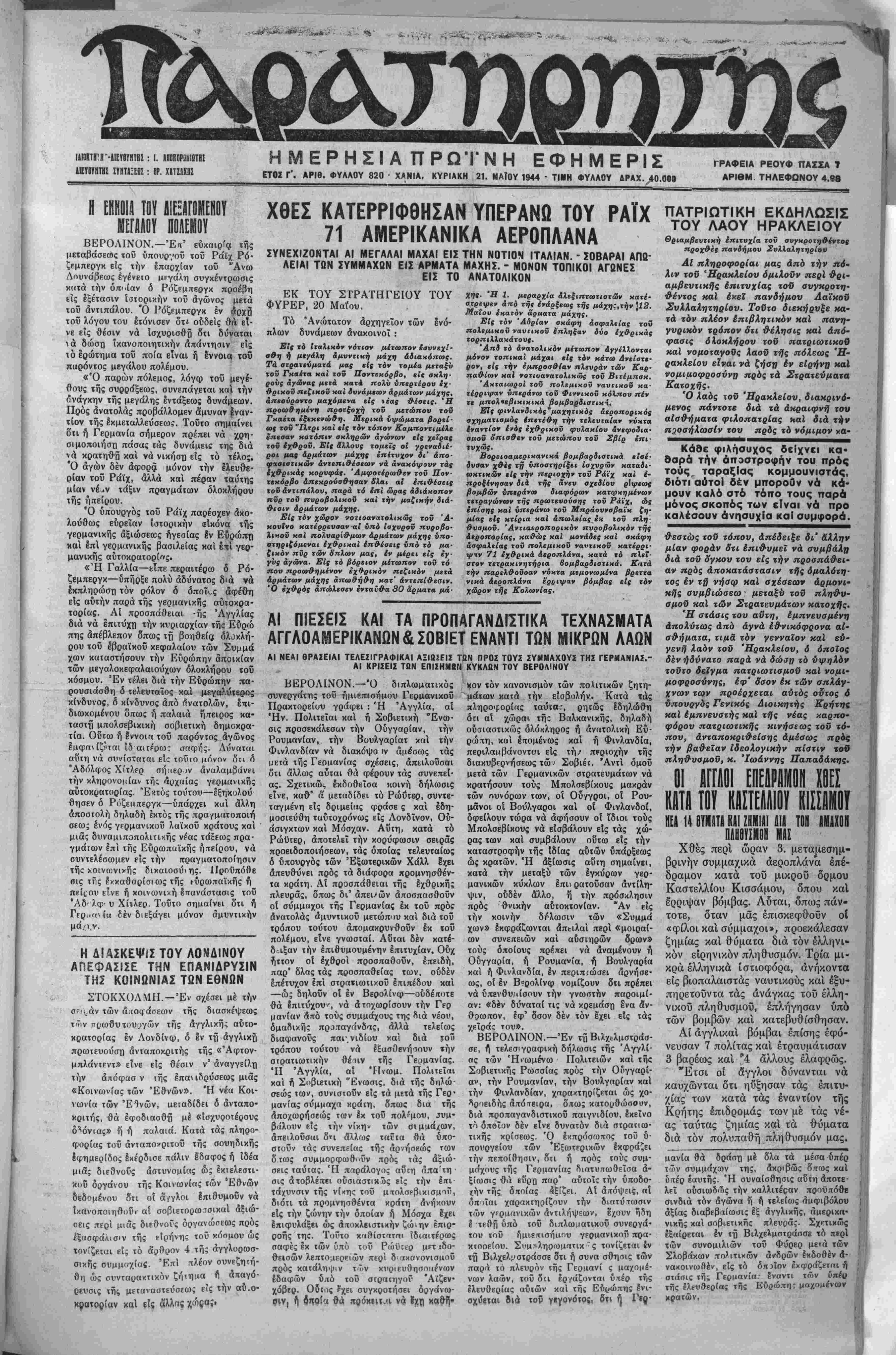 ΕΤΟΣ Γ'. ΑΡΙΘ. ΦΥΛΛΟΥ 820 - ΧΑΝΙΑ, ΚΥΡΙΑΚΗ 21. ΜΑΐΟΥ 1944 ■ ΤΙΜΗ ΦΥΑΑΟΥ ΔΡΑΧ. 40.000