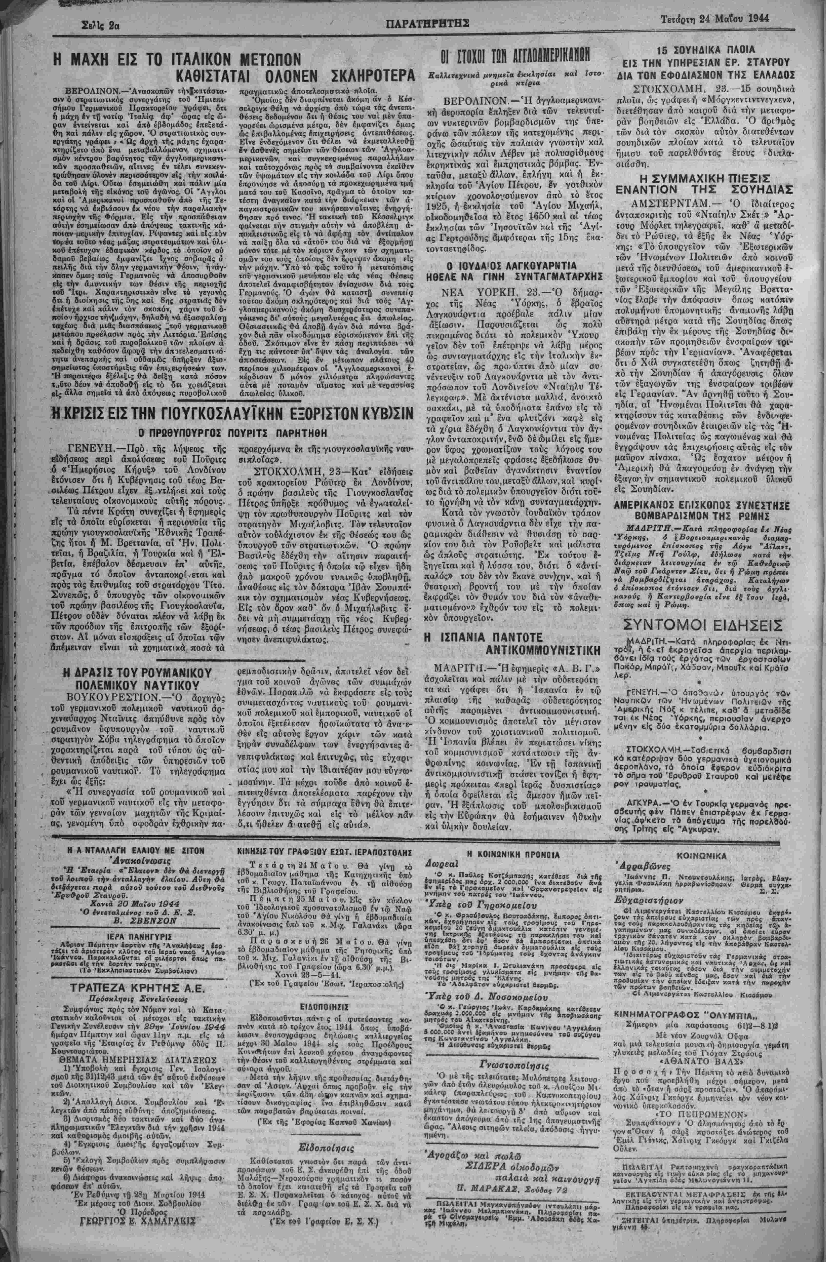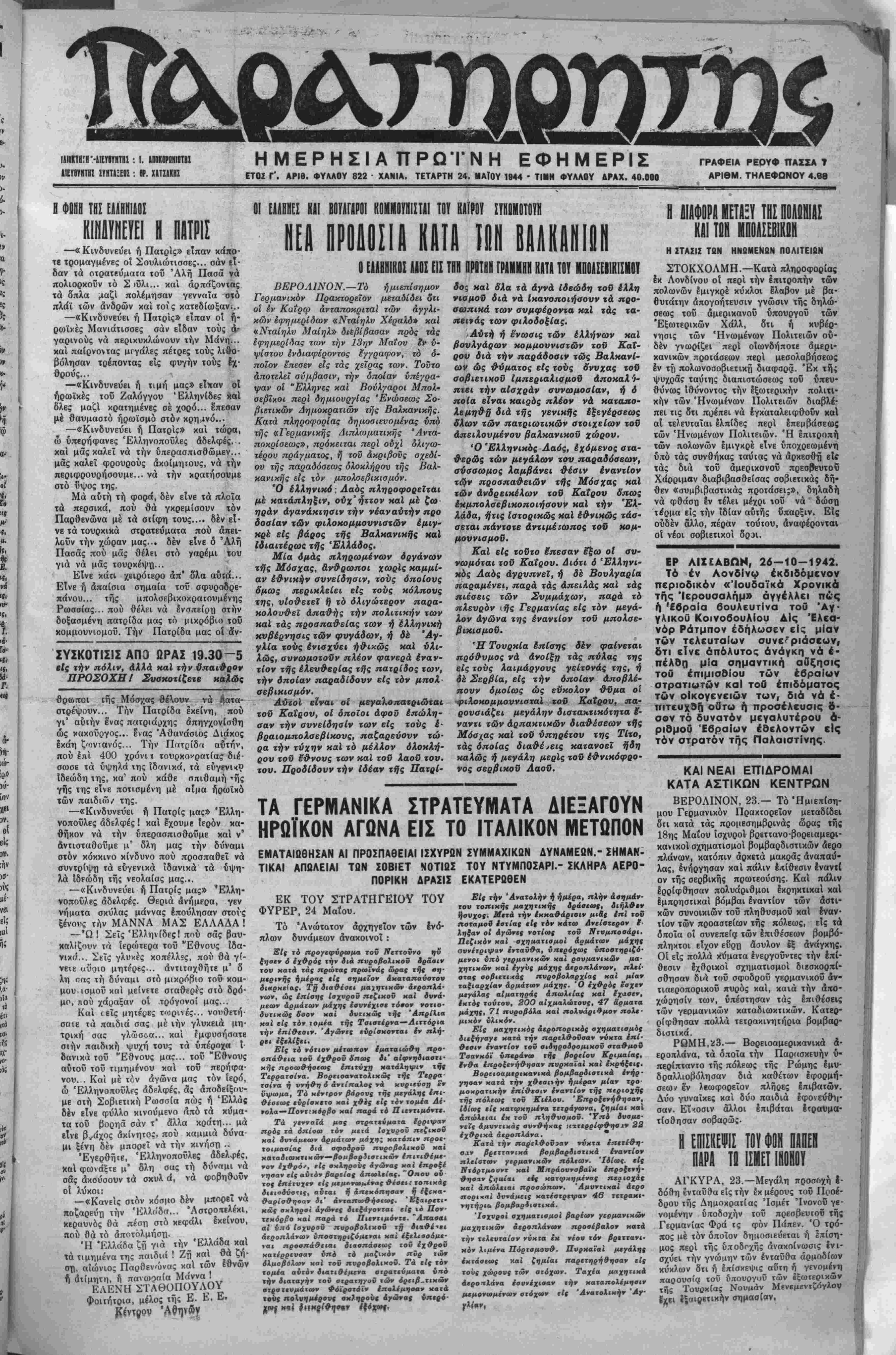 ΕΤΟΣ Γ'. ΑΡΙΘ. ΦΥΑΑΟΥ 822 ΧΑΝΙΑ. ΤΕΤΑΡΤΗ 24. ΜΑΐΟΥ 1944 · ΤΙΜΗ ΦΥΛΑΟΥ ΔΡΑΧ. 40.000