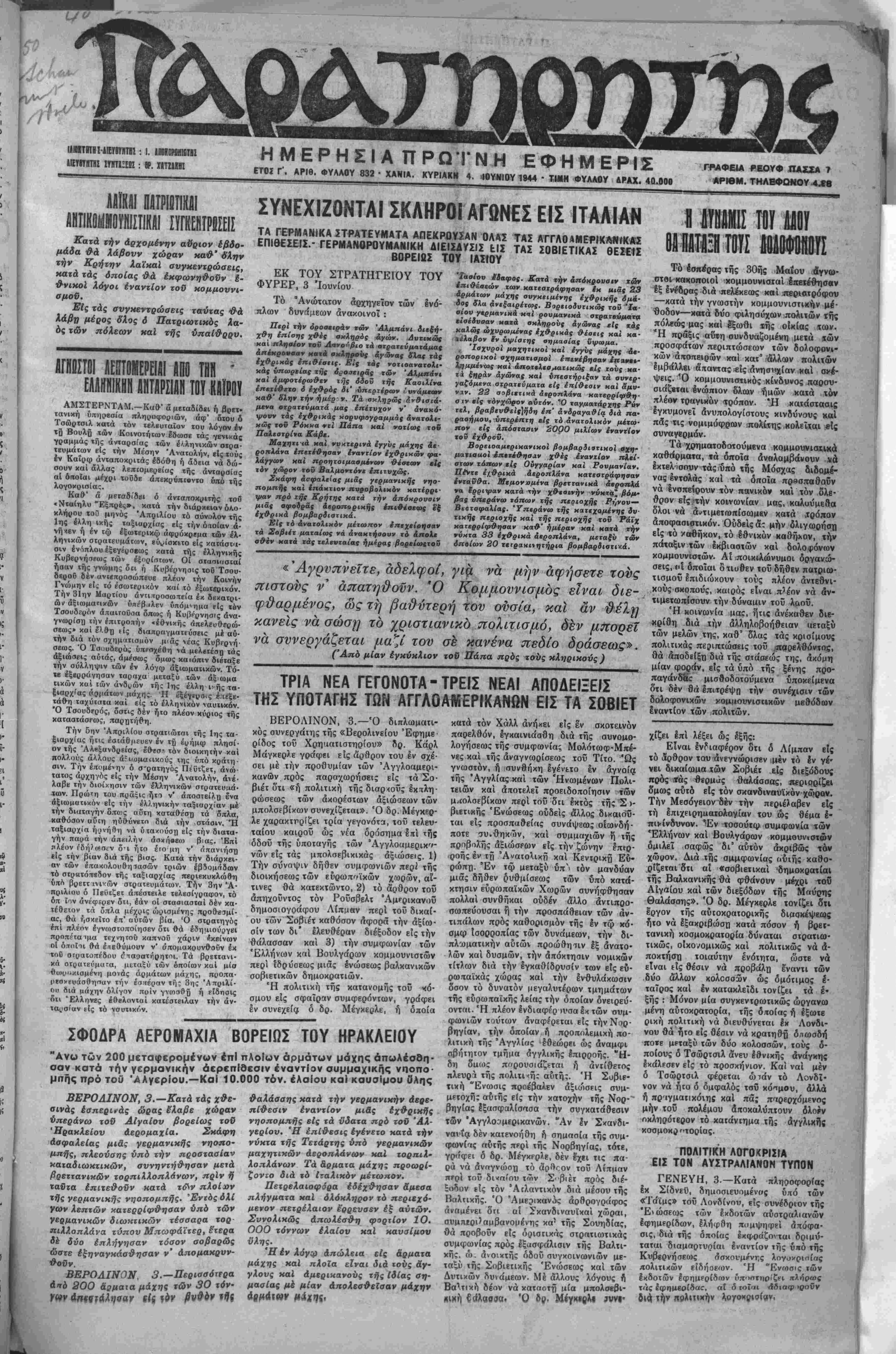 ΕΤΟΪ Γ ΑΡΙβ. ΦΥΛΛΟΥ 832 · ΧΑΝΙΑ. ΚΥΡΙΑΚΜ 4. .ΙΟΥΜΙΟΥ 1944 · Τ,ΙΜΜ ΦΥΛΑΟΥ ΑΡΑΧ. 40.009
