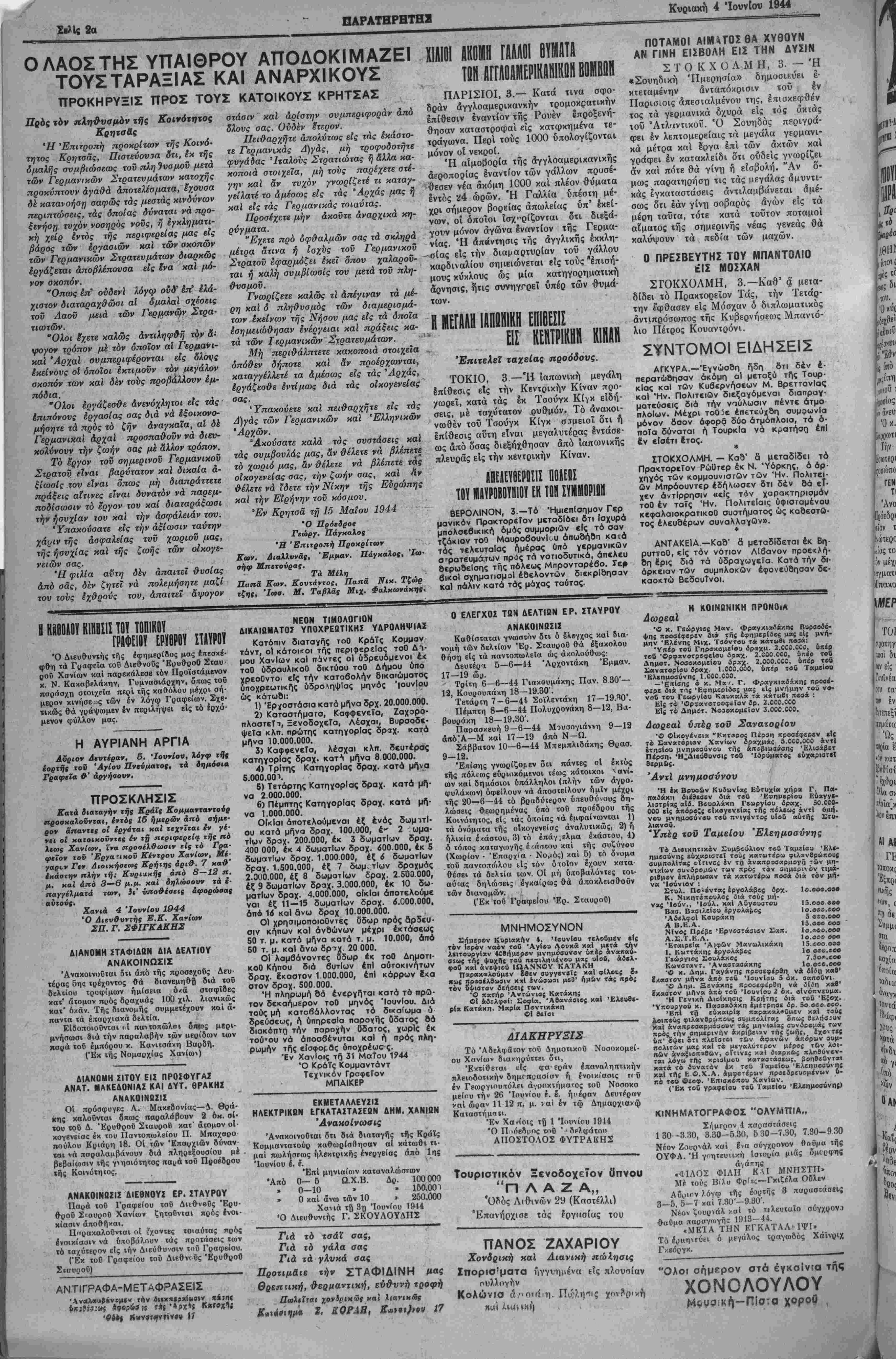 Ό κ. Δημ. Γαγάνης προ3<φέρ3η 8/αατον μήνα από τοϋ Ίουνίου 5 , Ό Δημ. Ξενάκης π;οο«φερθη «« μ.^ι, «— ϊκαατον μήνα από τοΰ Ίουνίου 2 οχ. οΐνέπνευμα. Ή Γενιχή Διοίκηαις Κρήτης διά τοΰ ΈςΌχ. Ύπουργοϋ κ. Πααααδακη έμίτρηβε δρ. 5ο οοο.οοο. Επι τή εύκαιρία παρακαλβΰιιεν καί τοϋ; λοιποϋς φΐλανθρώτιου; συμπολίτας £πως θΐλήβ^υν Καί αναπροααρμόοονν τάς μη ιαίας αυνδρβί.ιά( τοιν πρός την σημερινήν ακρίβειαν τή{ ζ»ής,_ ^Εχβ^τε; ΰπ* 3ψει ότι πλεΐοτοι τ£,ν αφανών απόρων ουμ- ηολιτων μας καΐ τό μεγ«λύτ(ρον μέρο; των λοι- ηών ^ναζιοπαθΐίν, οΐτινε; καϊ διαρκώς πληθΰνον- ται λόγω της χριβίμου καταβτάβεως, βοηββϋνται κατά (ό δυνατόν έκ τβΰ Ταμείου 'Ελεημοαύιη; χαί της Ε Ο.Χ.Α. αμαο-έρ»ν προεδρευομε'ναν ϋ- ηό τοΰ ΰεβφ. 'Επιαχοπου Χανίων. (Έκ τβΰ γραφείβυ τβΰ Ταμείον 'Ελεημβουνηί) ΚΙΝΗΜΑΤΟΓΡΑΦΟΣ "ΟΛΥΜΤΤΙΑ,, Σήμεοον ^ παράστασις 130—3.30, 3.30—5 30, 6 30—7.30, 7.30-9 30 Νέον Ζουρνάλ χαί ίια σύγχρονον θοϋμα τής ΟΥΦΑ. Ή γοητευΐιχή Ισιοι,,ία μιάς δμιςιφης Οάπης 17 Γιά τό ταάΧ σας, ΙΊά τό γάλα σας ΙΊά τα γλυκά σας ΙΤροτιμάτε την ΣΤΑΦΙΔΙΝΗ Θρεπακή, θερμαντίκή, εύθυντ) ΠωΙιΐται χονΐριχ'δς καϊ λιανικώς Κ»χάβιημ« ι, ΚΟΡΛΒ, Ε*>»>}π>ν 17