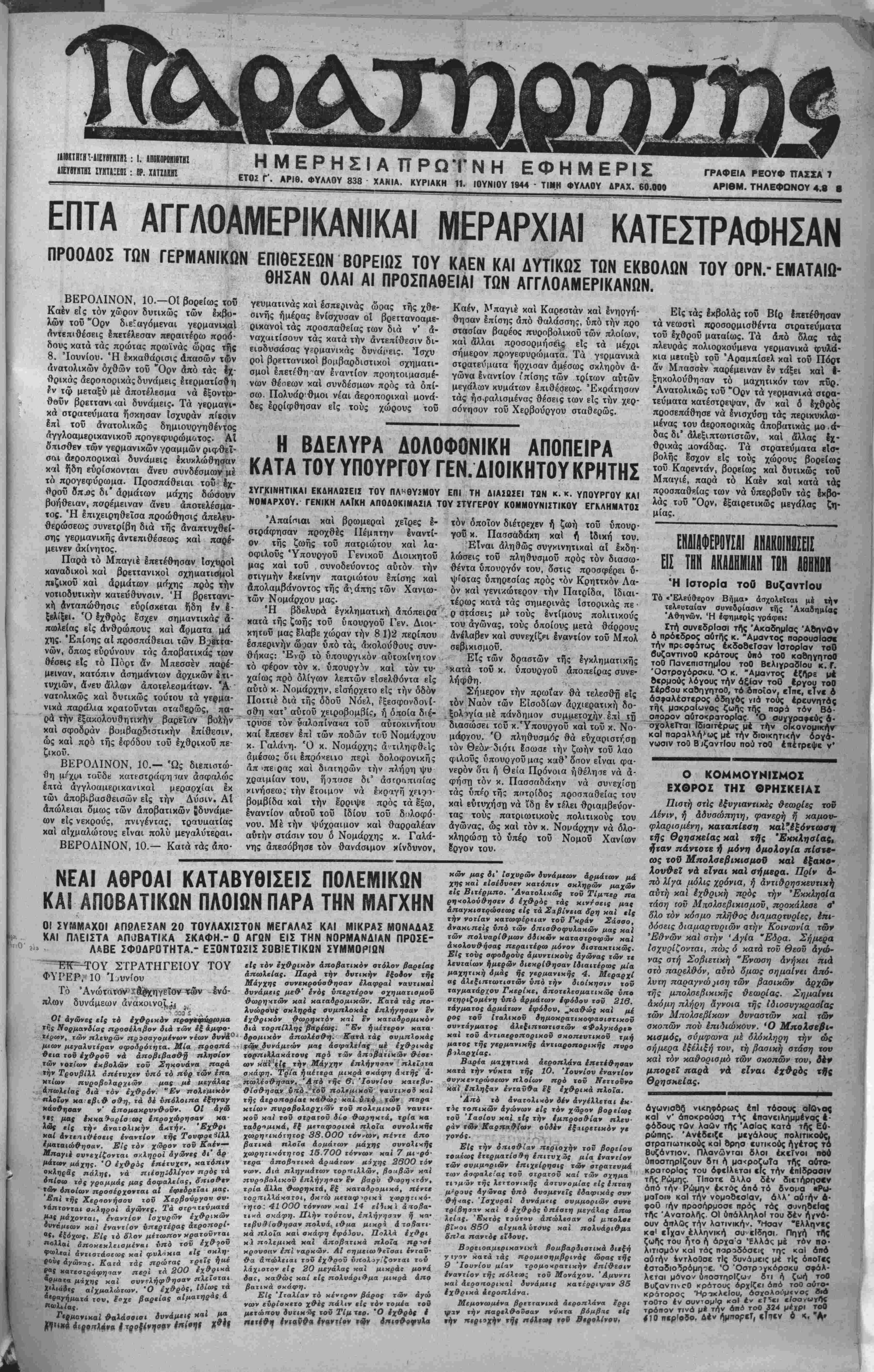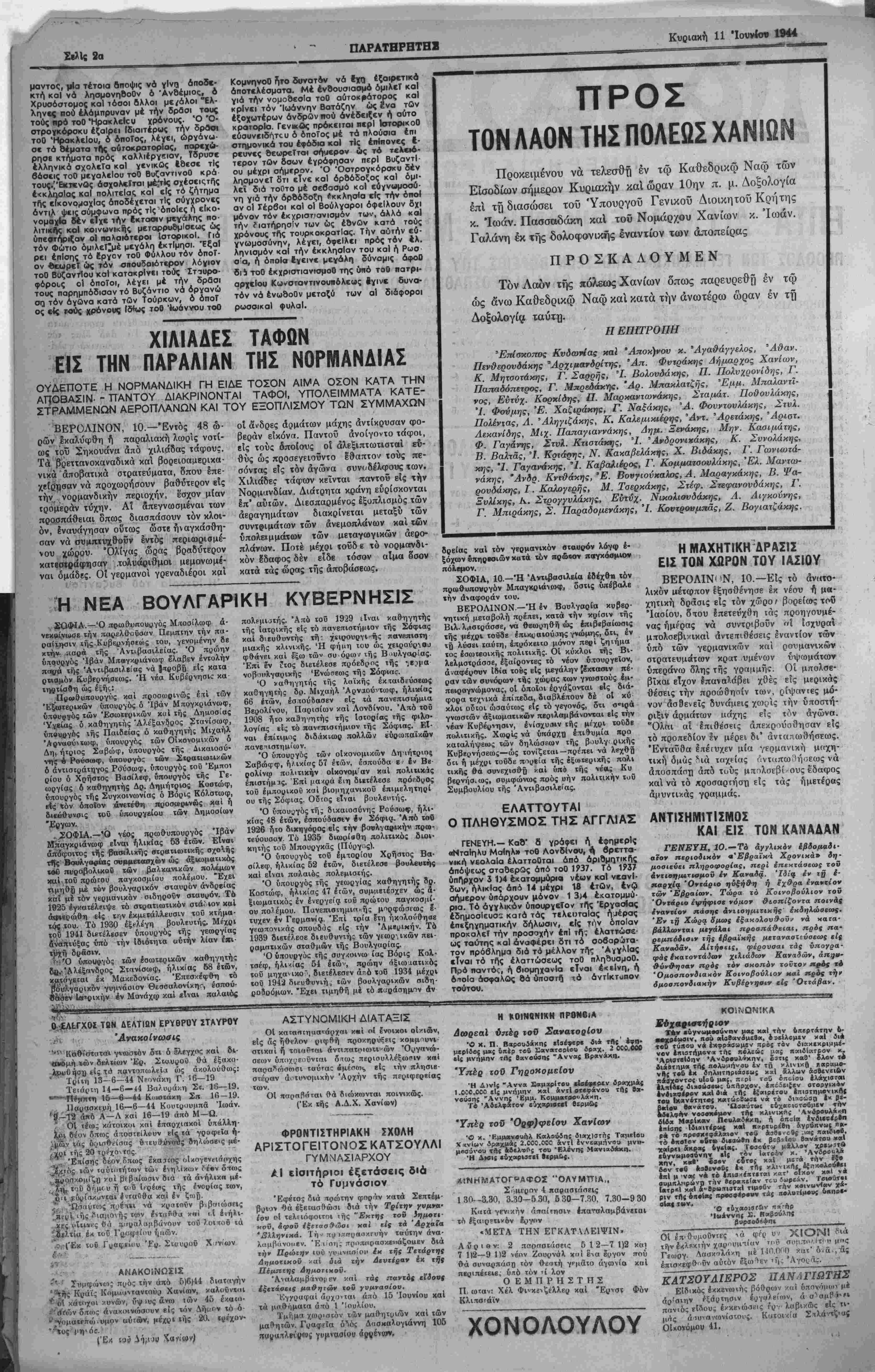 ΕΤΟΖ Γ'. ΑΡΙΘ. ΦΥΛΛΟΥ 838 ΧΑΝΙΑ. ΚΥΡΙΑΚΗ 11. ΙΟΥΝΙΟΥ 1944 - ΤΙΜΗ ΦΥΛΑΟΥ ΔΡΑΧ. 60.000